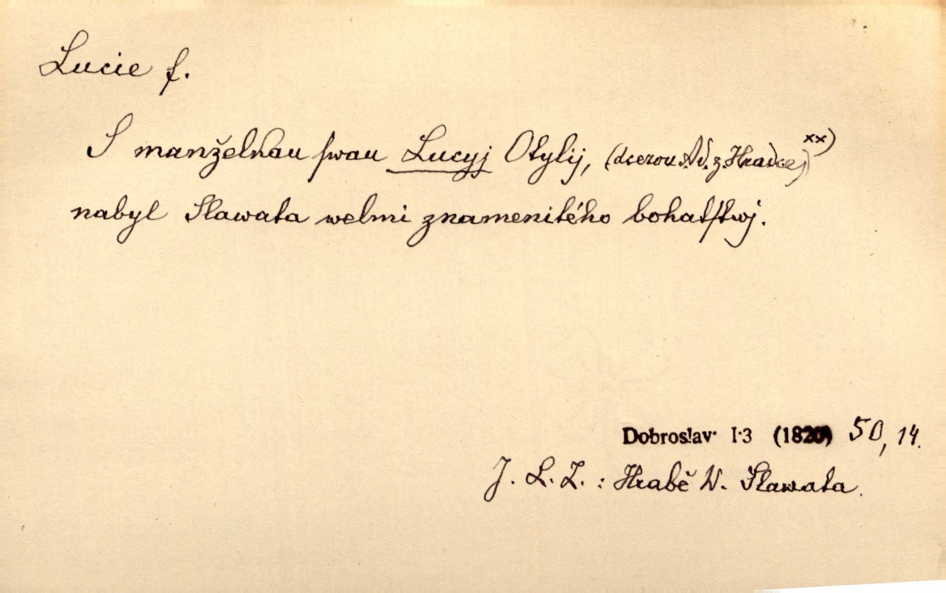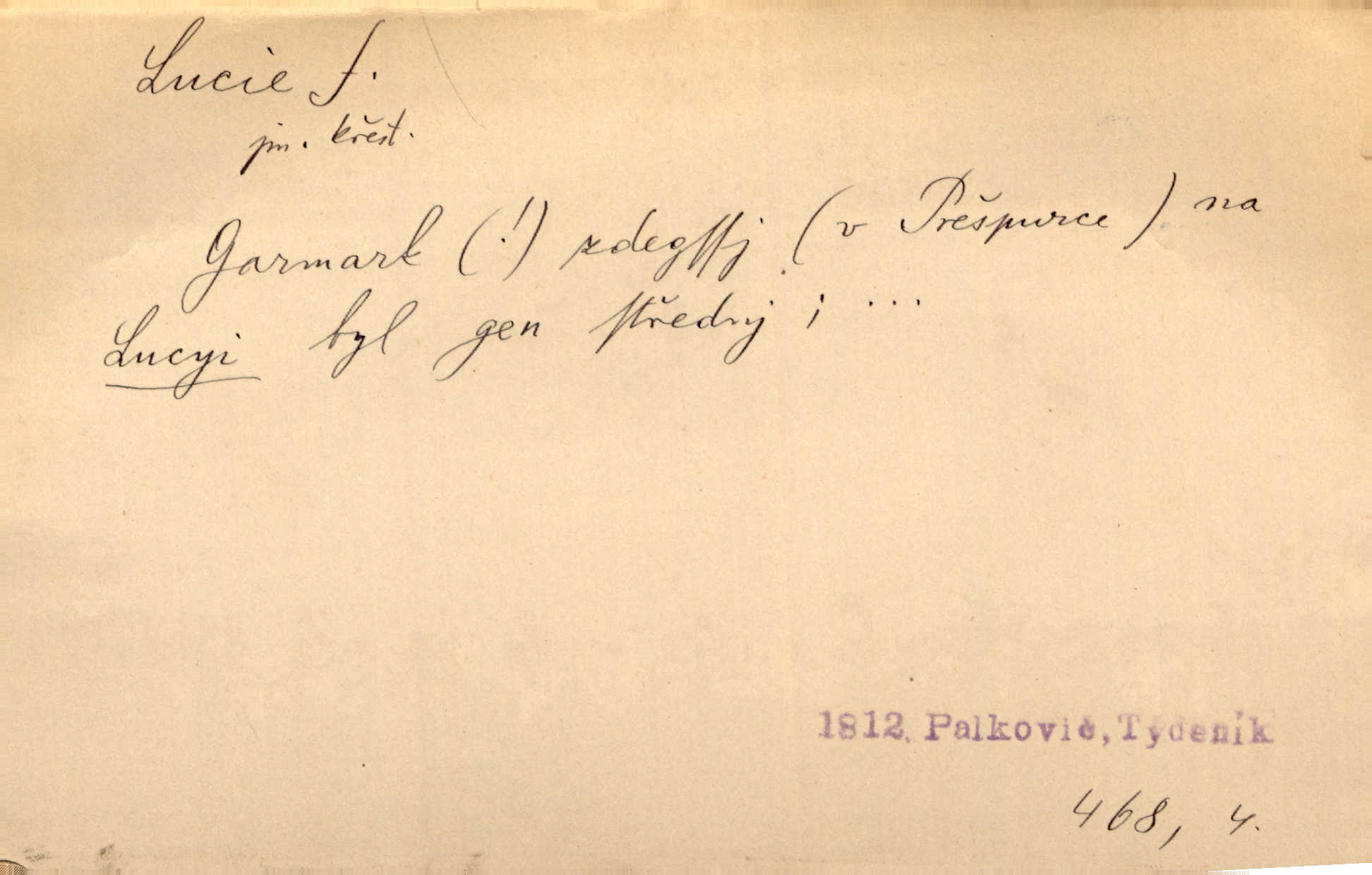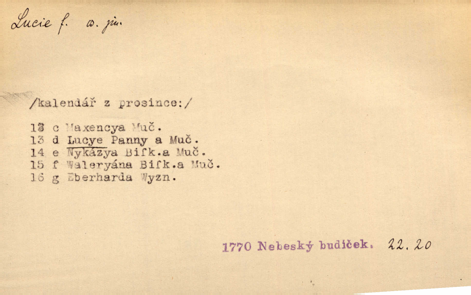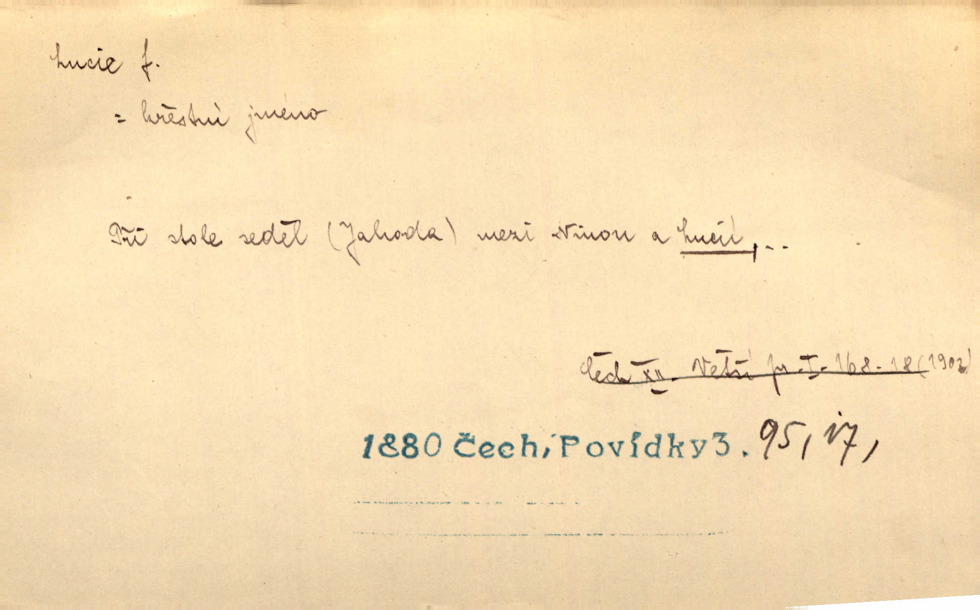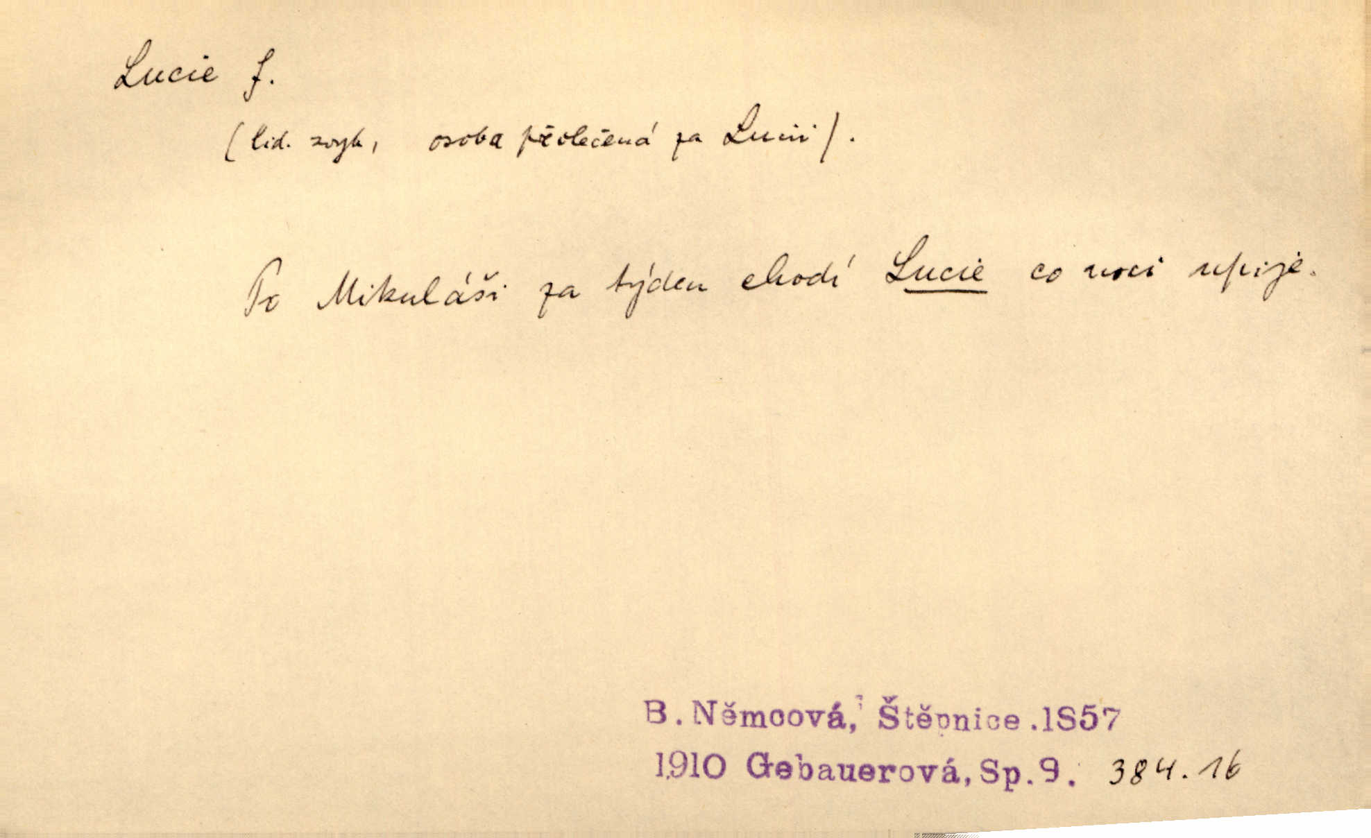 - Lucie, -e f. jméno světice a osobní jméno ženské. Lucie noci upije. Pořek. D postava lidového bájesloví. Lucie den byl dětem velmi nemilý. Byla pověra, že chodí tu noc Lucie, bílá to, dlouhá, rozcuchaná žena. Něm.