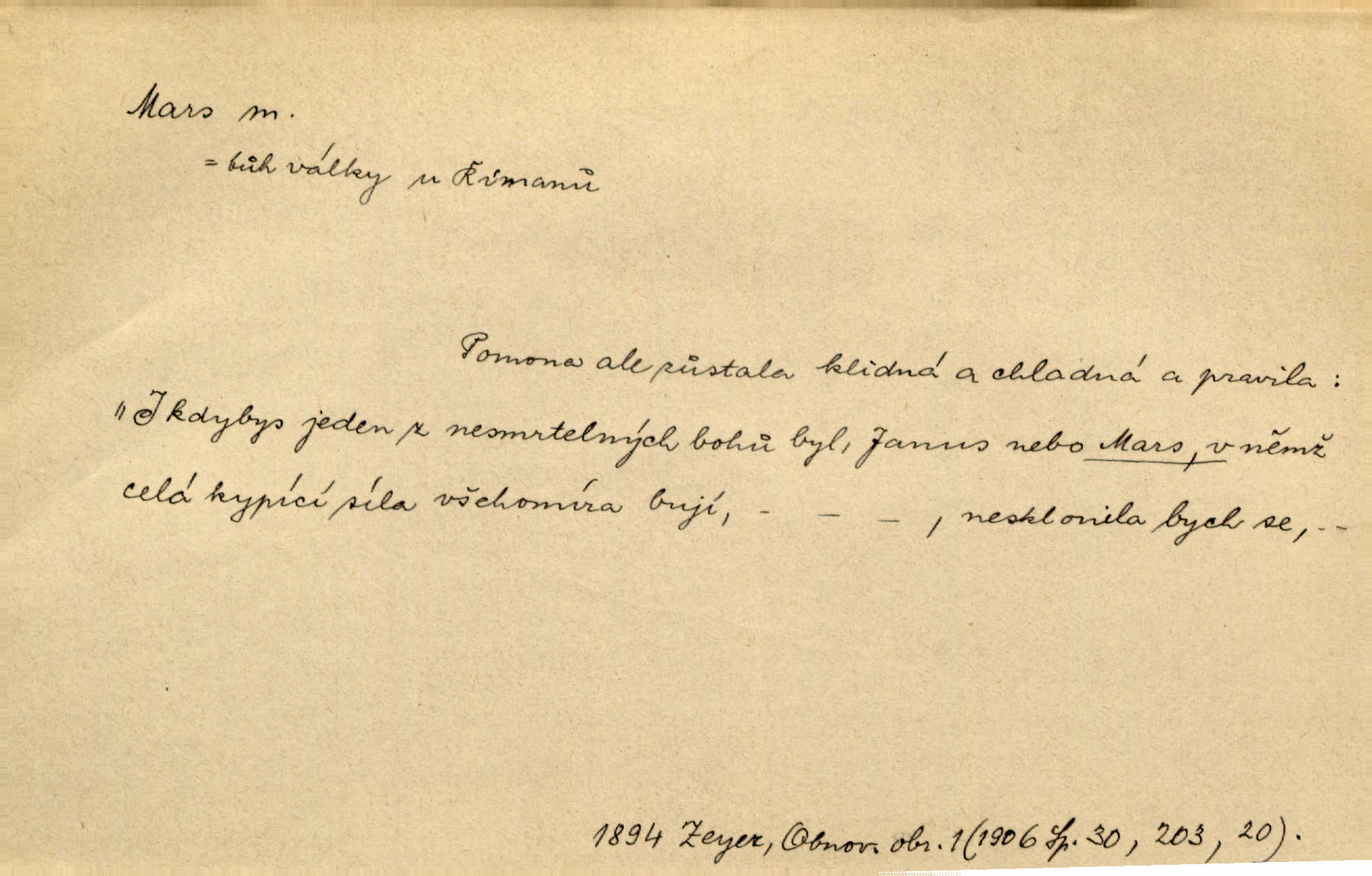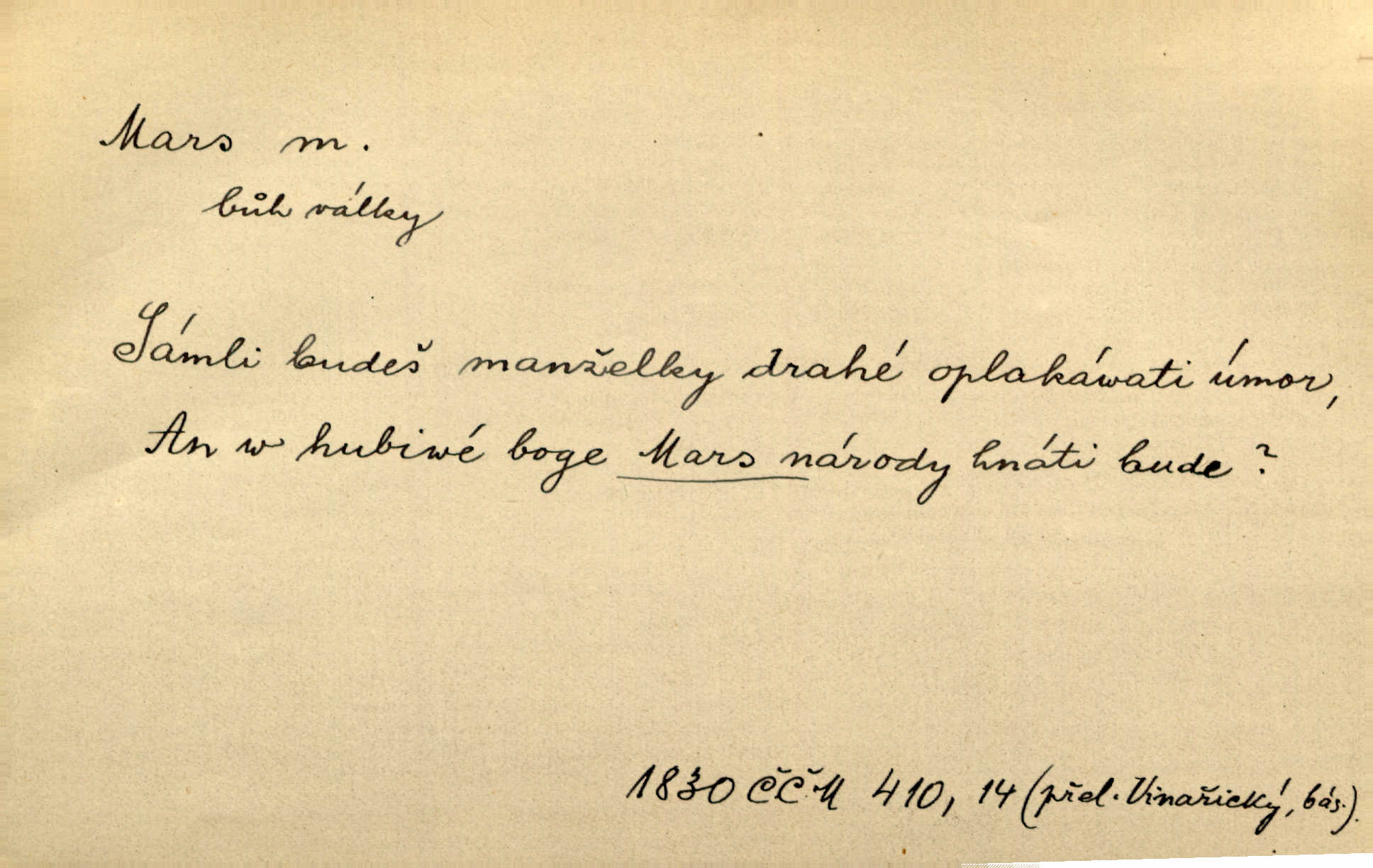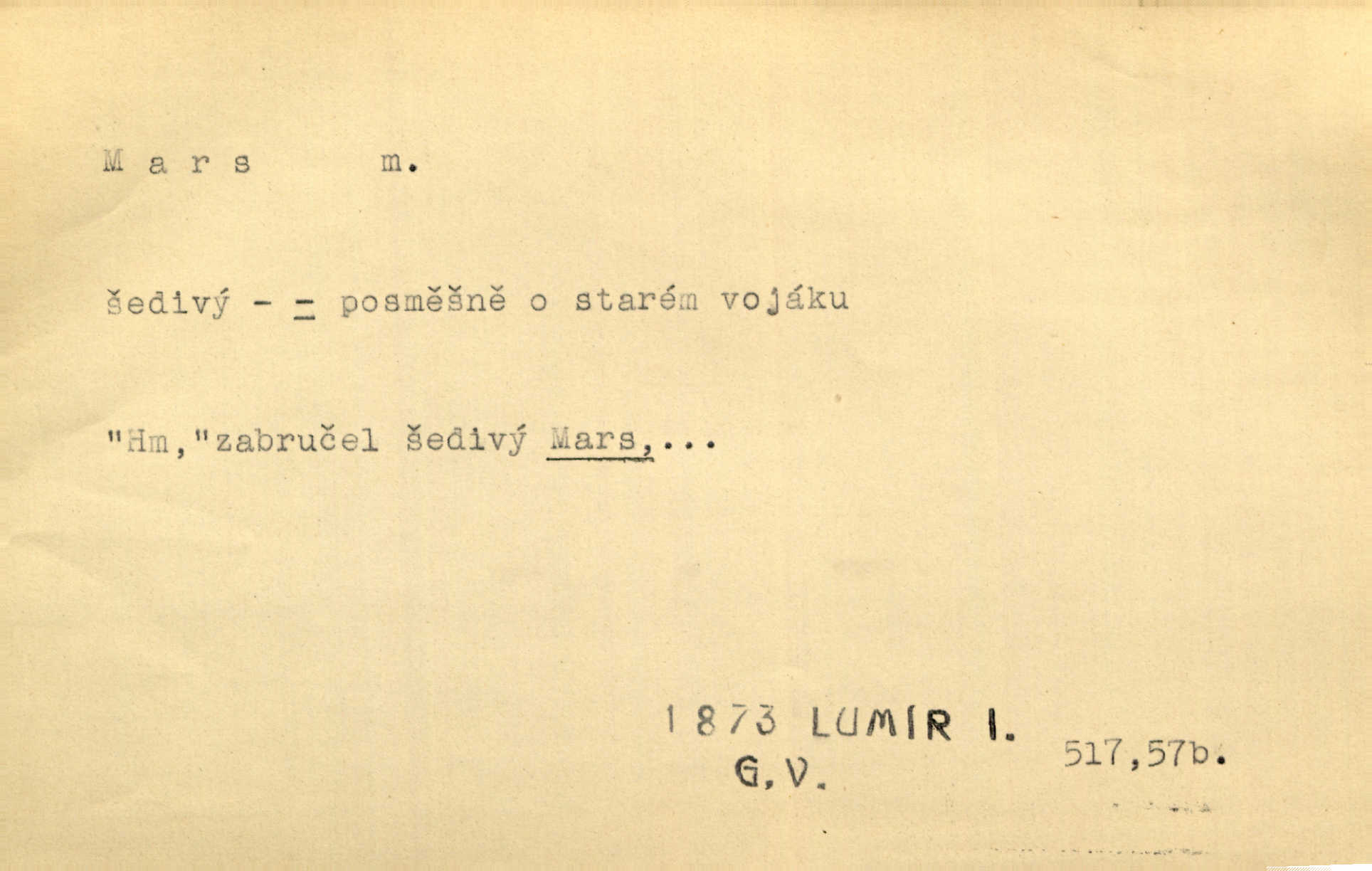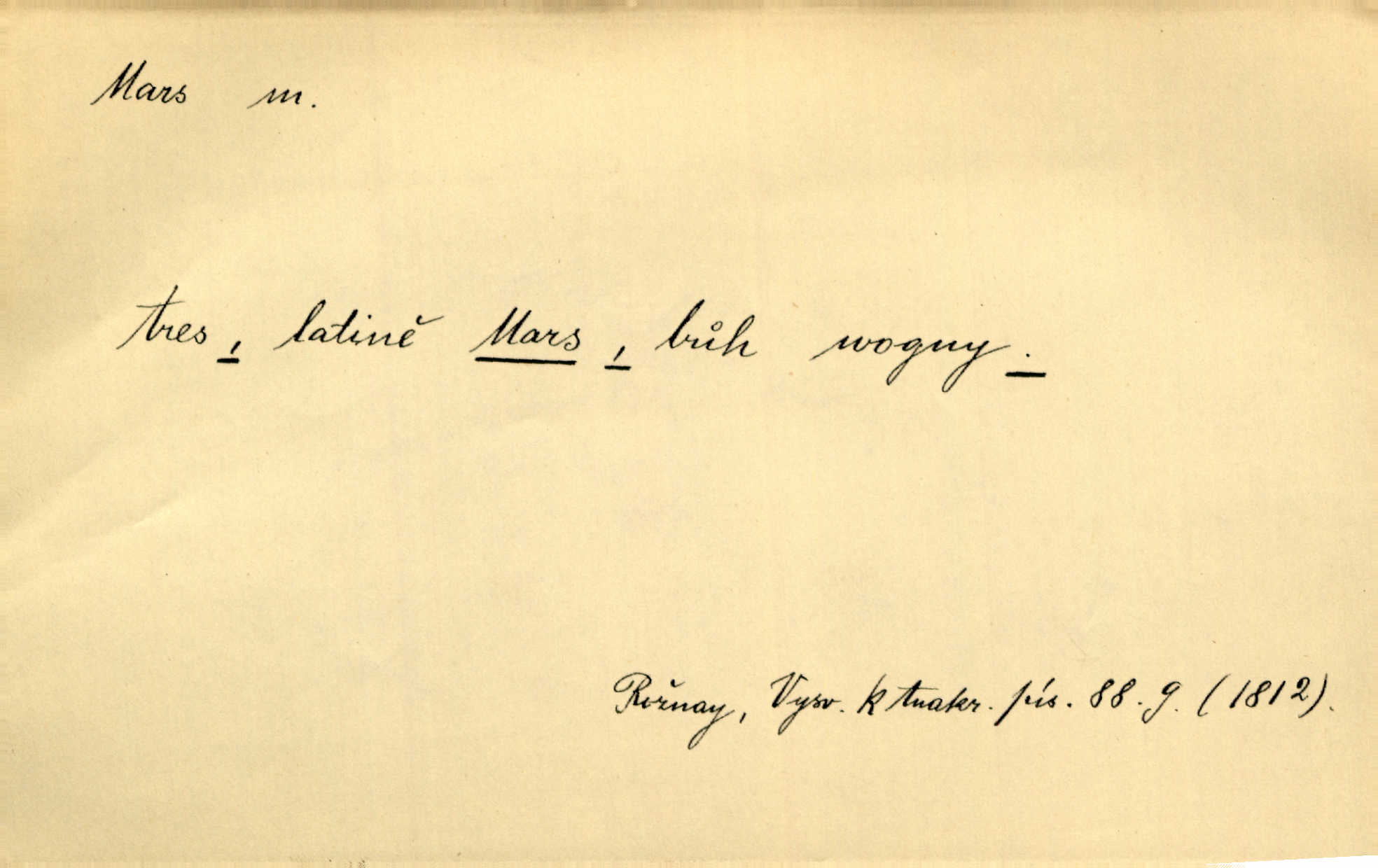 - Mars, Marta m. bůh války u starověkých Římanů. Já dal službě Marta s bohem vojenské službě. Mach. Přen. Mars, Marta n. Marsa, Marse o vojevůdci, vojáku. Starý Mars [generál Conrad v. Hötzendorf] řekl konečně: Ano. Mach. [Kuchařka] rozpředla se mnou esthetickou rozprávku o svém benedekovském Marsovi. Stank. D Mars, Marta n. Marsa jméno jedné z planet. „Ach, kdyby se tak snadno dali dokázati obyvatelé na Martu“, zasmála se slečna Vondrejcová vesele. Čap. Ch. Lev ve znamení Marse. Třeb.