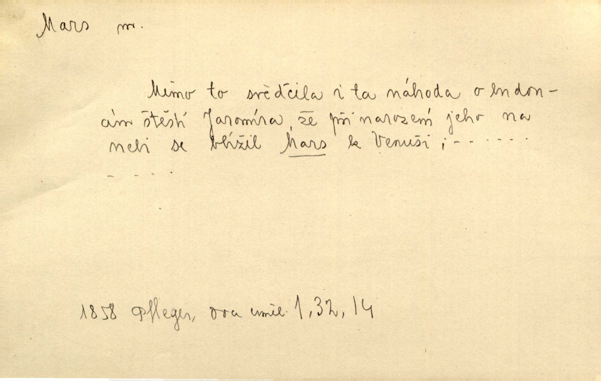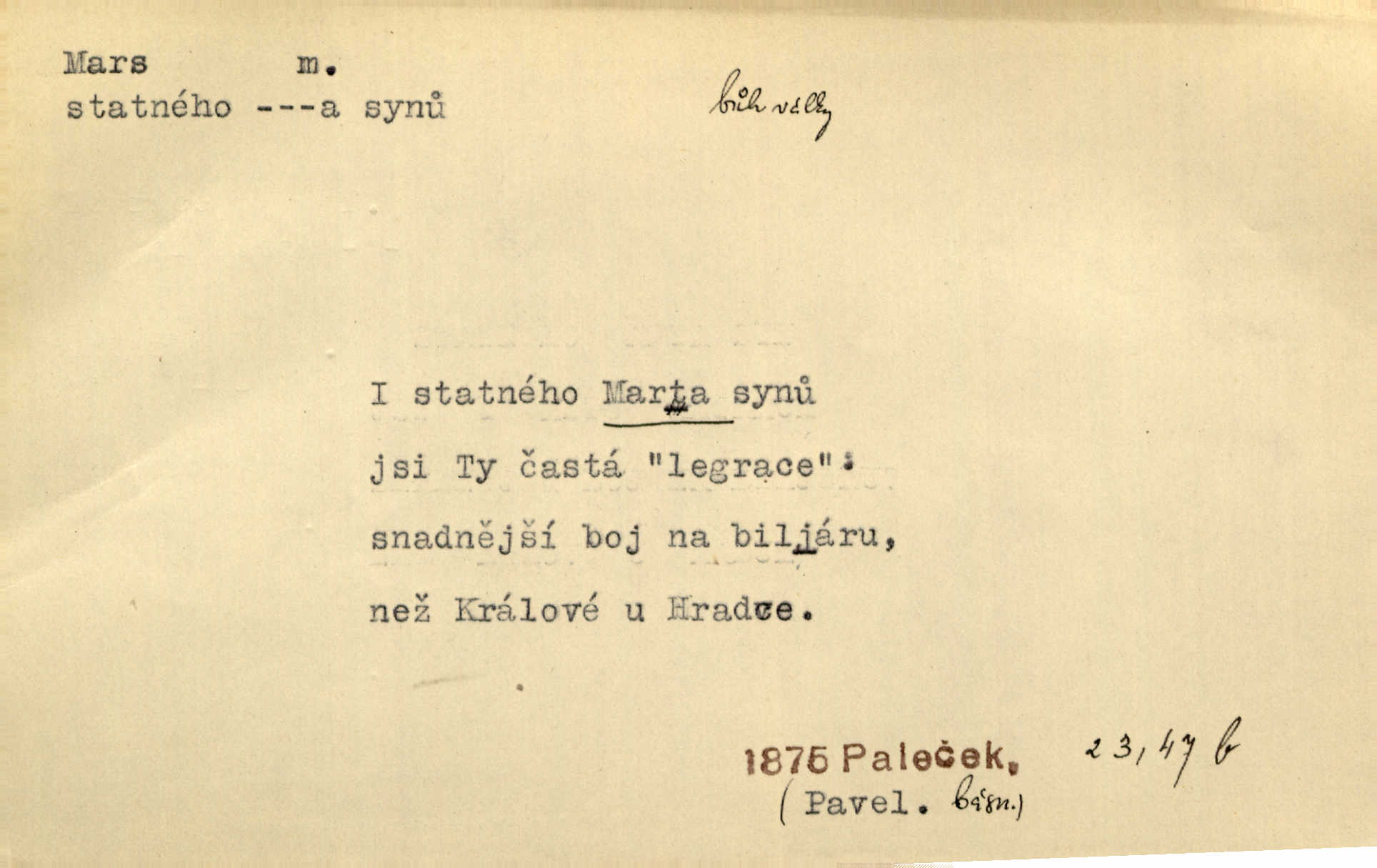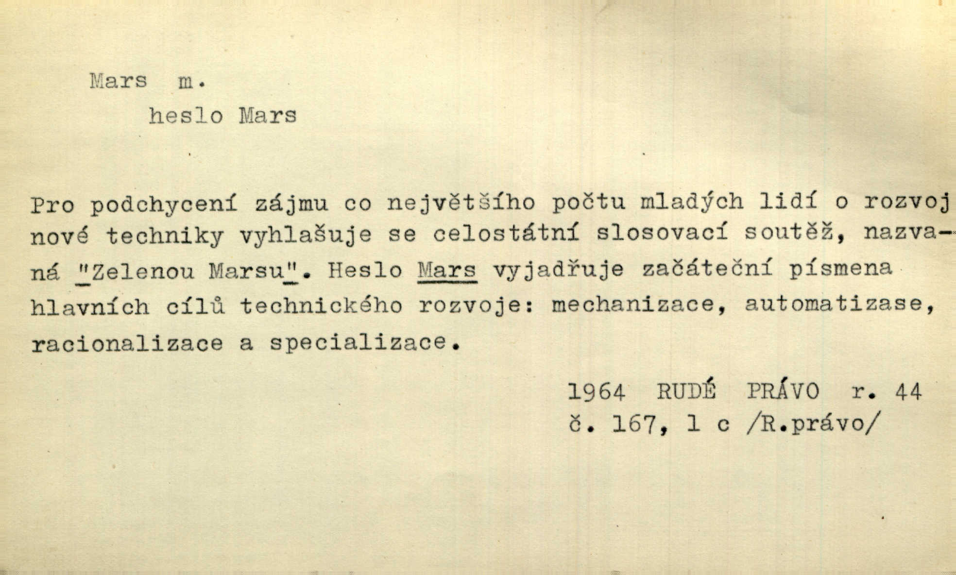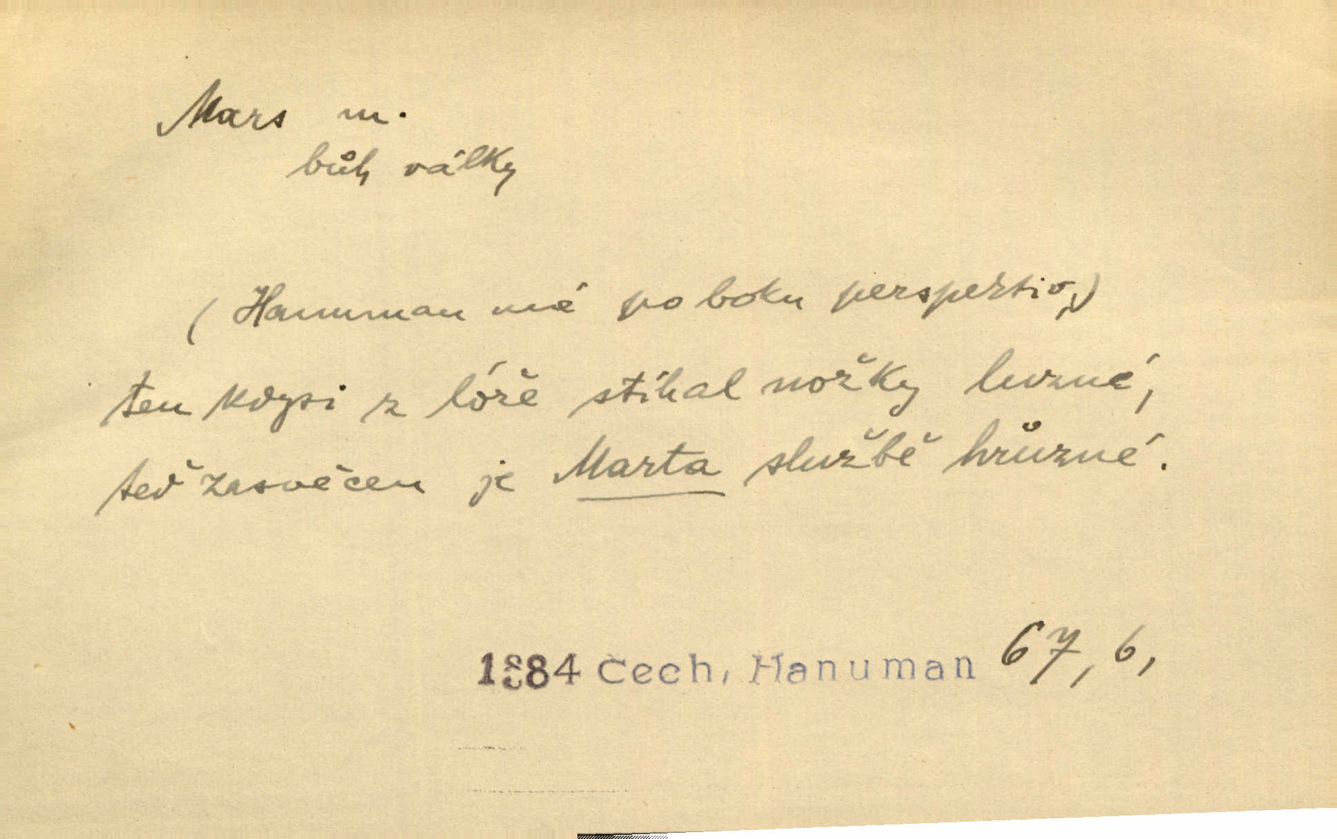 - Mars, Marta m. bůh války u starověkých Římanů. Já dal službě Marta s bohem vojenské službě. Mach. Přen. Mars, Marta n. Marsa, Marse o vojevůdci, vojáku. Starý Mars [generál Conrad v. Hötzendorf] řekl konečně: Ano. Mach. [Kuchařka] rozpředla se mnou esthetickou rozprávku o svém benedekovském Marsovi. Stank. D Mars, Marta n. Marsa jméno jedné z planet. „Ach, kdyby se tak snadno dali dokázati obyvatelé na Martu“, zasmála se slečna Vondrejcová vesele. Čap. Ch. Lev ve znamení Marse. Třeb.