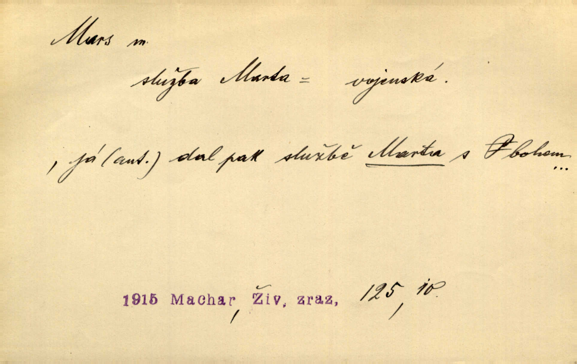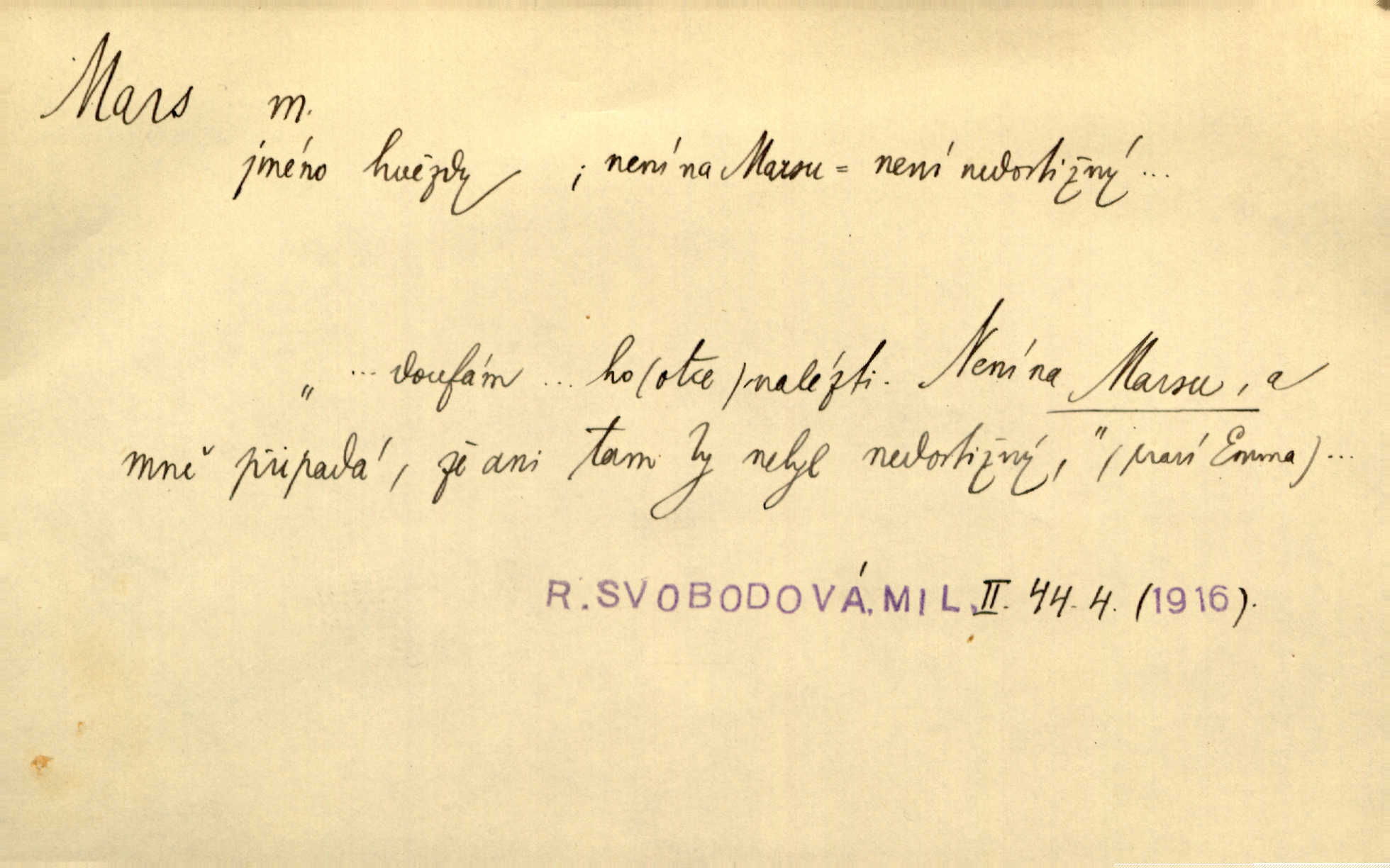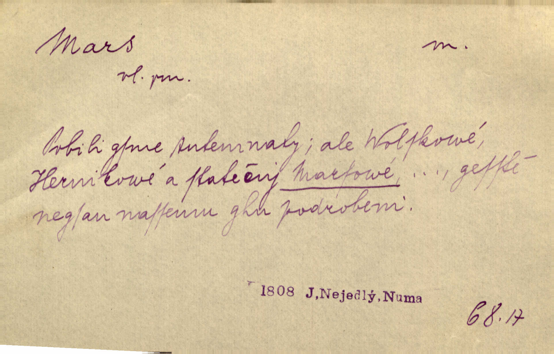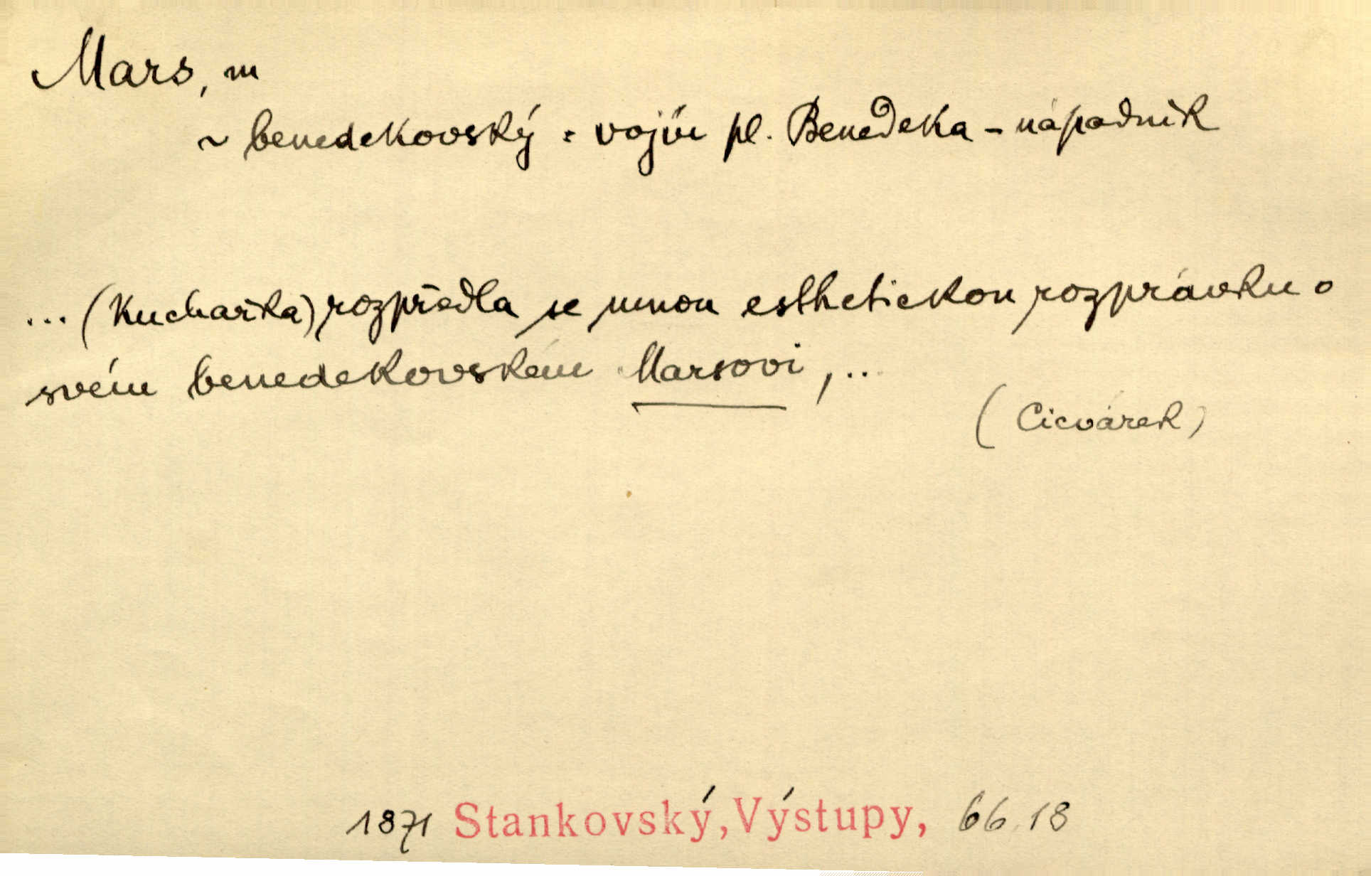 - Mars, Marta m. bůh války u starověkých Římanů. Já dal službě Marta s bohem vojenské službě. Mach. Přen. Mars, Marta n. Marsa, Marse o vojevůdci, vojáku. Starý Mars [generál Conrad v. Hötzendorf] řekl konečně: Ano. Mach. [Kuchařka] rozpředla se mnou esthetickou rozprávku o svém benedekovském Marsovi. Stank. D Mars, Marta n. Marsa jméno jedné z planet. „Ach, kdyby se tak snadno dali dokázati obyvatelé na Martu“, zasmála se slečna Vondrejcová vesele. Čap. Ch. Lev ve znamení Marse. Třeb.