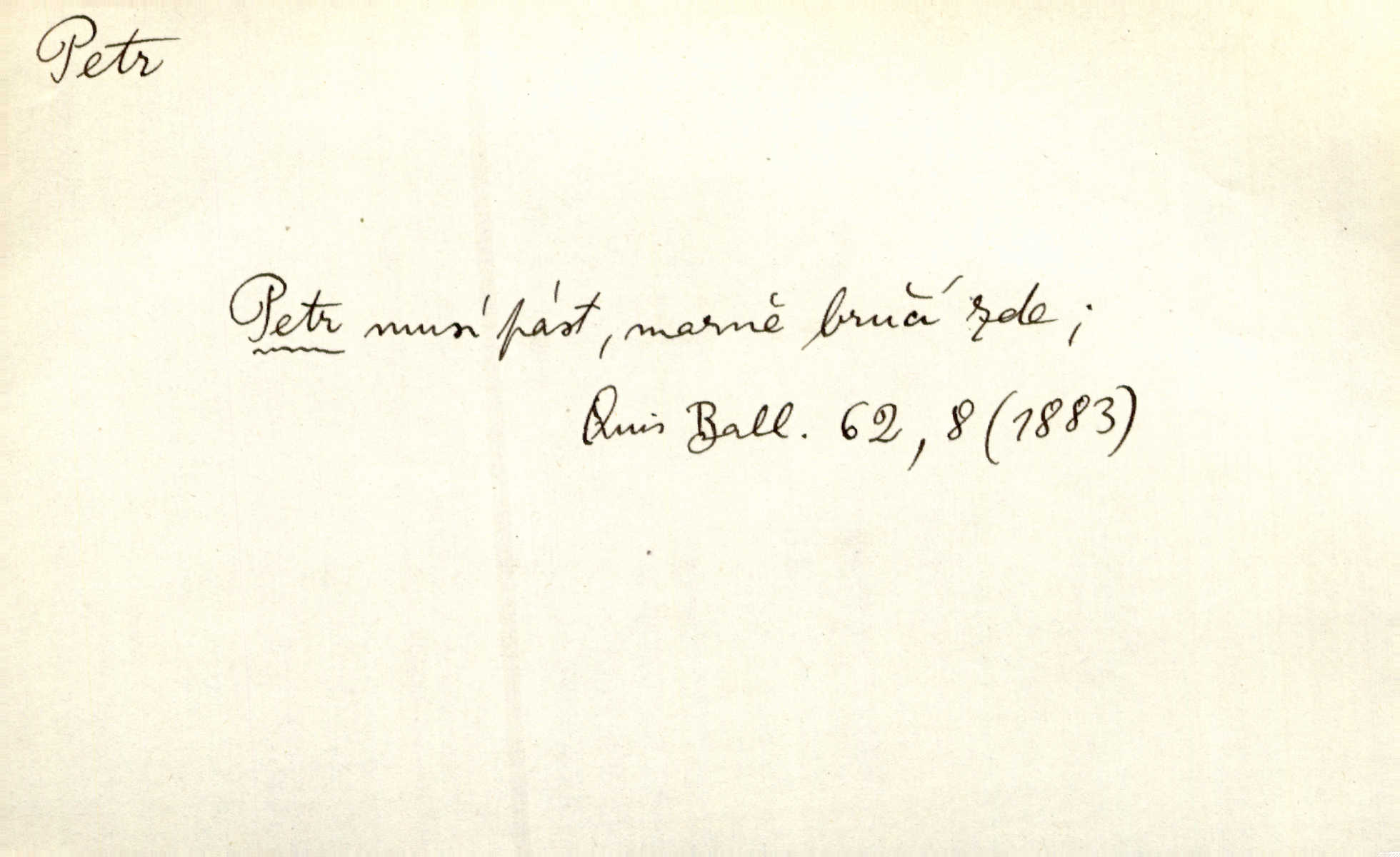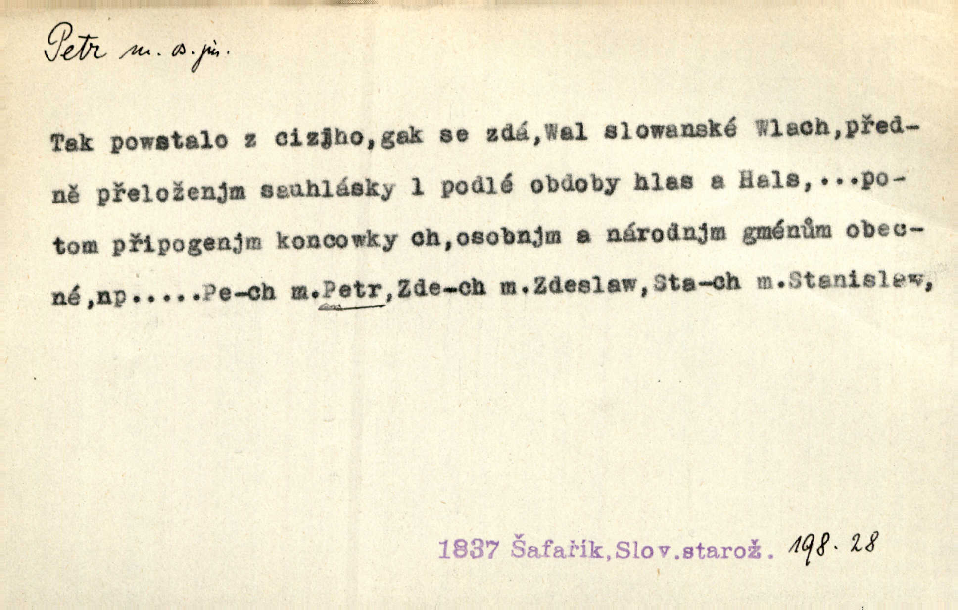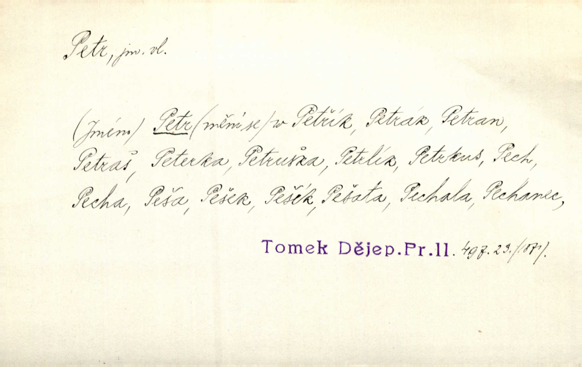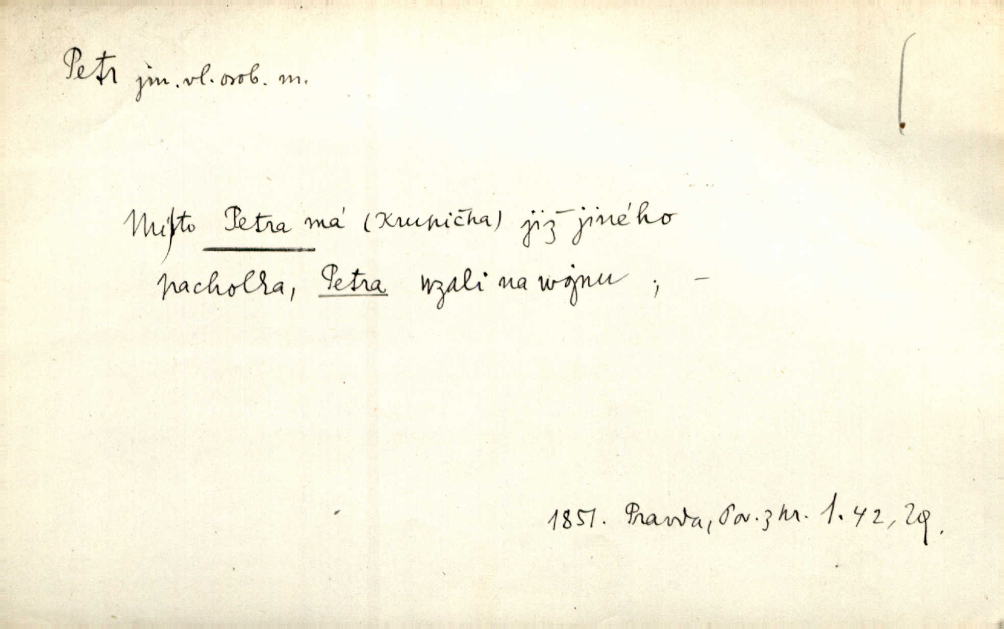 - Petr, -a m. jméno jednoho z apoštolů; osobní jm. mužské. Skála, na níž církev Petrova stojí, odolá věčnosti církev katolická. J. Pichl. Helenka se začervenala a zapřela ho [Ríšu] jako Petr Krista. V. Mrš. [Spravedlnost] vinu stejně trestá, ať jest vinníkem Petr nebo Pavel kdokoli. Hol. Nahlídnul jsem, že jest Petr jako Pavel jeden jako druhý. Havl. Kolísali ti a kolísali oni, opičili se Petr a Pavel ten i onen. Přít. Přen. Plížily se tenkrát [za Václava IV.] děsné doby nejen na lodičku Petrovu, ale i na českou zem na církev. Třeb. Nepomýšlel déle [císař]‚ aby se Petrovu náměstku zachoval papeži. Tyl. D černý petr druh hry v karty; jedna z karet této hry. Sklepnice hrály černého Petra. V. Mrš. Umíval jsem dudáka a černého Petra. Rais.