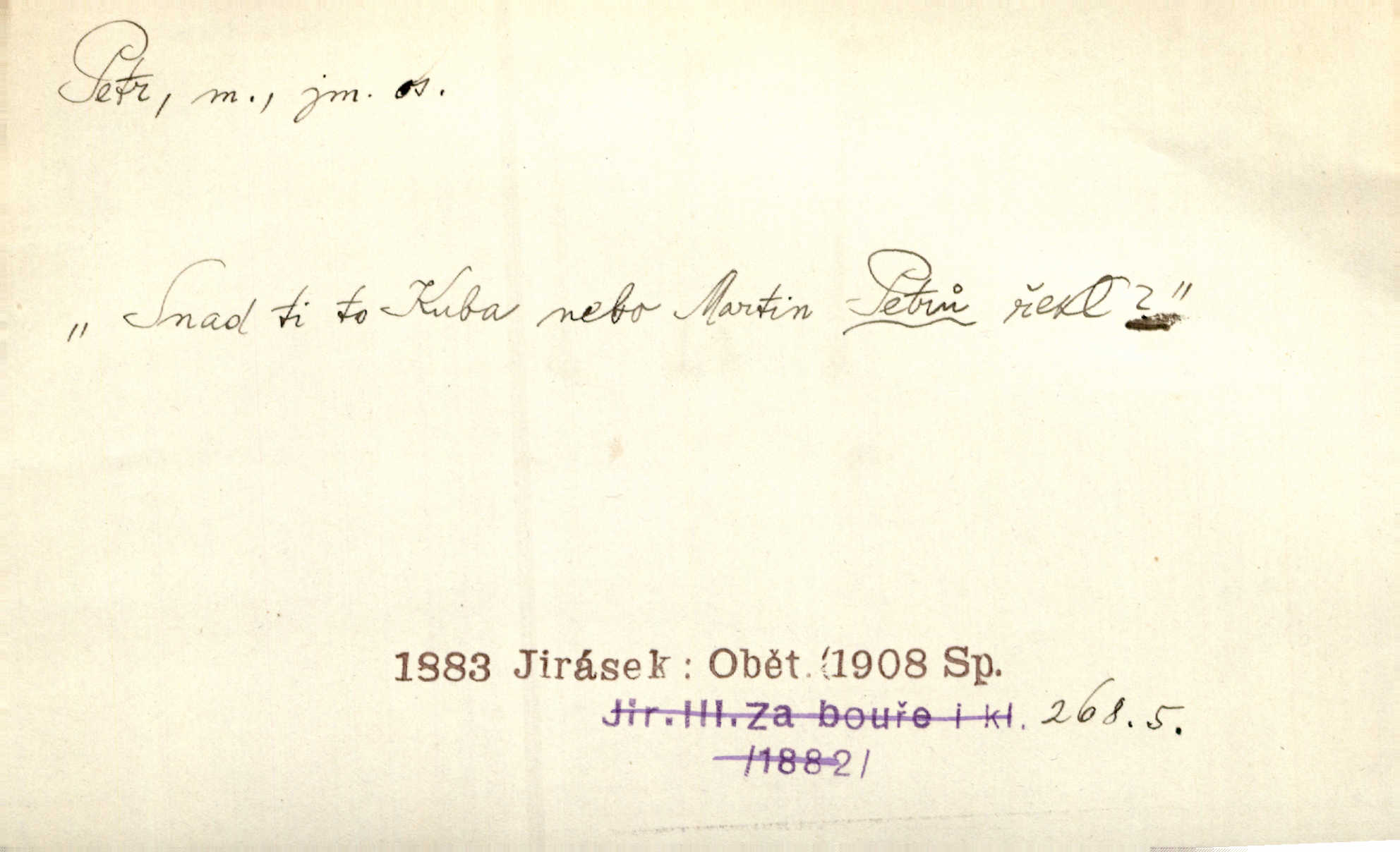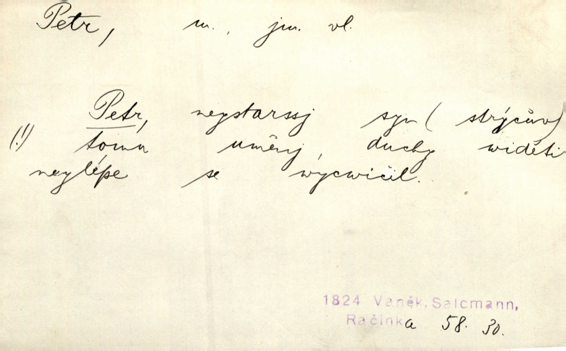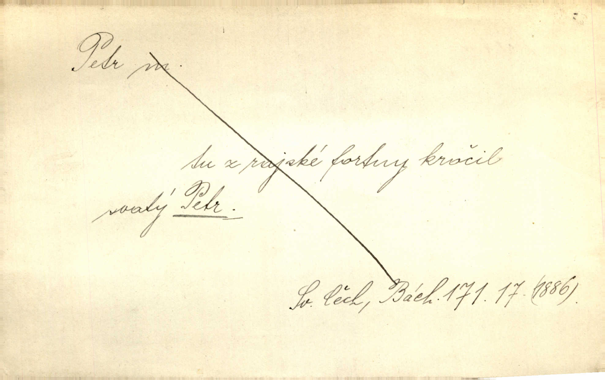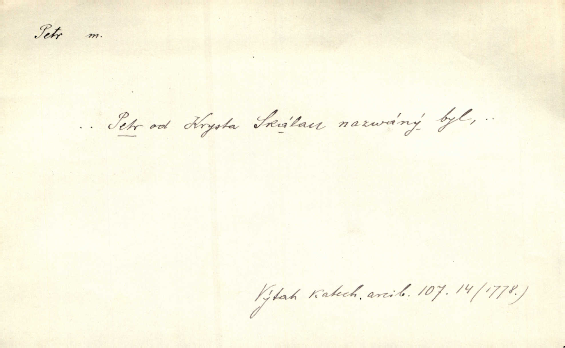 - Petr, -a m. jméno jednoho z apoštolů; osobní jm. mužské. Skála, na níž církev Petrova stojí, odolá věčnosti církev katolická. J. Pichl. Helenka se začervenala a zapřela ho [Ríšu] jako Petr Krista. V. Mrš. [Spravedlnost] vinu stejně trestá, ať jest vinníkem Petr nebo Pavel kdokoli. Hol. Nahlídnul jsem, že jest Petr jako Pavel jeden jako druhý. Havl. Kolísali ti a kolísali oni, opičili se Petr a Pavel ten i onen. Přít. Přen. Plížily se tenkrát [za Václava IV.] děsné doby nejen na lodičku Petrovu, ale i na českou zem na církev. Třeb. Nepomýšlel déle [císař]‚ aby se Petrovu náměstku zachoval papeži. Tyl. D černý petr druh hry v karty; jedna z karet této hry. Sklepnice hrály černého Petra. V. Mrš. Umíval jsem dudáka a černého Petra. Rais.