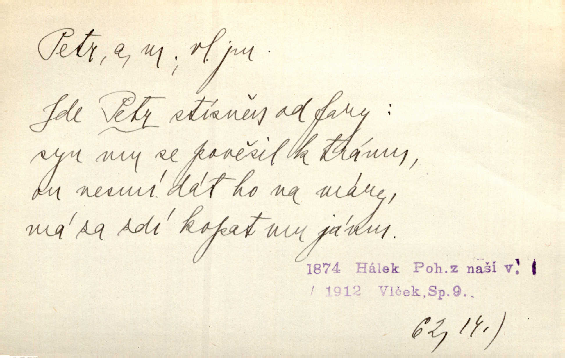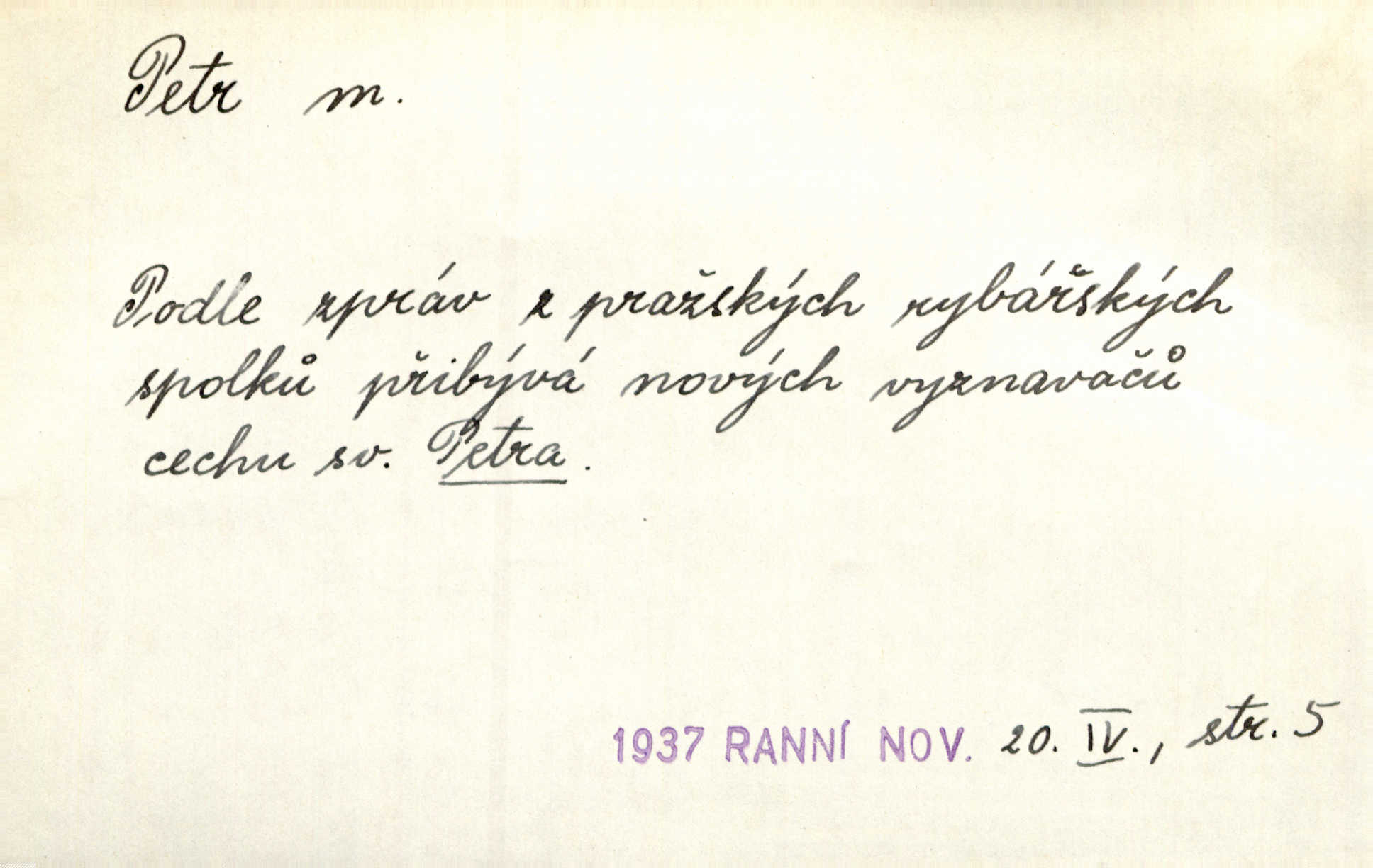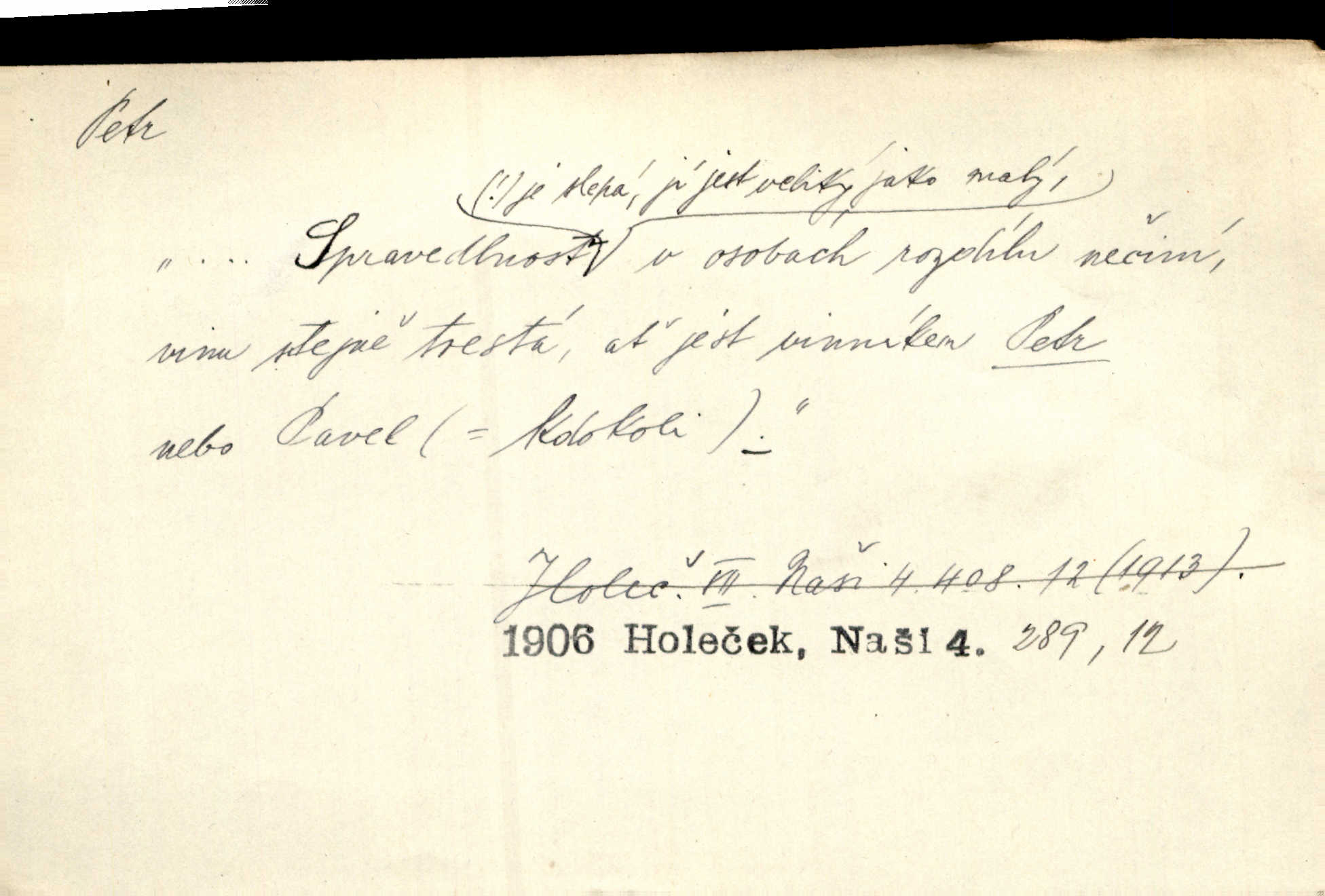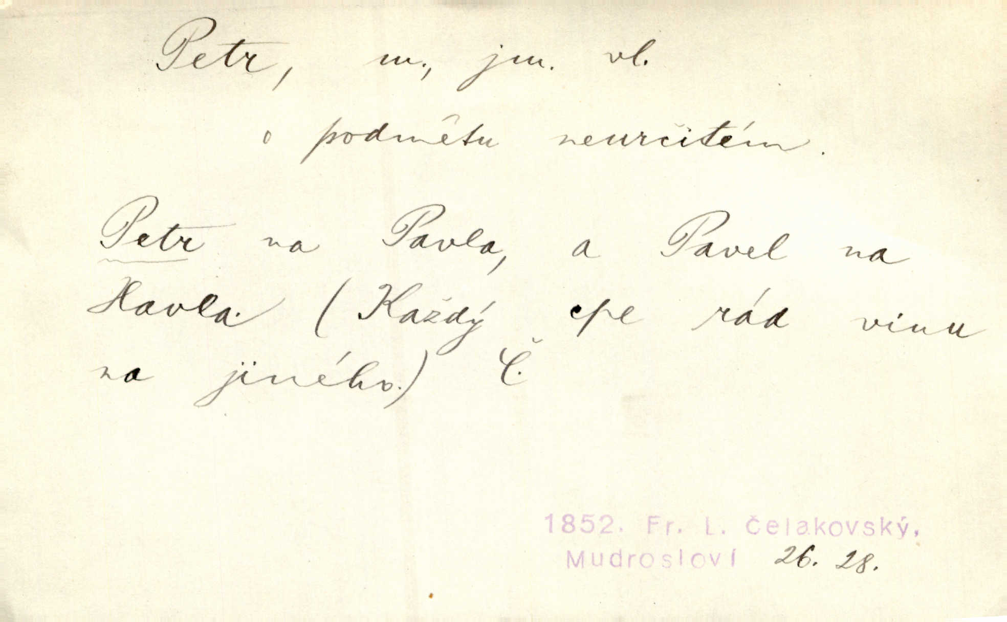 - Petr, -a m. jméno jednoho z apoštolů; osobní jm. mužské. Skála, na níž církev Petrova stojí, odolá věčnosti církev katolická. J. Pichl. Helenka se začervenala a zapřela ho [Ríšu] jako Petr Krista. V. Mrš. [Spravedlnost] vinu stejně trestá, ať jest vinníkem Petr nebo Pavel kdokoli. Hol. Nahlídnul jsem, že jest Petr jako Pavel jeden jako druhý. Havl. Kolísali ti a kolísali oni, opičili se Petr a Pavel ten i onen. Přít. Přen. Plížily se tenkrát [za Václava IV.] děsné doby nejen na lodičku Petrovu, ale i na českou zem na církev. Třeb. Nepomýšlel déle [císař]‚ aby se Petrovu náměstku zachoval papeži. Tyl. D černý petr druh hry v karty; jedna z karet této hry. Sklepnice hrály černého Petra. V. Mrš. Umíval jsem dudáka a černého Petra. Rais.