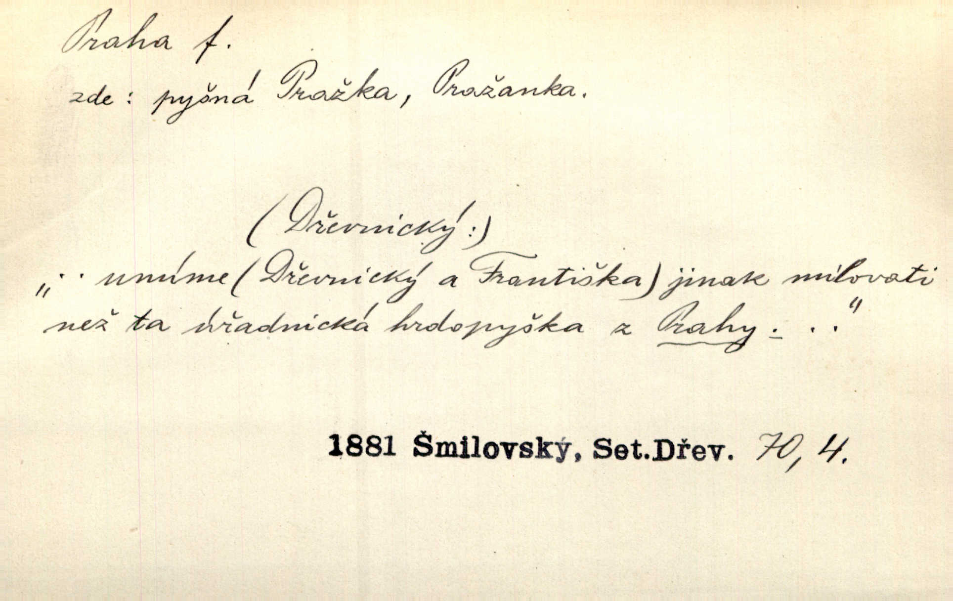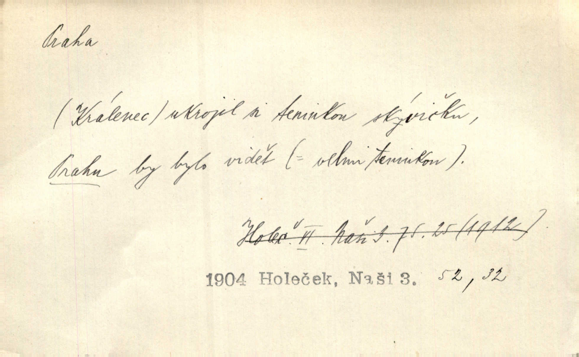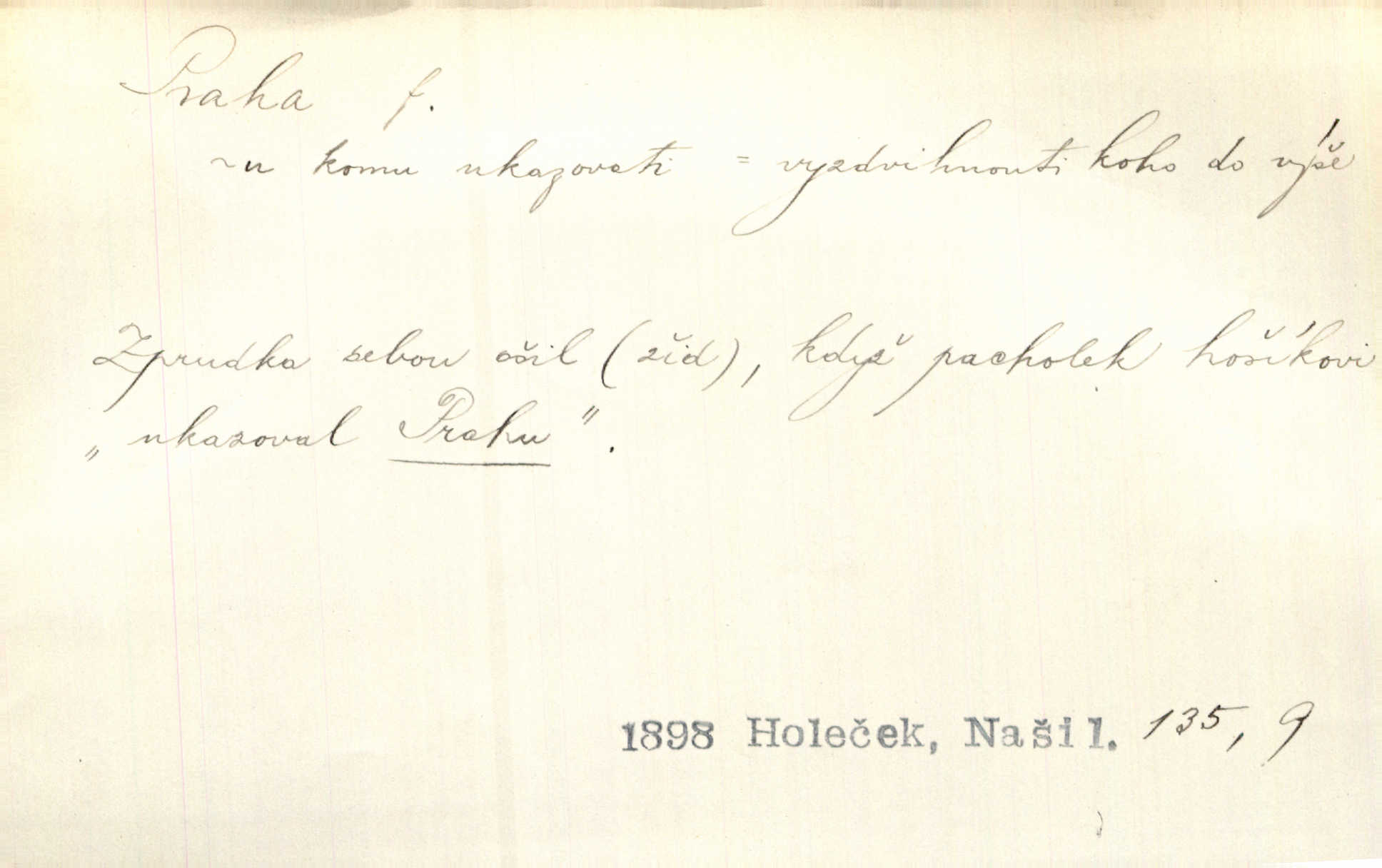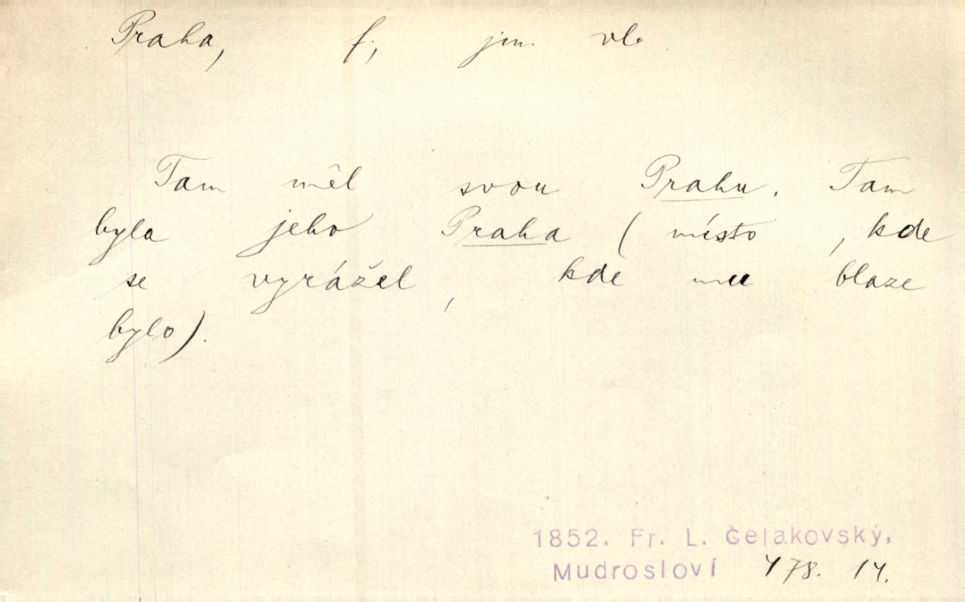 - Praha, -y f. jm. hlavního města v Čechách. Praha přišla se sobě ukázati v bohatých toaletách obyvatelé Prahy. Hlad. Prahu je na Stýblovi vidět! pobyt v Praze, uhlazené chování. Rais. Pacholek hošíkovi „ukazoval Prahu“ vyzdvihl ho do výše uchopením oběma rukama za hlavu. Hol. [Králenec] ukrojil si teninkou skývičku. Prahu by bylo vidět velmi tenounkou. Hol. Tak takové ono to je! No tak, už jsme z Prahy doma! konečně tomu rozumíme. Mor. Byl nerad, že jsem odešla, u nás byla jeho Praha nejmilejší místo pobytu. Něm. Divadlo bylo od jakživa moje Praha největší potěšení, radost. Šmil. U Hlaváčků mají pašeráci svou Prahu své oblíbené středisko. Jir. Velká Praha Praha s bývalými předměstími a nejbližším okolím. Přen. Nastaviv si celé Prahy zlatých nadějí do budoucnosti ubíral se zvolna k domovu množství. Šmil.