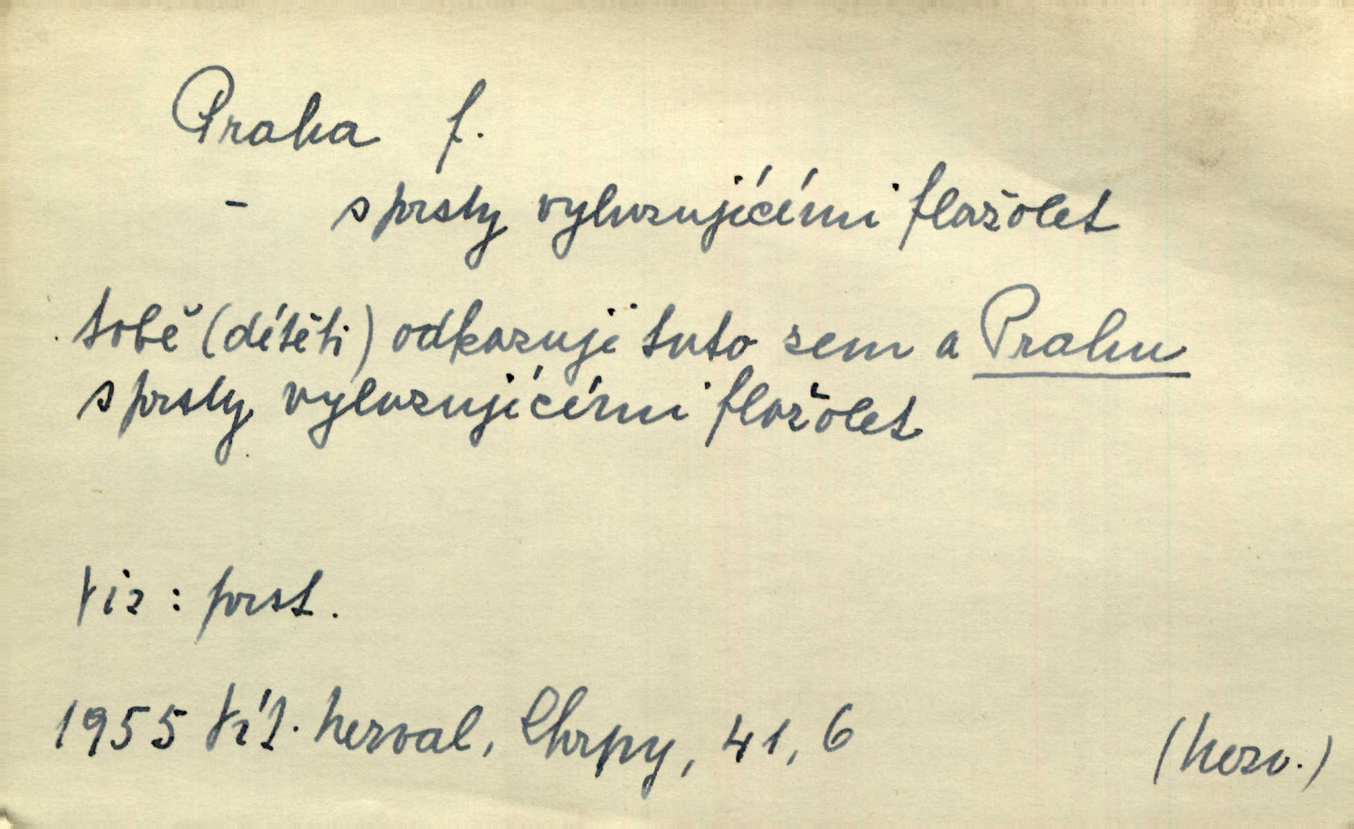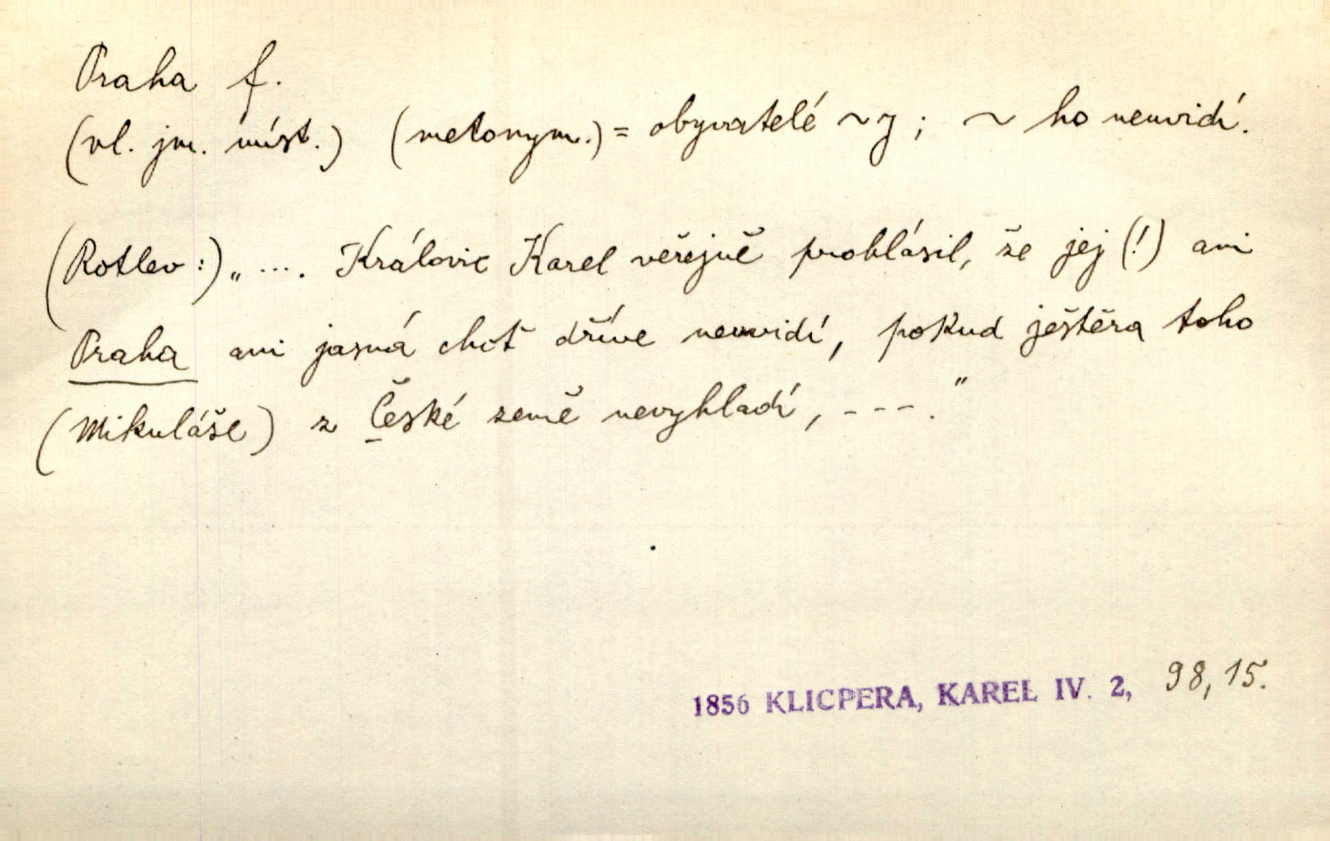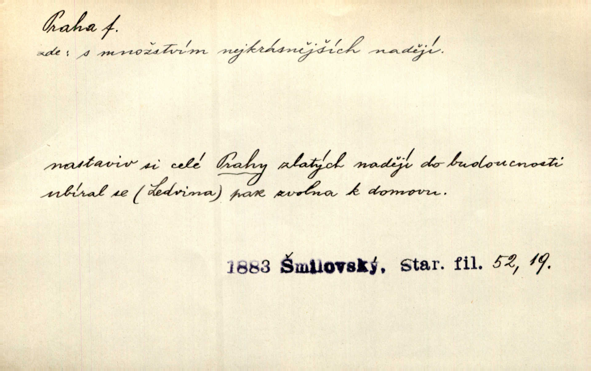 - Praha, -y f. jm. hlavního města v Čechách. Praha přišla se sobě ukázati v bohatých toaletách obyvatelé Prahy. Hlad. Prahu je na Stýblovi vidět! pobyt v Praze, uhlazené chování. Rais. Pacholek hošíkovi „ukazoval Prahu“ vyzdvihl ho do výše uchopením oběma rukama za hlavu. Hol. [Králenec] ukrojil si teninkou skývičku. Prahu by bylo vidět velmi tenounkou. Hol. Tak takové ono to je! No tak, už jsme z Prahy doma! konečně tomu rozumíme. Mor. Byl nerad, že jsem odešla, u nás byla jeho Praha nejmilejší místo pobytu. Něm. Divadlo bylo od jakživa moje Praha největší potěšení, radost. Šmil. U Hlaváčků mají pašeráci svou Prahu své oblíbené středisko. Jir. Velká Praha Praha s bývalými předměstími a nejbližším okolím. Přen. Nastaviv si celé Prahy zlatých nadějí do budoucnosti ubíral se zvolna k domovu množství. Šmil.