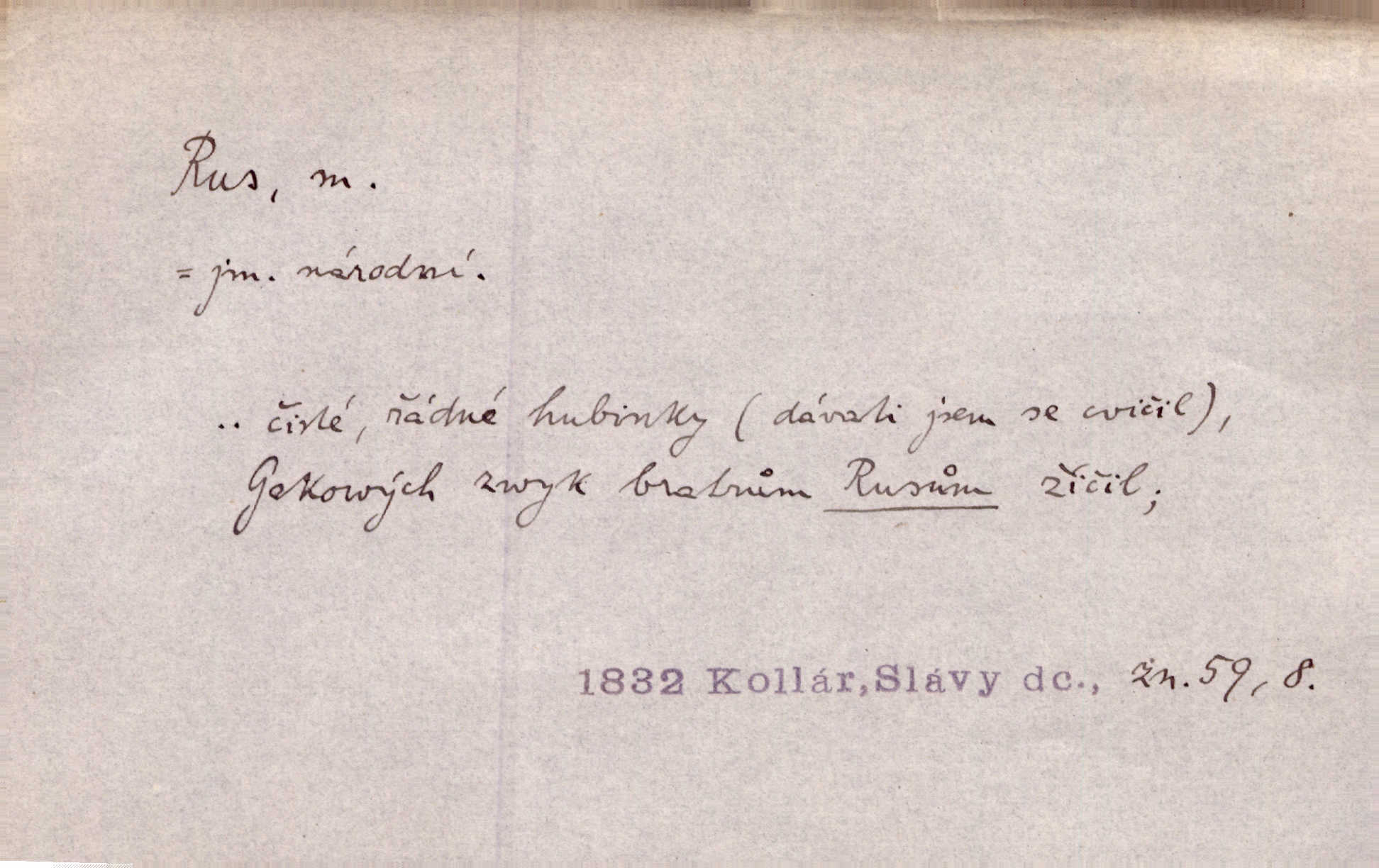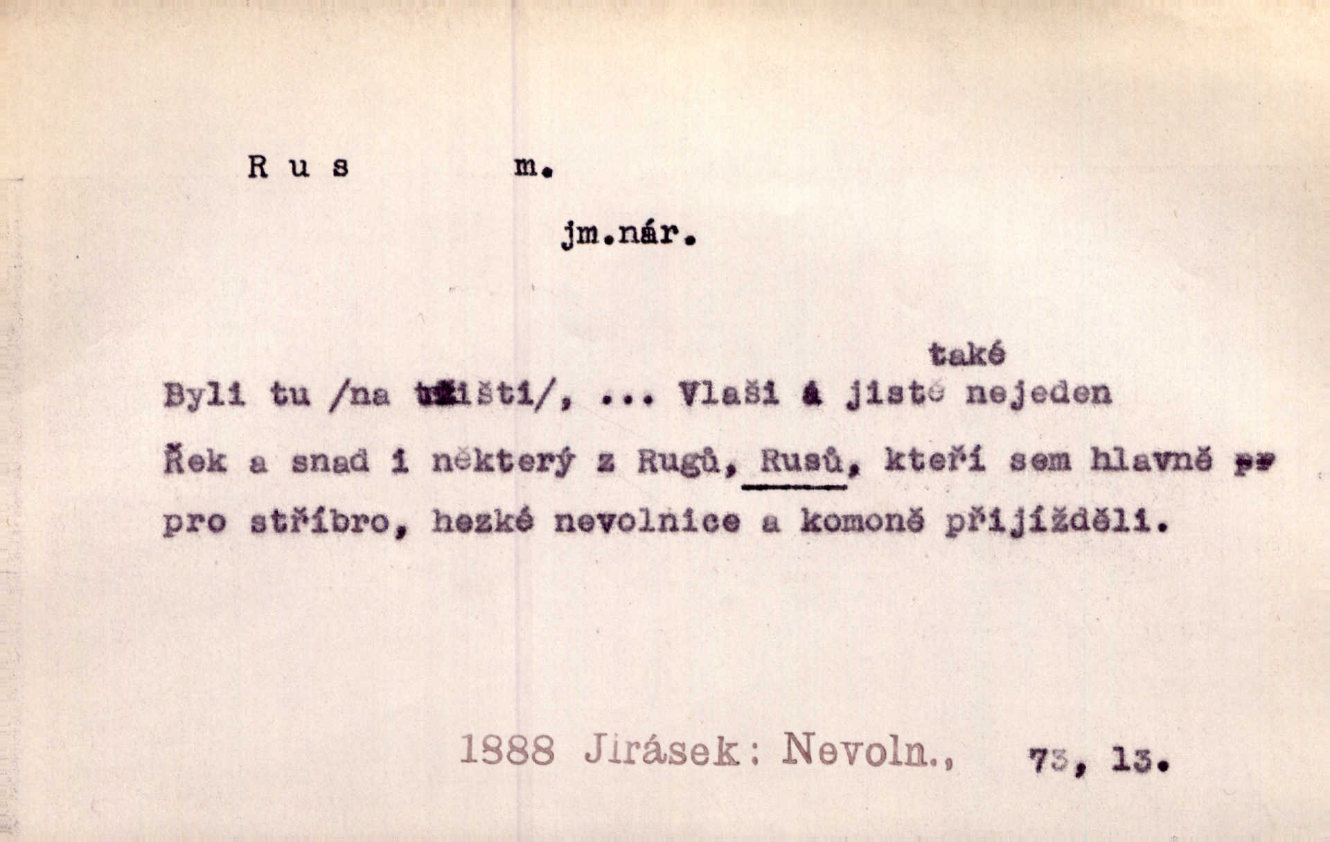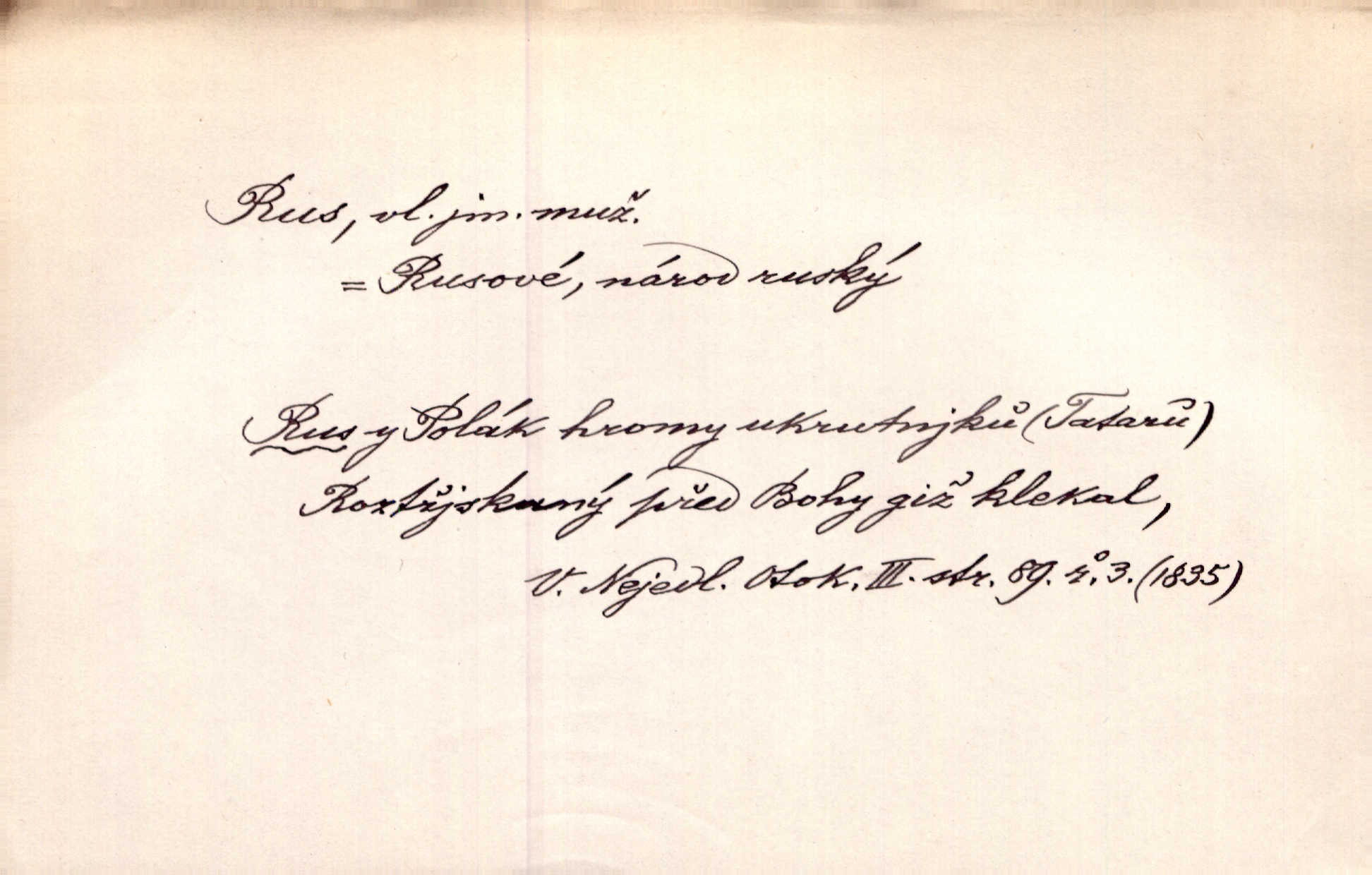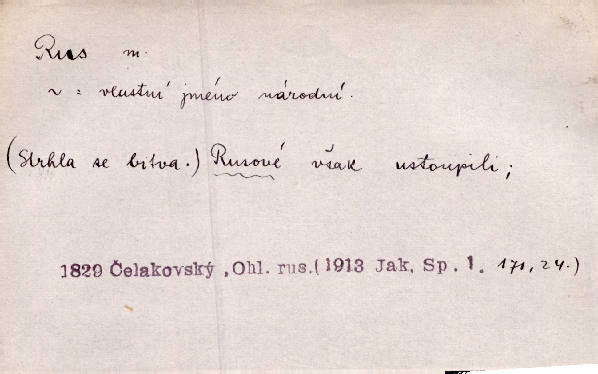 - Rus, -a m. člen největšího slovanského národa. Tudy táhli Rusové postupujíce proti Napoleonovi I. Jir. Rus pošle [do boje] dvakrát sto tisíc mužů Rusové, ruský národ. Jir. Zdraví měl jak Rus a mysli byl veselé pevné. Herb. Váš schovanec jest mnohem statnější [nežli Pavel] a zdravý jako Rus. Leg.