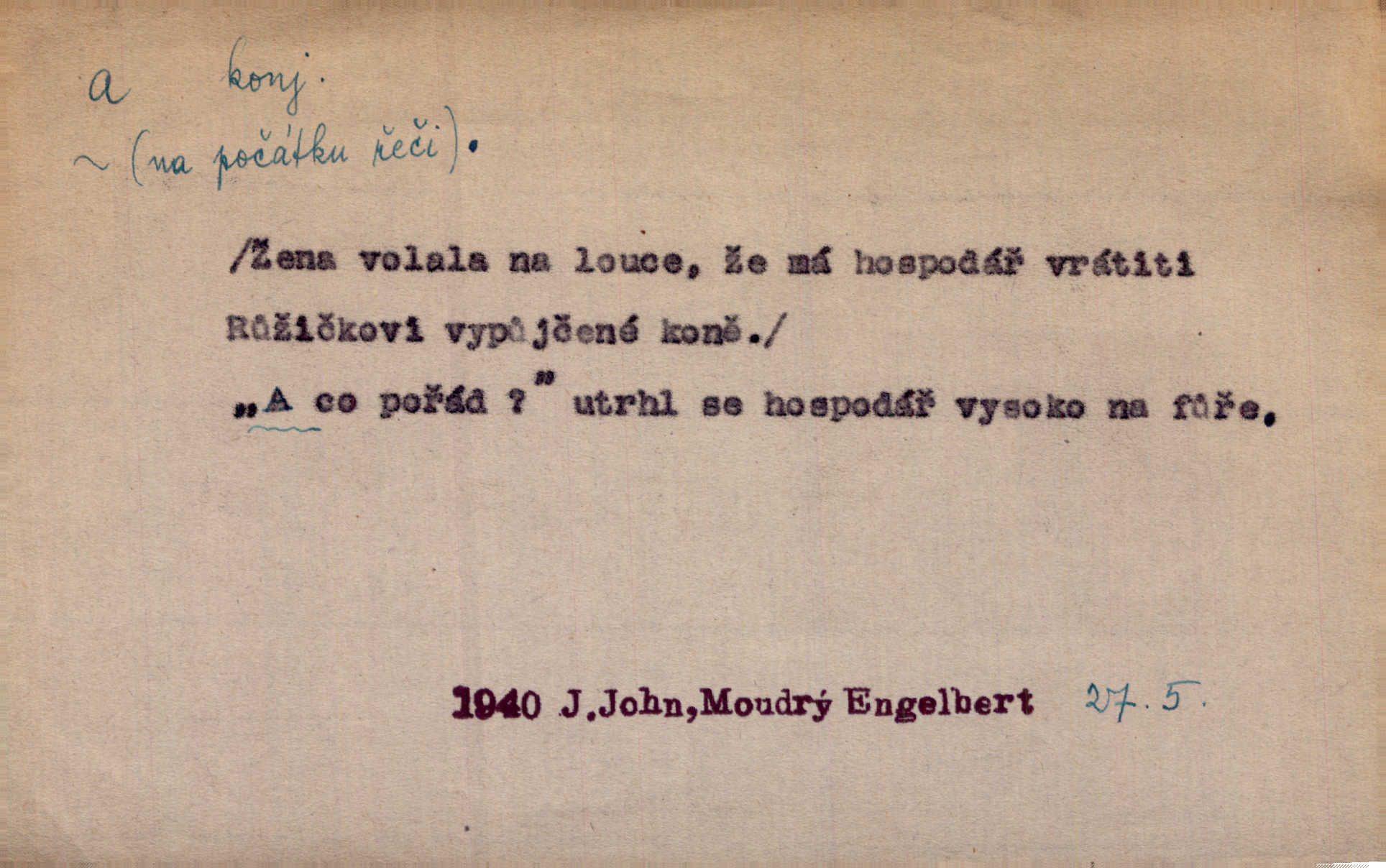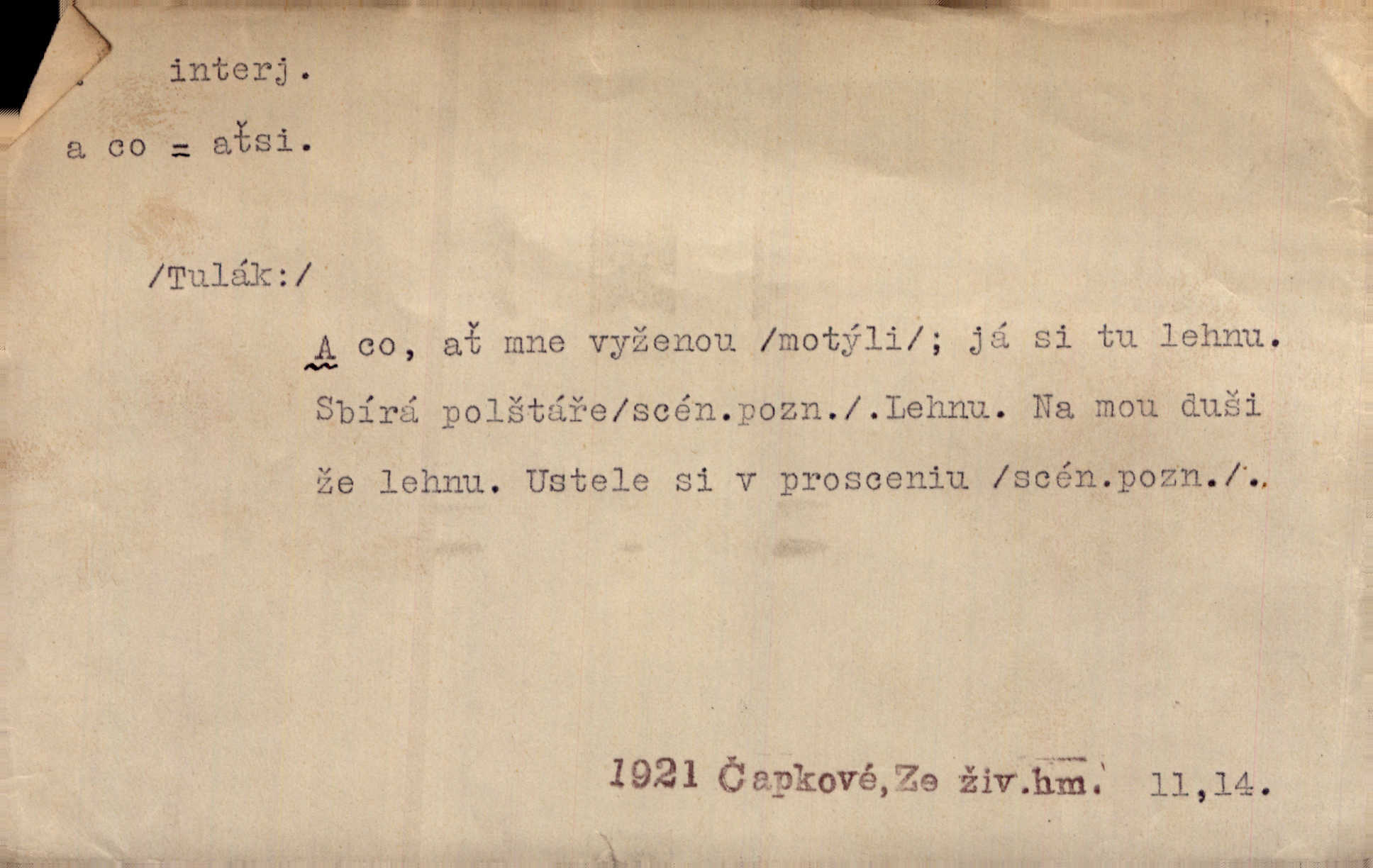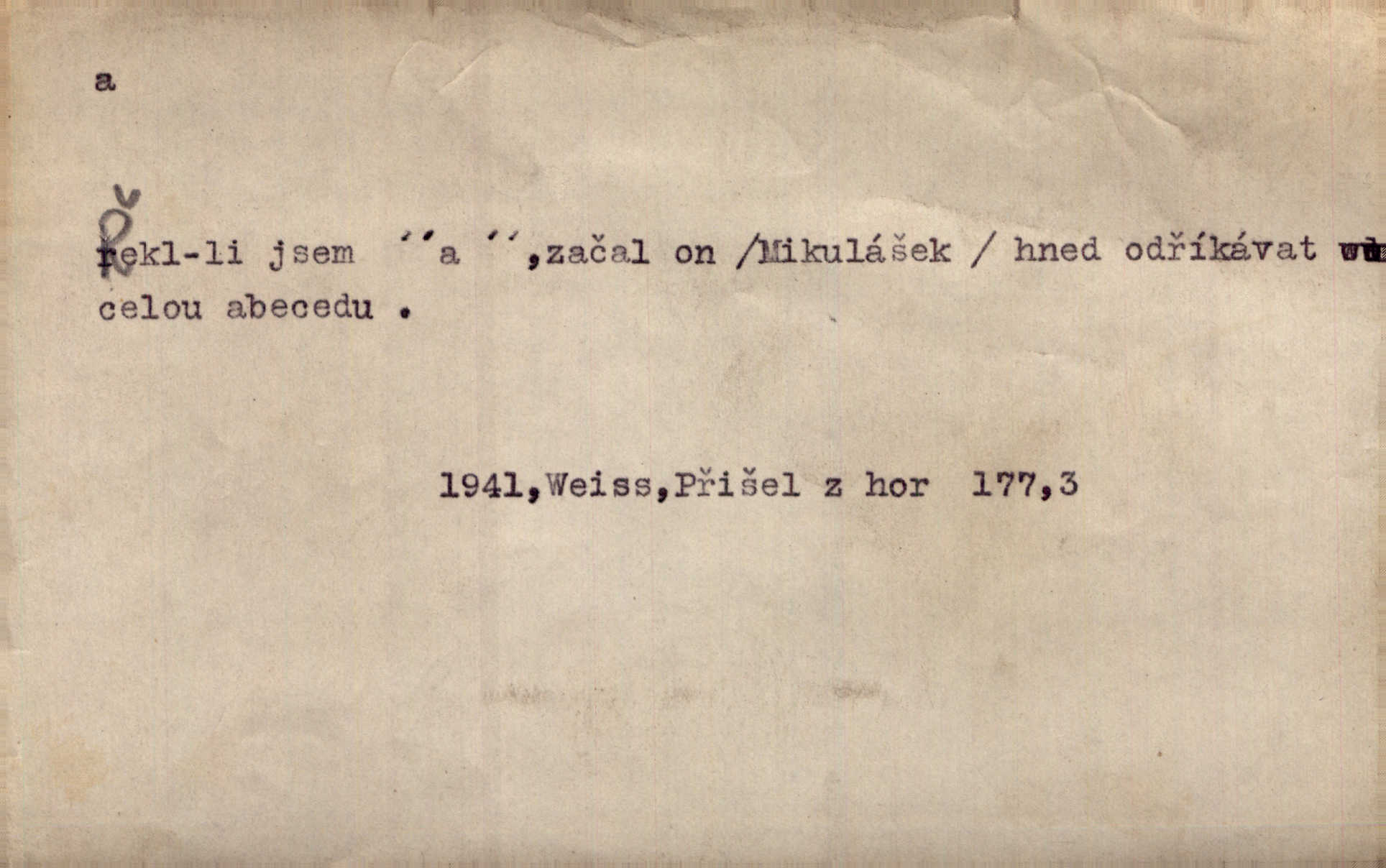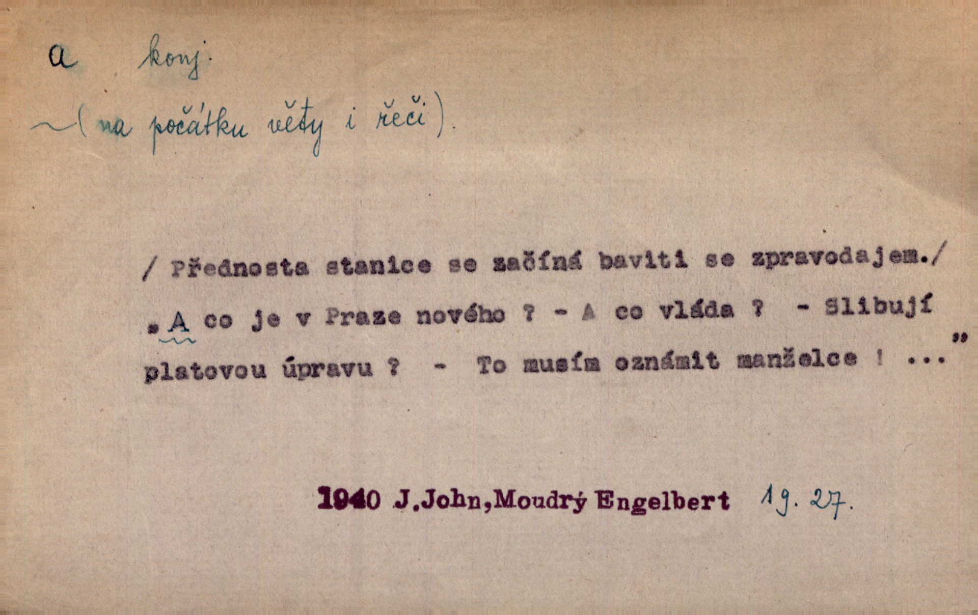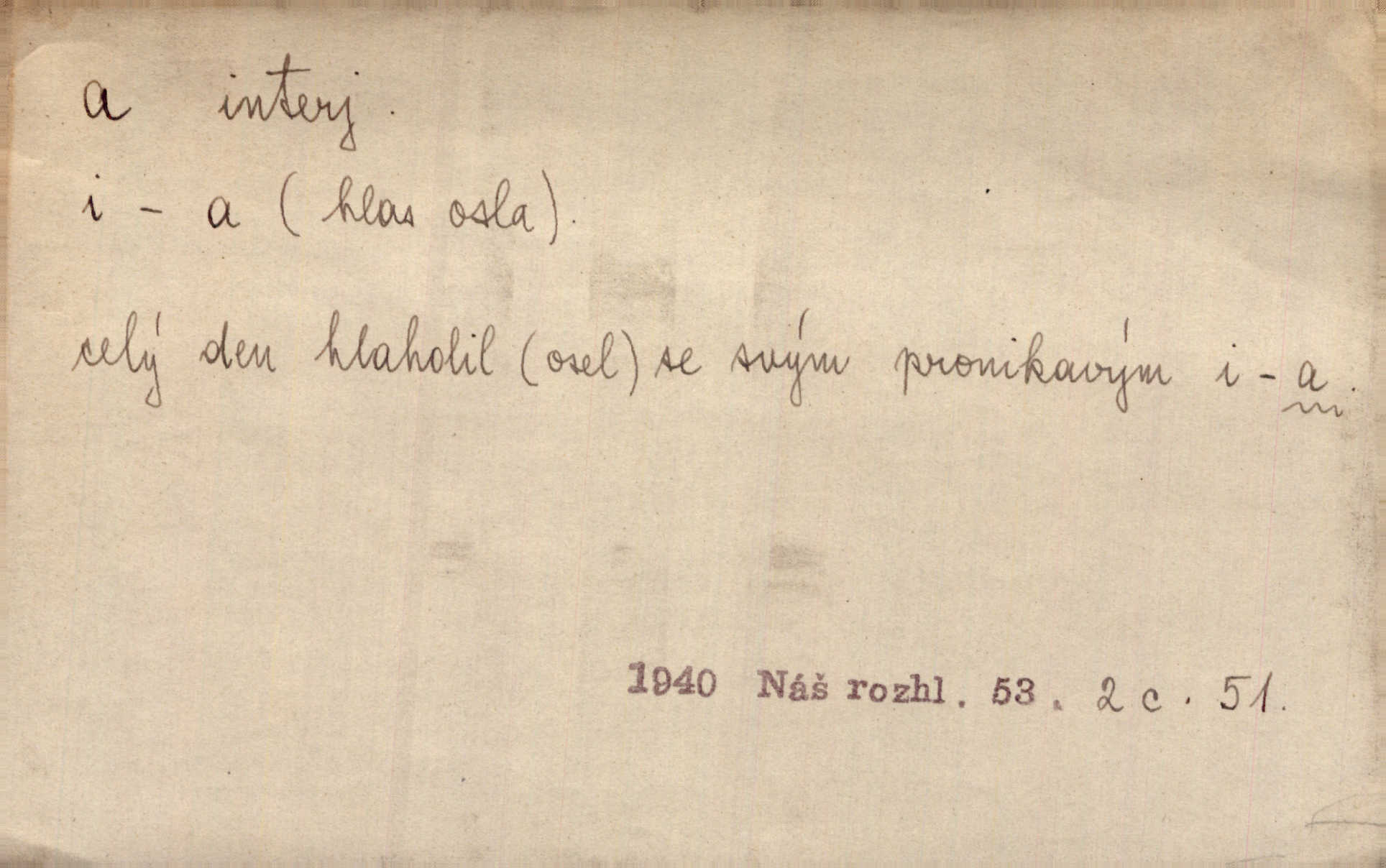 - a, á citosl. obyč. značí překvapení. „A!“ zvolal jen pan Pilňáček, až to škviklo, ale v tom „a!“ bylo vše: podivení, úžas, překvapení a také trochu nedůvěry. Herrm. „Aaa?!“ divil se Don Juan. Mach. Vyjadřuje uspokojení. Ááá — to to voní! bolest, stenání. Dech básníkův provázen jest sotva znatelným zastenáním: „A… a… a…“ Čap. Ch. rozmrzelost. „Co to, že vy nejste dnes v úřadě?“ „A, zpozdil jsem se dnes.“ Herb. Naznačuje zívání. Faust se nudí a já se nudím také! Aá! Zákr.