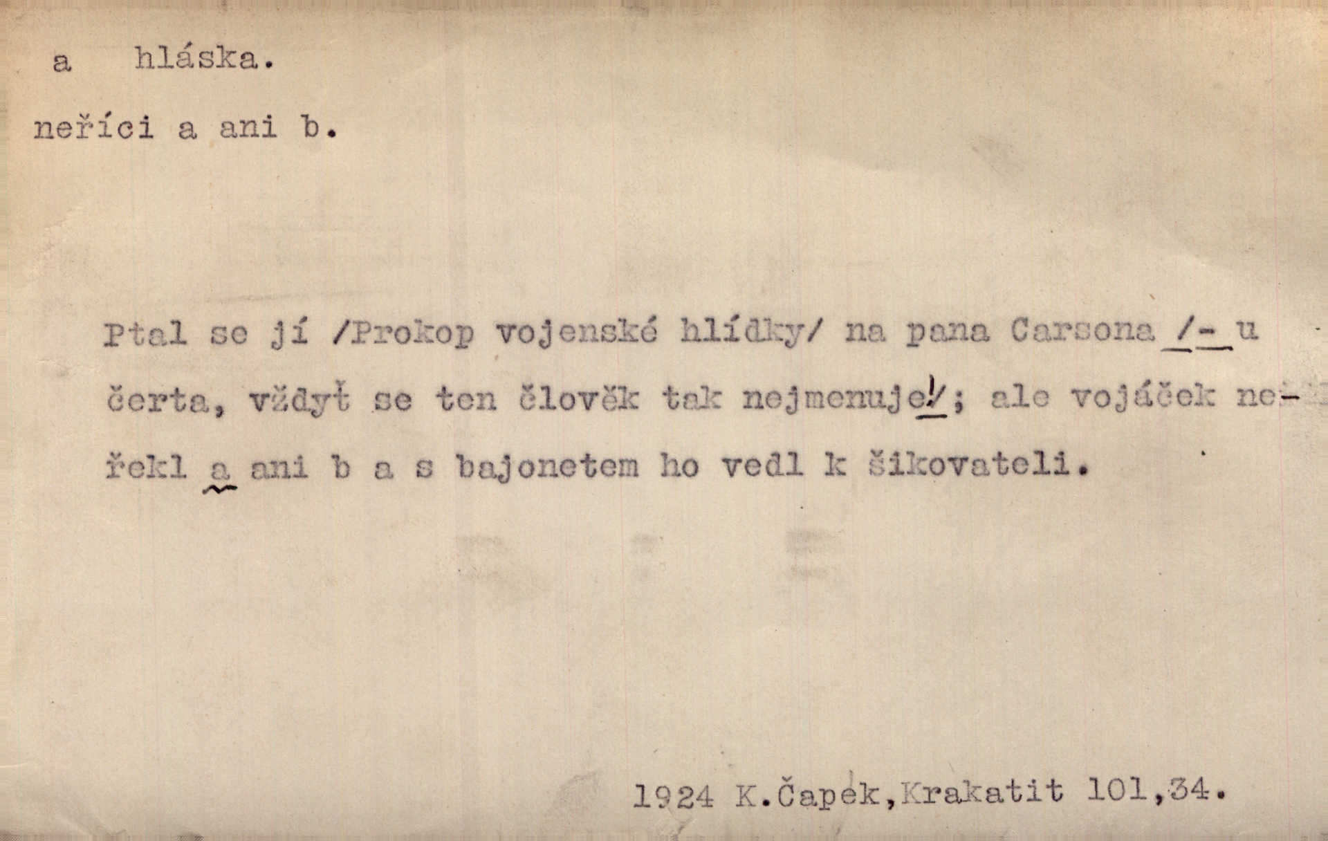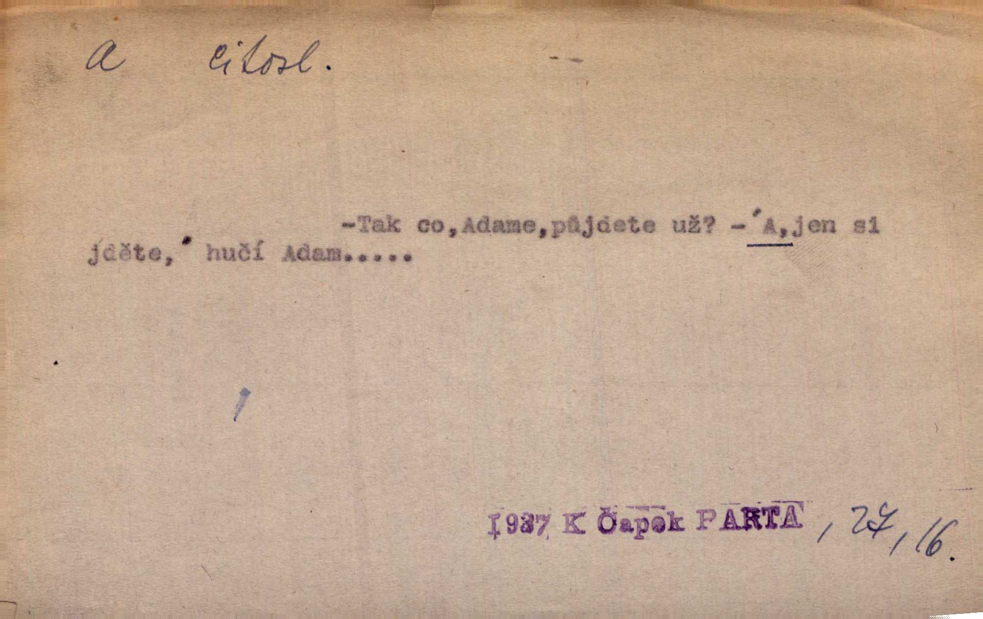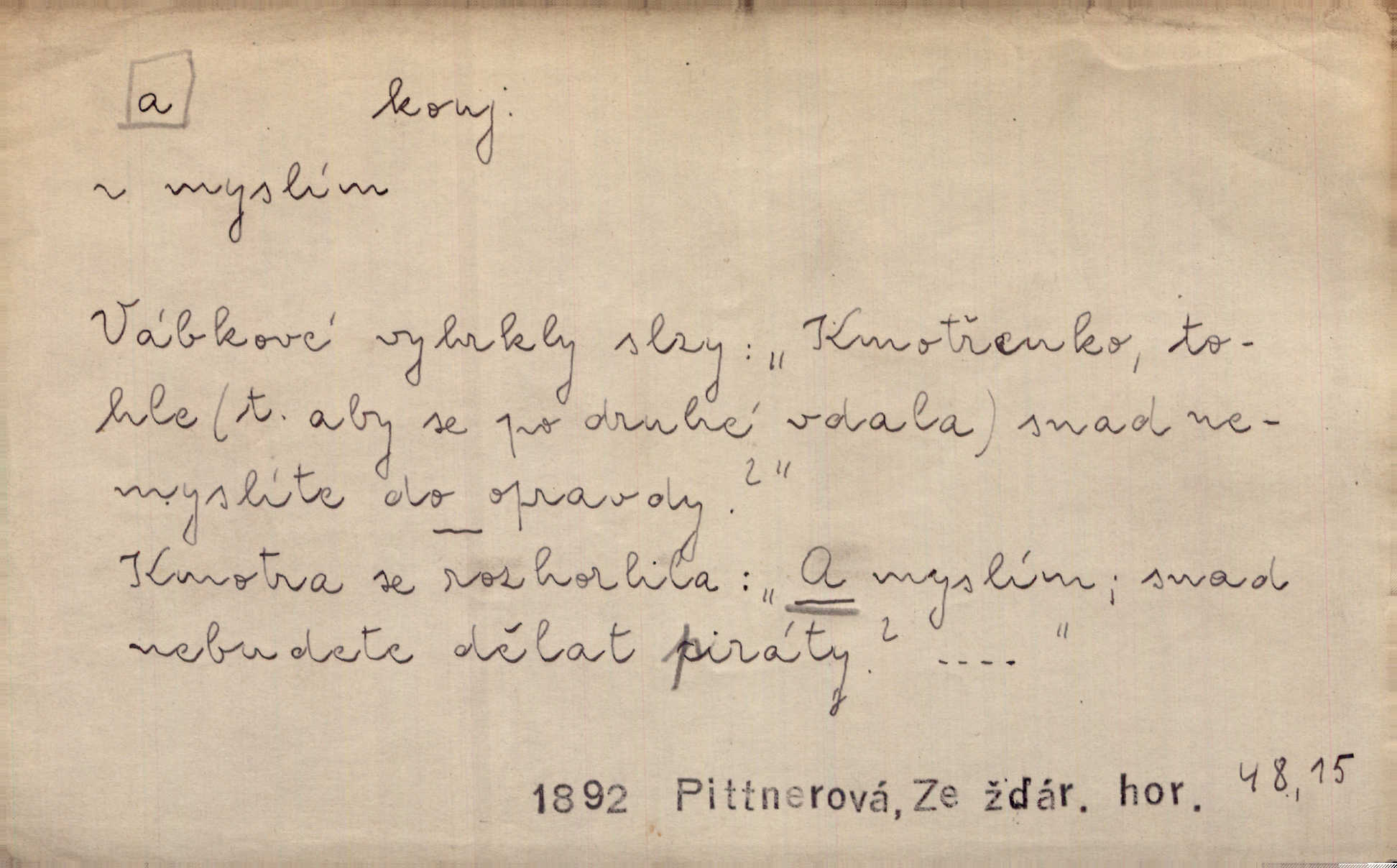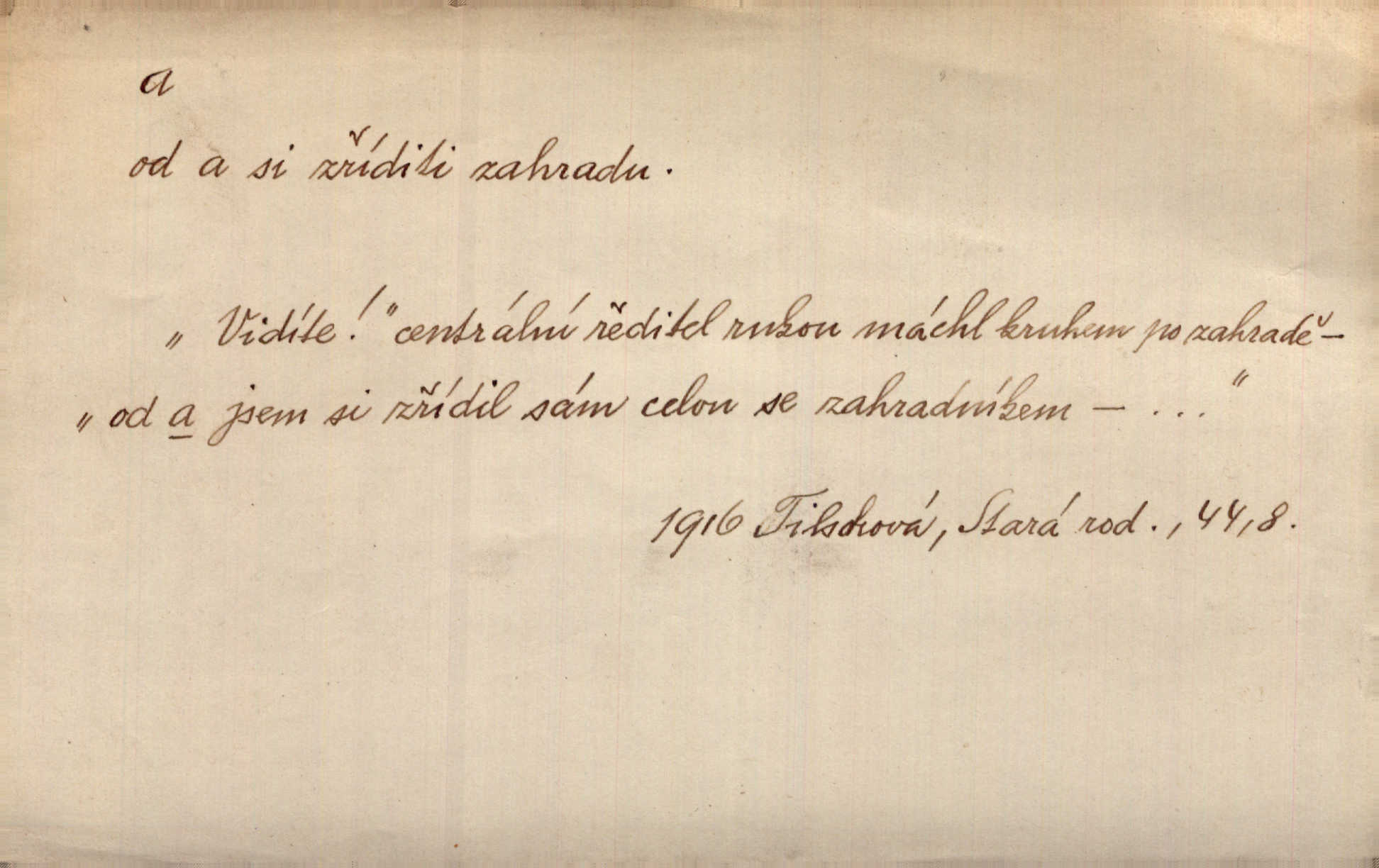 - a, á citosl. obyč. značí překvapení. „A!“ zvolal jen pan Pilňáček, až to škviklo, ale v tom „a!“ bylo vše: podivení, úžas, překvapení a také trochu nedůvěry. Herrm. „Aaa?!“ divil se Don Juan. Mach. Vyjadřuje uspokojení. Ááá — to to voní! bolest, stenání. Dech básníkův provázen jest sotva znatelným zastenáním: „A… a… a…“ Čap. Ch. rozmrzelost. „Co to, že vy nejste dnes v úřadě?“ „A, zpozdil jsem se dnes.“ Herb. Naznačuje zívání. Faust se nudí a já se nudím také! Aá! Zákr.