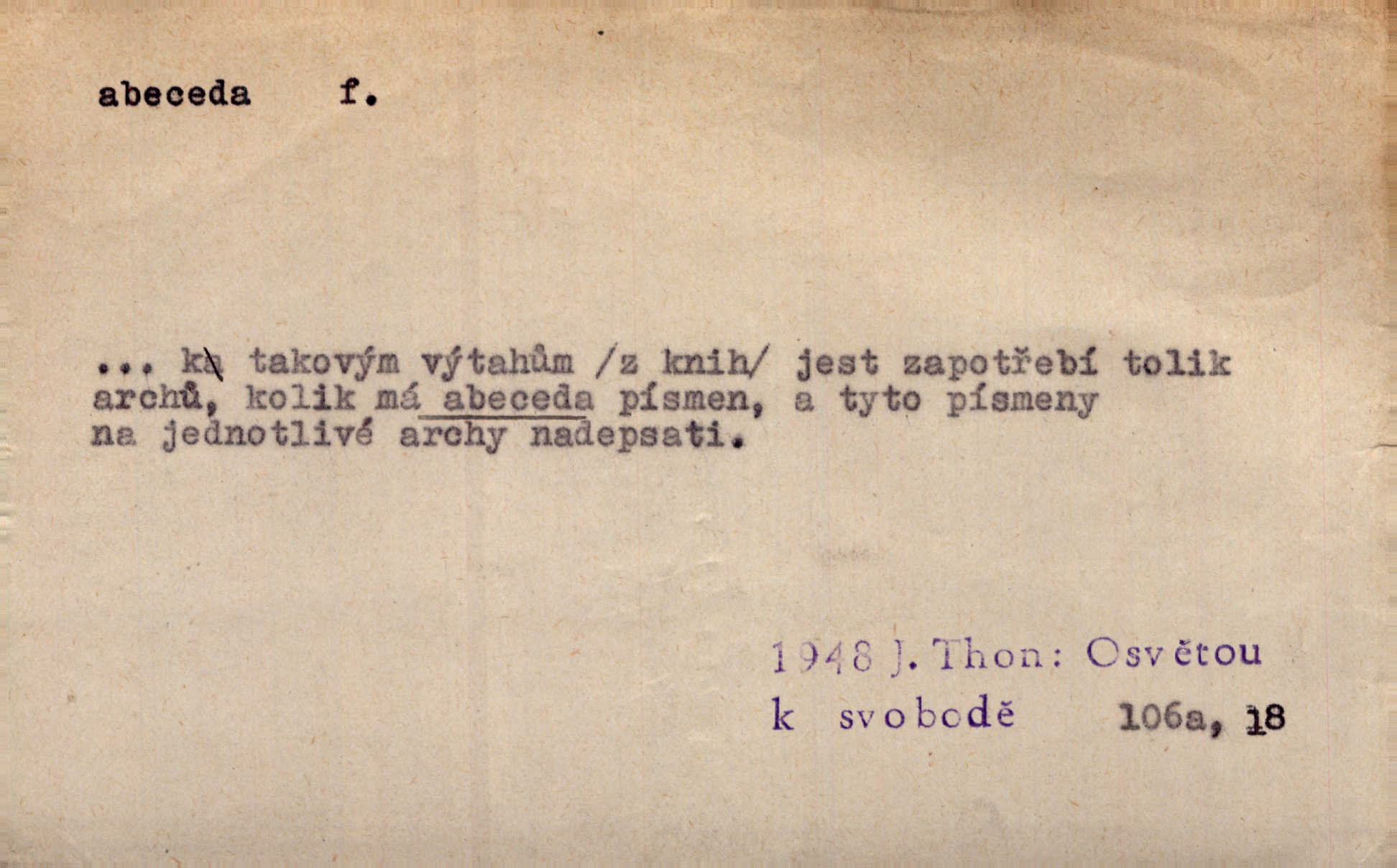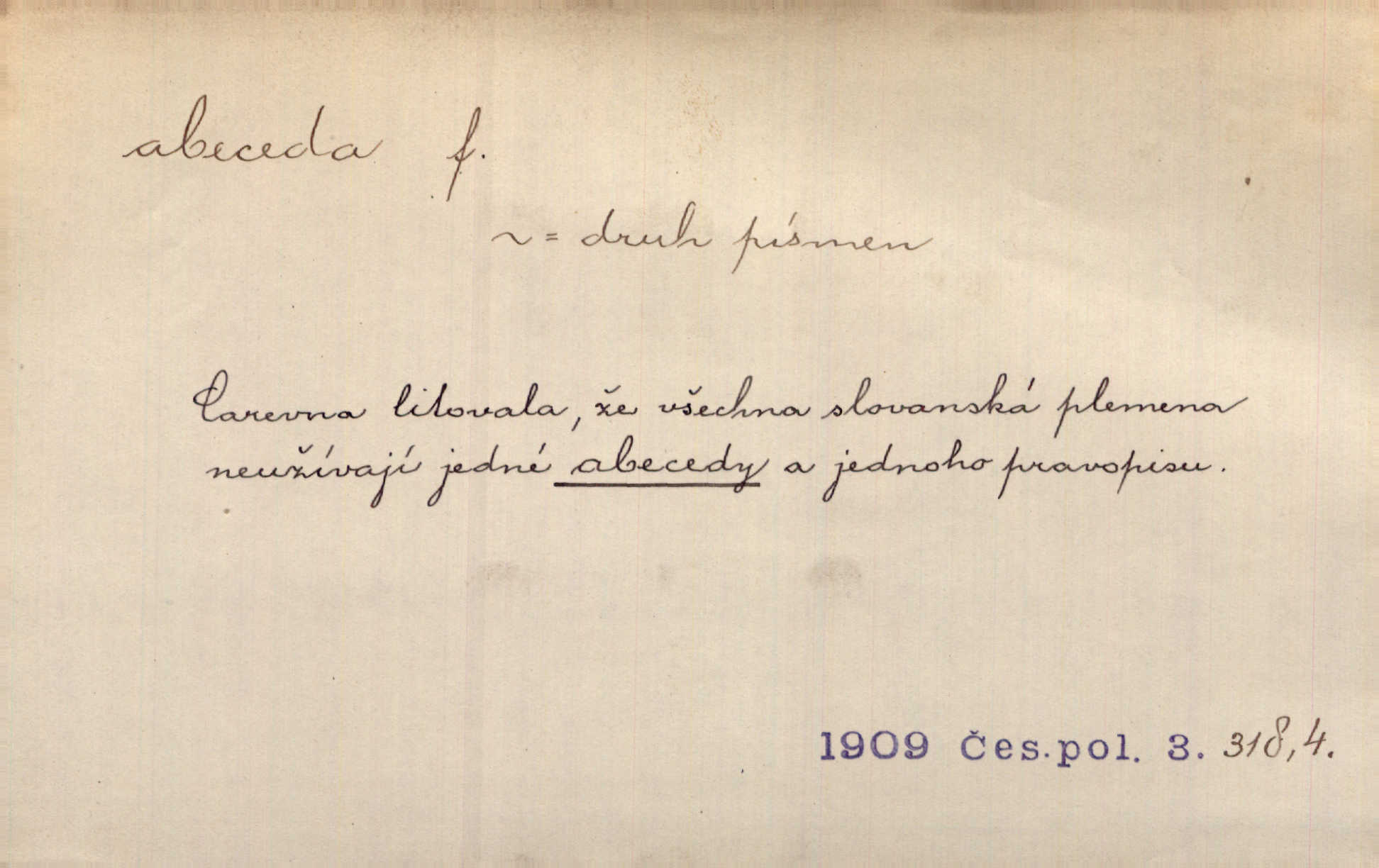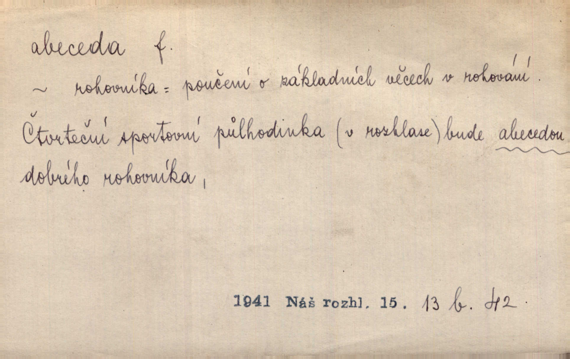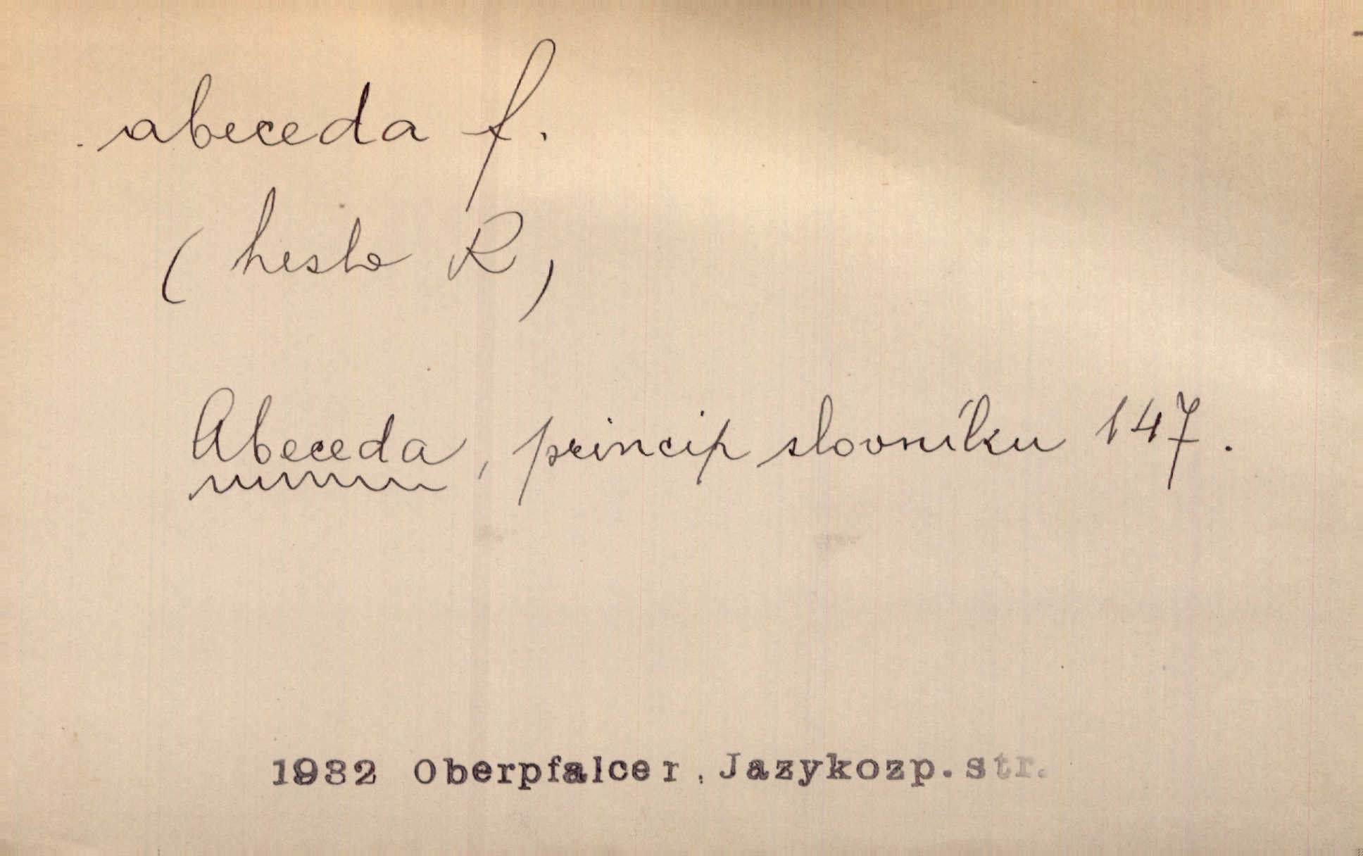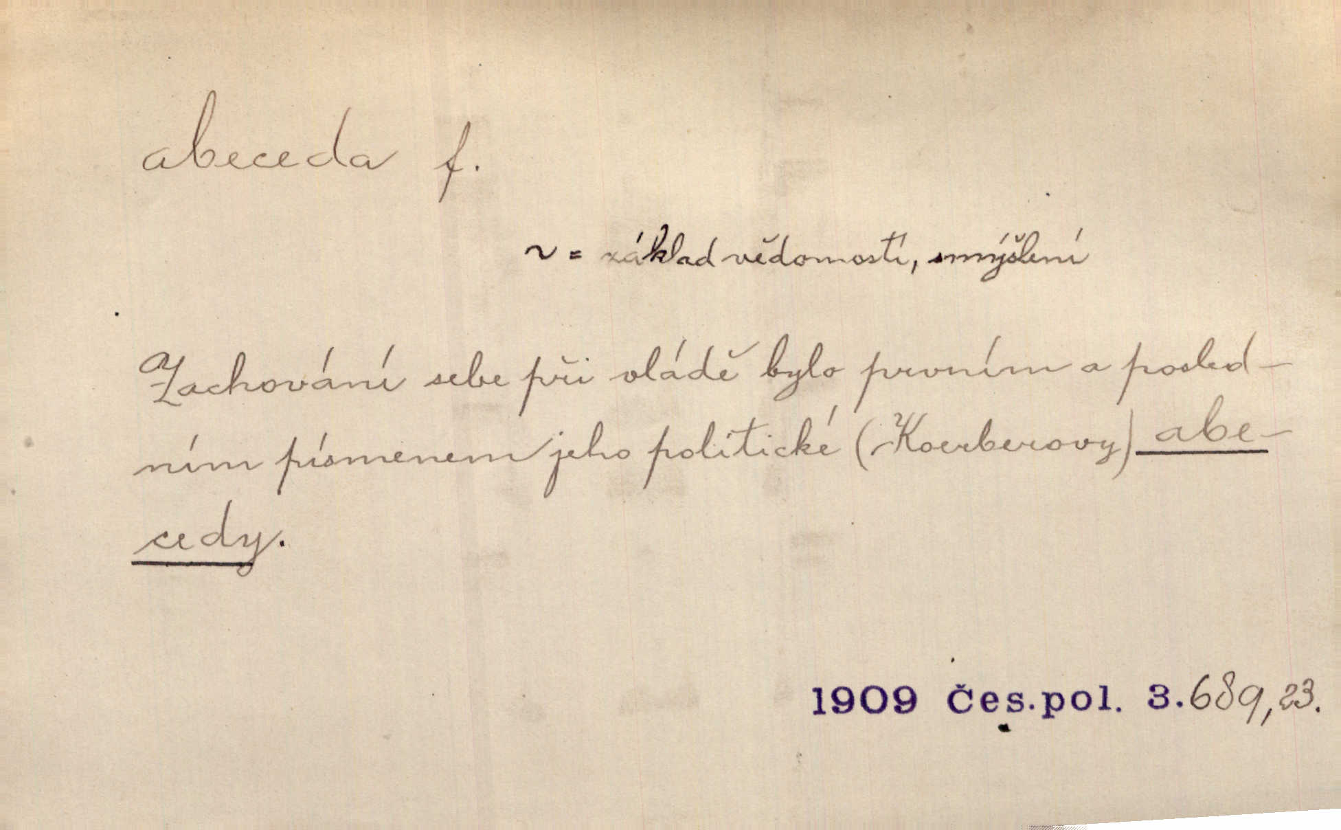 - abeceda, -y f. ustálený pořádek písmen psací soustavy. Abeceda česká, ruská (azbuka), řecká atd. D základní poznatky některého oboru. Správnost dikce je poslední v žurnalistické abecedě. Dyk. základ, počátek. Začínati od abecedy.