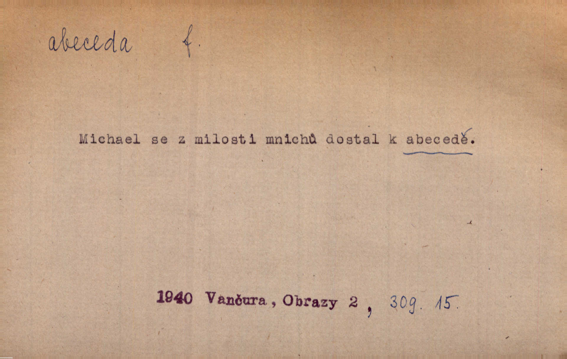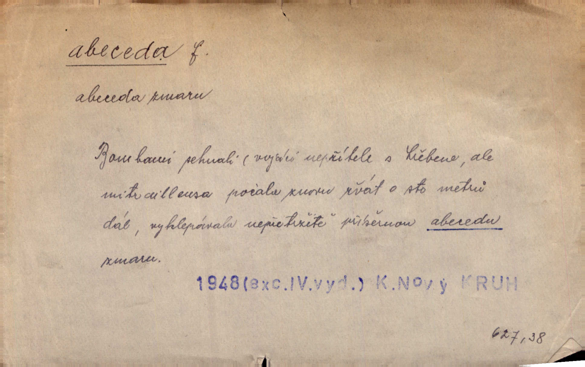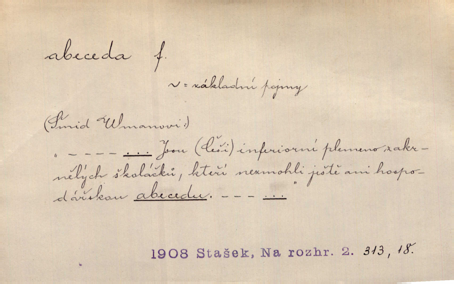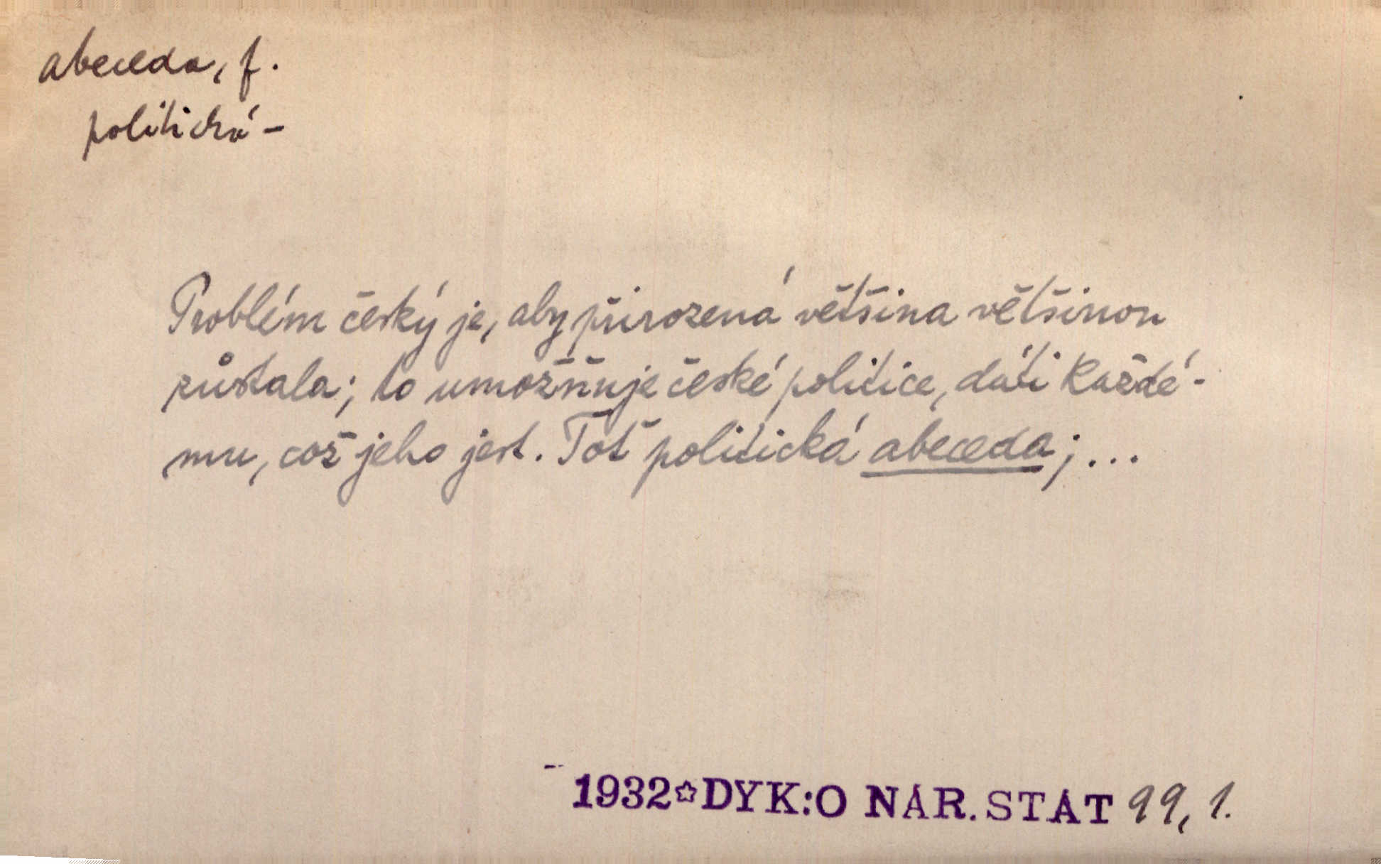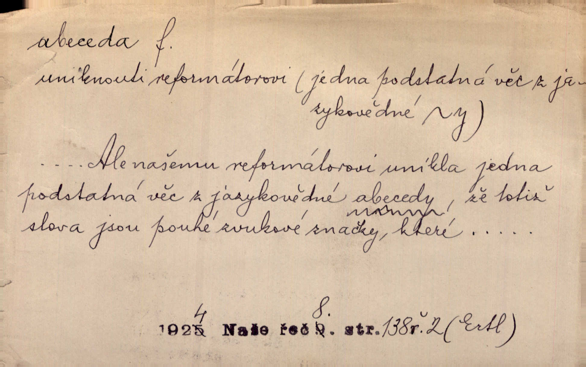 - abeceda, -y f. ustálený pořádek písmen psací soustavy. Abeceda česká, ruská (azbuka), řecká atd. D základní poznatky některého oboru. Správnost dikce je poslední v žurnalistické abecedě. Dyk. základ, počátek. Začínati od abecedy.