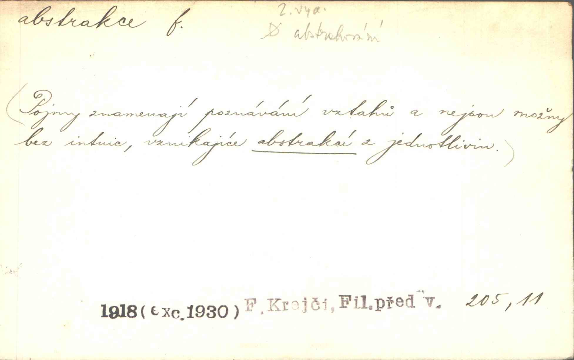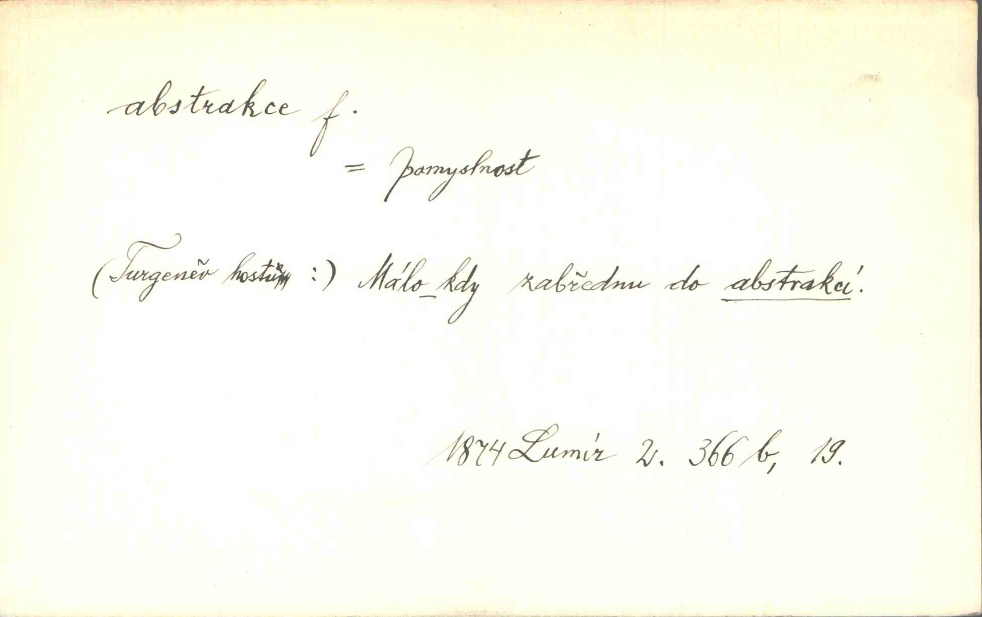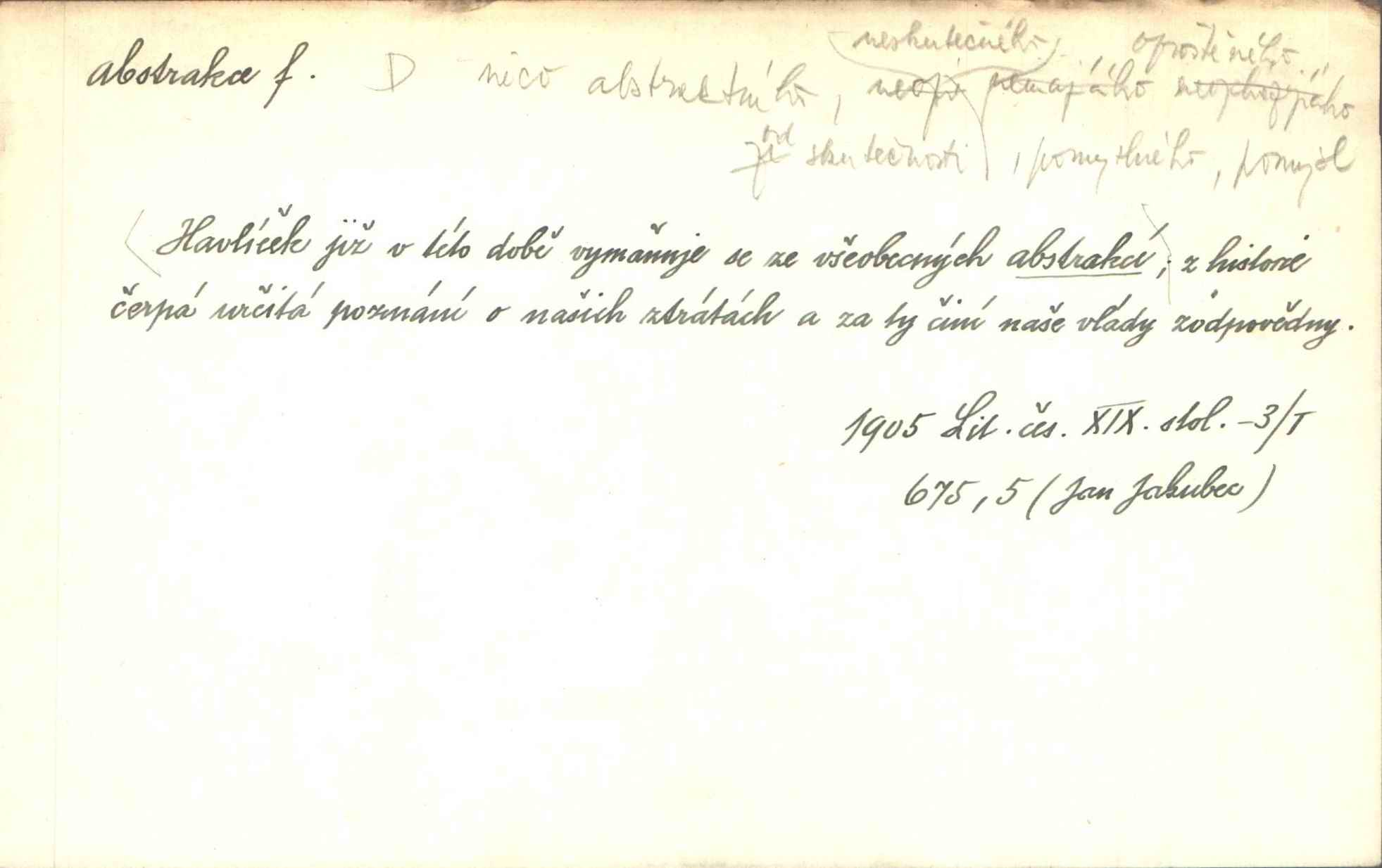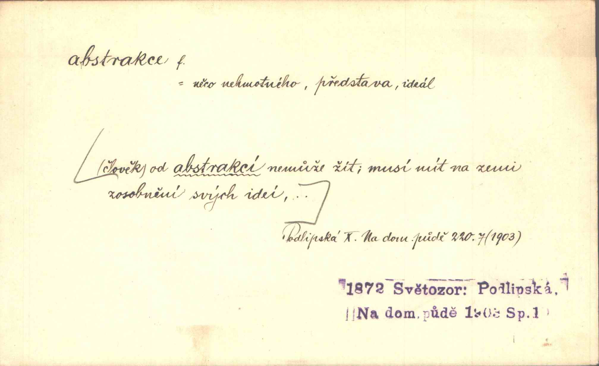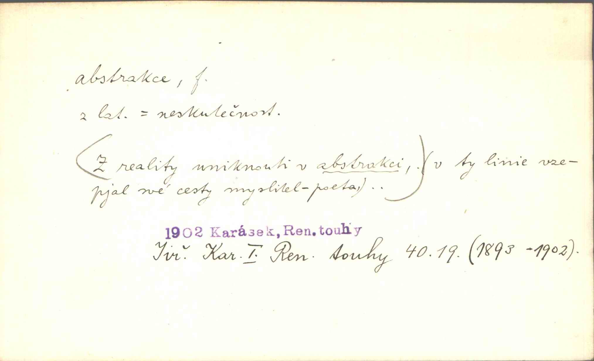 - abstrakce, -e f. filos. pomysl (op. konkretnost). Individuum vědě jest jen abstrakcí, pravou skutečninou jest člověčenstvo. Mas. Neodb. s vedlejším význ. nemožnosti, neskutečnosti. Otázka, zdali národnost má do sebe skutečnou realitu aneb je-li pouhým toliko pomyslem, jalovou abstrakcí. Pal. Úmyslně se vyhýbal rozumné konkretnosti a místo dával prázdné abstrakci. V. Mrš.