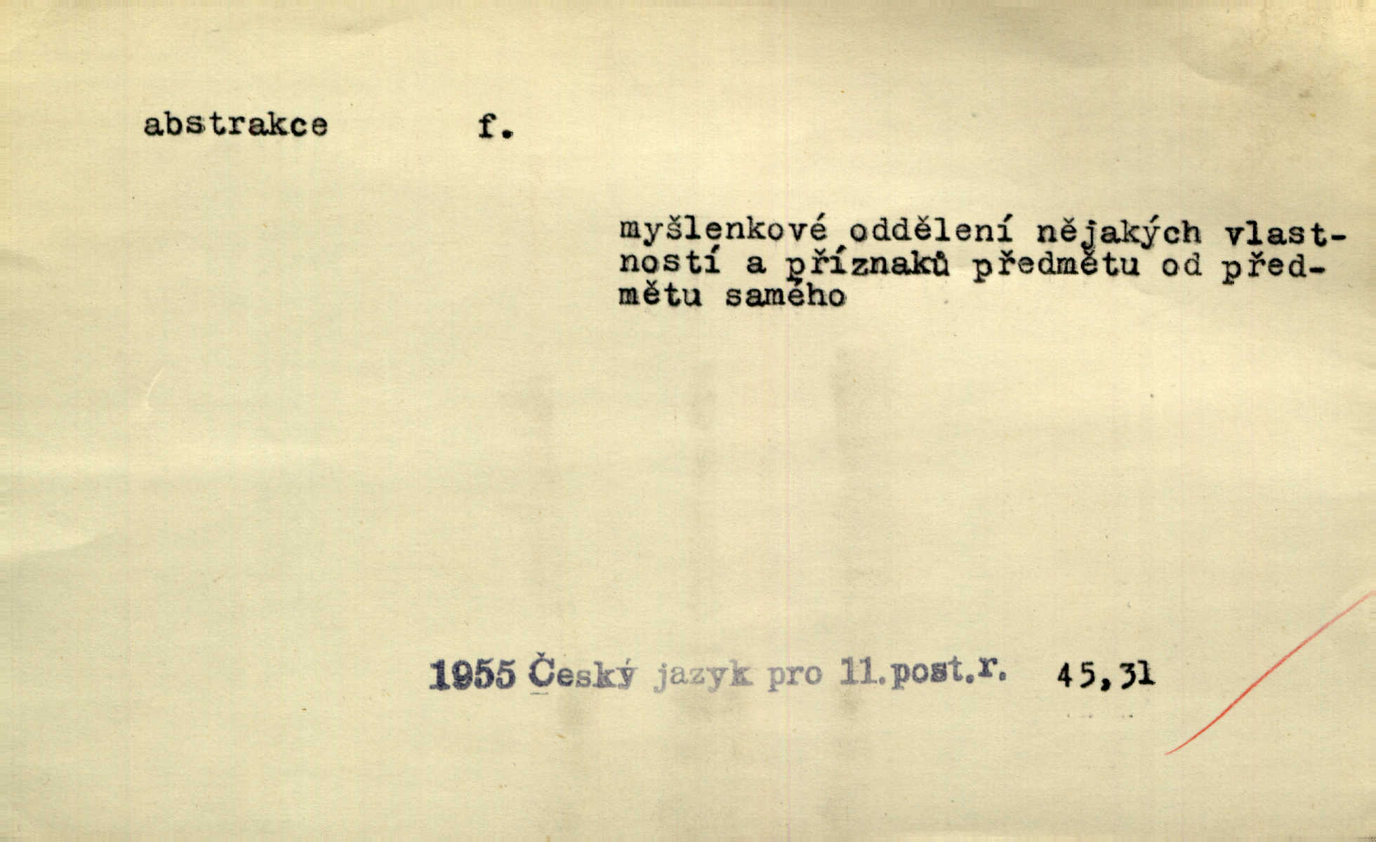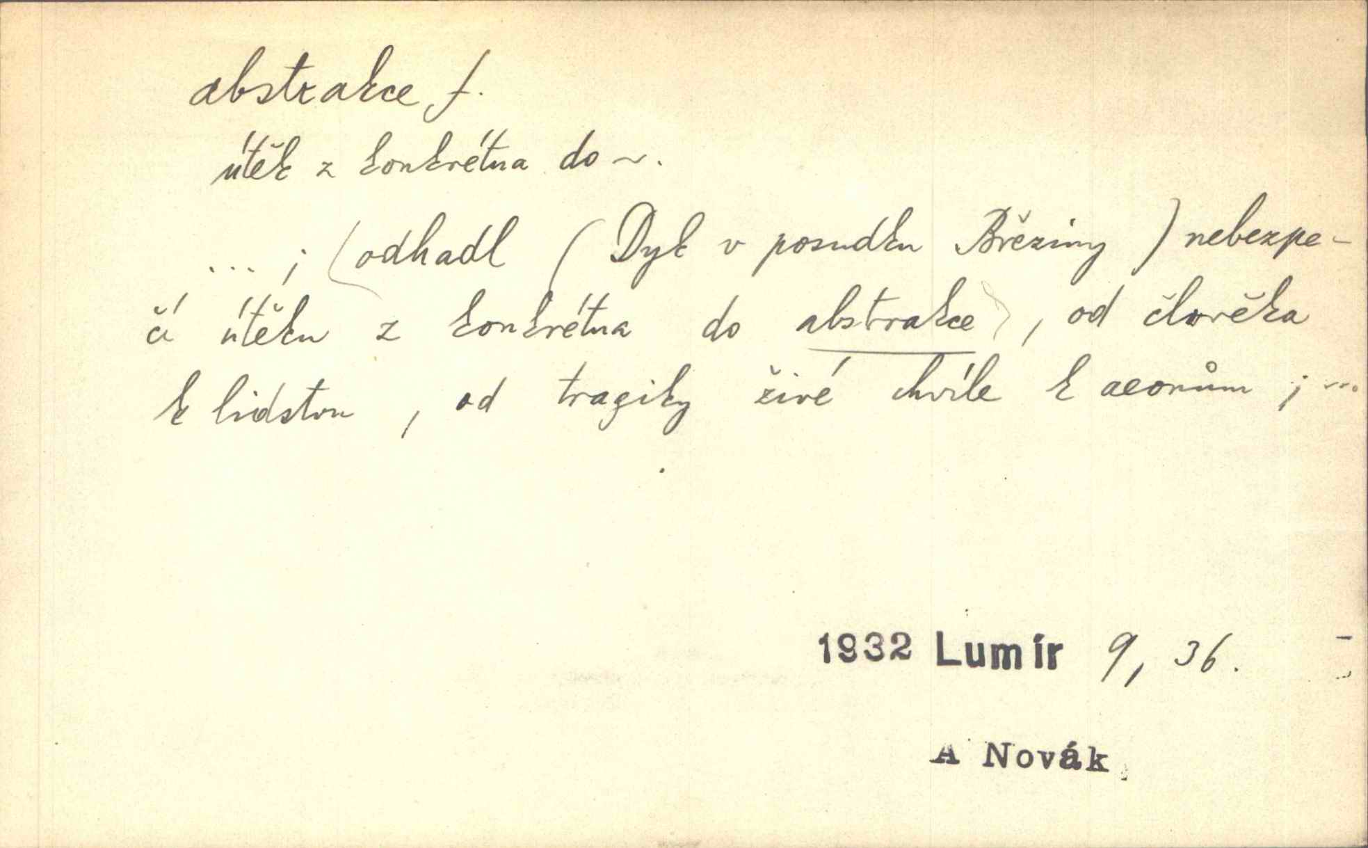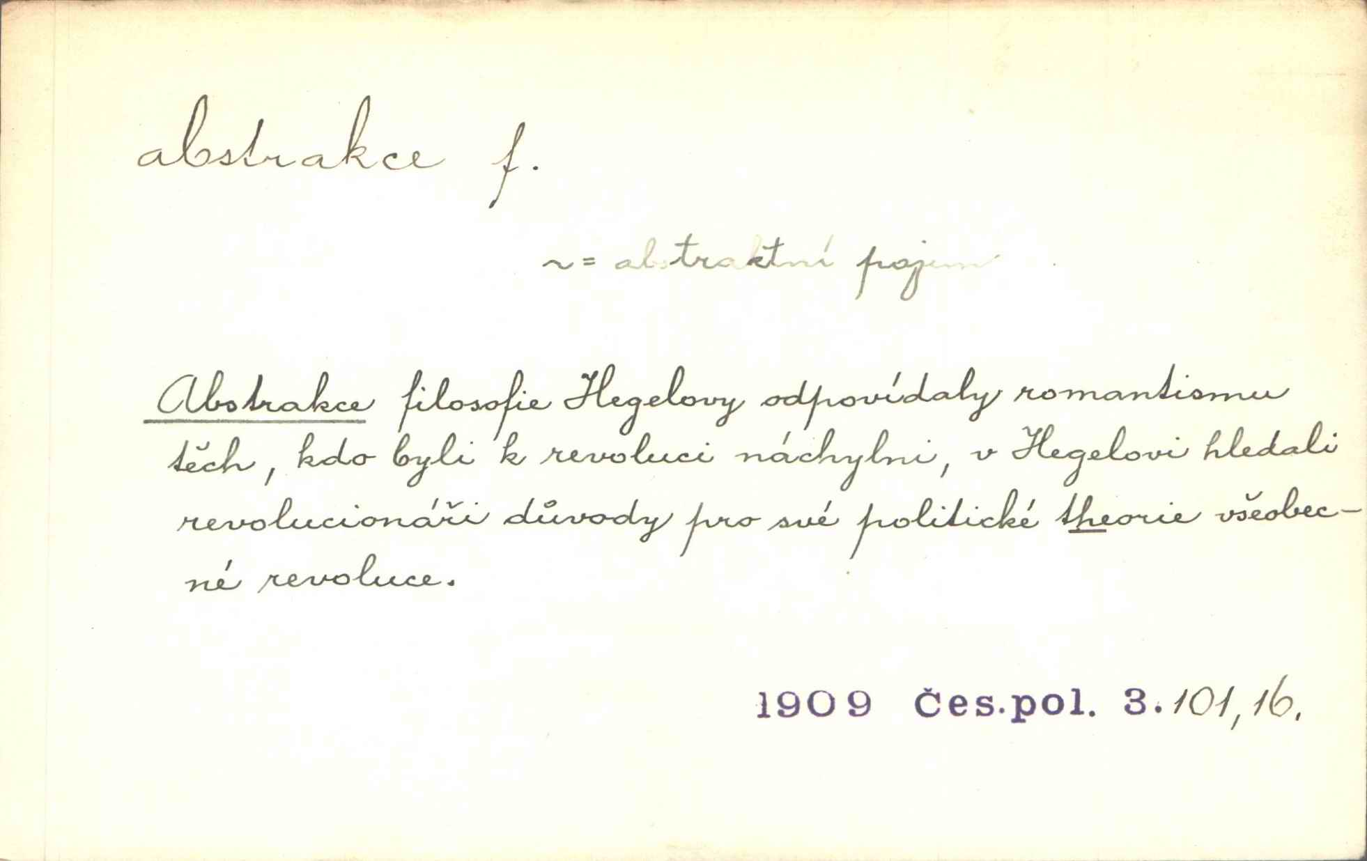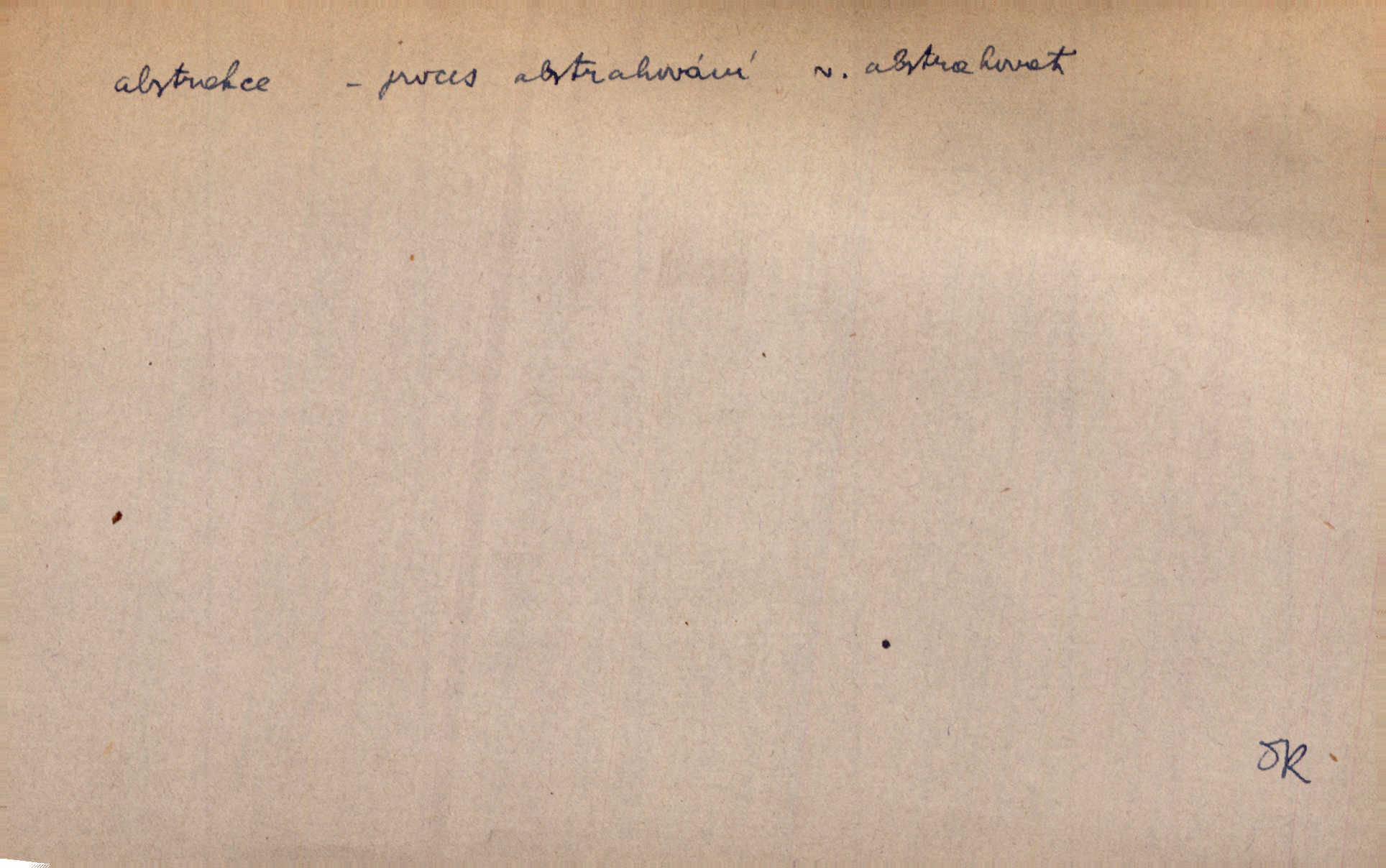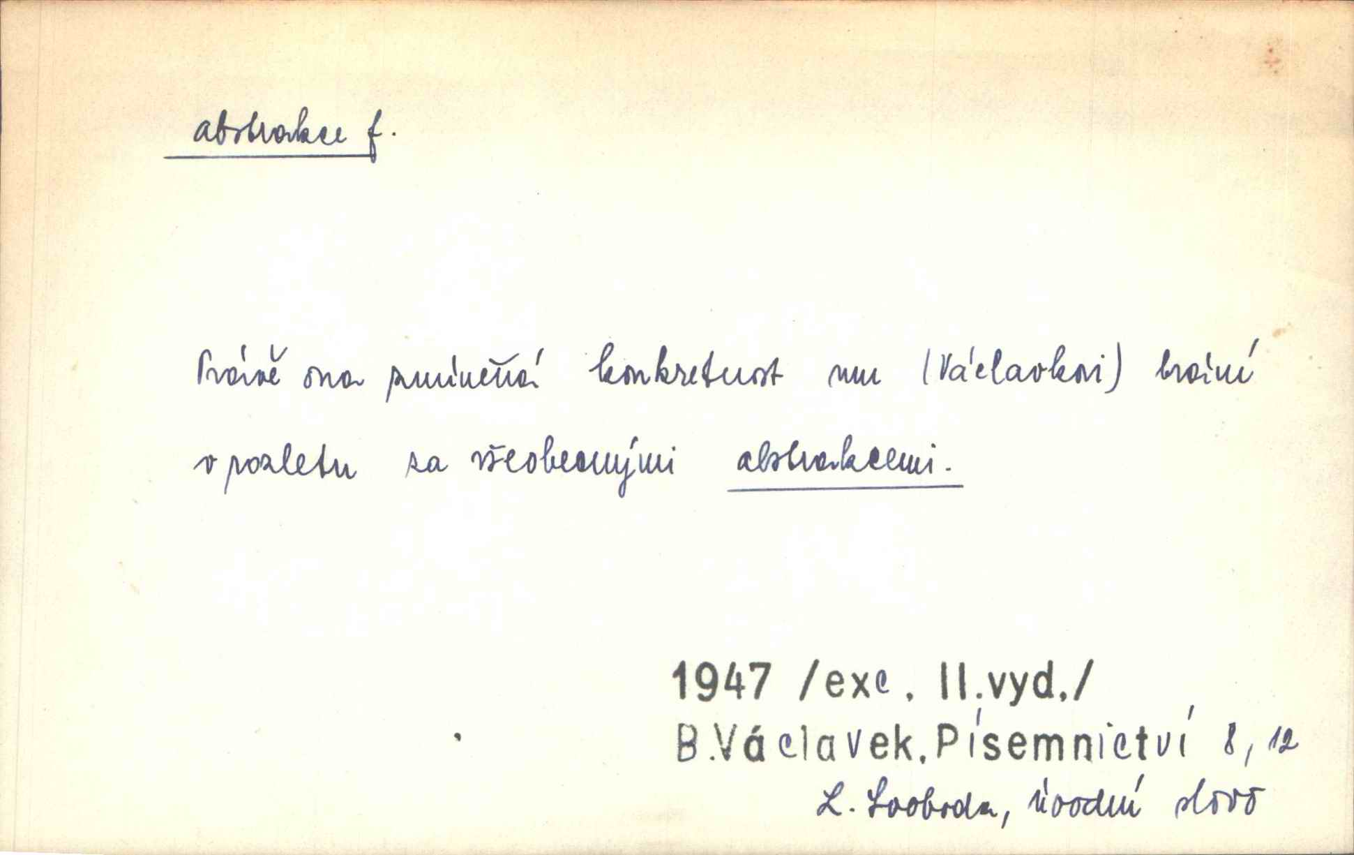 - abstrakce, -e f. filos. pomysl (op. konkretnost). Individuum vědě jest jen abstrakcí, pravou skutečninou jest člověčenstvo. Mas. Neodb. s vedlejším význ. nemožnosti, neskutečnosti. Otázka, zdali národnost má do sebe skutečnou realitu aneb je-li pouhým toliko pomyslem, jalovou abstrakcí. Pal. Úmyslně se vyhýbal rozumné konkretnosti a místo dával prázdné abstrakci. V. Mrš.