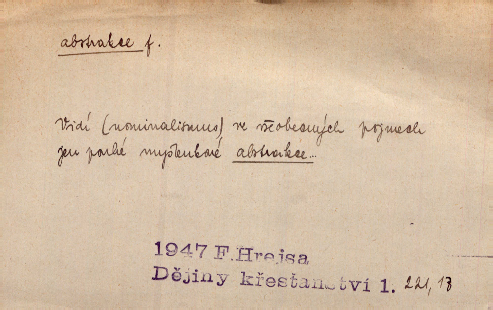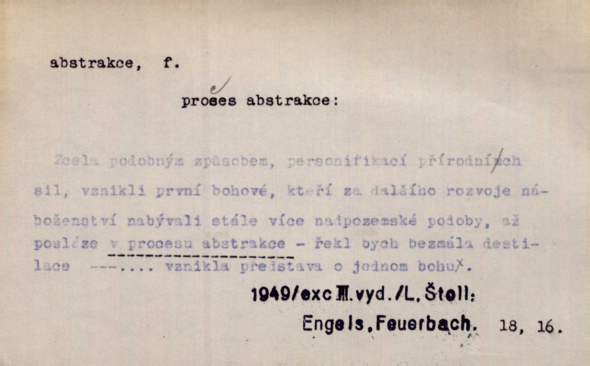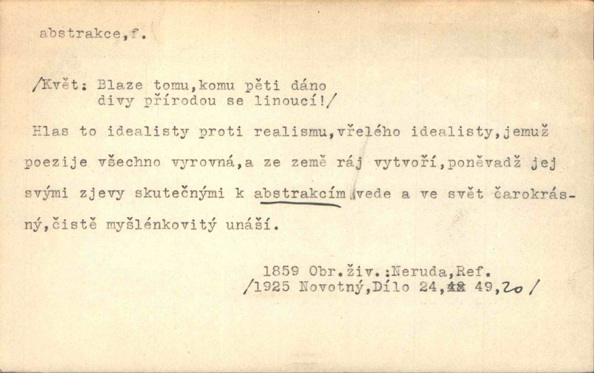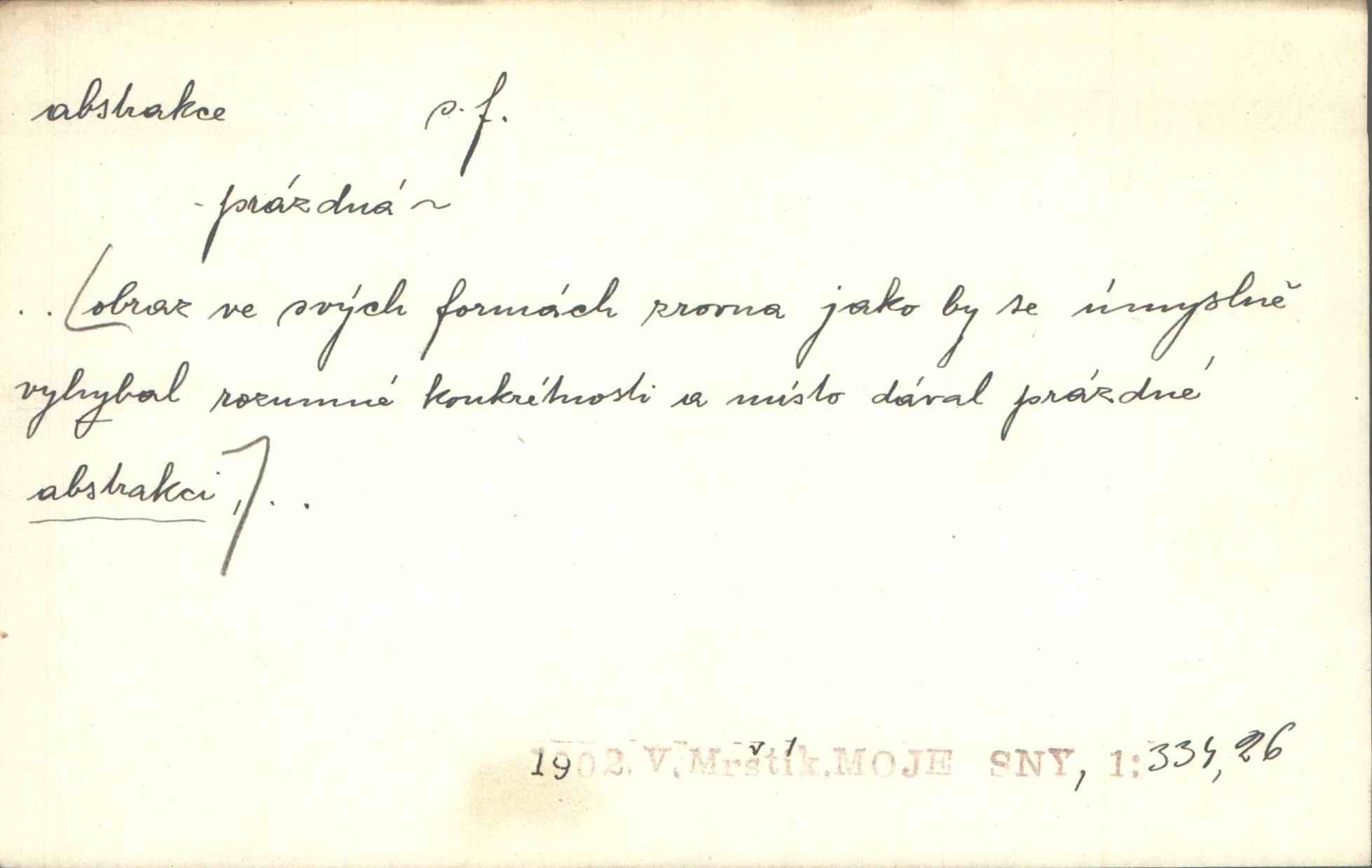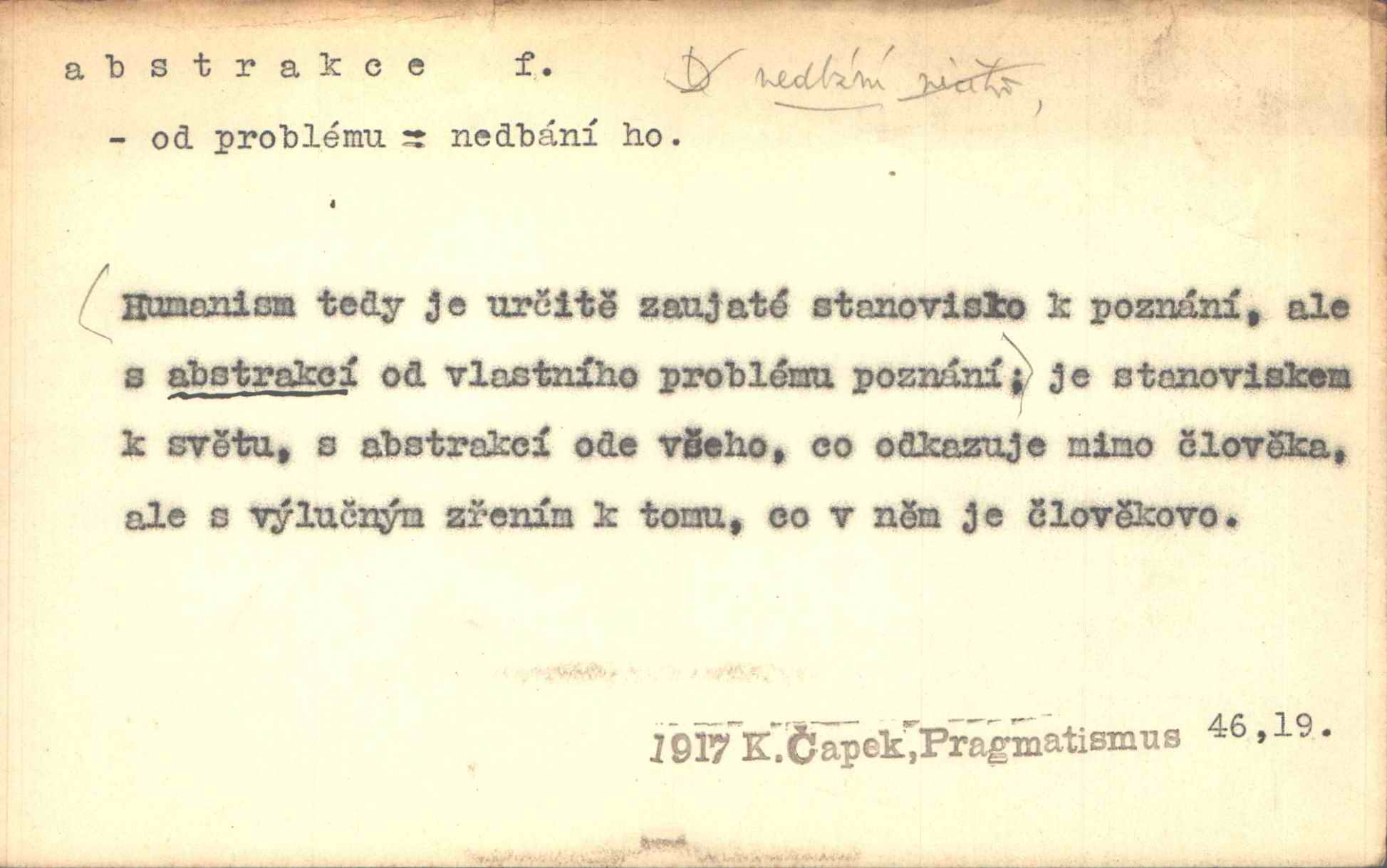 - abstrakce, -e f. filos. pomysl (op. konkretnost). Individuum vědě jest jen abstrakcí, pravou skutečninou jest člověčenstvo. Mas. Neodb. s vedlejším význ. nemožnosti, neskutečnosti. Otázka, zdali národnost má do sebe skutečnou realitu aneb je-li pouhým toliko pomyslem, jalovou abstrakcí. Pal. Úmyslně se vyhýbal rozumné konkretnosti a místo dával prázdné abstrakci. V. Mrš.