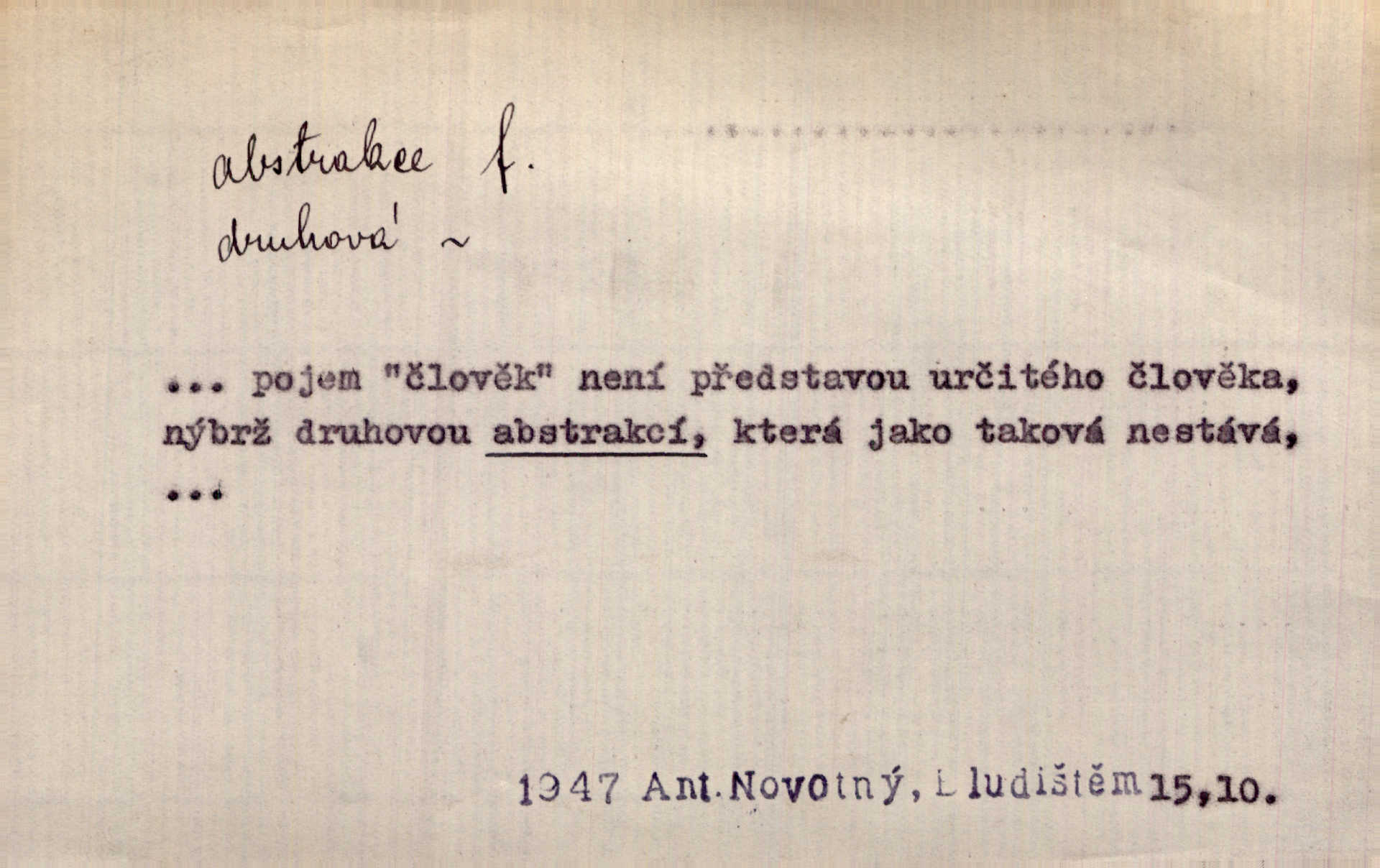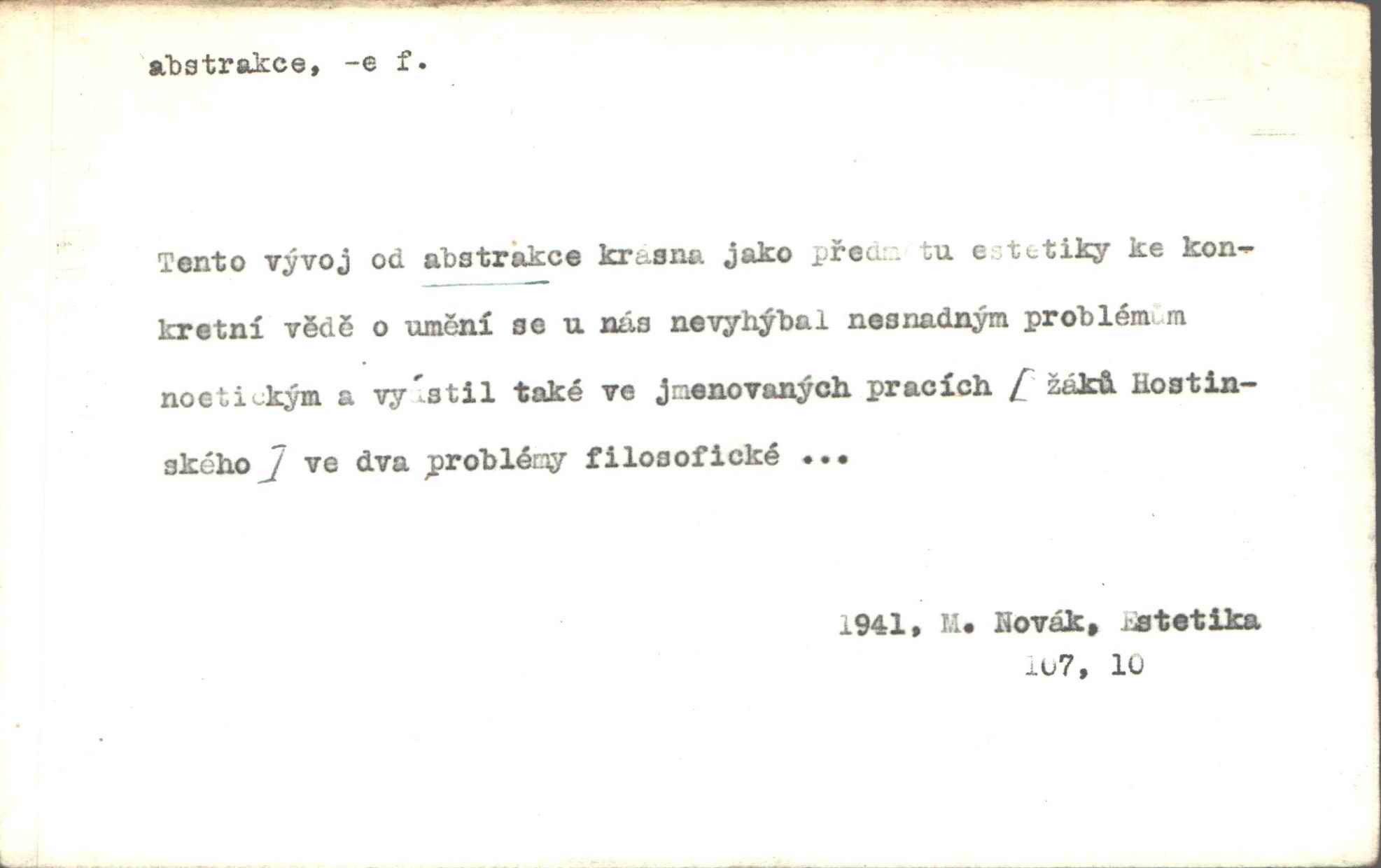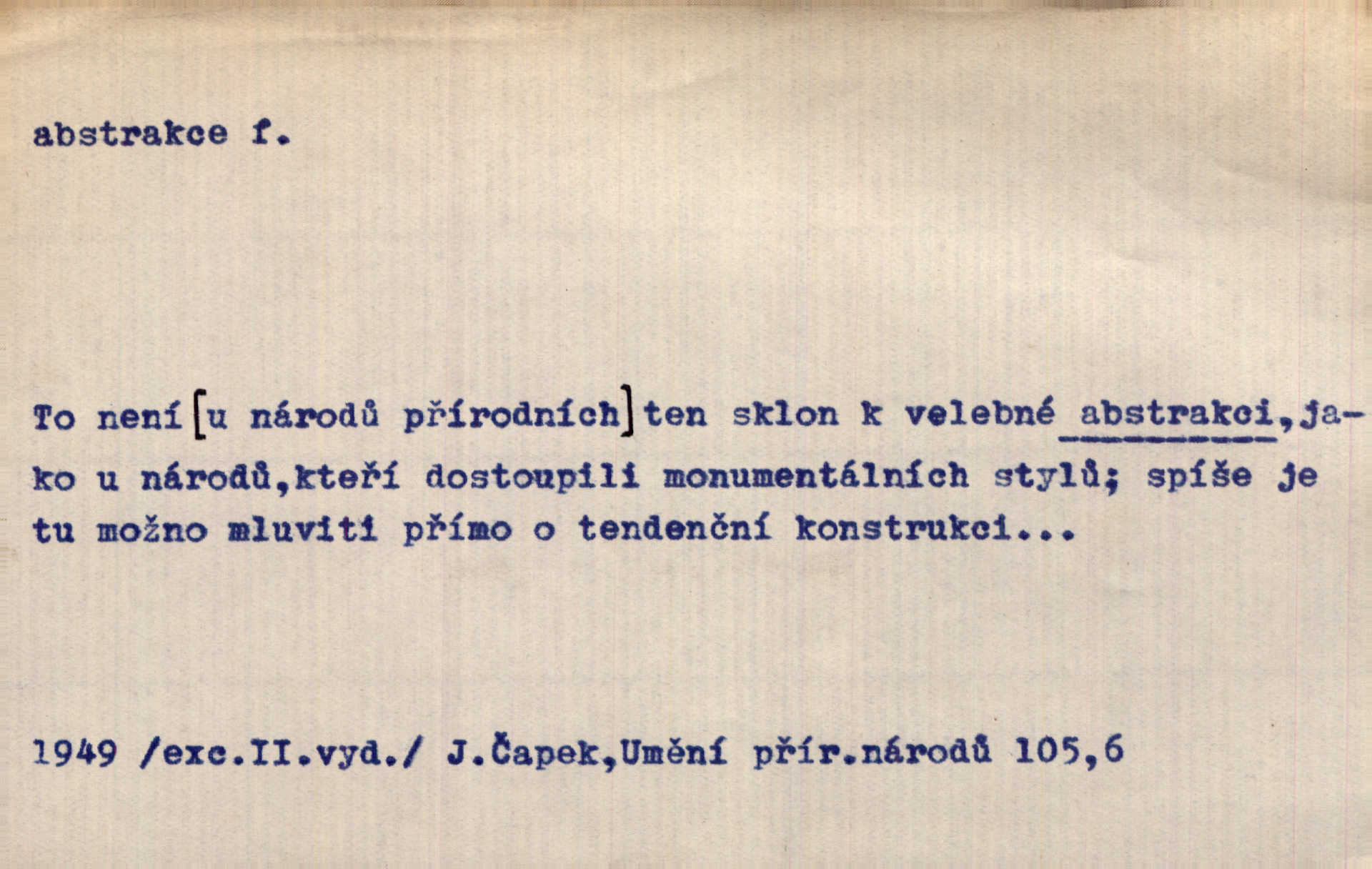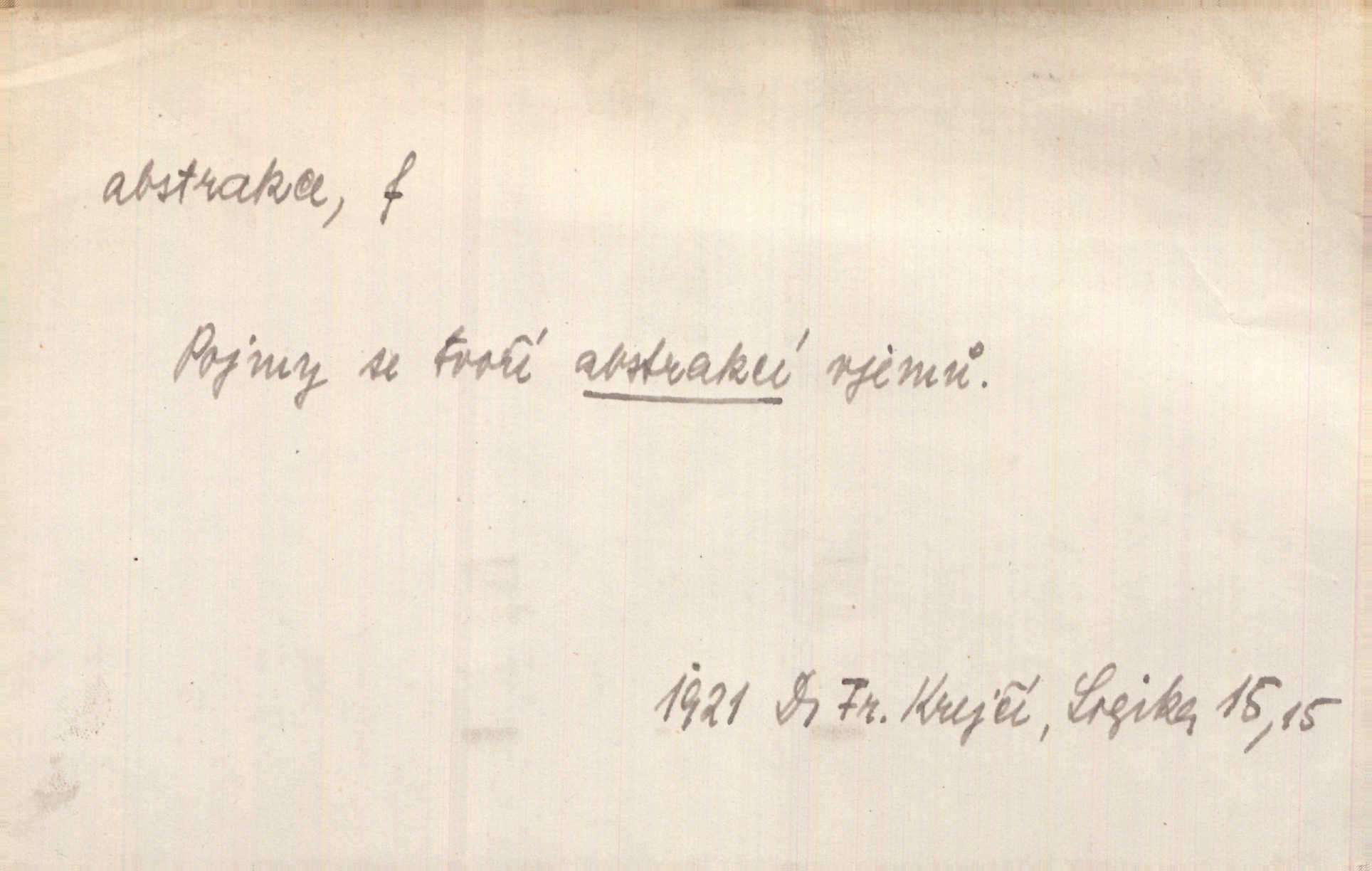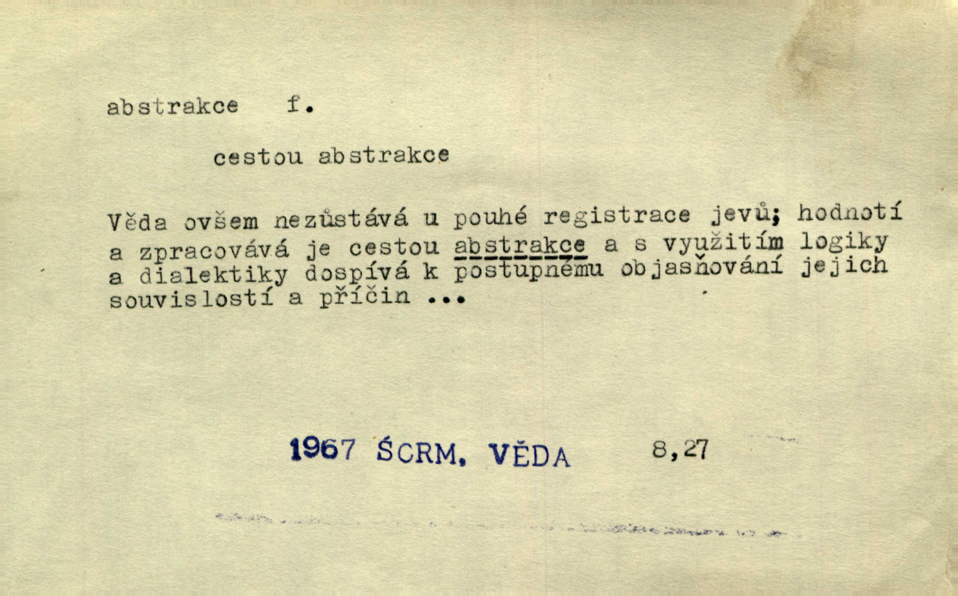 - abstrakce, -e f. filos. pomysl (op. konkretnost). Individuum vědě jest jen abstrakcí, pravou skutečninou jest člověčenstvo. Mas. Neodb. s vedlejším význ. nemožnosti, neskutečnosti. Otázka, zdali národnost má do sebe skutečnou realitu aneb je-li pouhým toliko pomyslem, jalovou abstrakcí. Pal. Úmyslně se vyhýbal rozumné konkretnosti a místo dával prázdné abstrakci. V. Mrš.