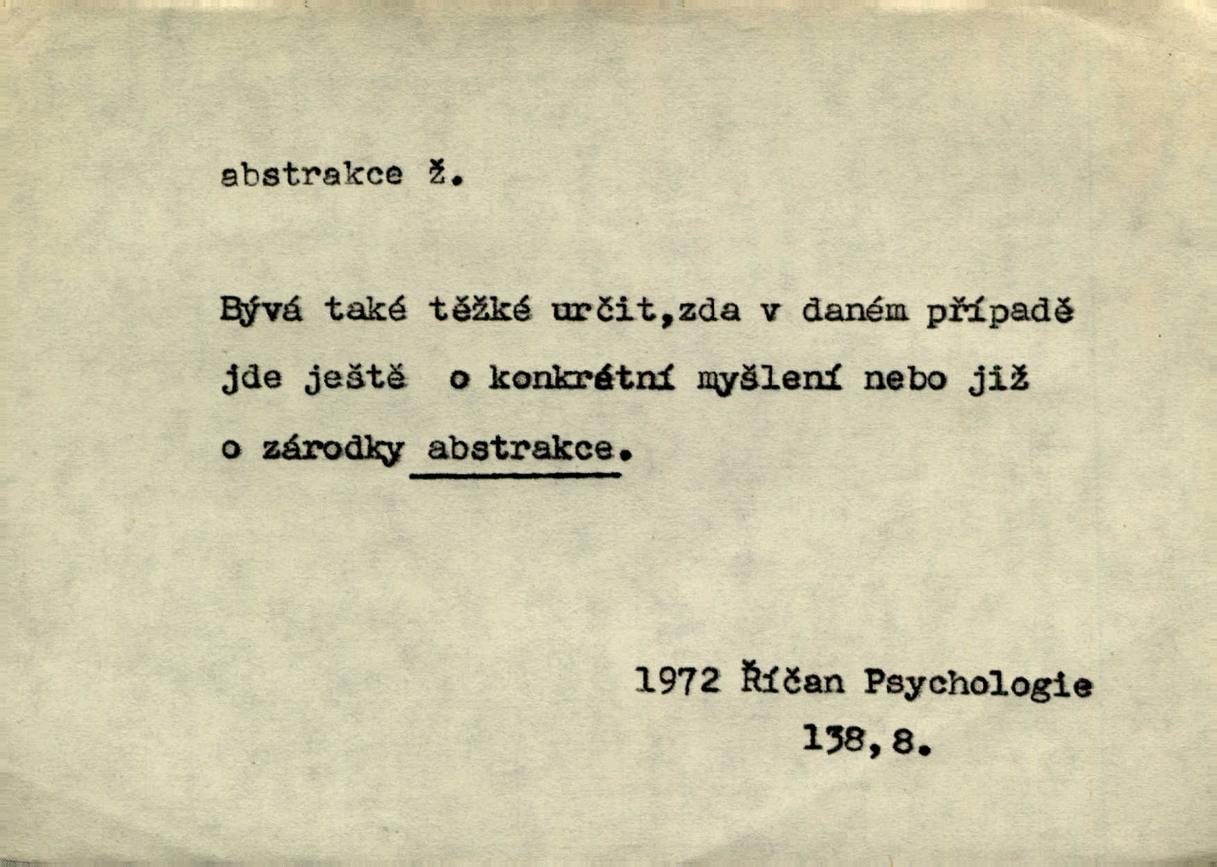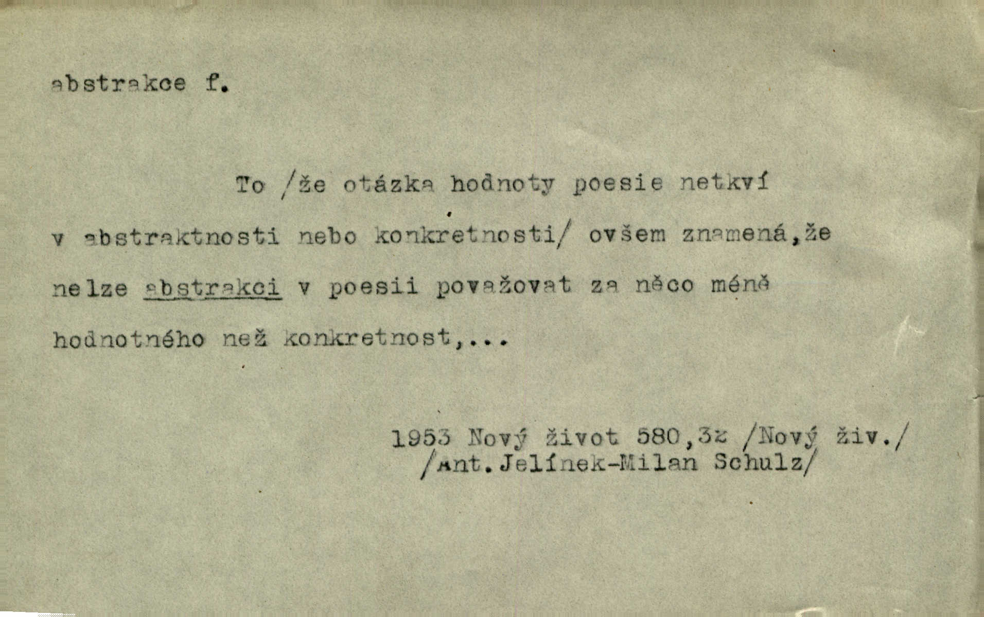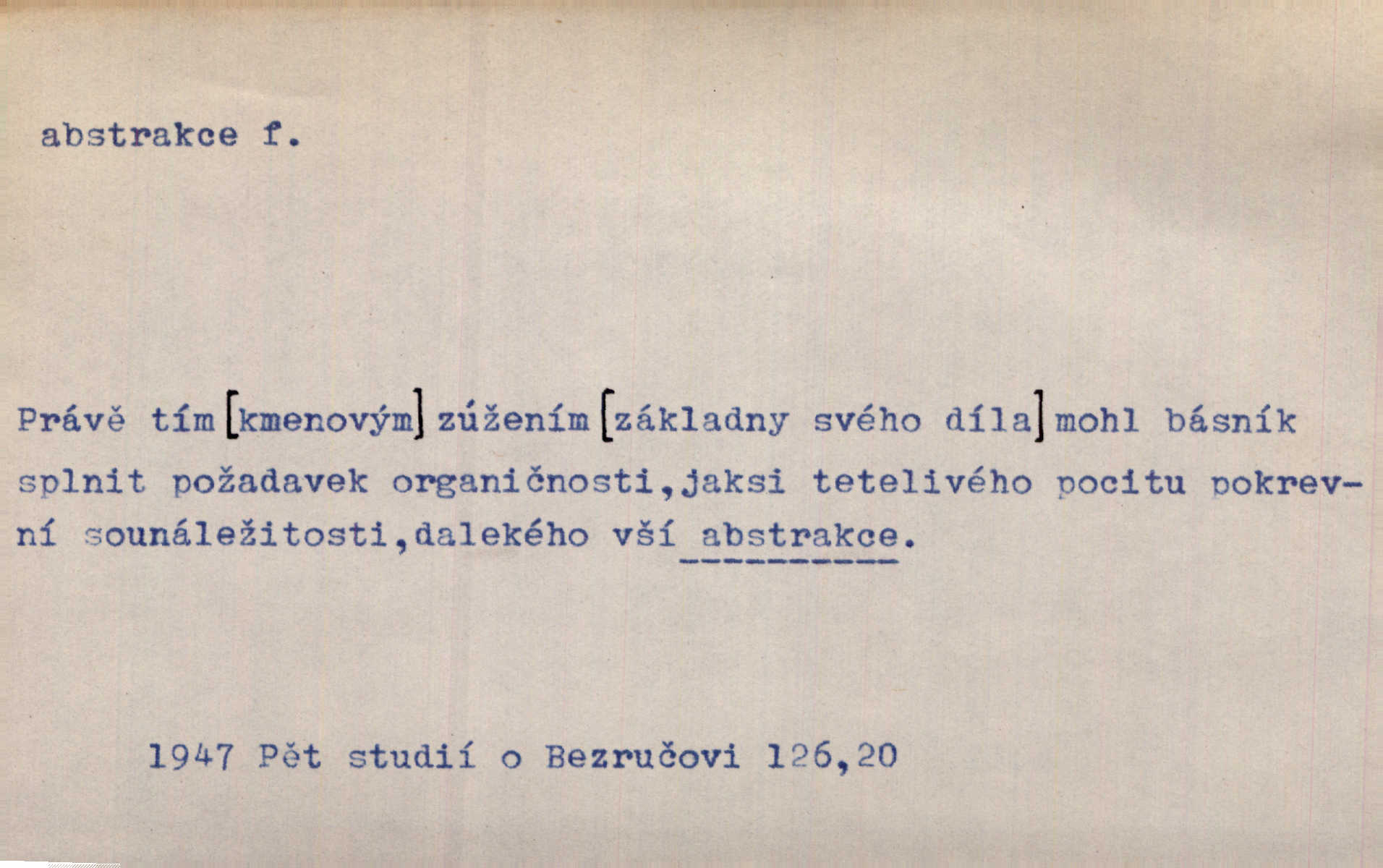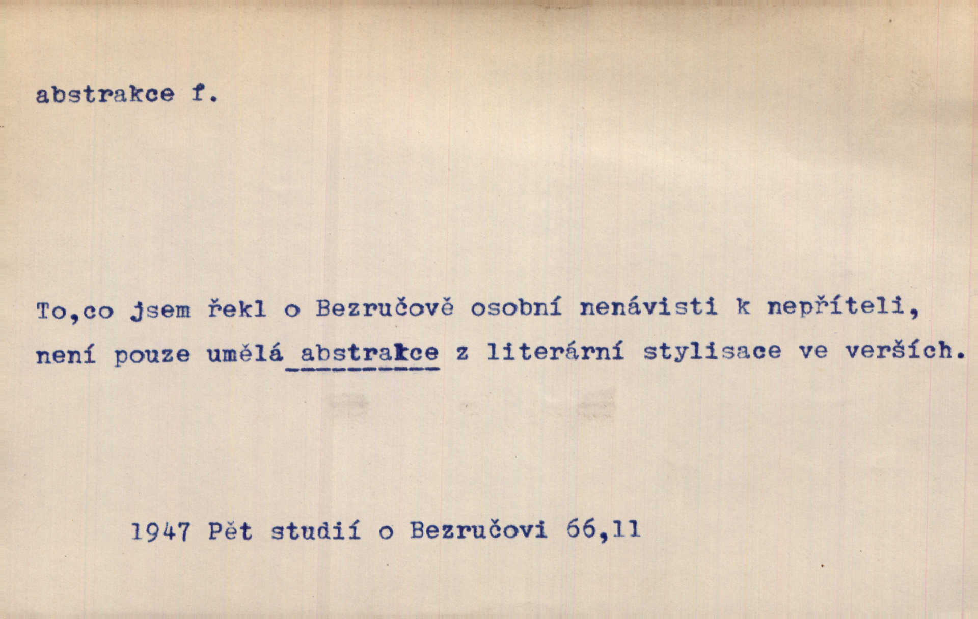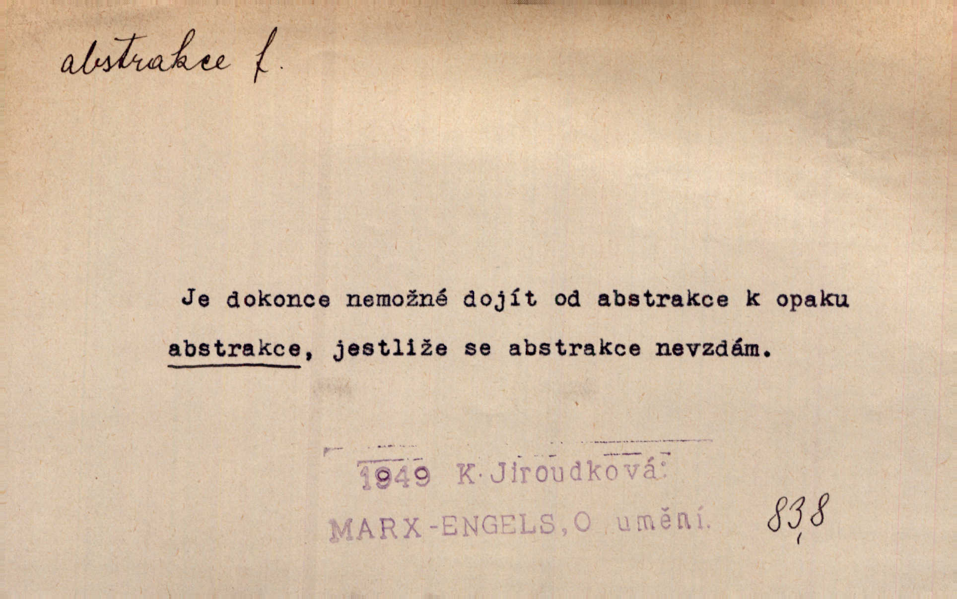 - abstrakce, -e f. filos. pomysl (op. konkretnost). Individuum vědě jest jen abstrakcí, pravou skutečninou jest člověčenstvo. Mas. Neodb. s vedlejším význ. nemožnosti, neskutečnosti. Otázka, zdali národnost má do sebe skutečnou realitu aneb je-li pouhým toliko pomyslem, jalovou abstrakcí. Pal. Úmyslně se vyhýbal rozumné konkretnosti a místo dával prázdné abstrakci. V. Mrš.