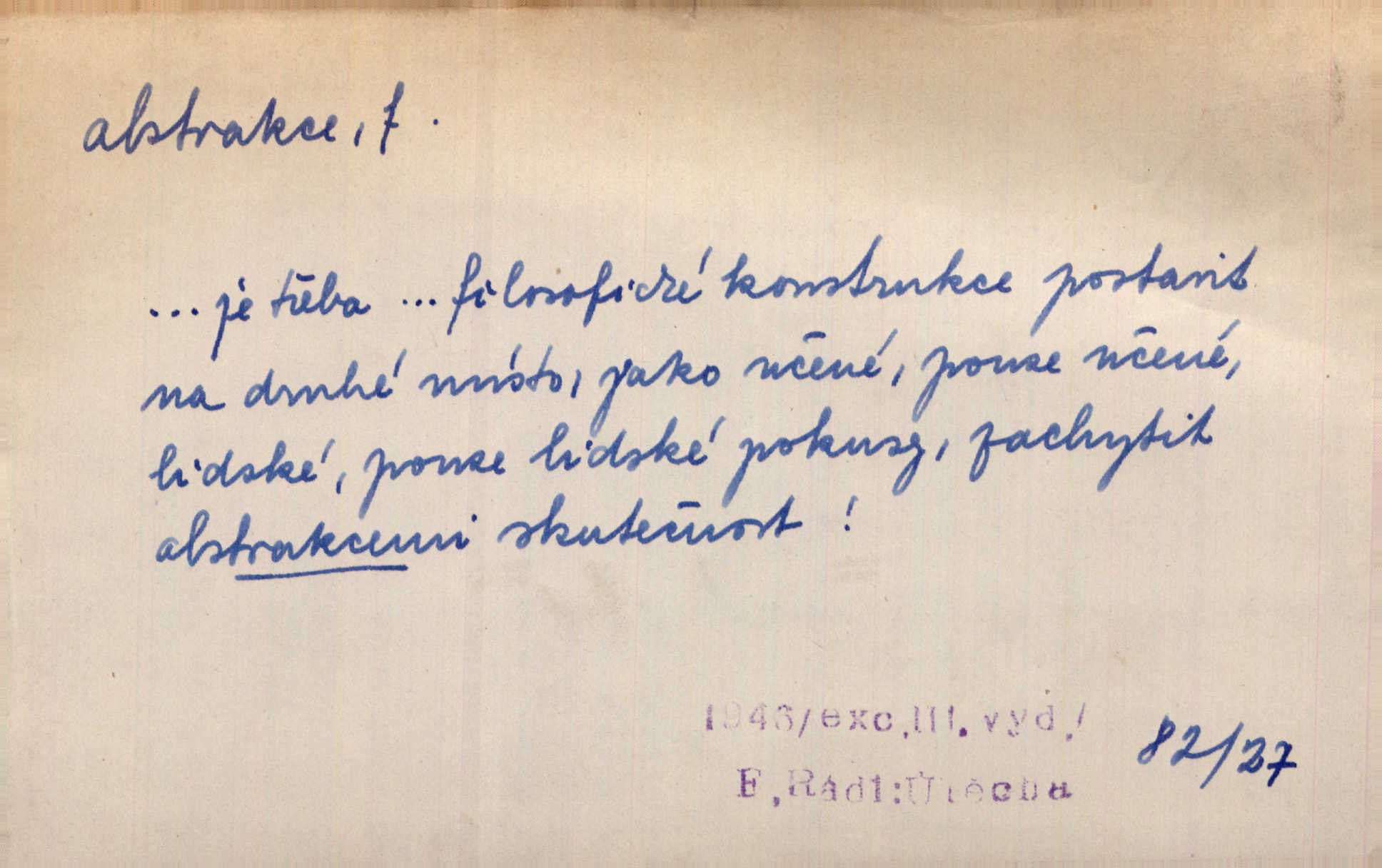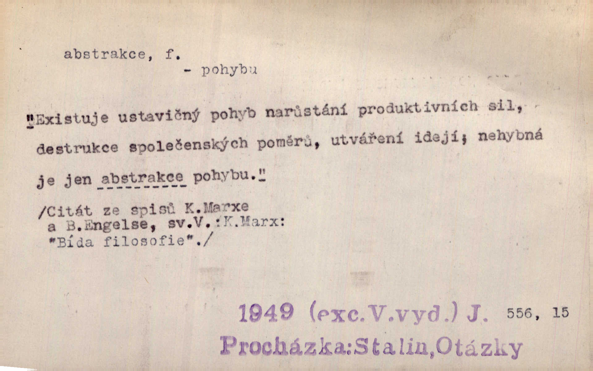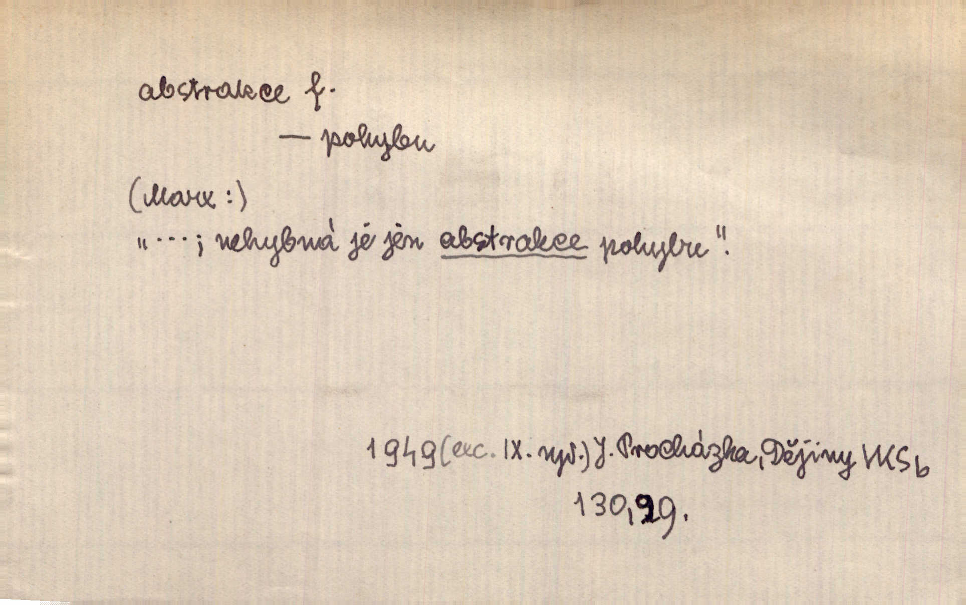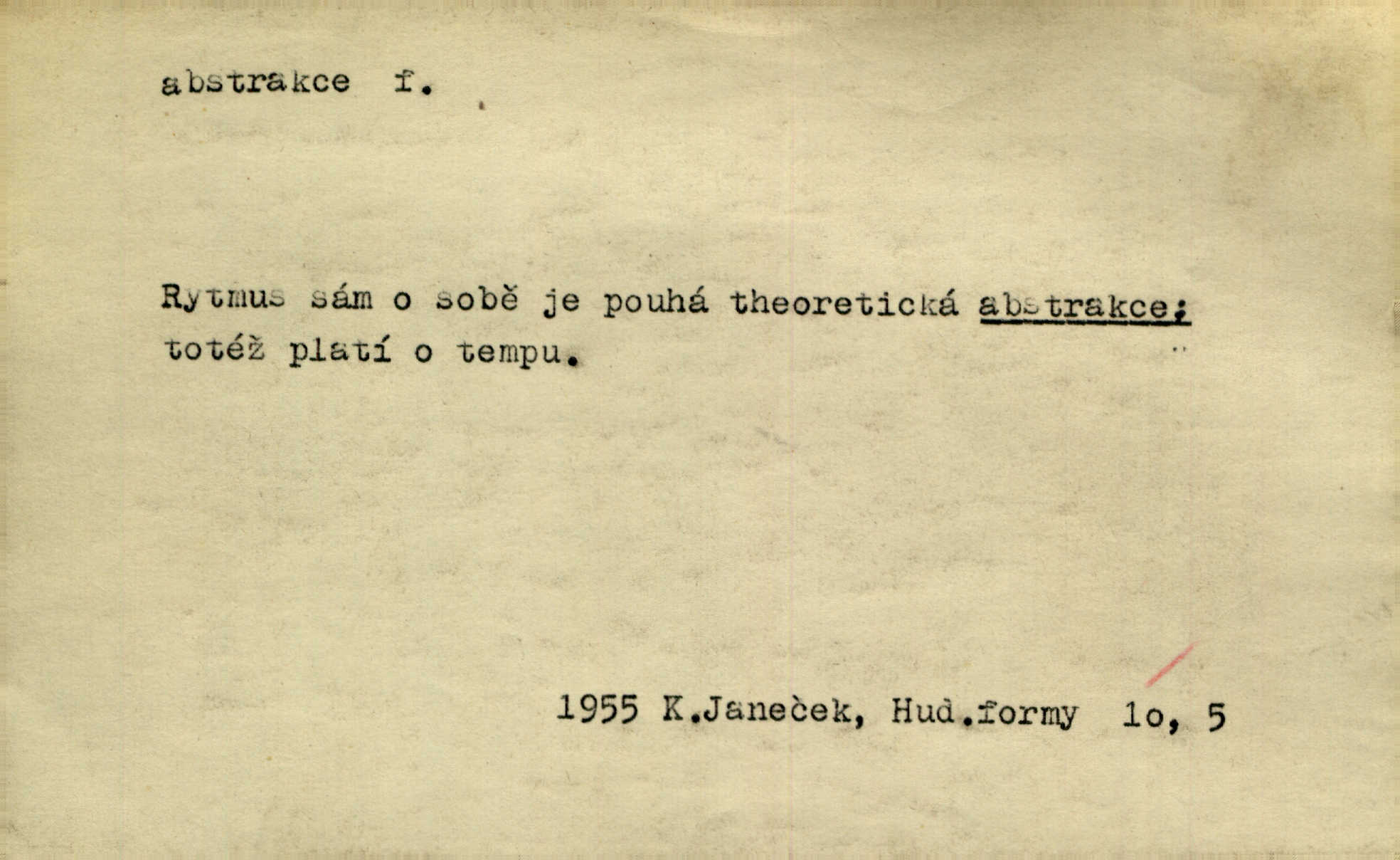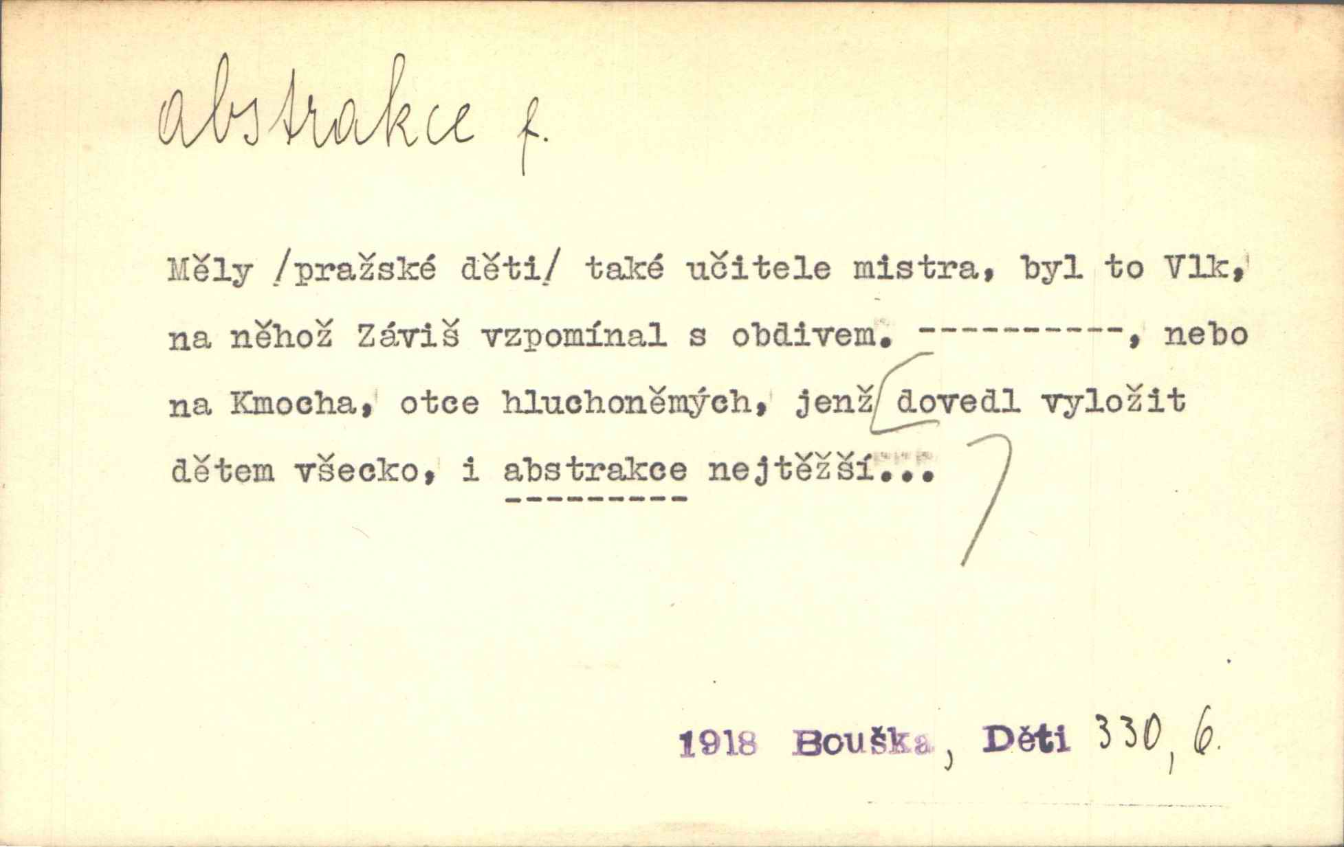 - abstrakce, -e f. filos. pomysl (op. konkretnost). Individuum vědě jest jen abstrakcí, pravou skutečninou jest člověčenstvo. Mas. Neodb. s vedlejším význ. nemožnosti, neskutečnosti. Otázka, zdali národnost má do sebe skutečnou realitu aneb je-li pouhým toliko pomyslem, jalovou abstrakcí. Pal. Úmyslně se vyhýbal rozumné konkretnosti a místo dával prázdné abstrakci. V. Mrš.