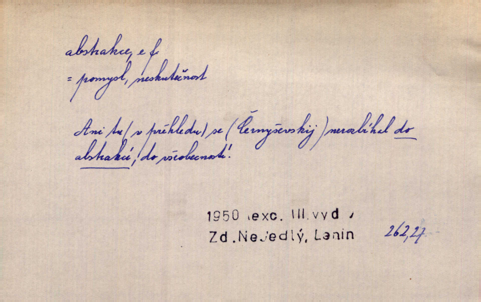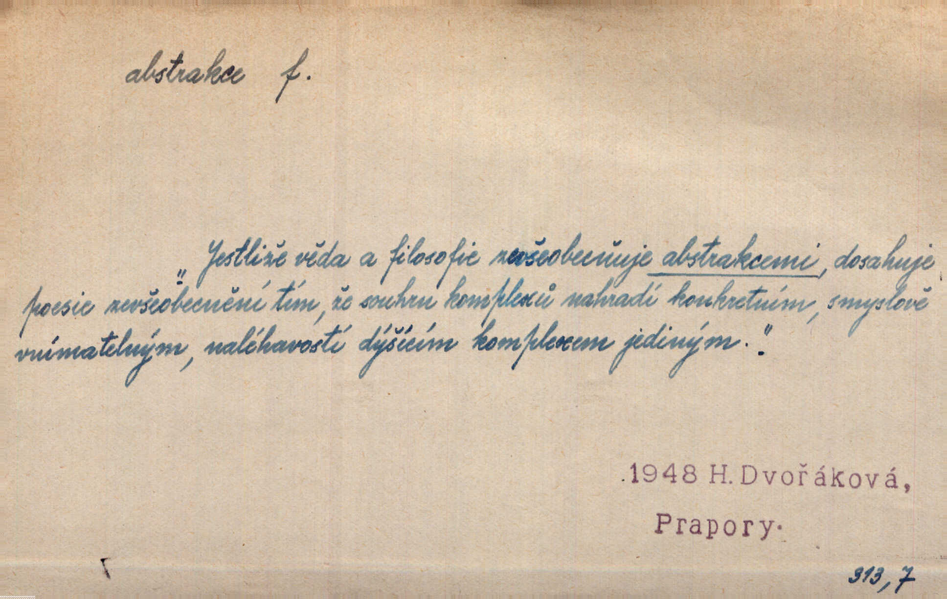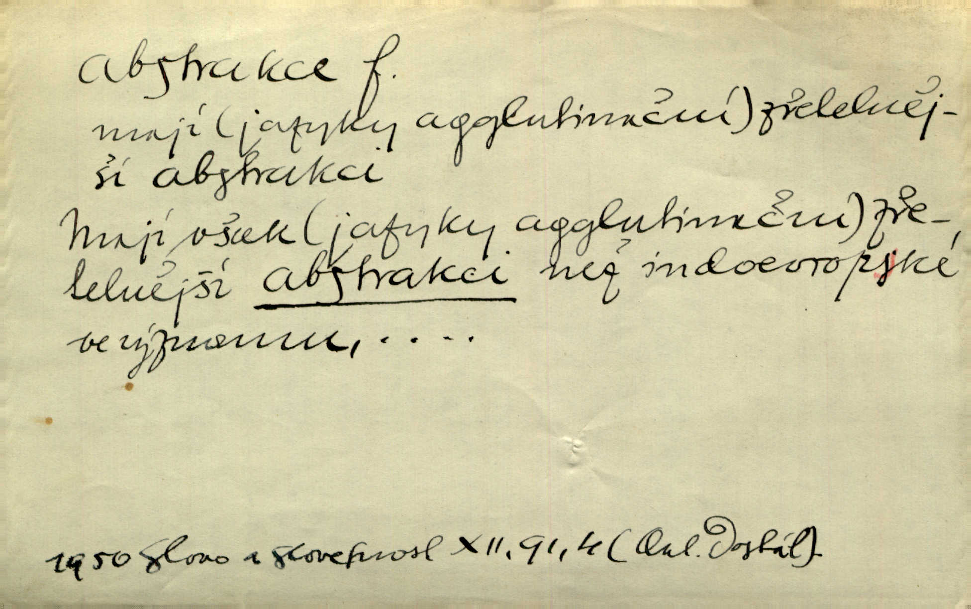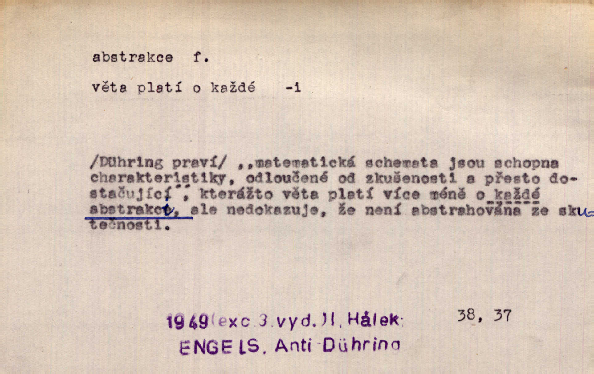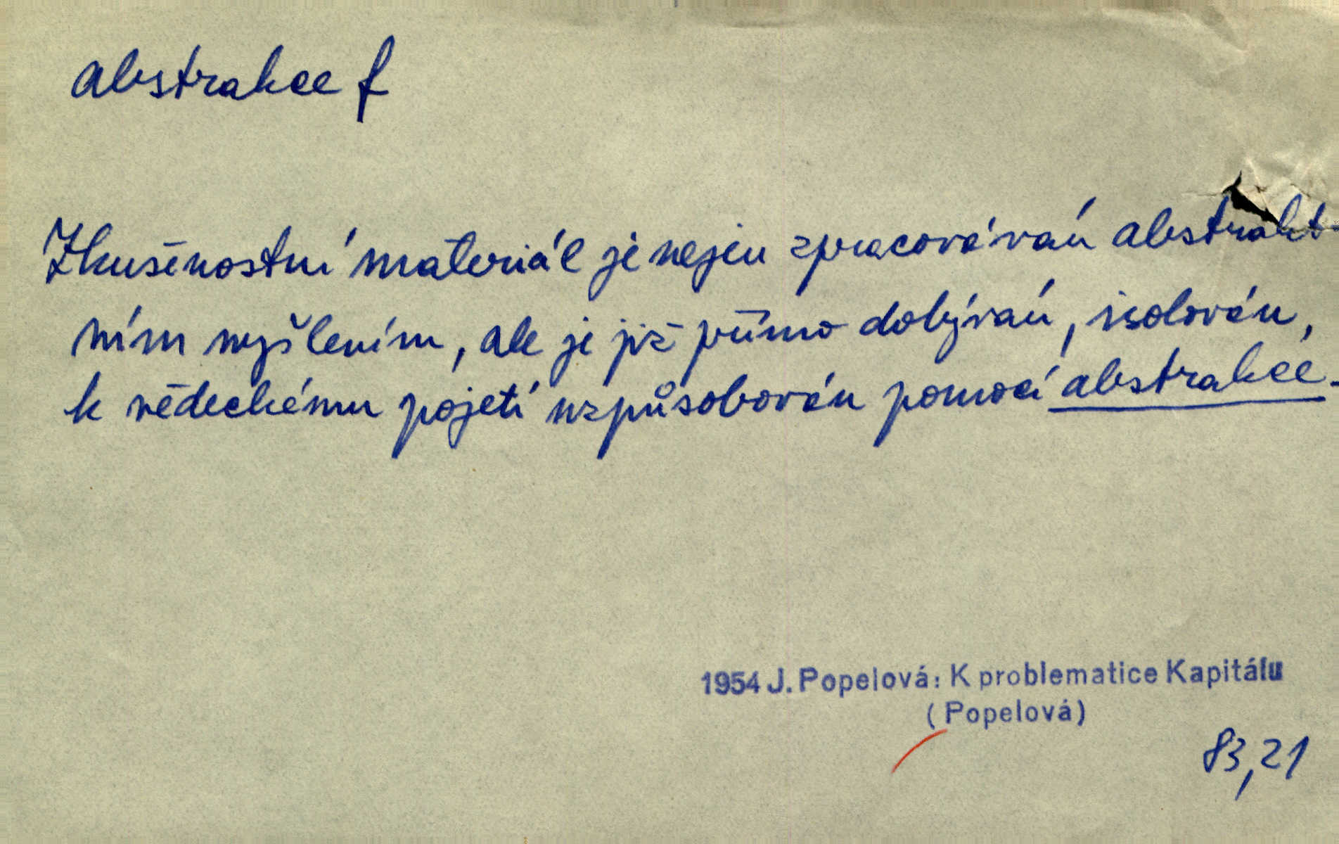- abstrakce, -e f. filos. pomysl (op. konkretnost). Individuum vědě jest jen abstrakcí, pravou skutečninou jest člověčenstvo. Mas. Neodb. s vedlejším význ. nemožnosti, neskutečnosti. Otázka, zdali národnost má do sebe skutečnou realitu aneb je-li pouhým toliko pomyslem, jalovou abstrakcí. Pal. Úmyslně se vyhýbal rozumné konkretnosti a místo dával prázdné abstrakci. V. Mrš.