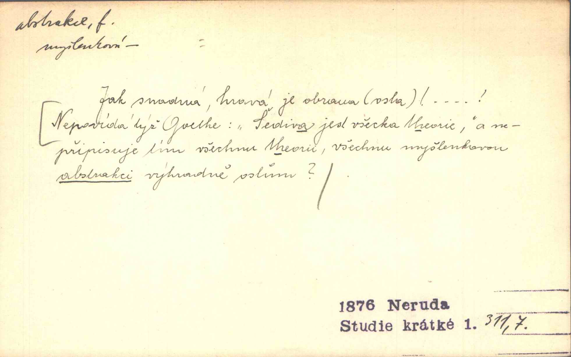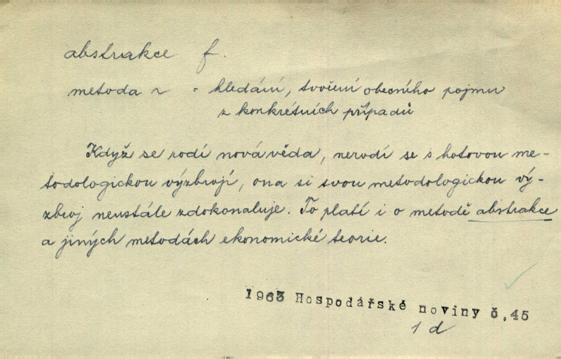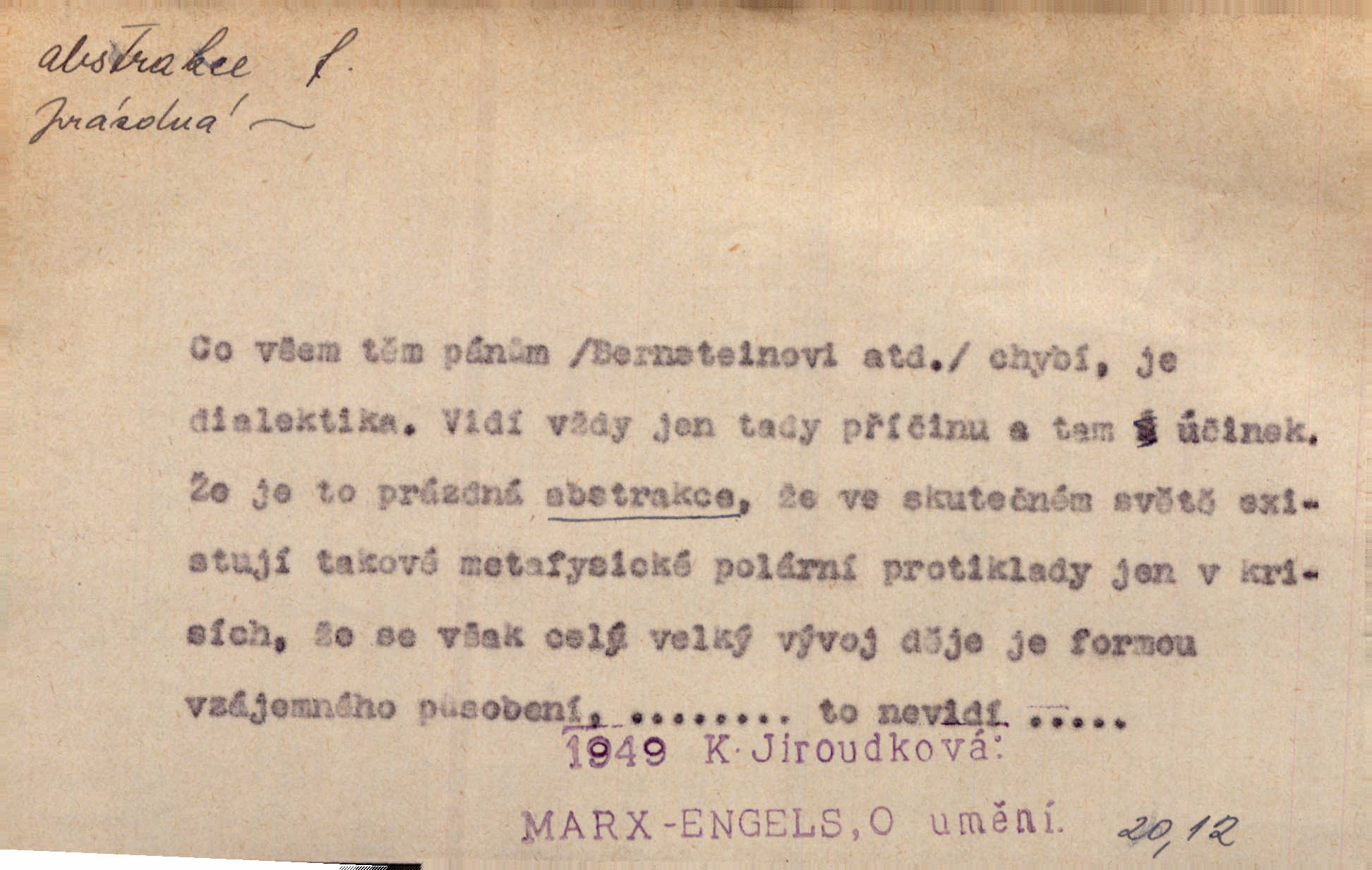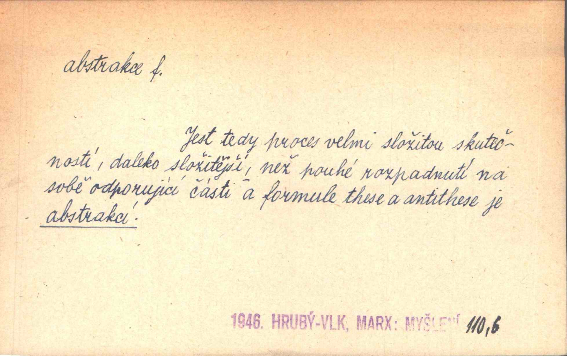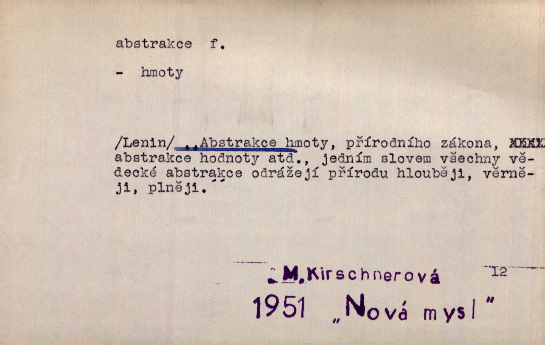 - abstrakce, -e f. filos. pomysl (op. konkretnost). Individuum vědě jest jen abstrakcí, pravou skutečninou jest člověčenstvo. Mas. Neodb. s vedlejším význ. nemožnosti, neskutečnosti. Otázka, zdali národnost má do sebe skutečnou realitu aneb je-li pouhým toliko pomyslem, jalovou abstrakcí. Pal. Úmyslně se vyhýbal rozumné konkretnosti a místo dával prázdné abstrakci. V. Mrš.