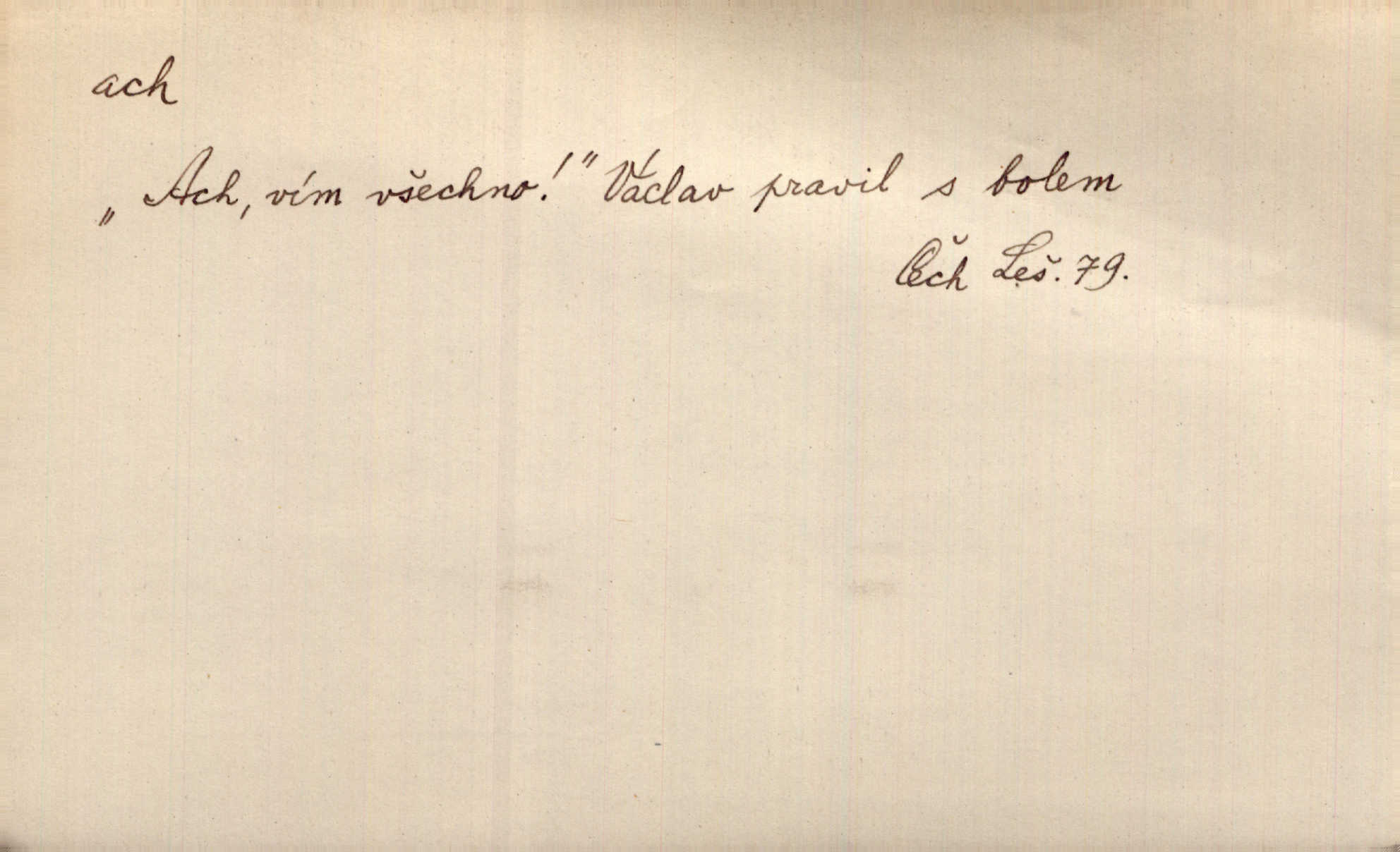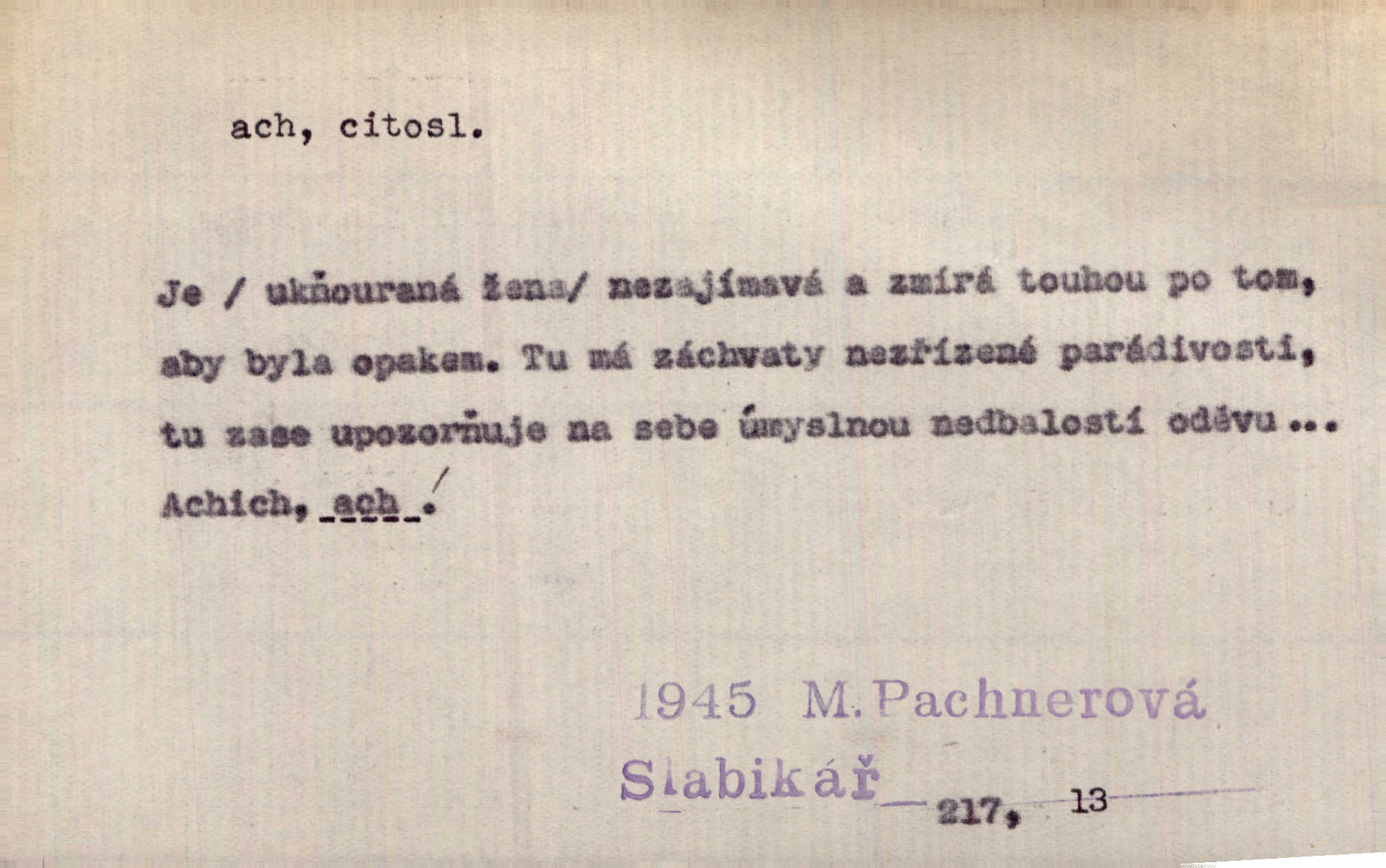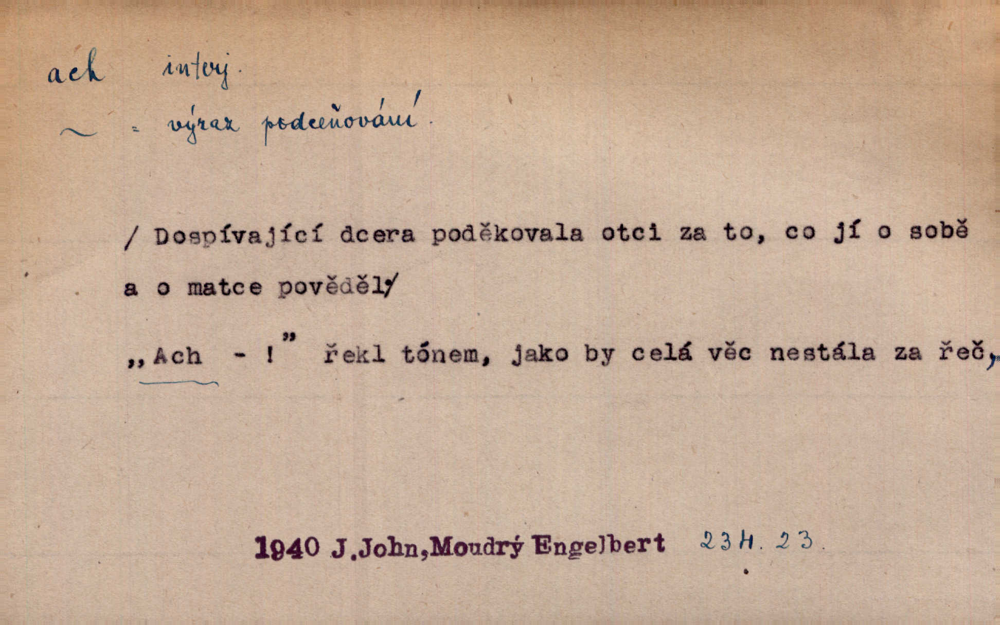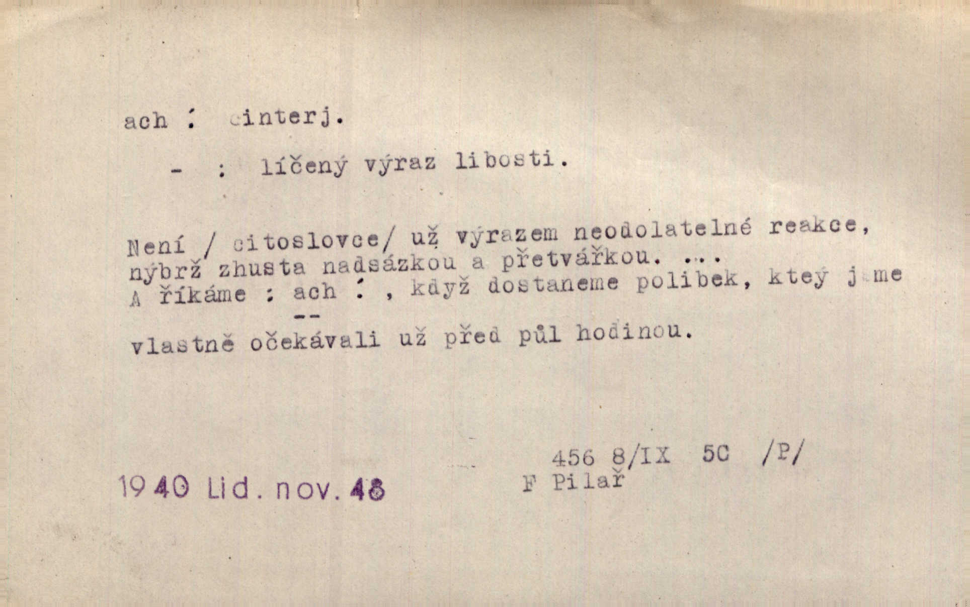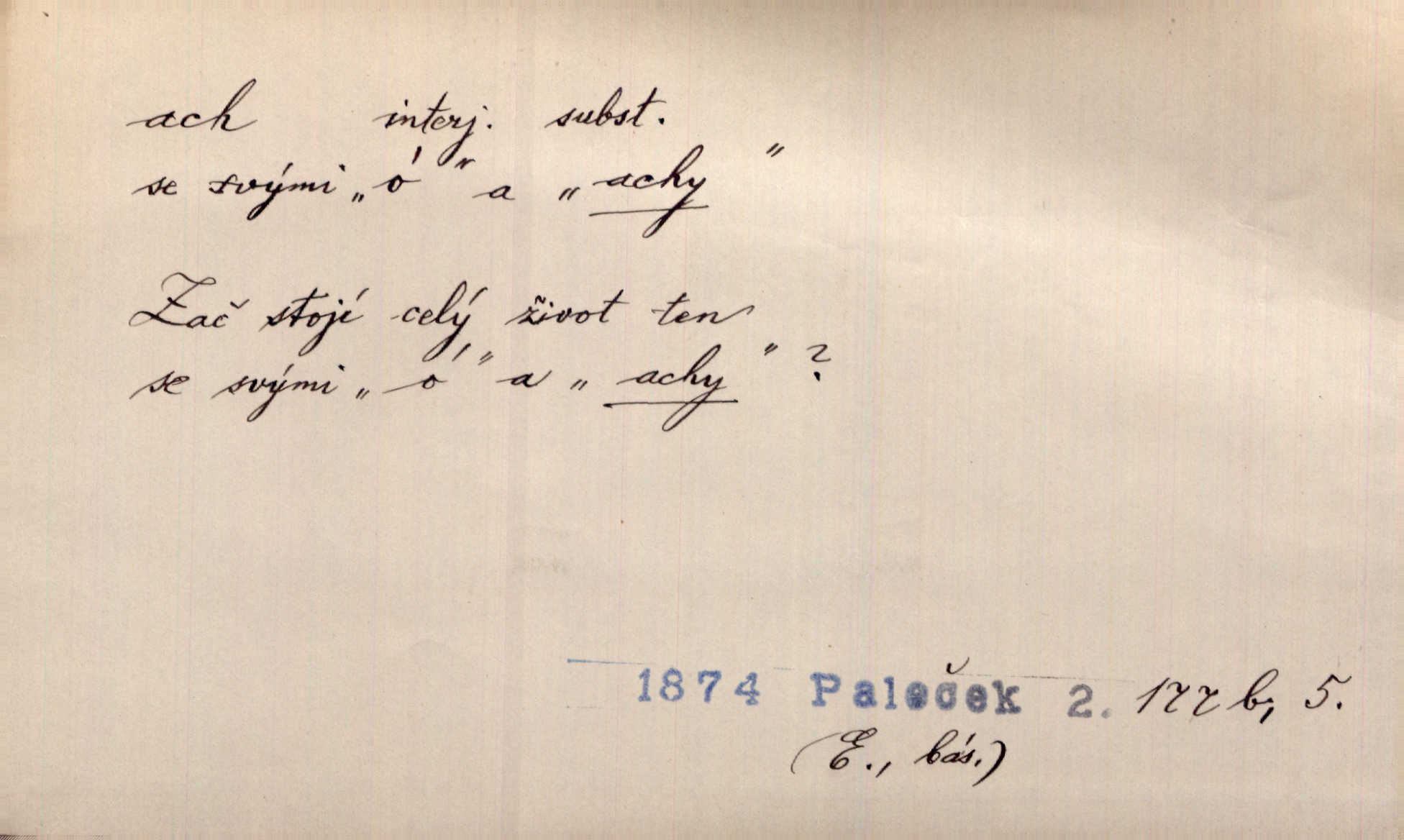 - ach citosl. vyjadřující rozmanité pocity příjemné i nepříjemné (bolest, zármutek, touhu, příjemné překvapení, obdiv a j.). Ach, to je s mužem trápení, to je s ním trápení! Rais. Ach, moře, já je slýchal duněti kdys v mládí v slokách Childe-Harolda. Mach. Každý nám chvějně přišeptne, že hřešit je ach tak hezké! Ner. Voní vám to tu jak u biskupa. Ááách! Herrm. D substantivováno: Hospodyně si stále stěžovala a pro stálé achy a ochy vůbec k ničemu nepřicházela. Klost. D Redupl. achach, achachach a j. Každý chce být jen pánem s pérem za uchem — zatím — achach, známe to panství! Rais.