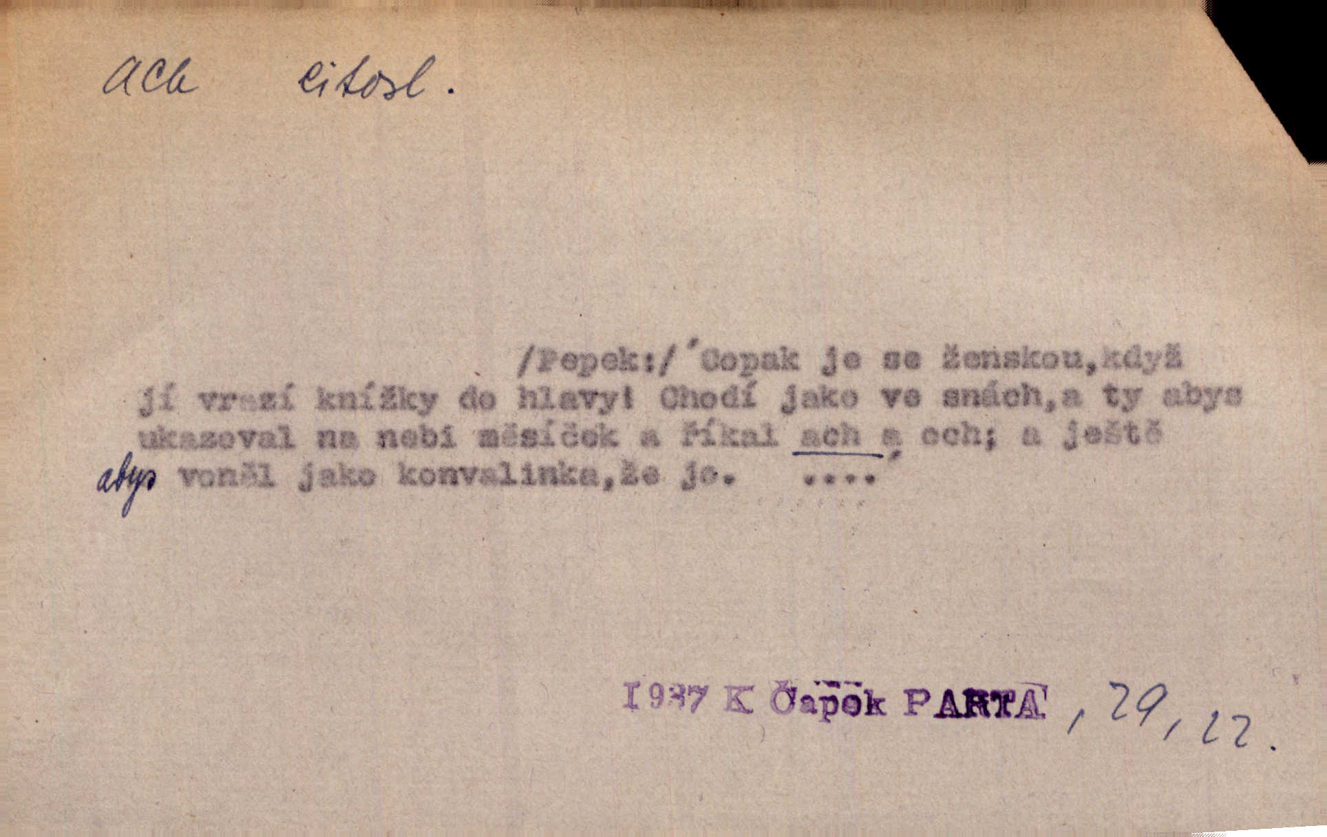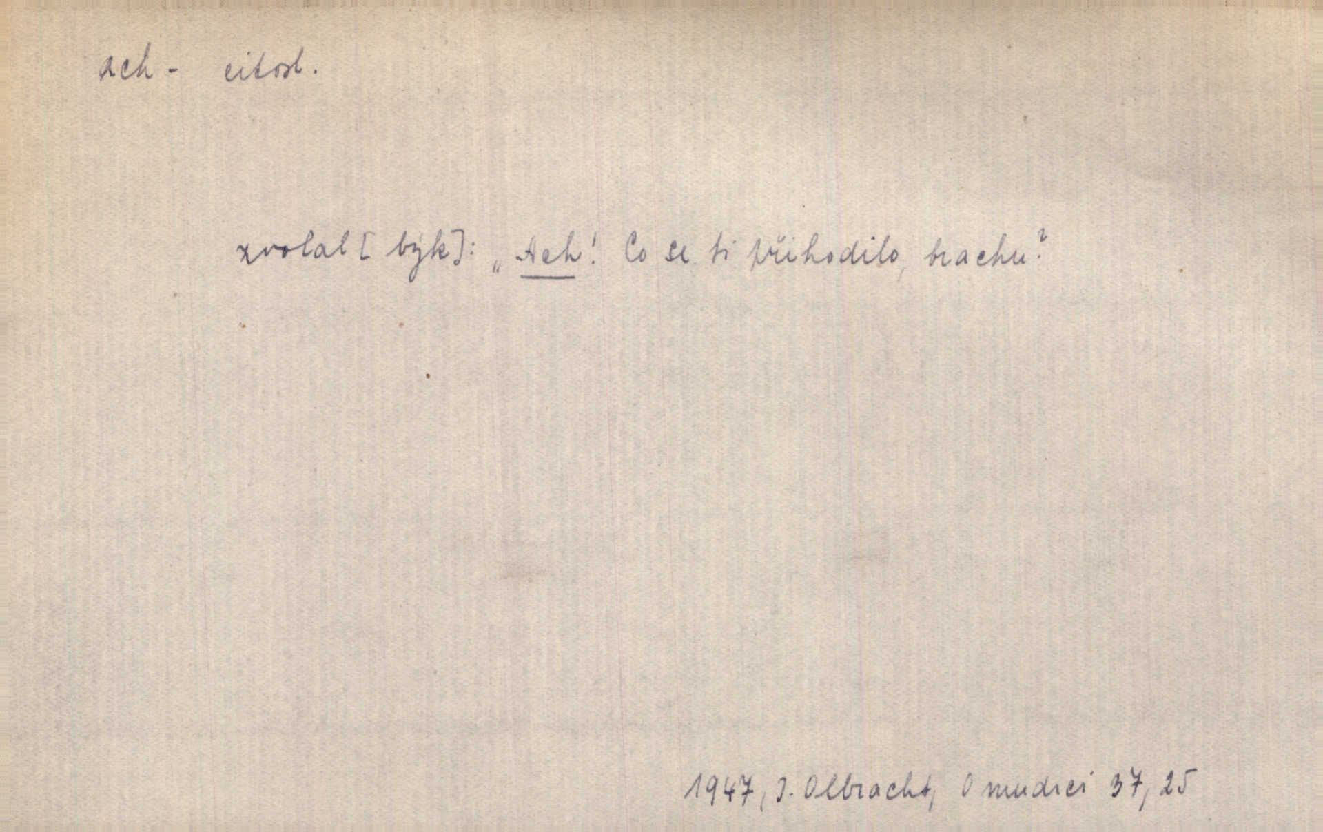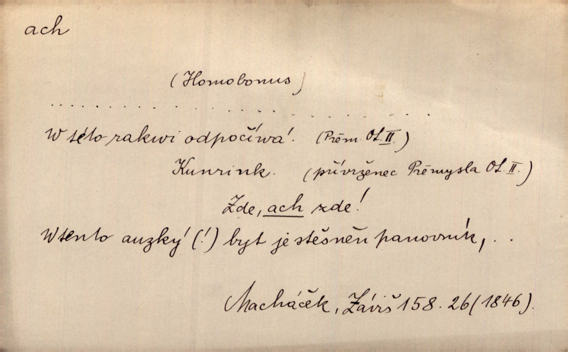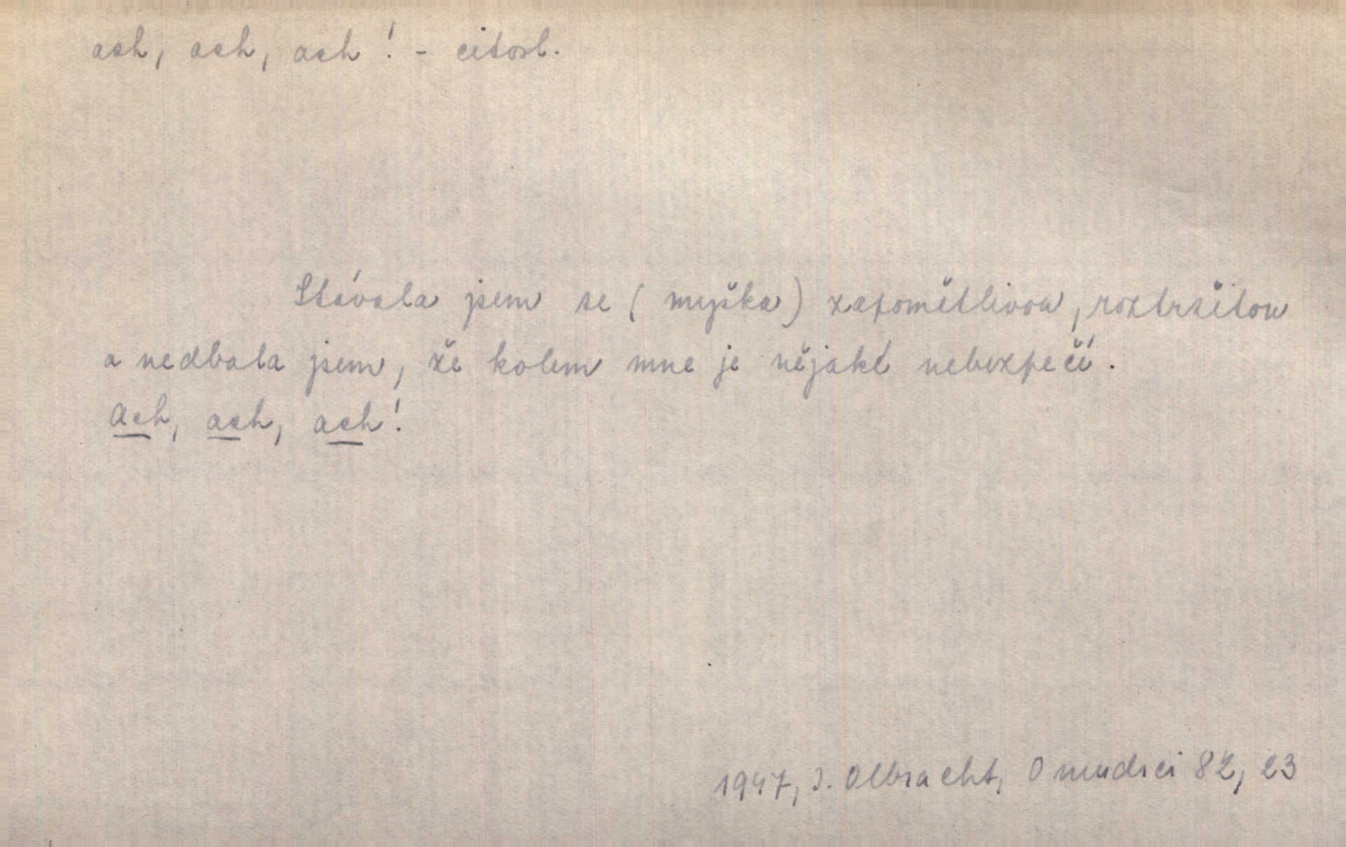 - ach citosl. vyjadřující rozmanité pocity příjemné i nepříjemné (bolest, zármutek, touhu, příjemné překvapení, obdiv a j.). Ach, to je s mužem trápení, to je s ním trápení! Rais. Ach, moře, já je slýchal duněti kdys v mládí v slokách Childe-Harolda. Mach. Každý nám chvějně přišeptne, že hřešit je ach tak hezké! Ner. Voní vám to tu jak u biskupa. Ááách! Herrm. D substantivováno: Hospodyně si stále stěžovala a pro stálé achy a ochy vůbec k ničemu nepřicházela. Klost. D Redupl. achach, achachach a j. Každý chce být jen pánem s pérem za uchem — zatím — achach, známe to panství! Rais.