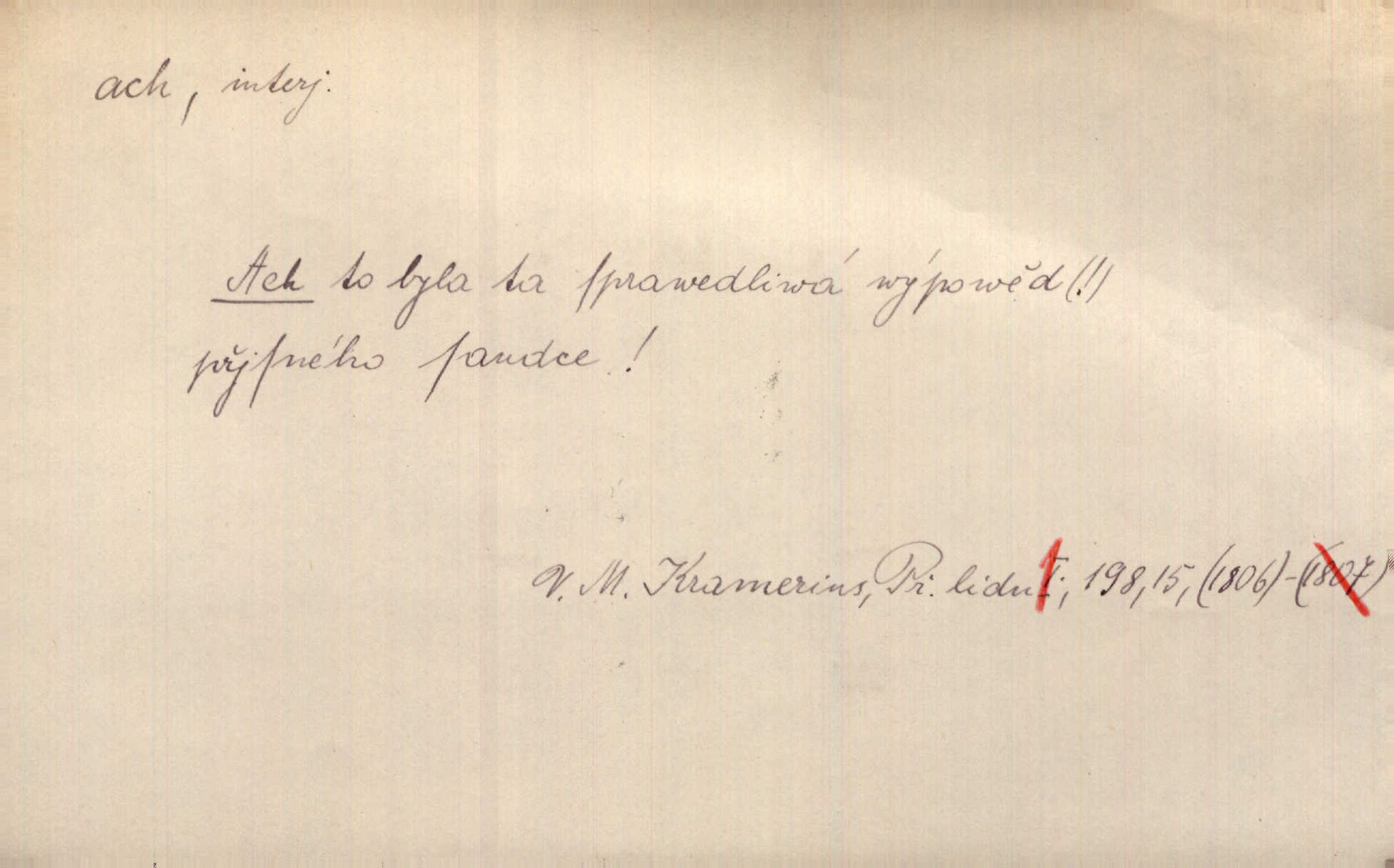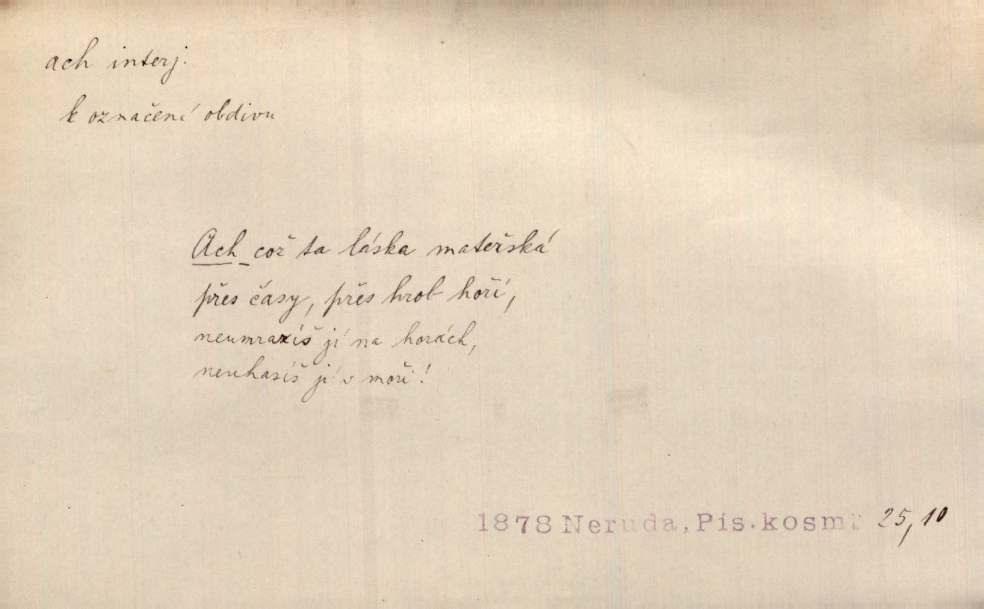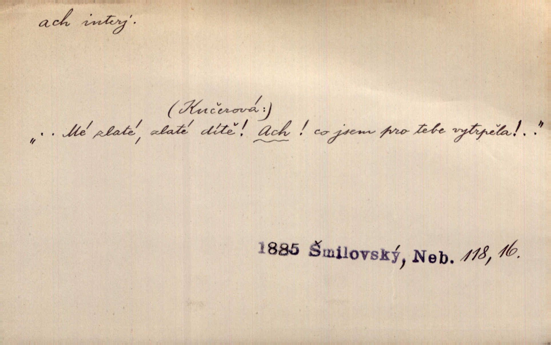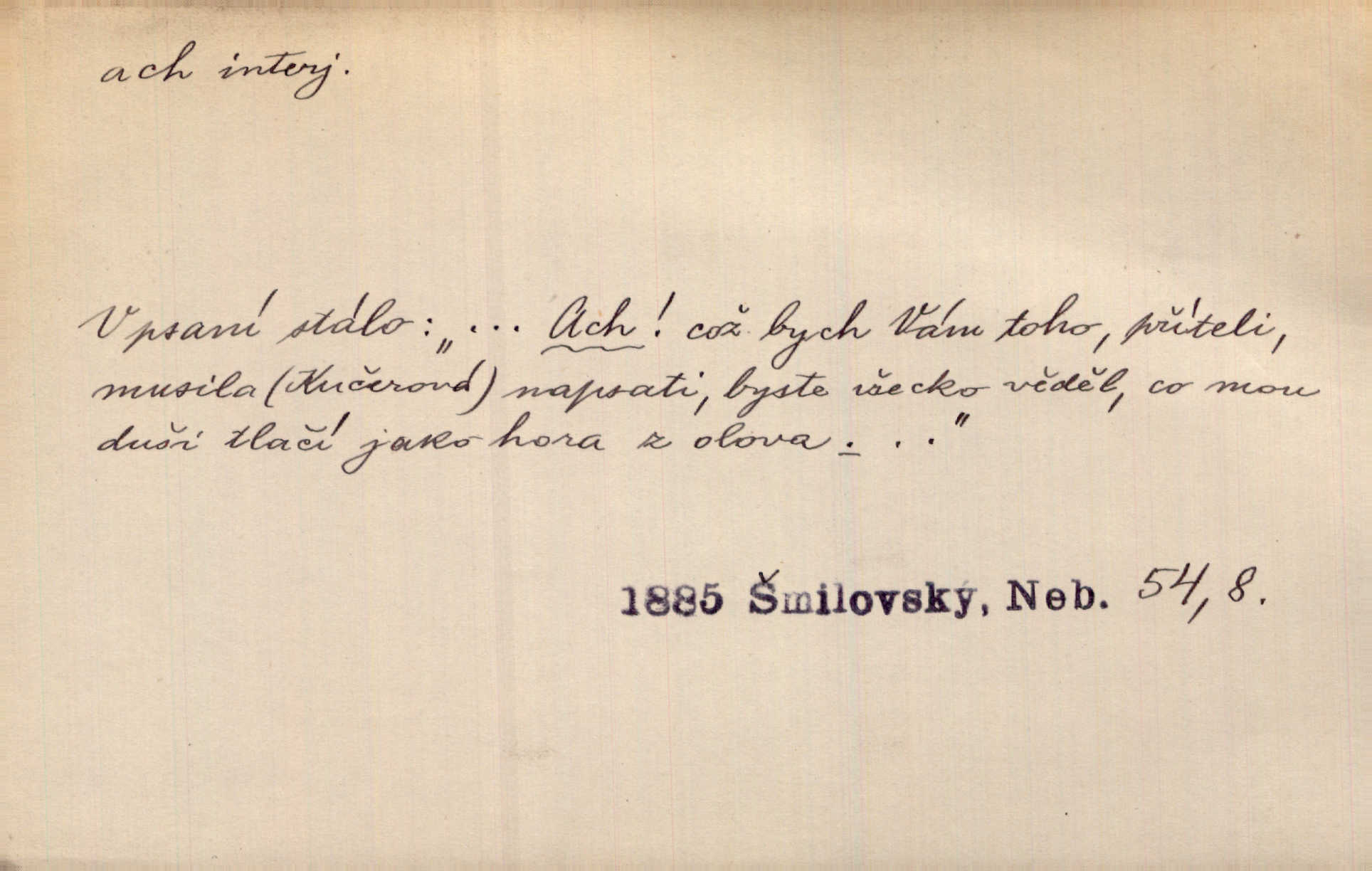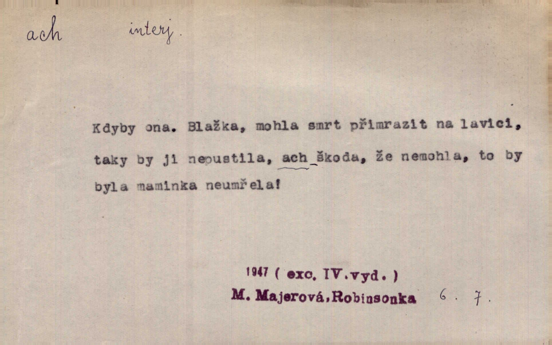 - ach citosl. vyjadřující rozmanité pocity příjemné i nepříjemné (bolest, zármutek, touhu, příjemné překvapení, obdiv a j.). Ach, to je s mužem trápení, to je s ním trápení! Rais. Ach, moře, já je slýchal duněti kdys v mládí v slokách Childe-Harolda. Mach. Každý nám chvějně přišeptne, že hřešit je ach tak hezké! Ner. Voní vám to tu jak u biskupa. Ááách! Herrm. D substantivováno: Hospodyně si stále stěžovala a pro stálé achy a ochy vůbec k ničemu nepřicházela. Klost. D Redupl. achach, achachach a j. Každý chce být jen pánem s pérem za uchem — zatím — achach, známe to panství! Rais.