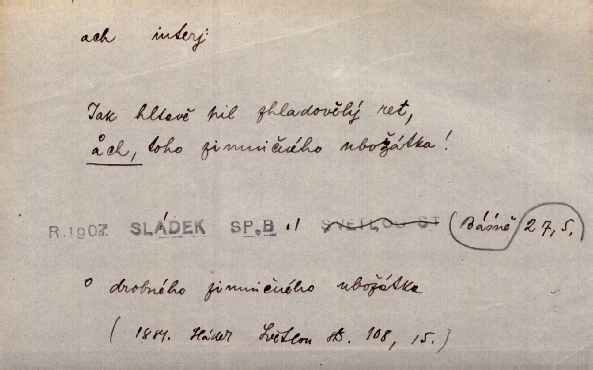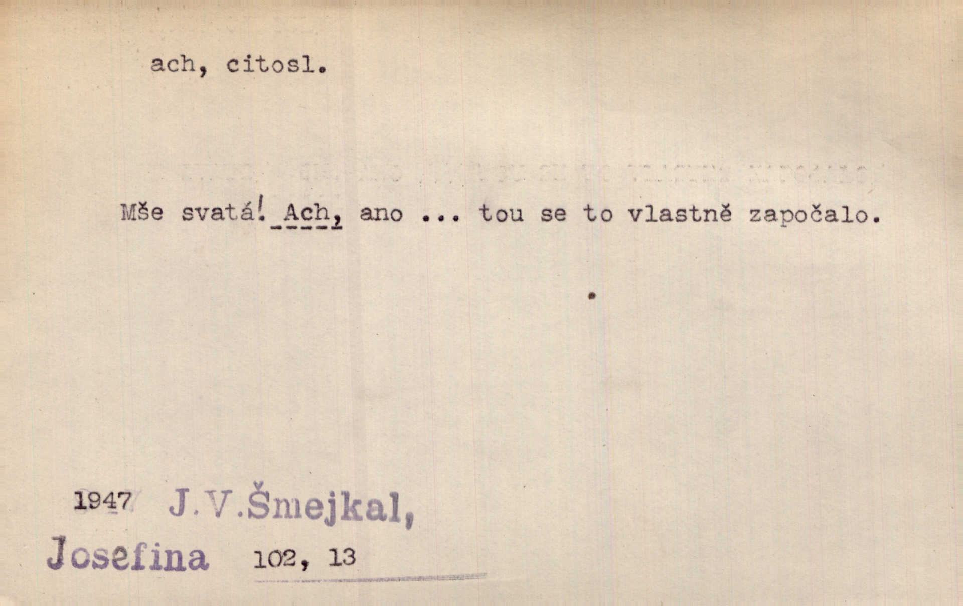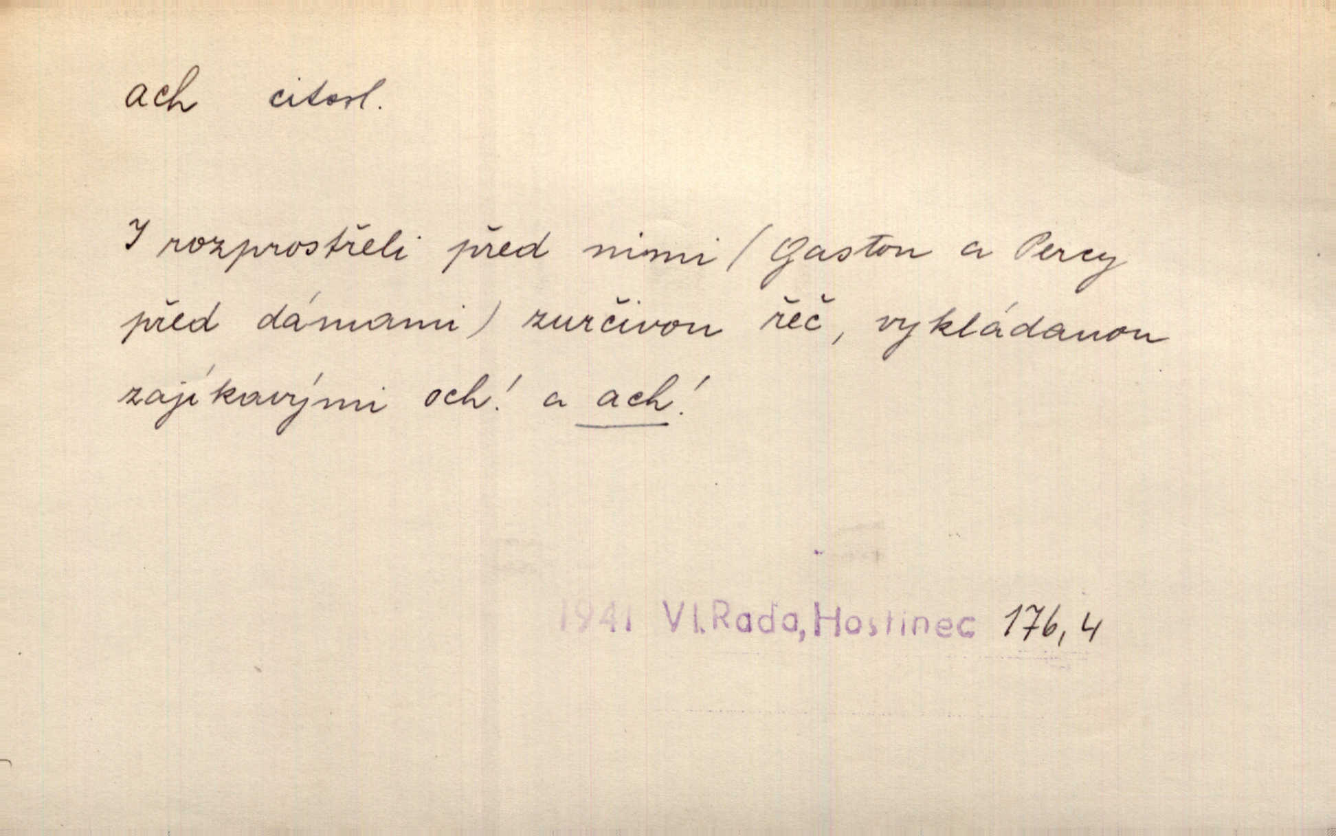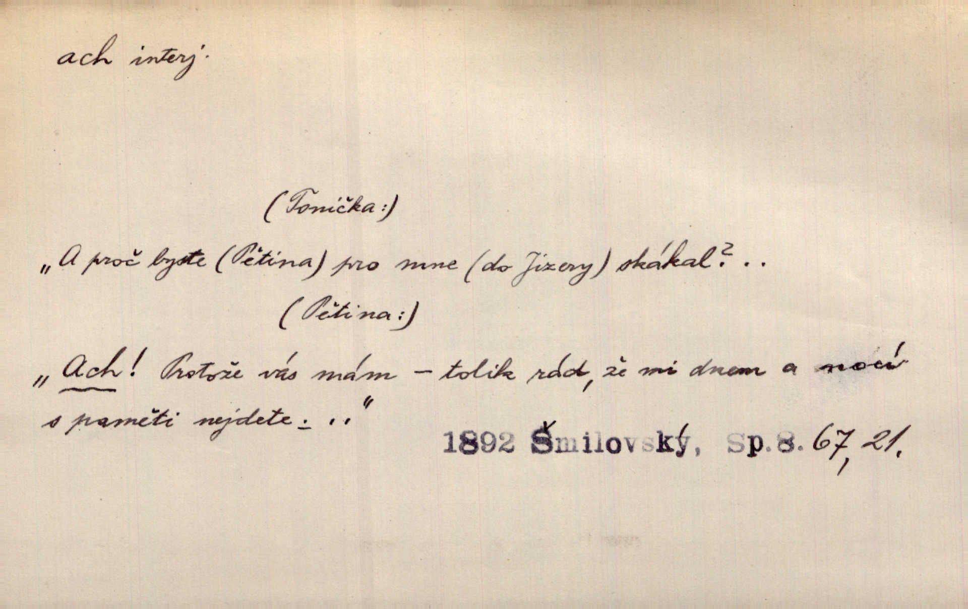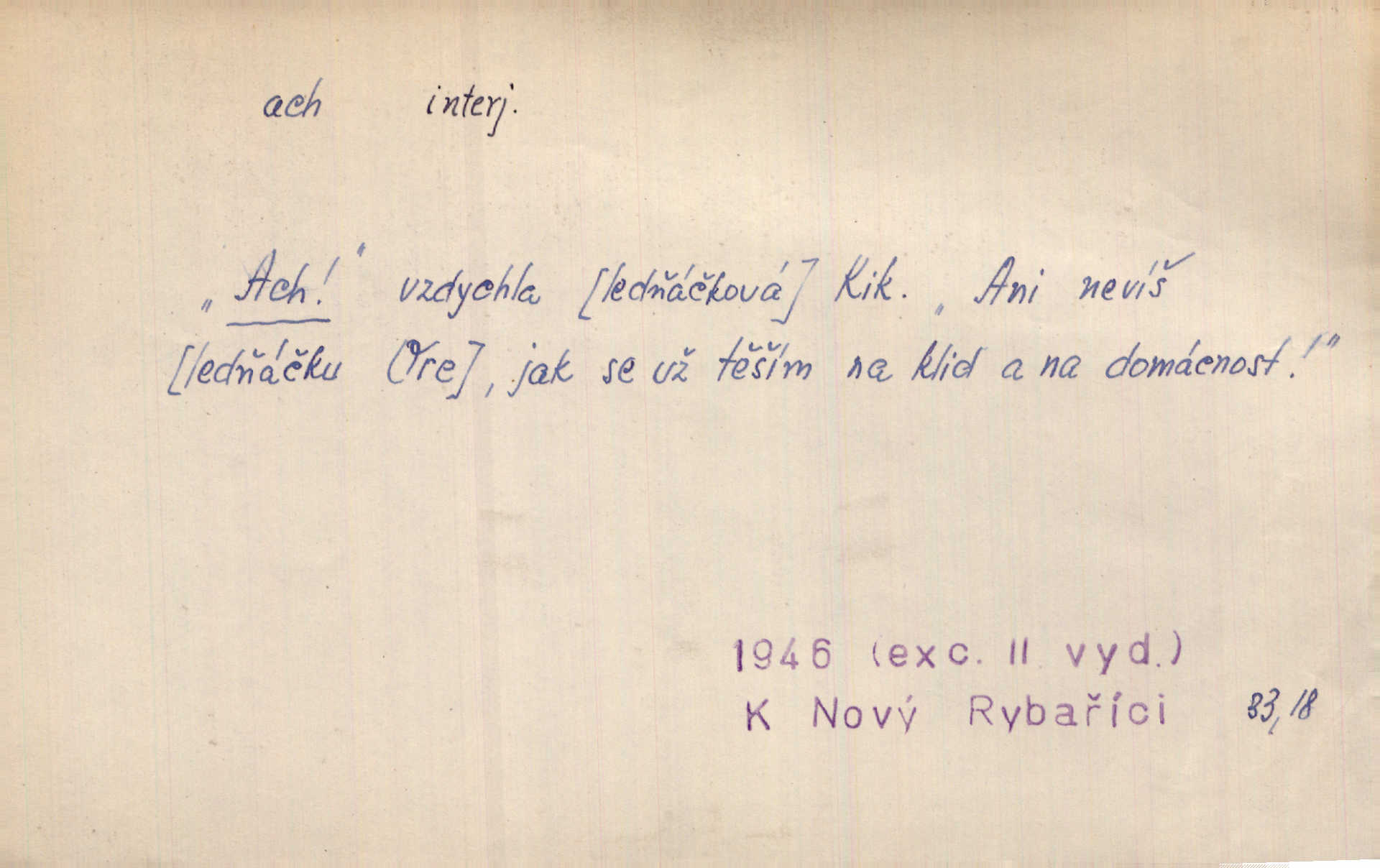- ach citosl. vyjadřující rozmanité pocity příjemné i nepříjemné (bolest, zármutek, touhu, příjemné překvapení, obdiv a j.). Ach, to je s mužem trápení, to je s ním trápení! Rais. Ach, moře, já je slýchal duněti kdys v mládí v slokách Childe-Harolda. Mach. Každý nám chvějně přišeptne, že hřešit je ach tak hezké! Ner. Voní vám to tu jak u biskupa. Ááách! Herrm. D substantivováno: Hospodyně si stále stěžovala a pro stálé achy a ochy vůbec k ničemu nepřicházela. Klost. D Redupl. achach, achachach a j. Každý chce být jen pánem s pérem za uchem — zatím — achach, známe to panství! Rais.
