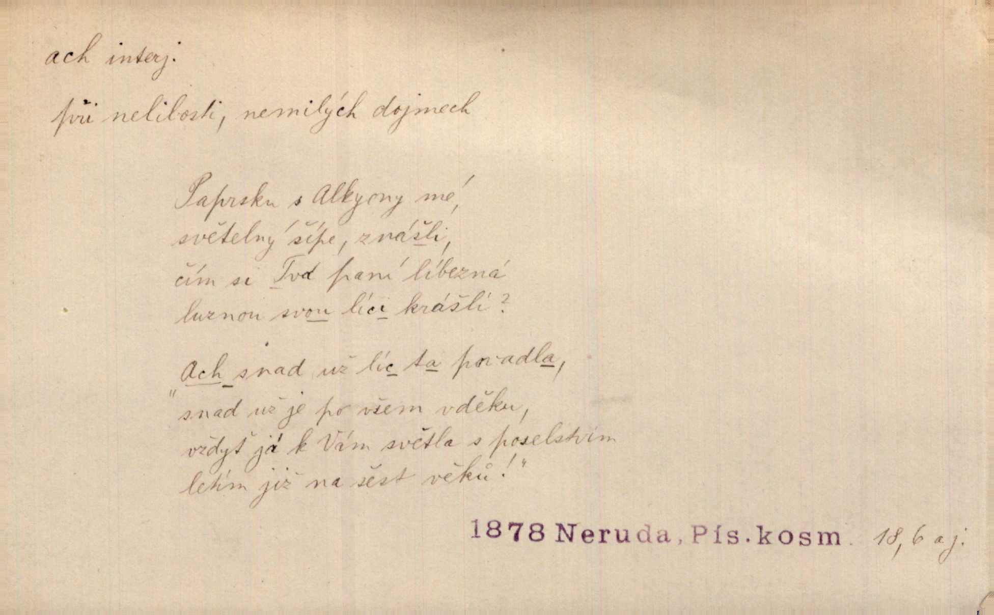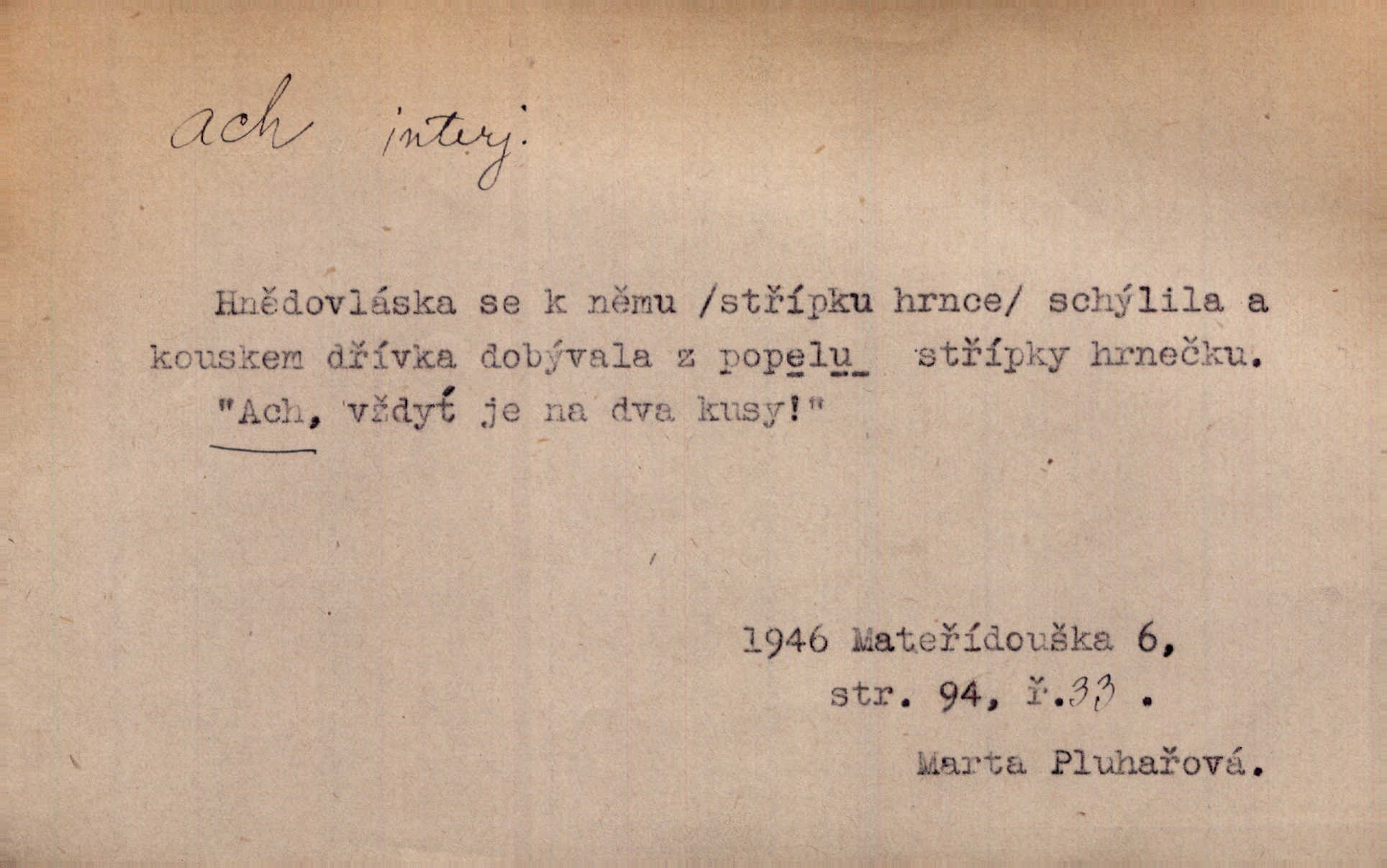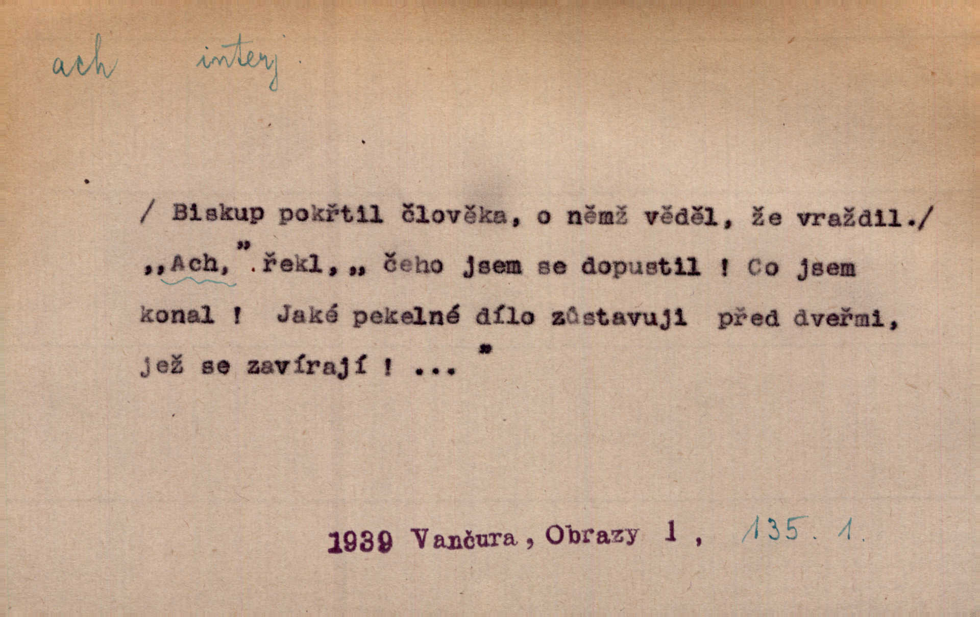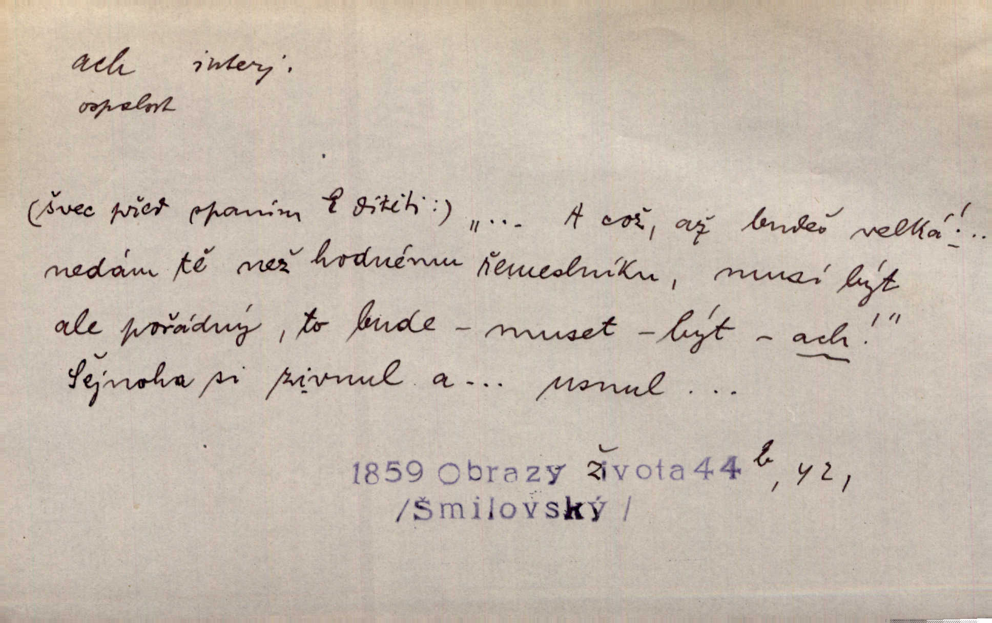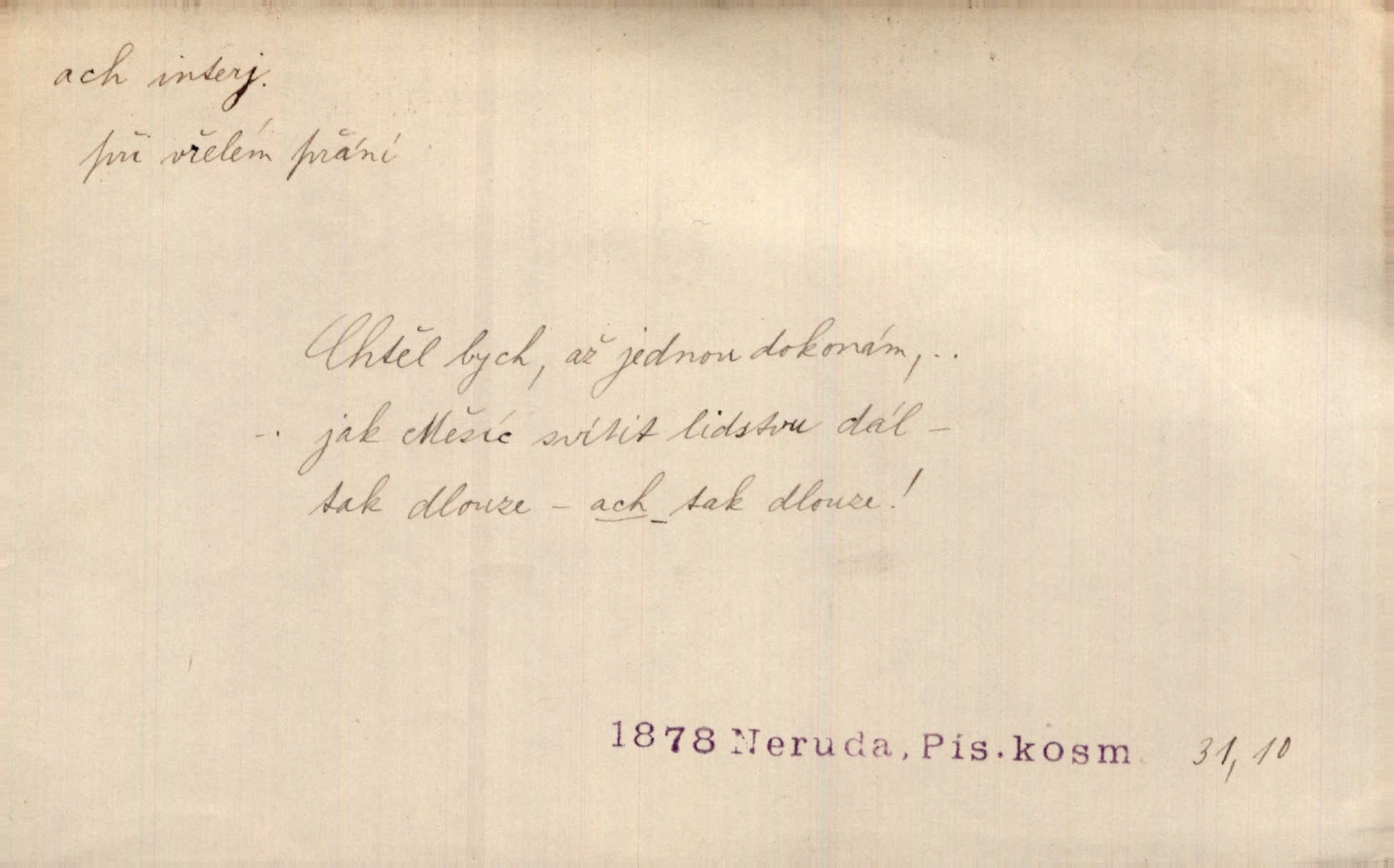 - ach citosl. vyjadřující rozmanité pocity příjemné i nepříjemné (bolest, zármutek, touhu, příjemné překvapení, obdiv a j.). Ach, to je s mužem trápení, to je s ním trápení! Rais. Ach, moře, já je slýchal duněti kdys v mládí v slokách Childe-Harolda. Mach. Každý nám chvějně přišeptne, že hřešit je ach tak hezké! Ner. Voní vám to tu jak u biskupa. Ááách! Herrm. D substantivováno: Hospodyně si stále stěžovala a pro stálé achy a ochy vůbec k ničemu nepřicházela. Klost. D Redupl. achach, achachach a j. Každý chce být jen pánem s pérem za uchem — zatím — achach, známe to panství! Rais.