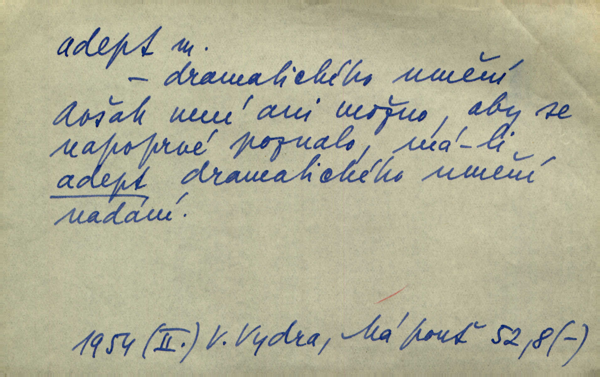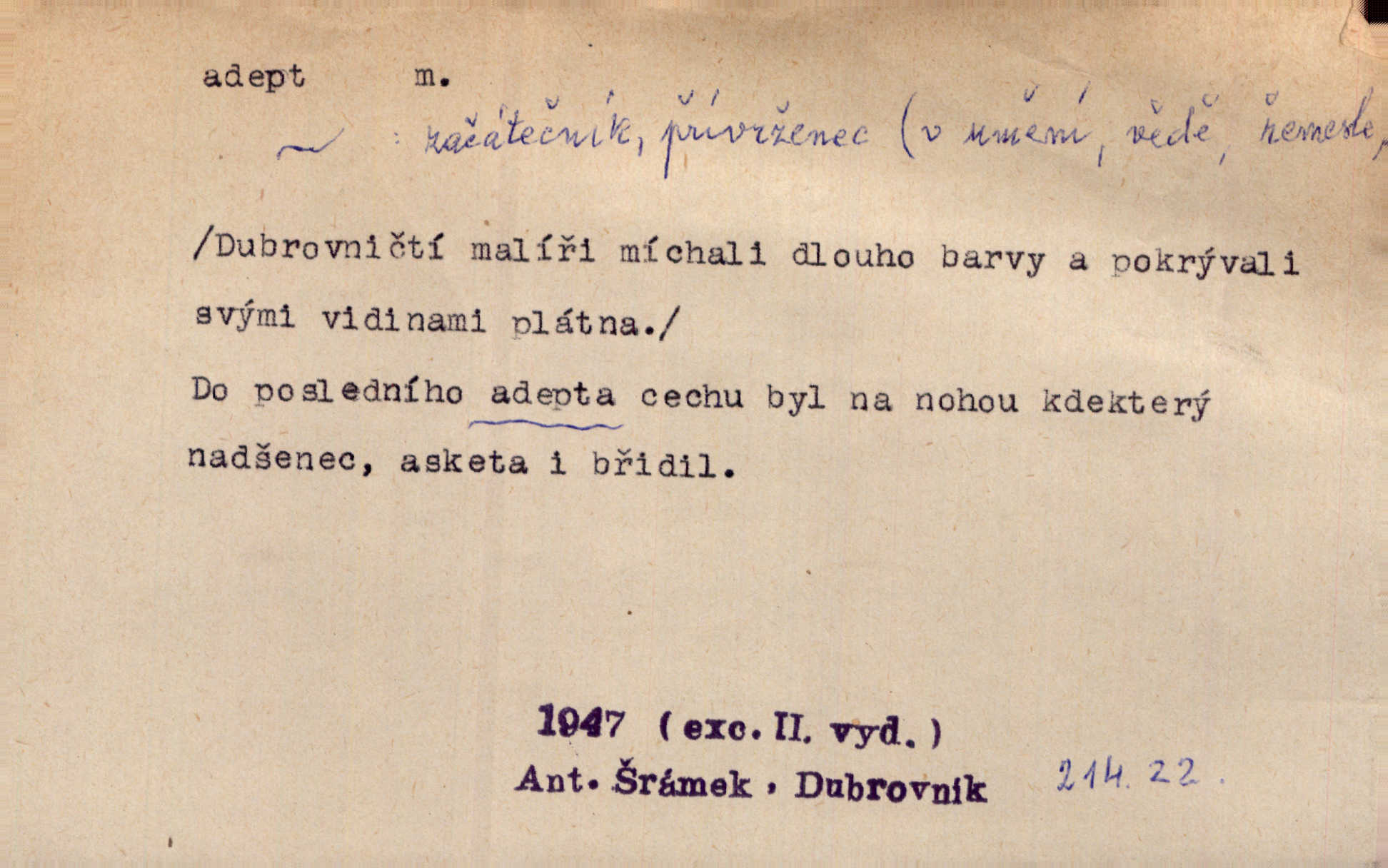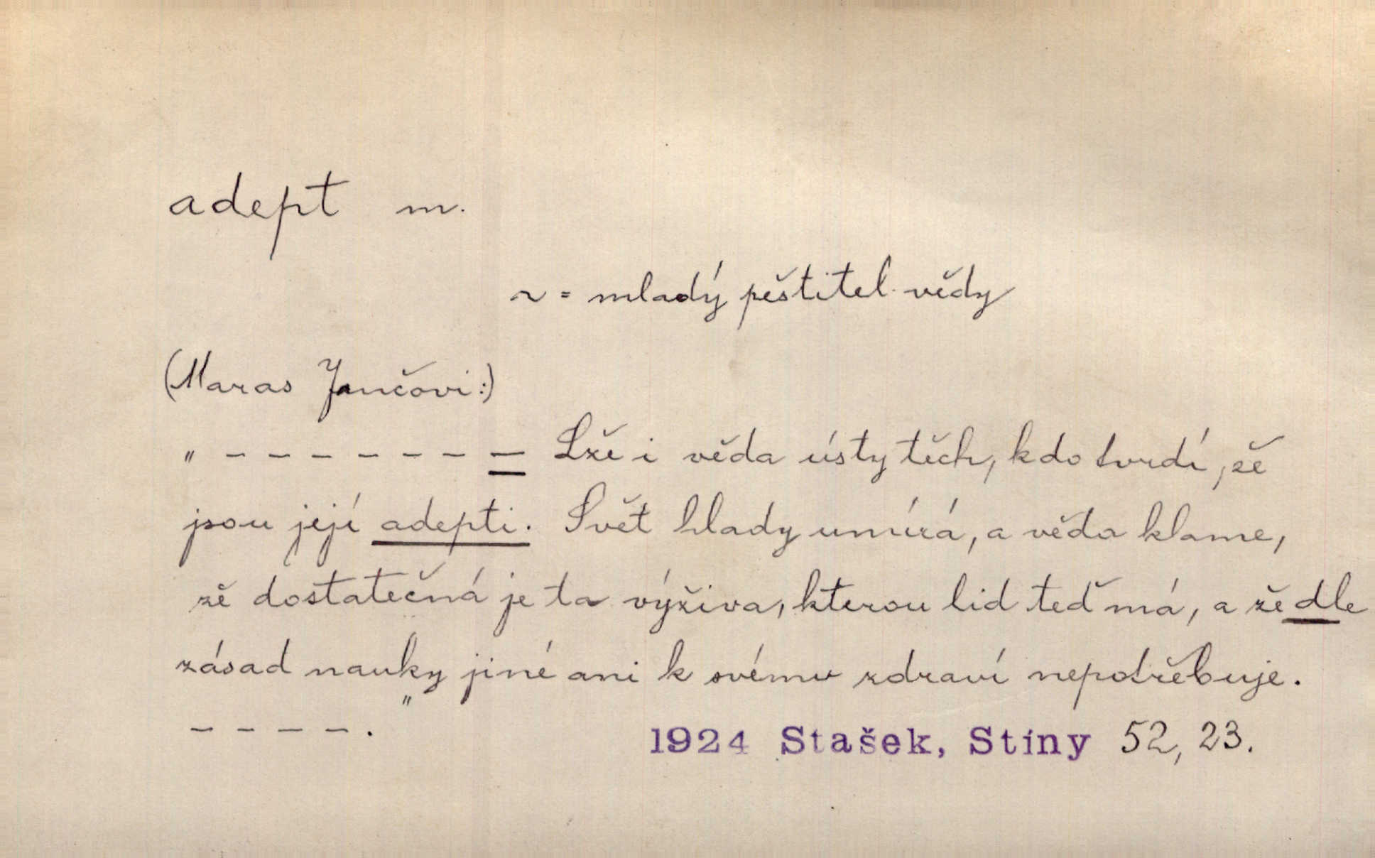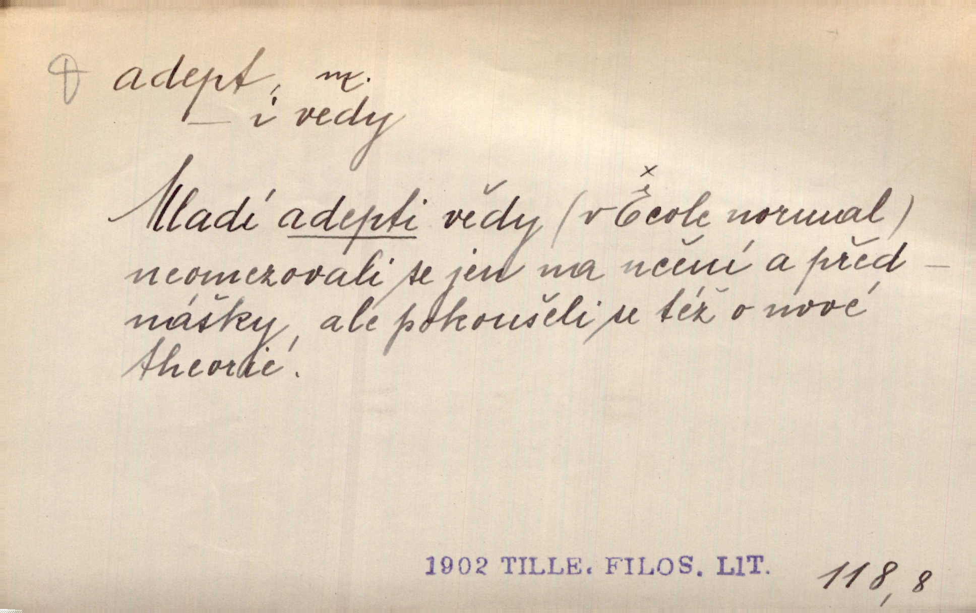 - adept, -a m. kdo vniká do nějakého učení, oboru vědního, uměleckého n. i praktického a chce se oddati jeho pěstování, zpravidla začátečník. Adept vědy, umění. D přivrženec, následovník. Neodsuzuji ani Zolu ani ostatní naturalisty, jeho adepty a nohsledy. Klost.