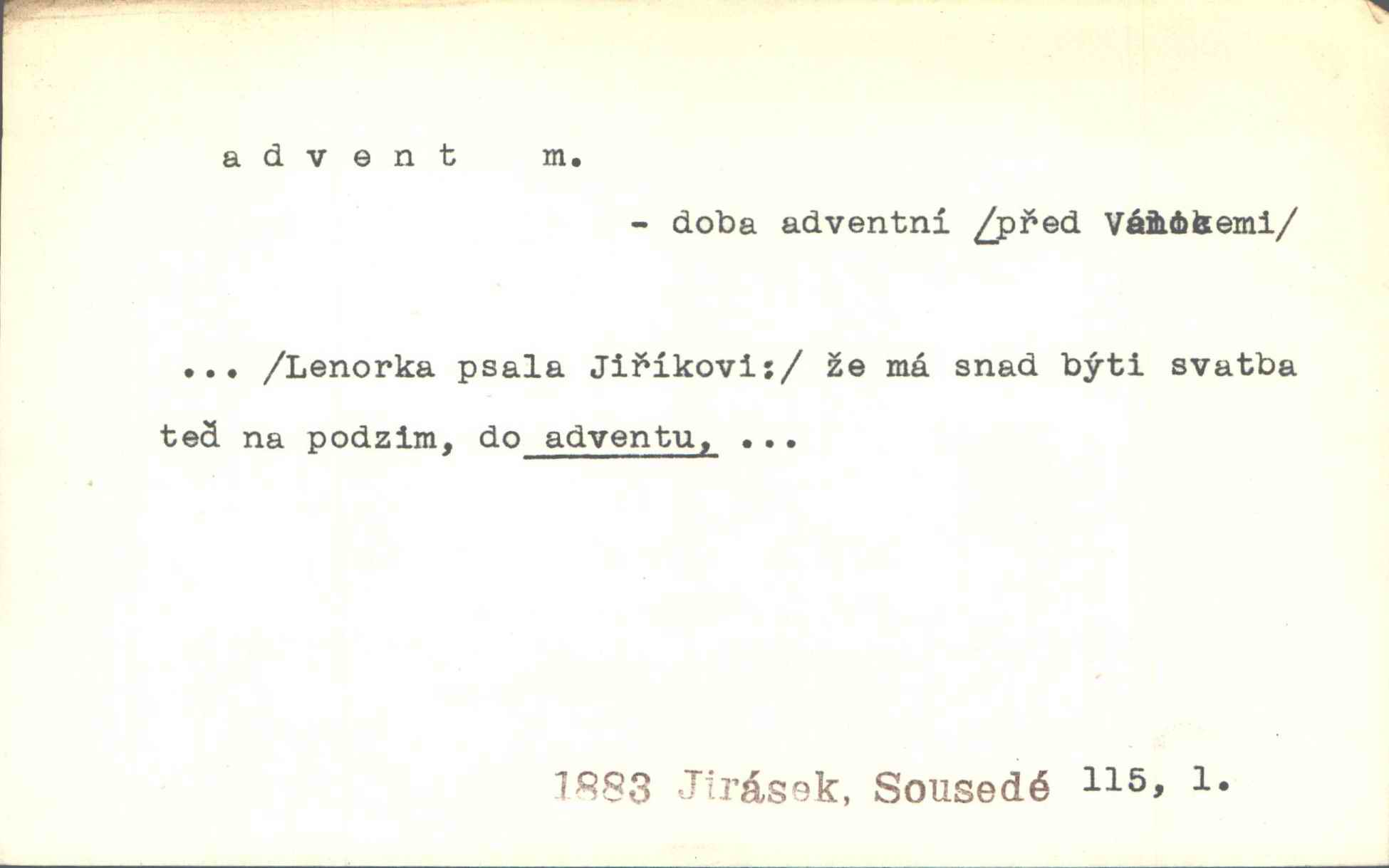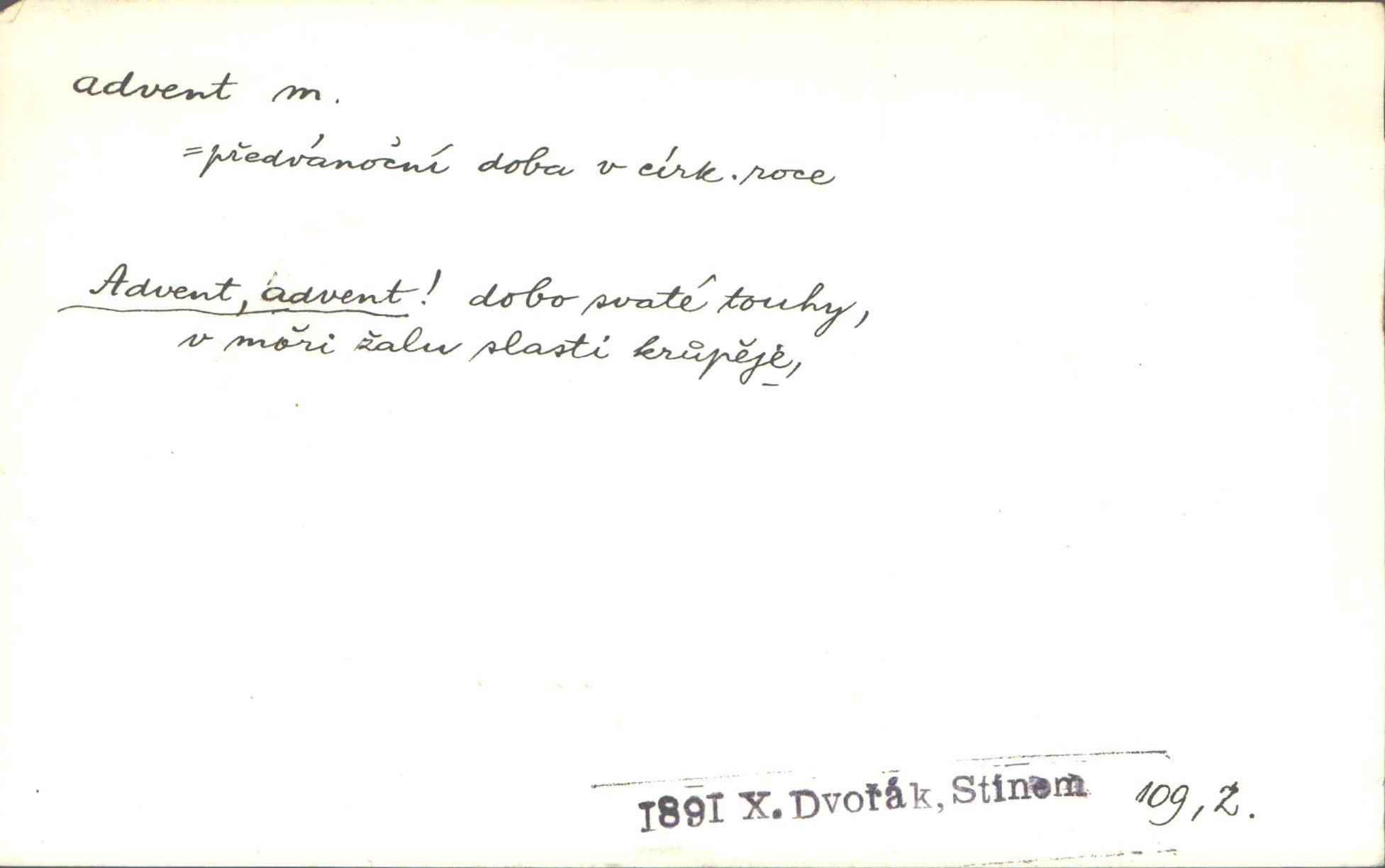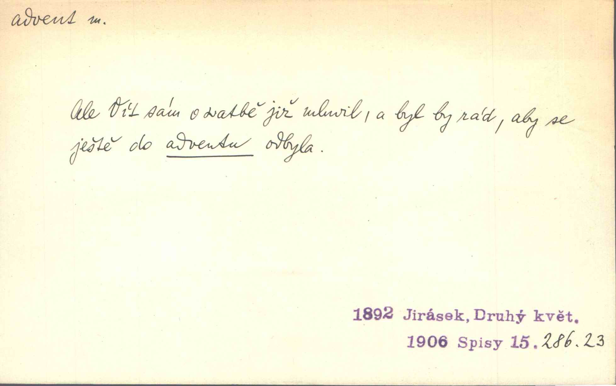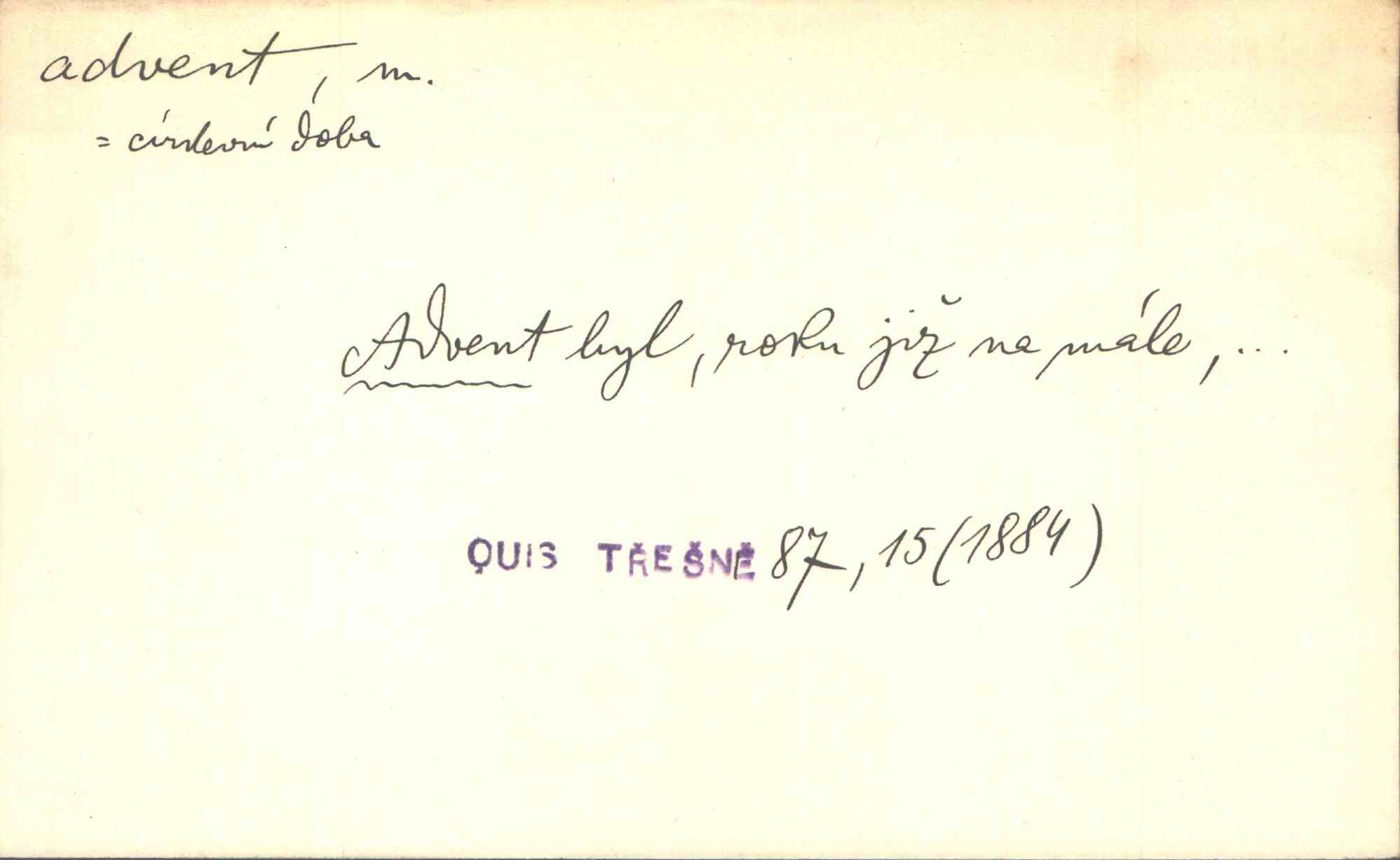 - advent, -u m. círk. doba čtyř neděl před vánocemi, doba předvánoční. V adventě jsem chodíval s otcem na rorate. Rais. Přen. Oč potom budou krásnější vzpomínky na onen čas očekávání a doufání, na onen advent lásky! Wojk.