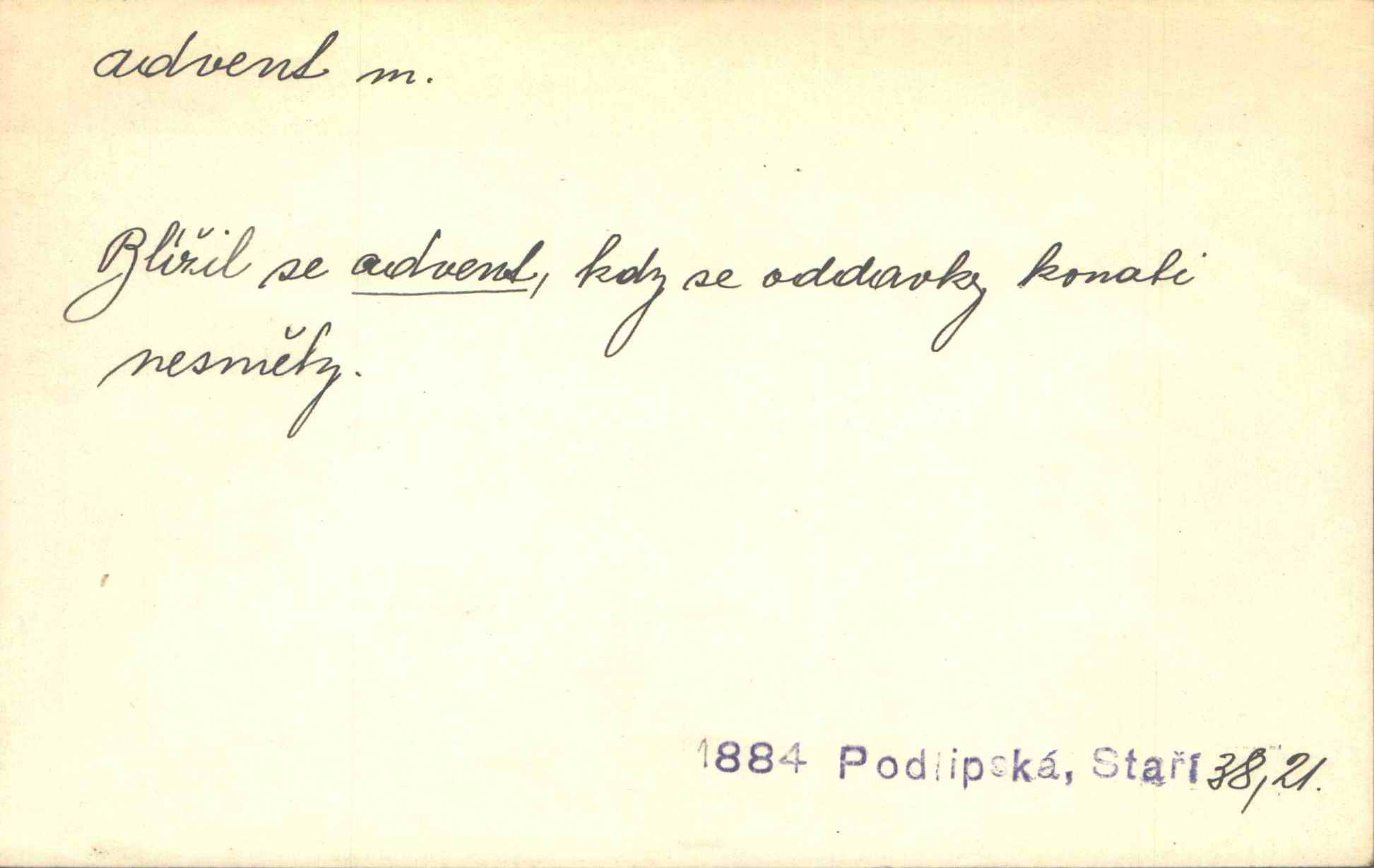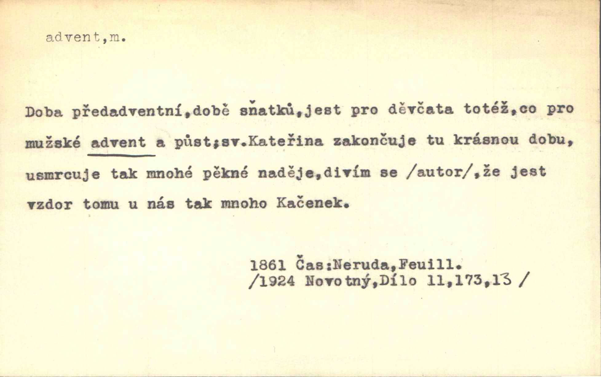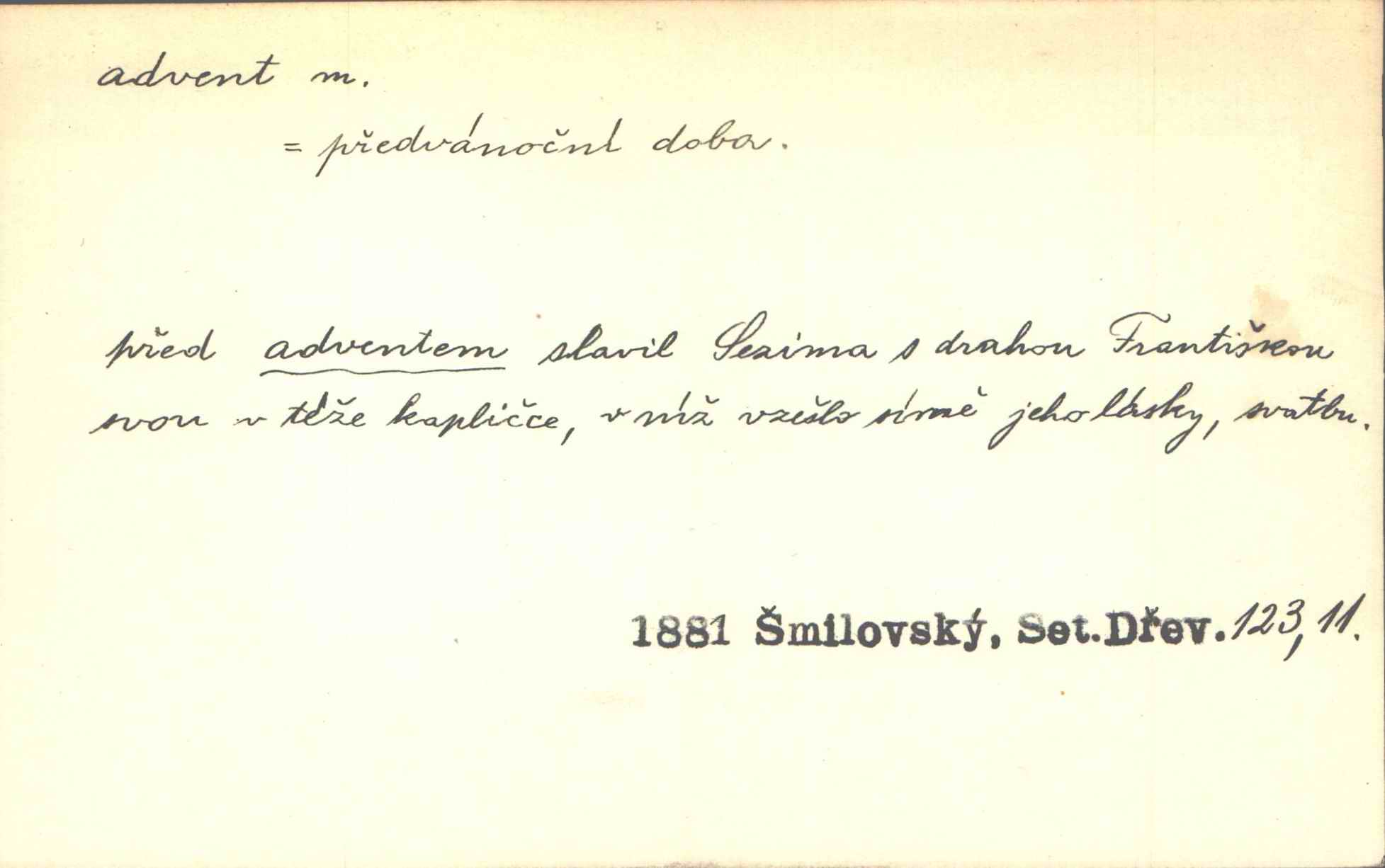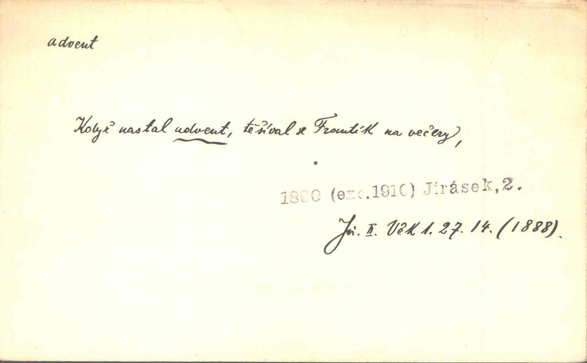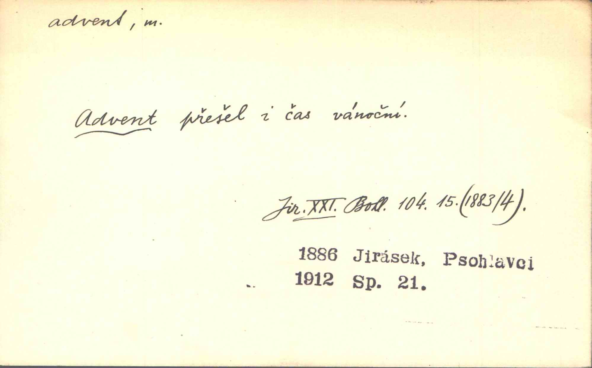 - advent, -u m. círk. doba čtyř neděl před vánocemi, doba předvánoční. V adventě jsem chodíval s otcem na rorate. Rais. Přen. Oč potom budou krásnější vzpomínky na onen čas očekávání a doufání, na onen advent lásky! Wojk.