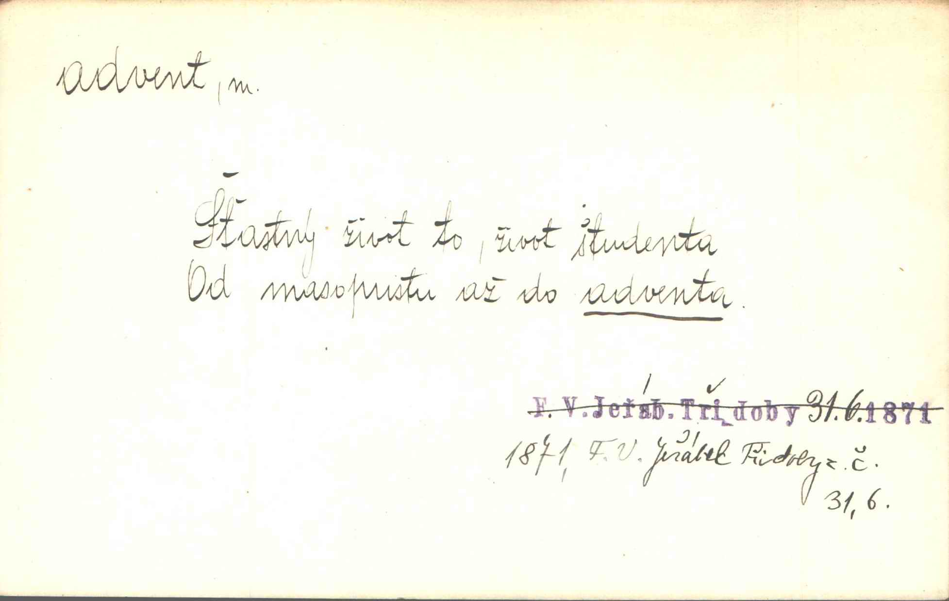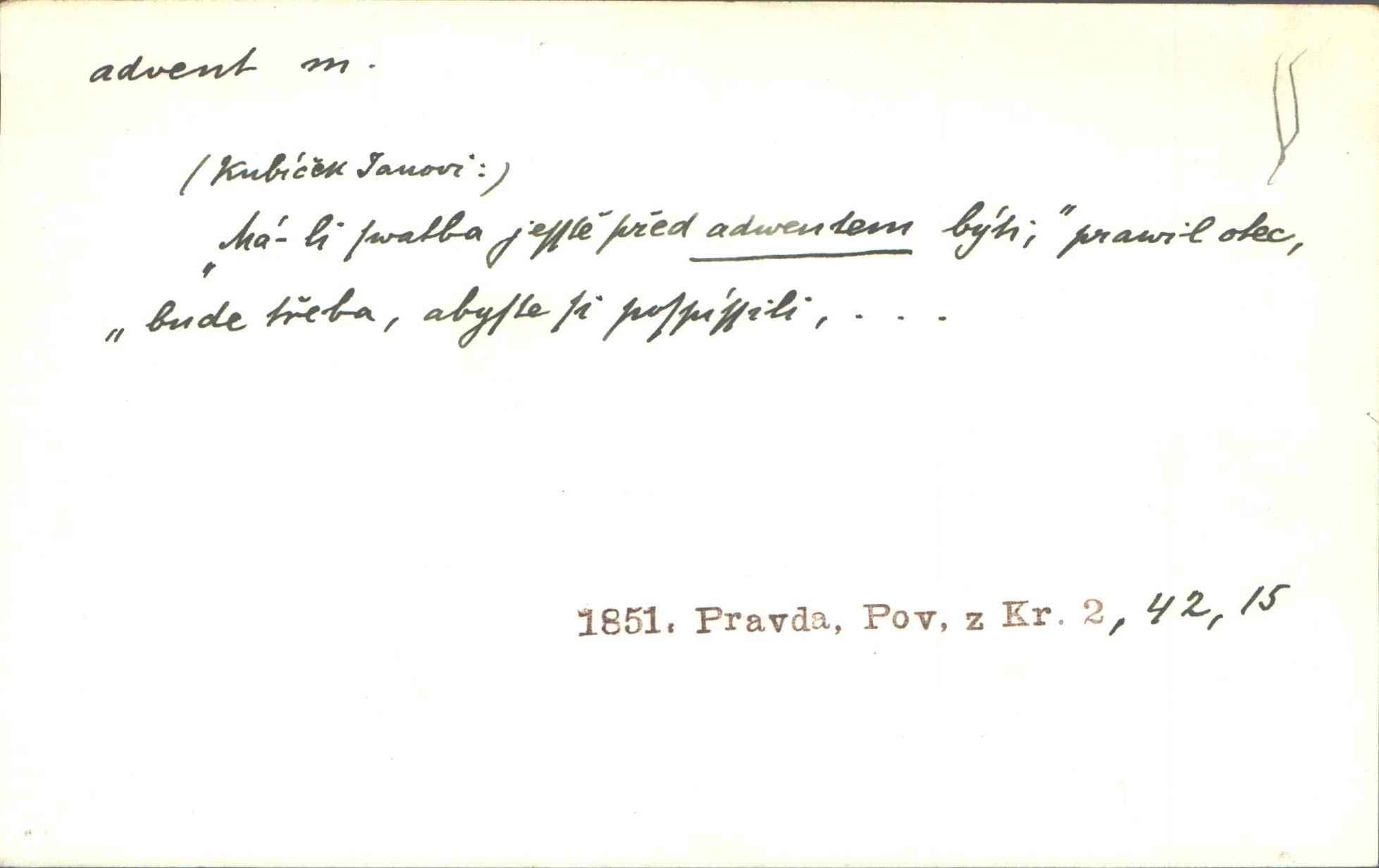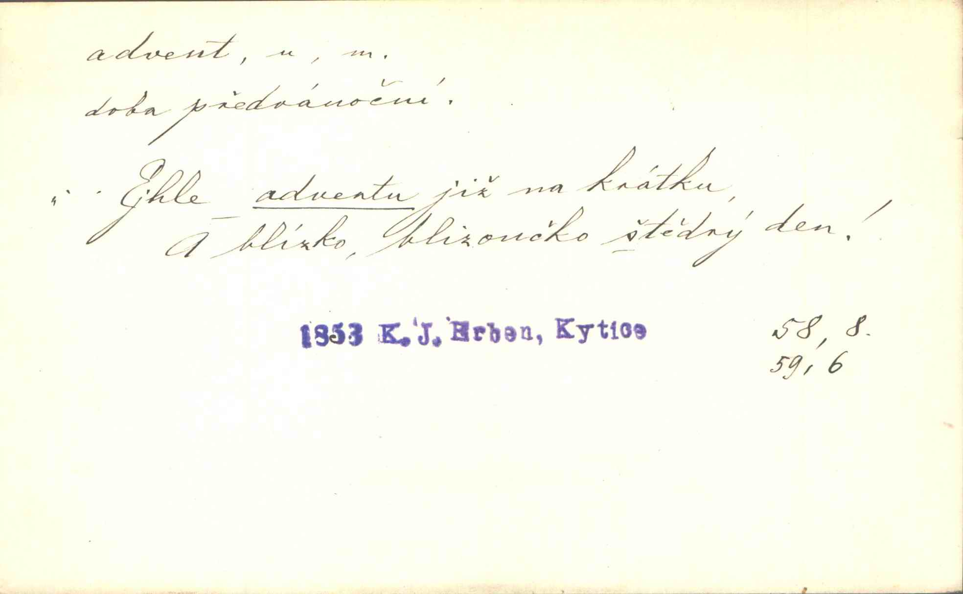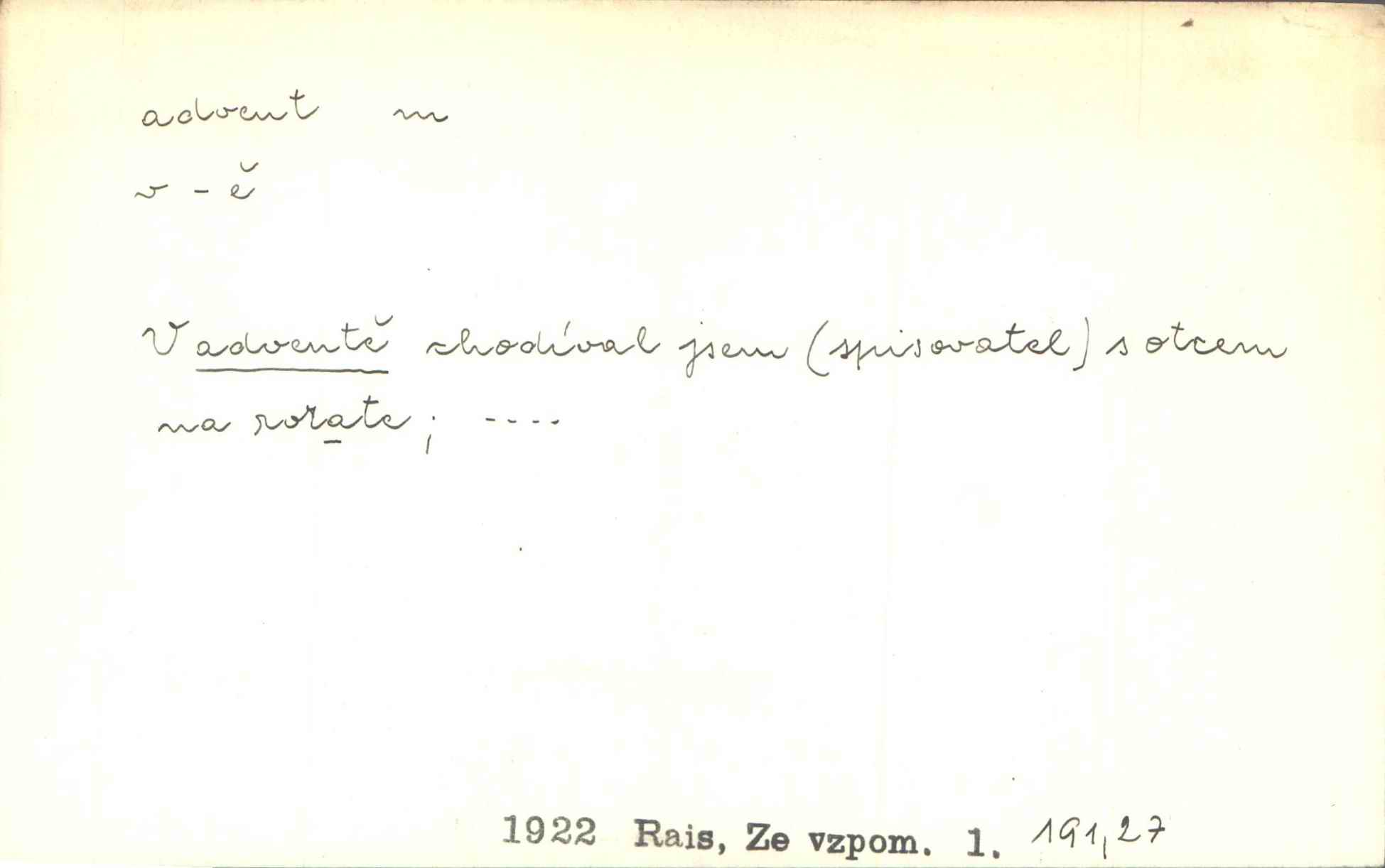- advent, -u m. círk. doba čtyř neděl před vánocemi, doba předvánoční. V adventě jsem chodíval s otcem na rorate. Rais. Přen. Oč potom budou krásnější vzpomínky na onen čas očekávání a doufání, na onen advent lásky! Wojk.