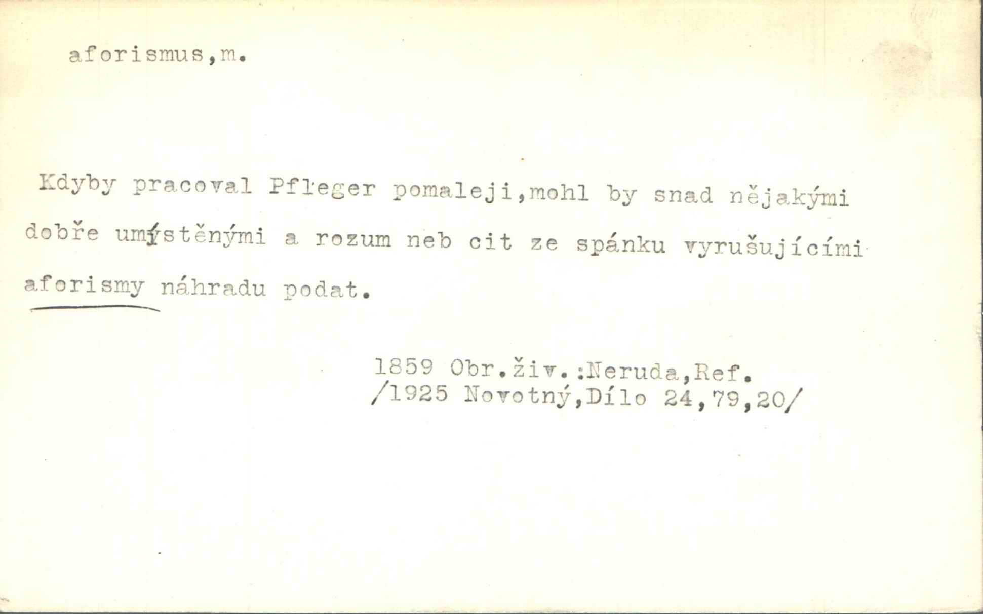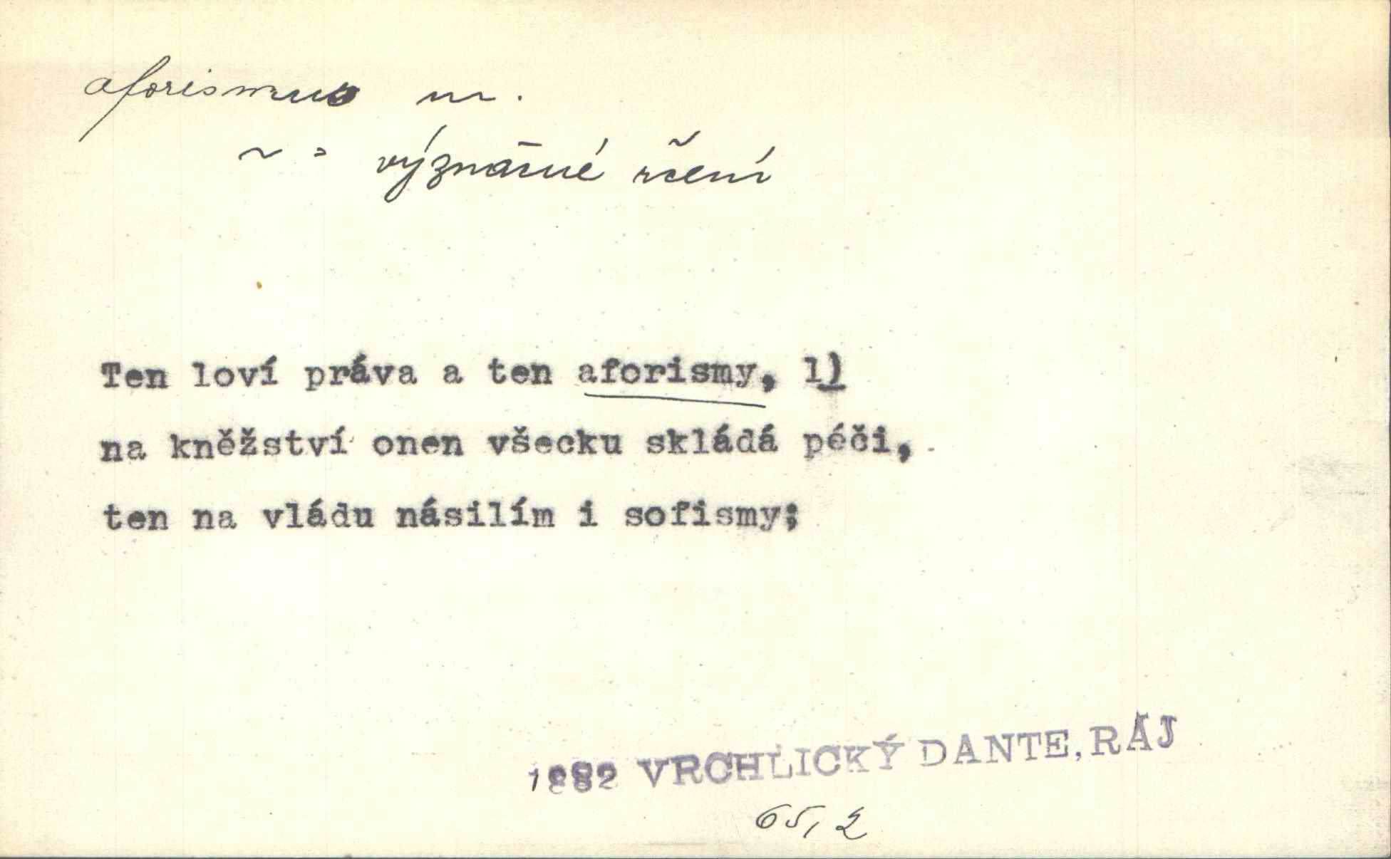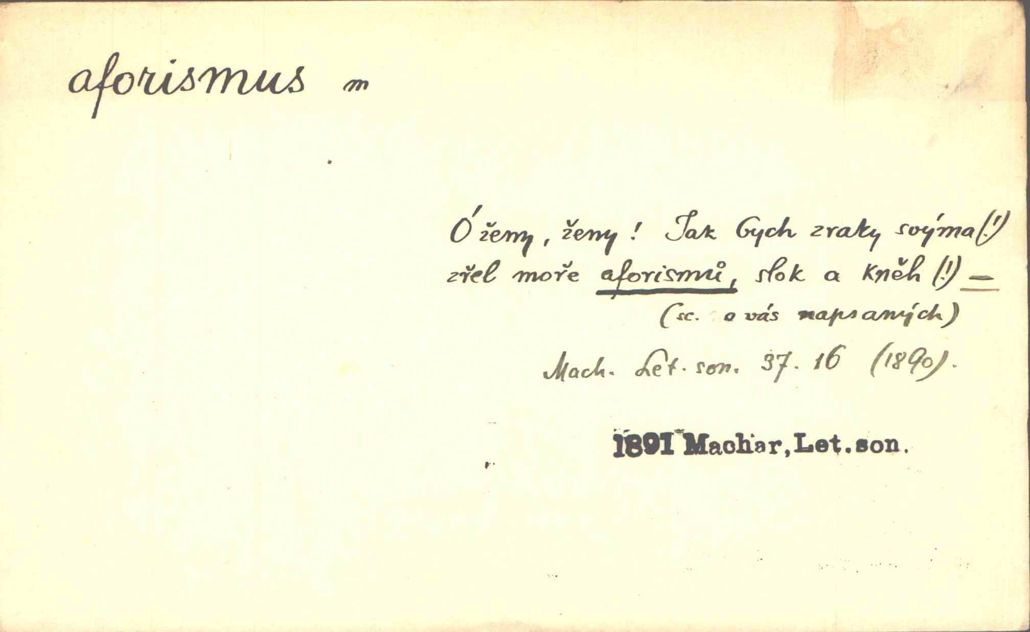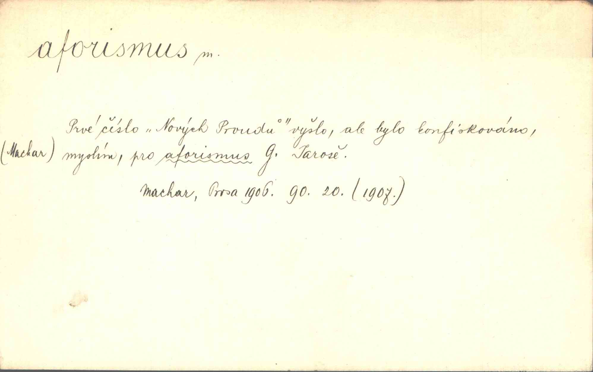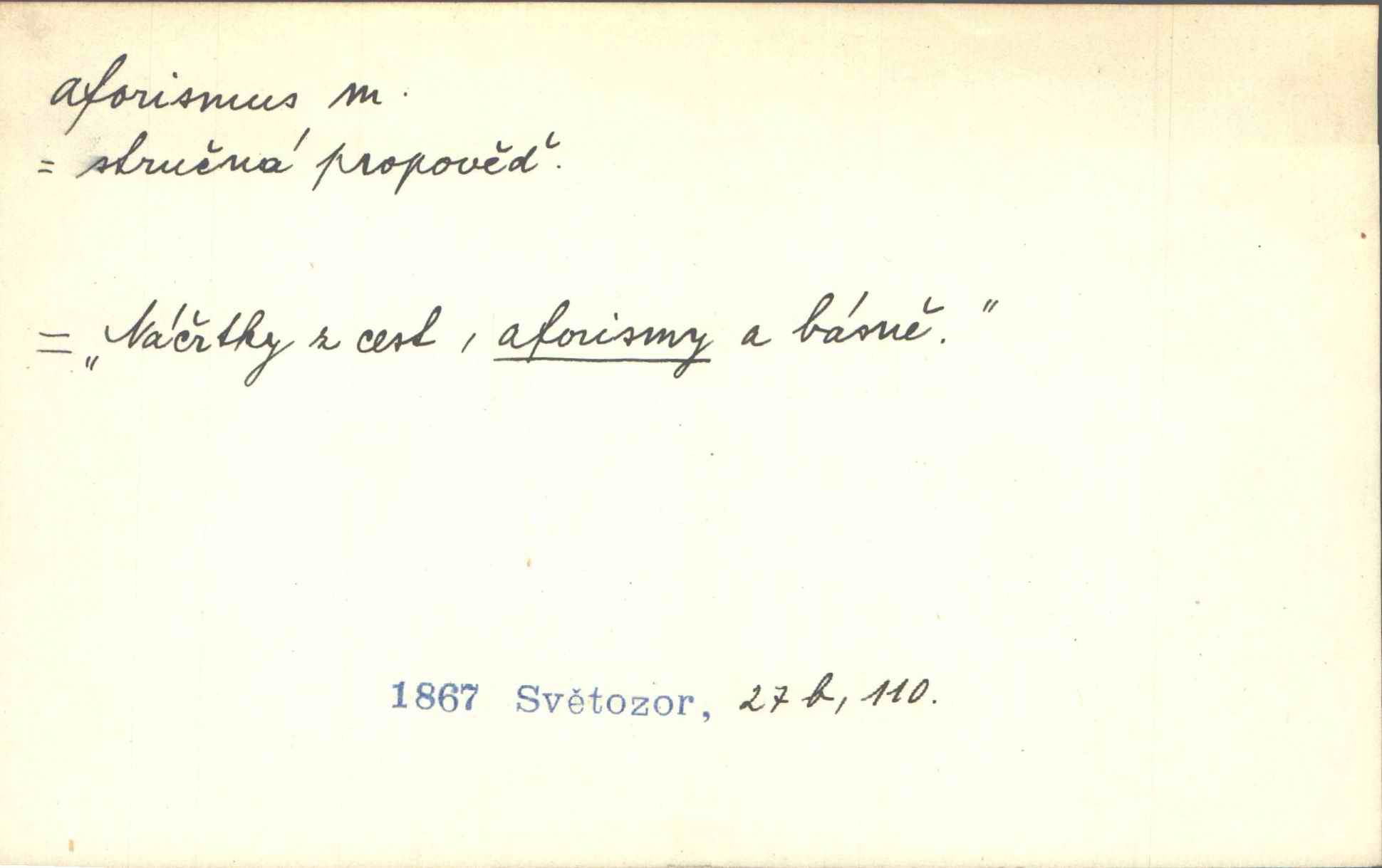 - aforismus, aforism, -ismu m. stručná, jadrná propověď obsahující vtipnou myšlenku. Vzpomněl jsem si v tu chvíli na aforismus, který jsem četl na první stránce nové knihy: „Jsou lži, jimiž možno prokázati ohromná dobrodiní.“ Kronb.„Také nejíš pomeranče se slupkou, docela jako já!“ A pan Frey se zasmál svému aforismu Čap. Ch. Aforismus filosofický, politický atd.