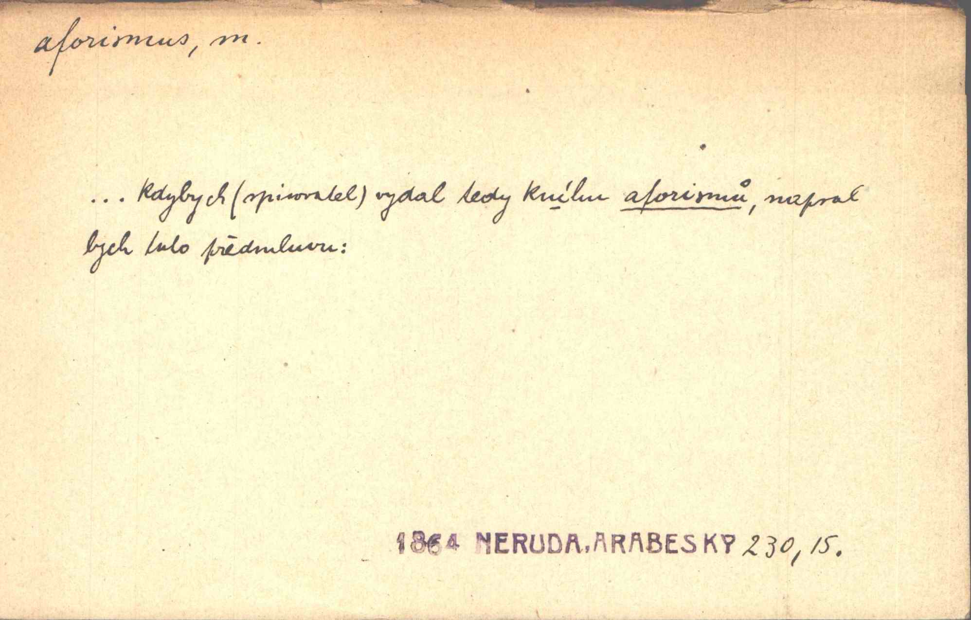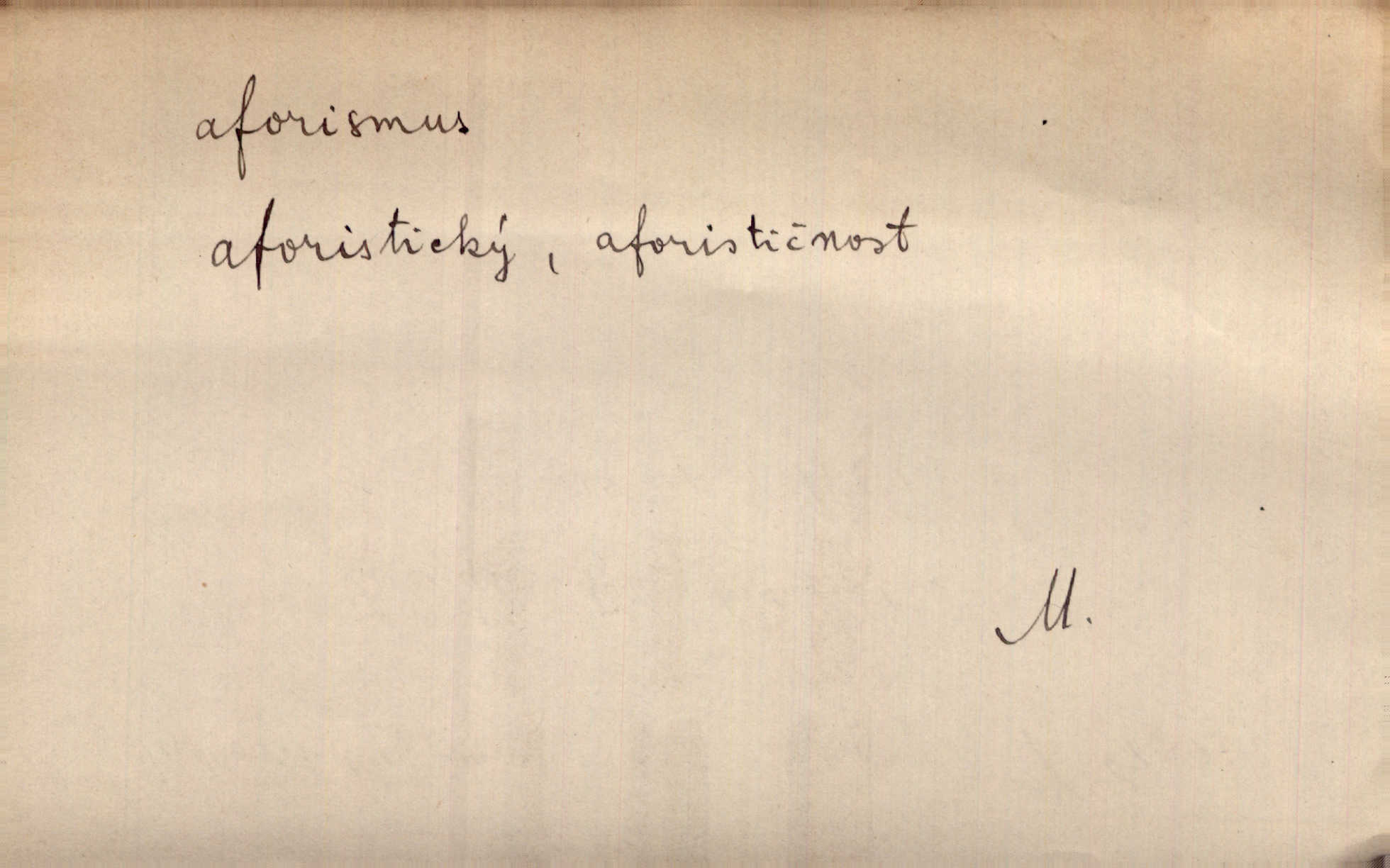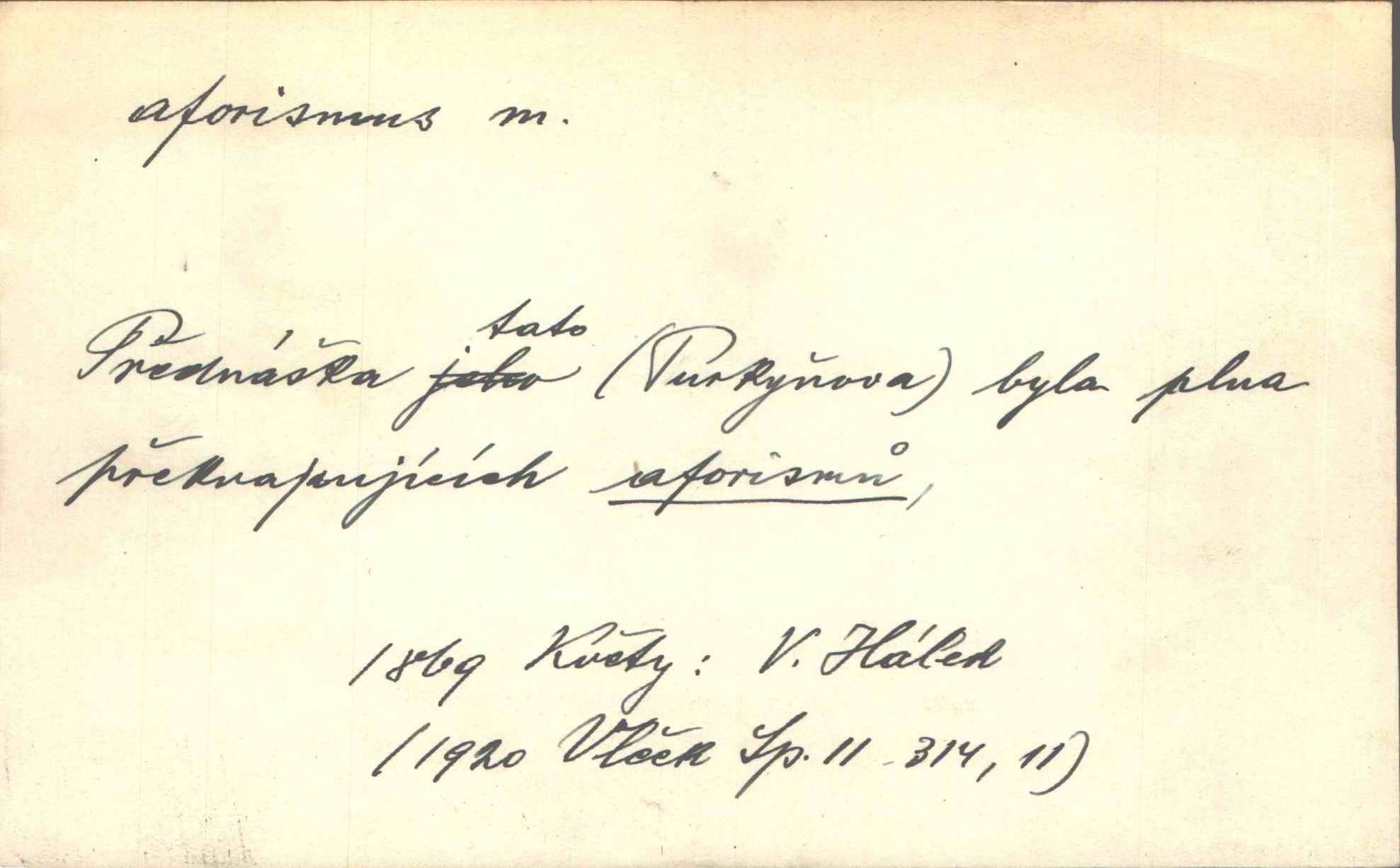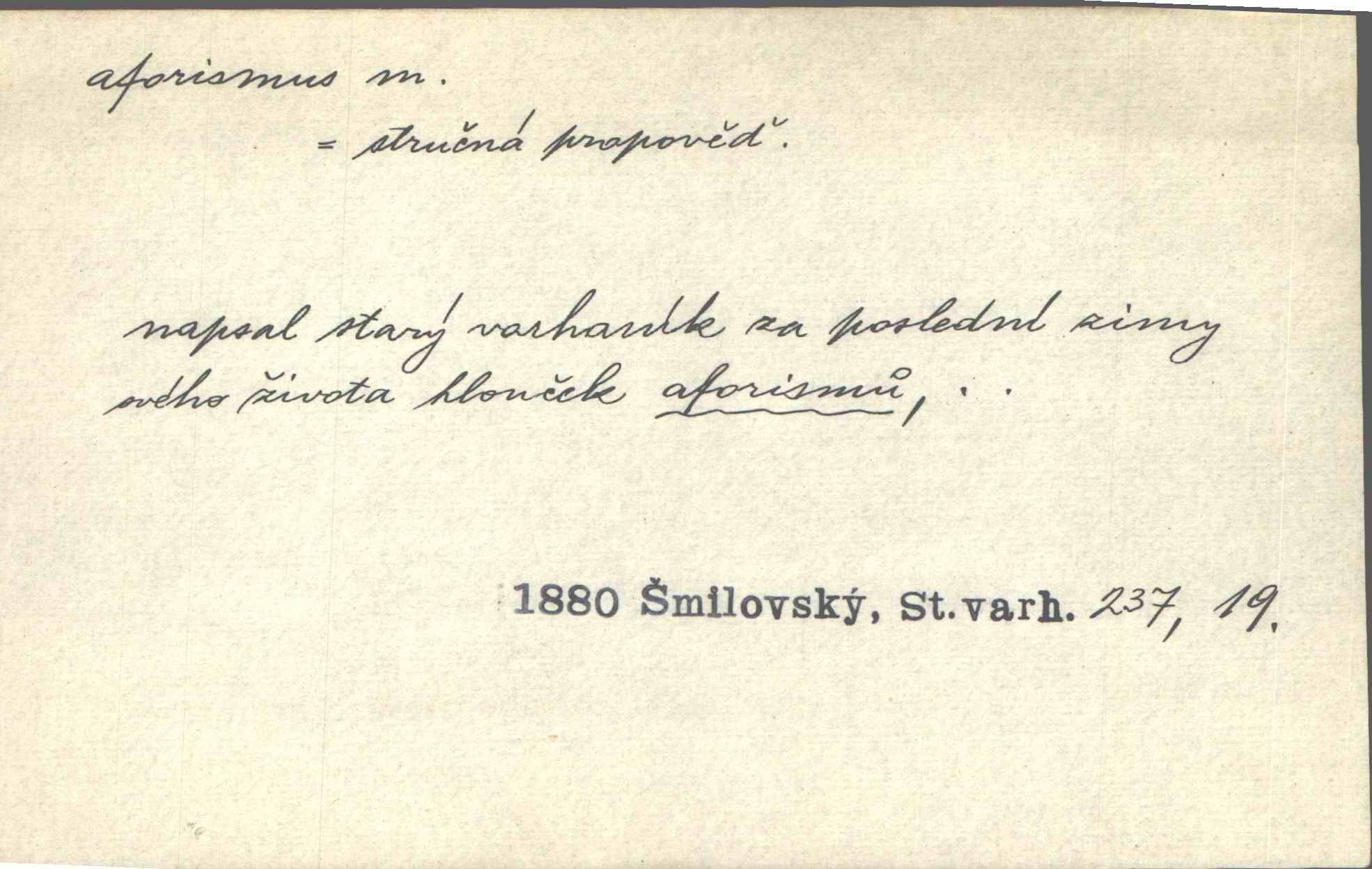 - aforismus, aforism, -ismu m. stručná, jadrná propověď obsahující vtipnou myšlenku. Vzpomněl jsem si v tu chvíli na aforismus, který jsem četl na první stránce nové knihy: „Jsou lži, jimiž možno prokázati ohromná dobrodiní.“ Kronb.„Také nejíš pomeranče se slupkou, docela jako já!“ A pan Frey se zasmál svému aforismu Čap. Ch. Aforismus filosofický, politický atd.