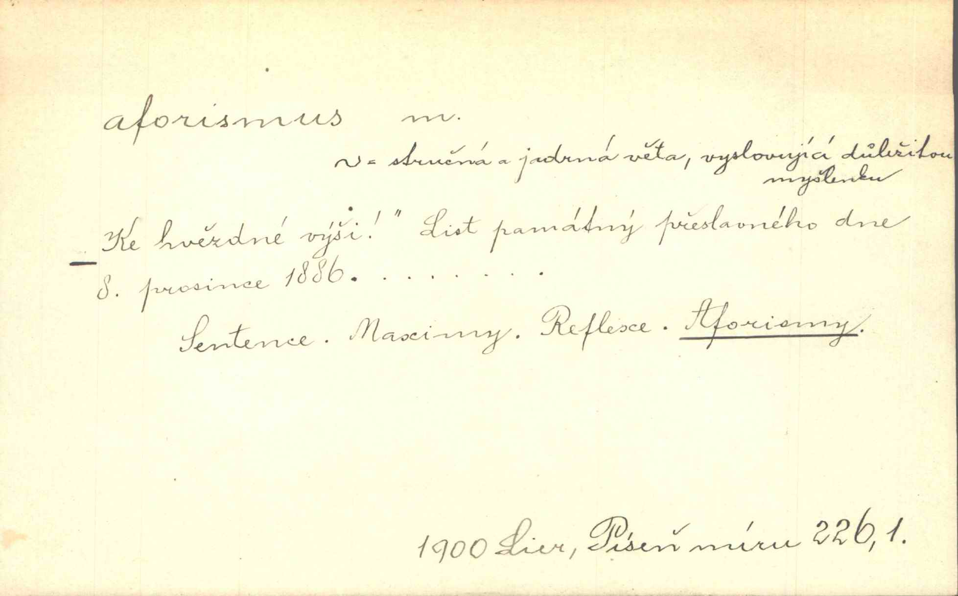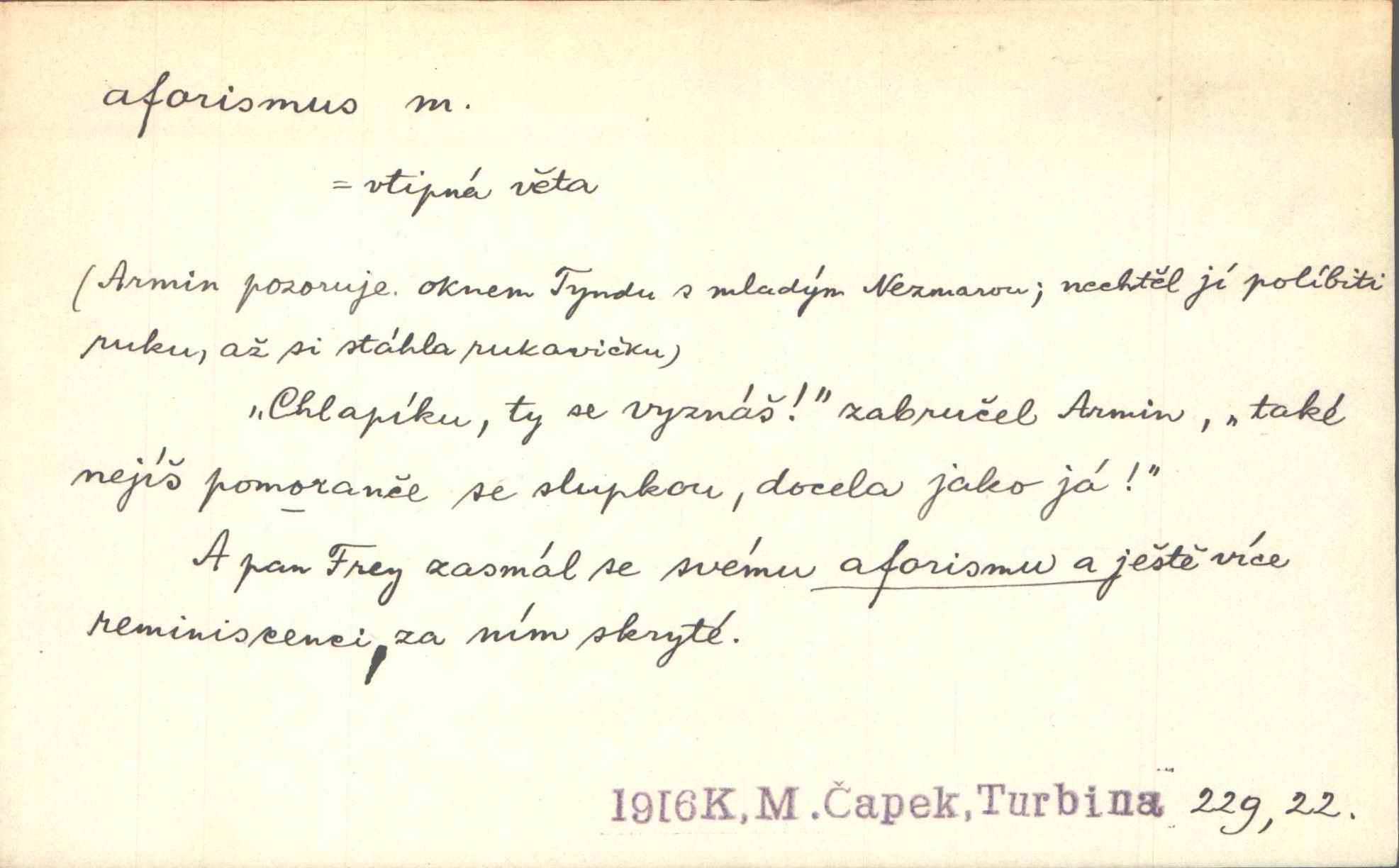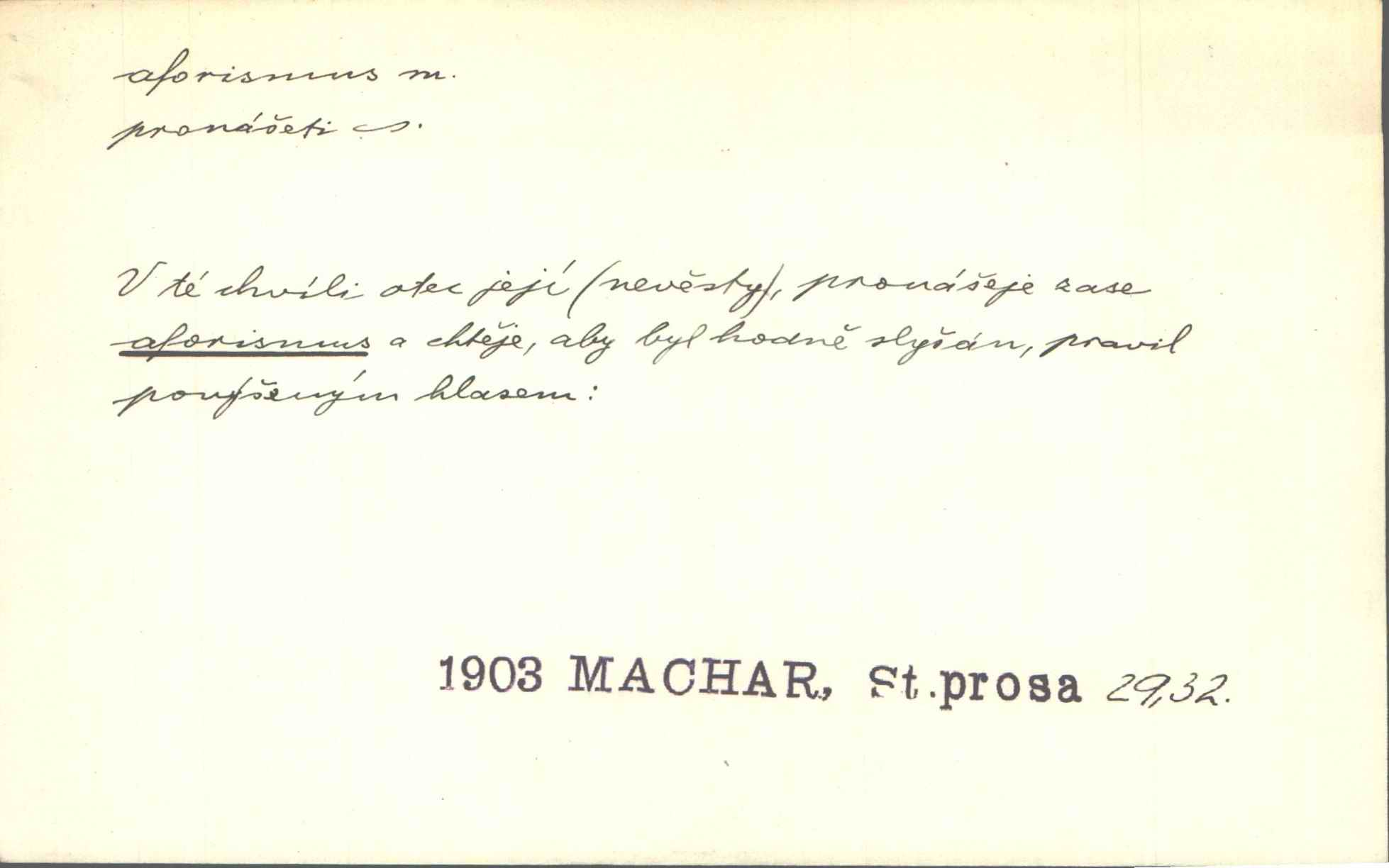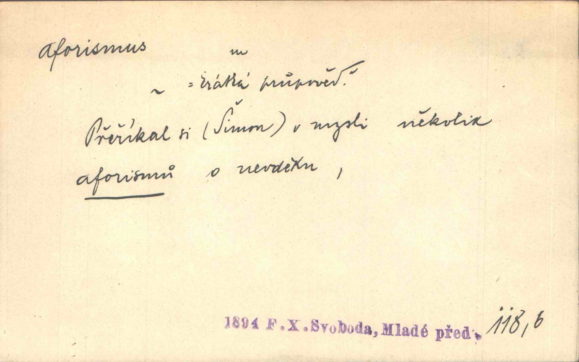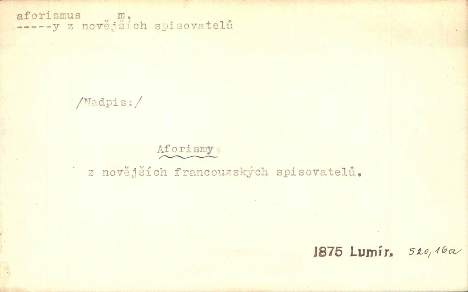- aforismus, aforism, -ismu m. stručná, jadrná propověď obsahující vtipnou myšlenku. Vzpomněl jsem si v tu chvíli na aforismus, který jsem četl na první stránce nové knihy: „Jsou lži, jimiž možno prokázati ohromná dobrodiní.“ Kronb.„Také nejíš pomeranče se slupkou, docela jako já!“ A pan Frey se zasmál svému aforismu Čap. Ch. Aforismus filosofický, politický atd.