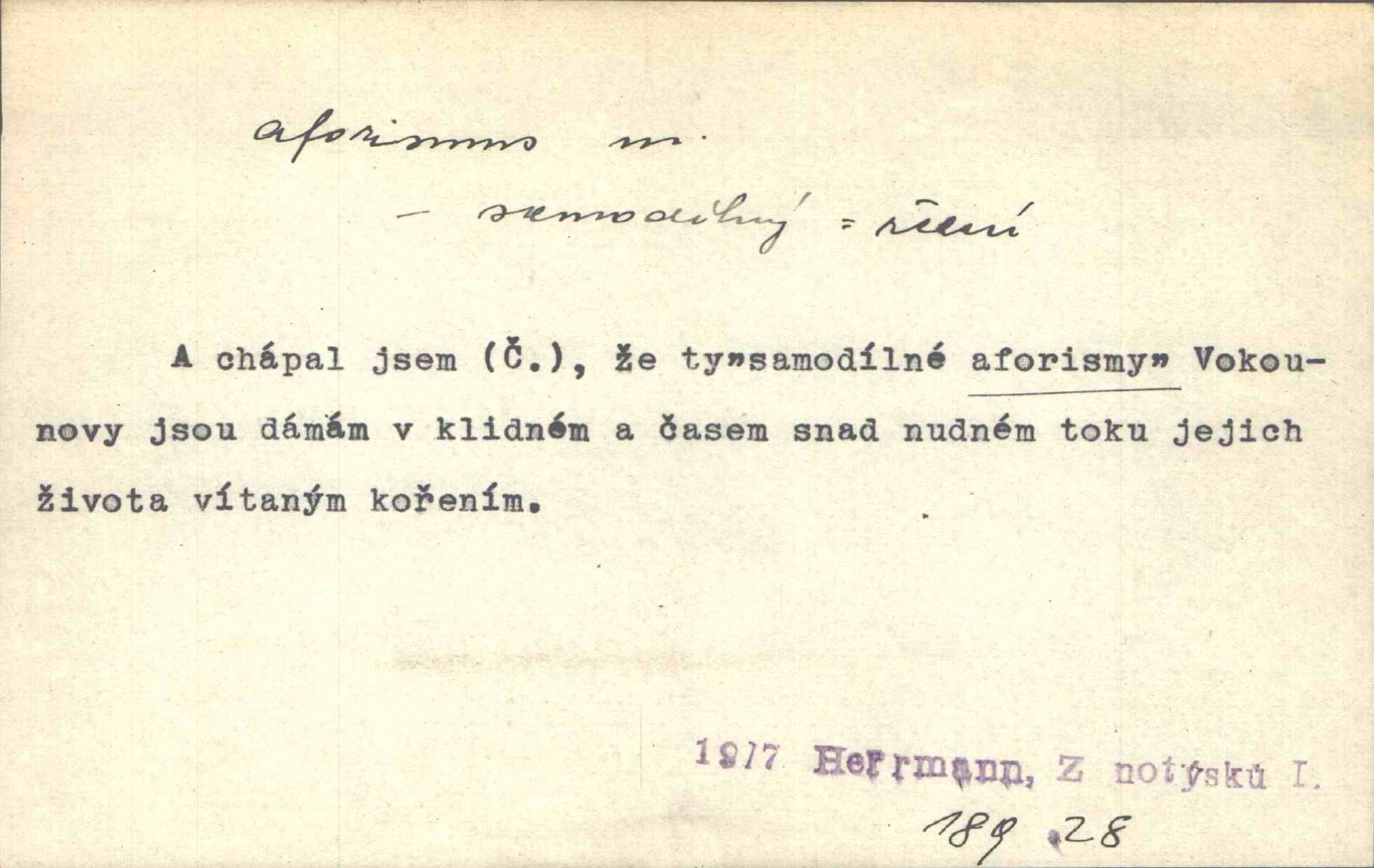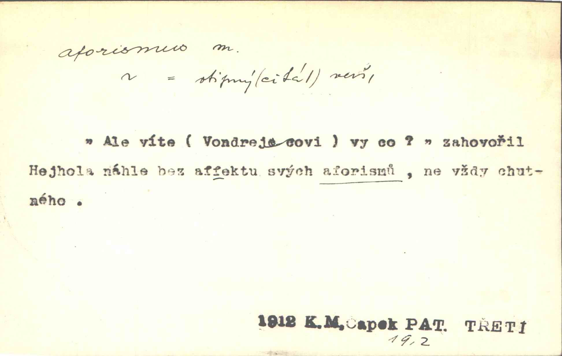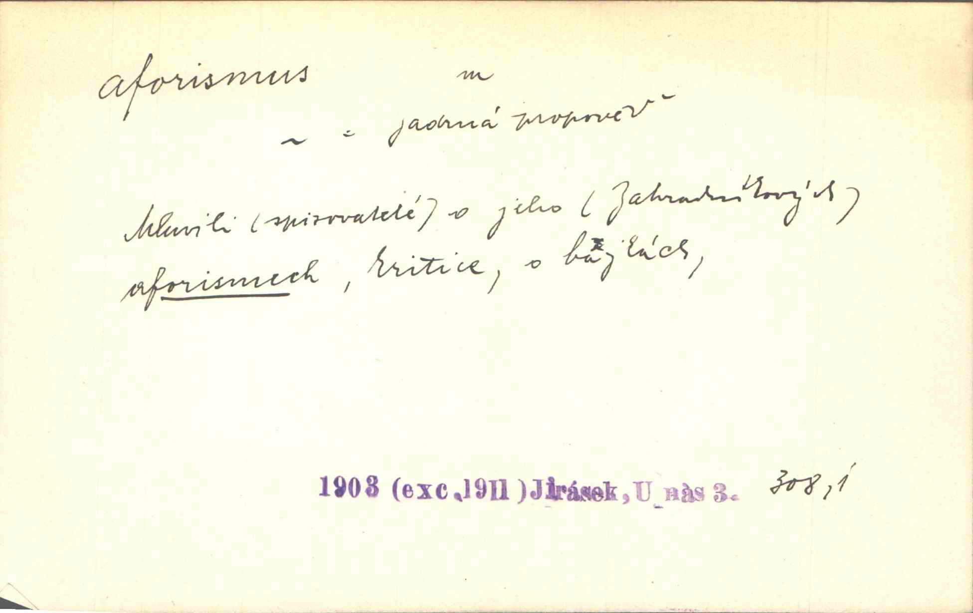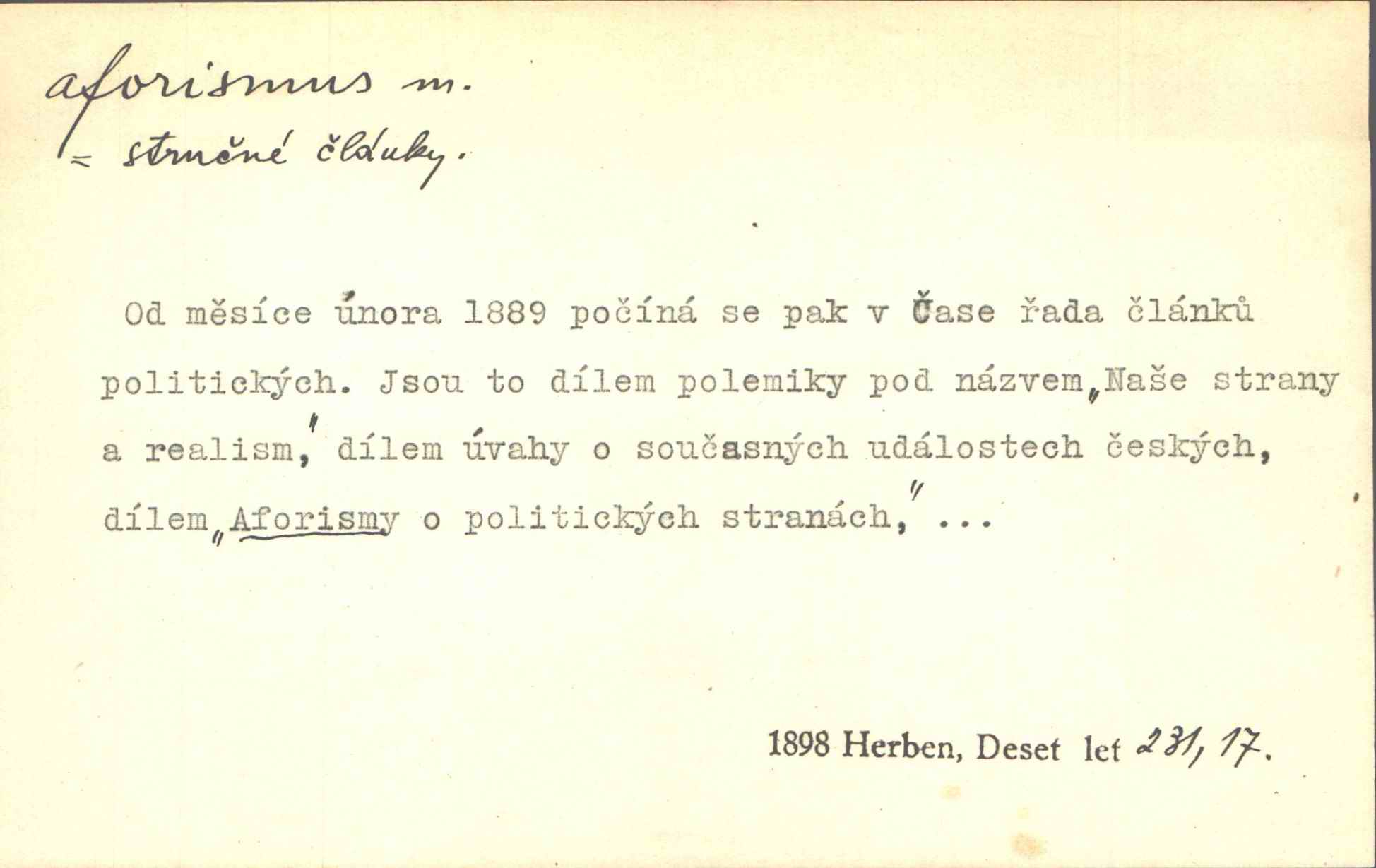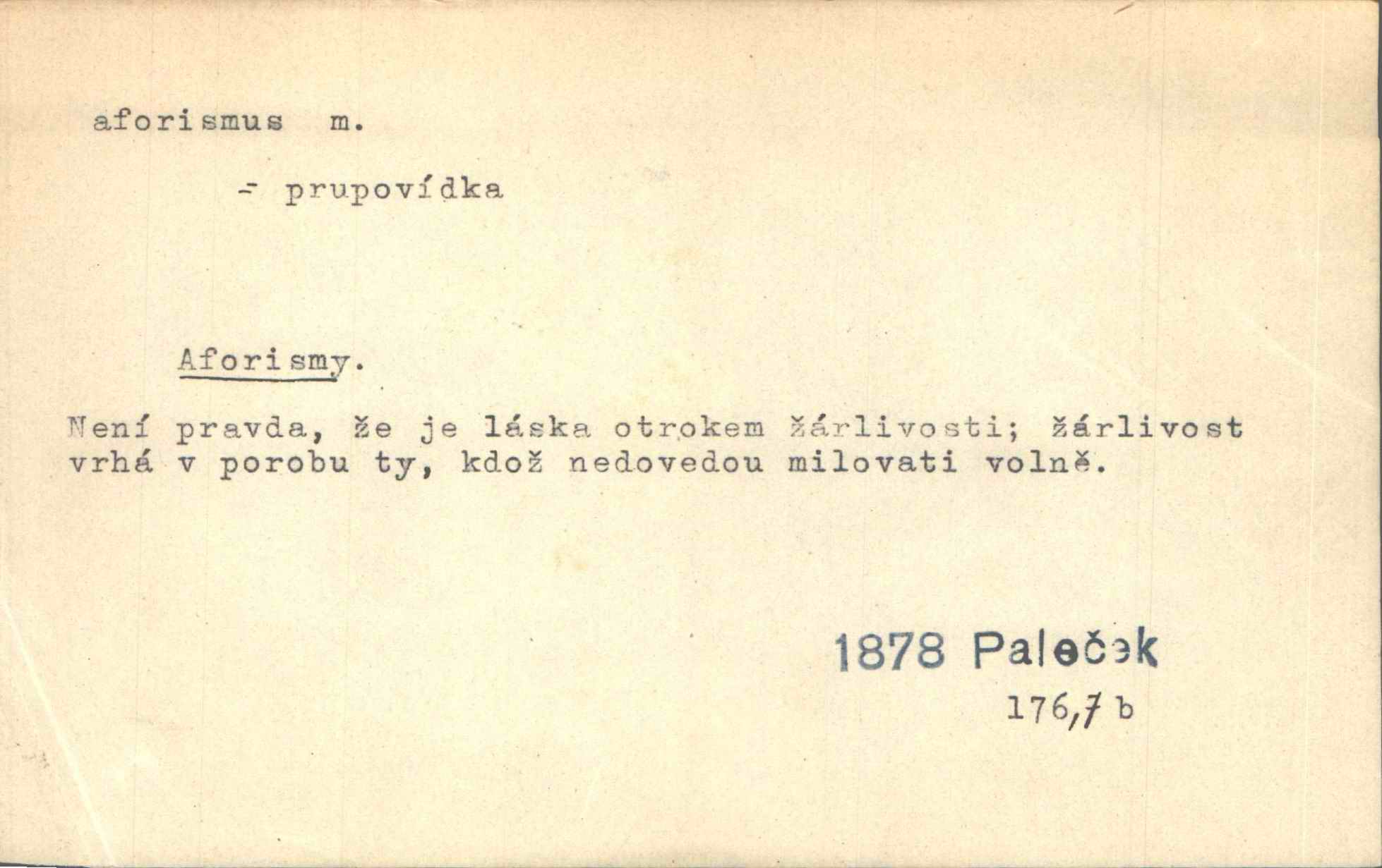 - aforismus, aforism, -ismu m. stručná, jadrná propověď obsahující vtipnou myšlenku. Vzpomněl jsem si v tu chvíli na aforismus, který jsem četl na první stránce nové knihy: „Jsou lži, jimiž možno prokázati ohromná dobrodiní.“ Kronb.„Také nejíš pomeranče se slupkou, docela jako já!“ A pan Frey se zasmál svému aforismu Čap. Ch. Aforismus filosofický, politický atd.
