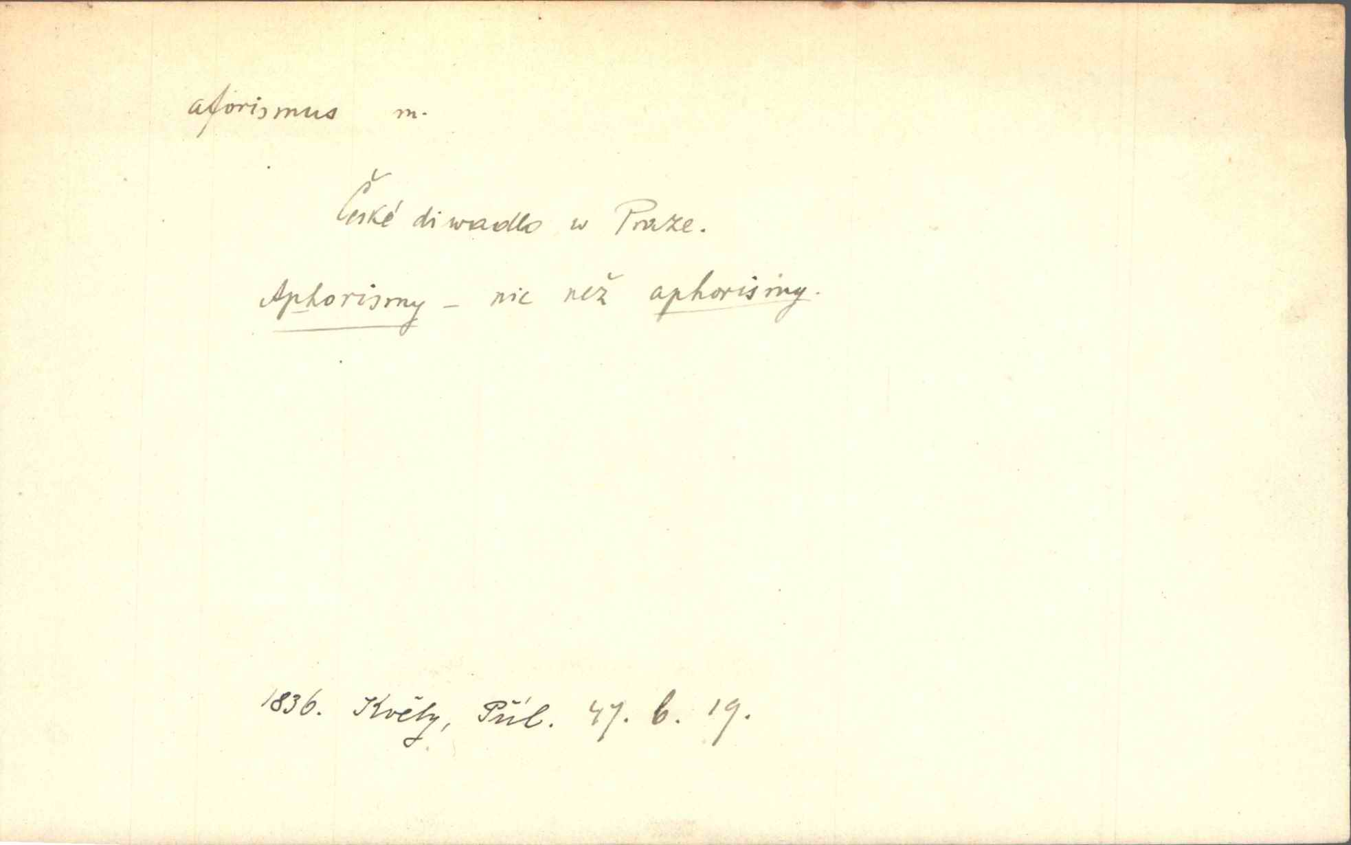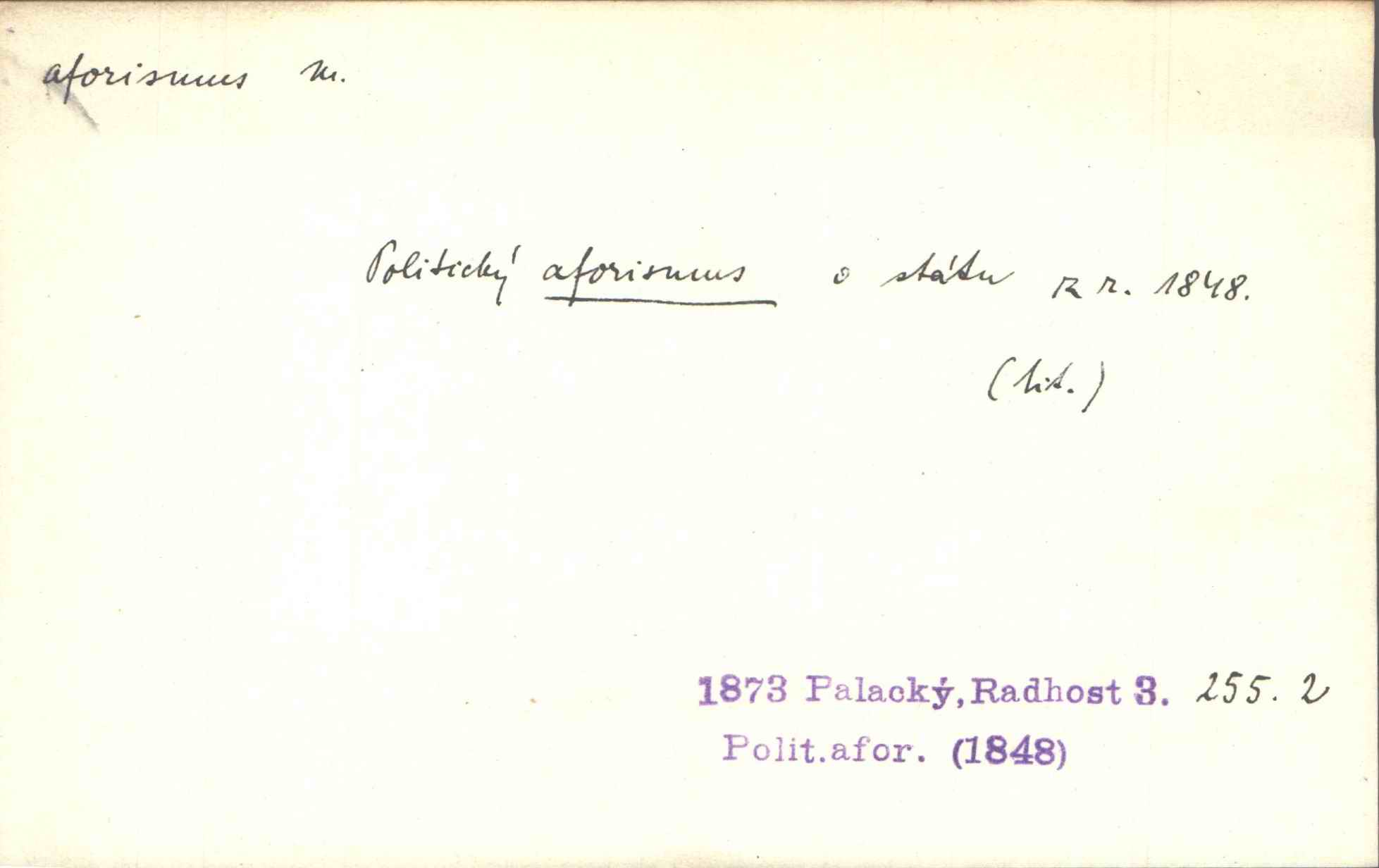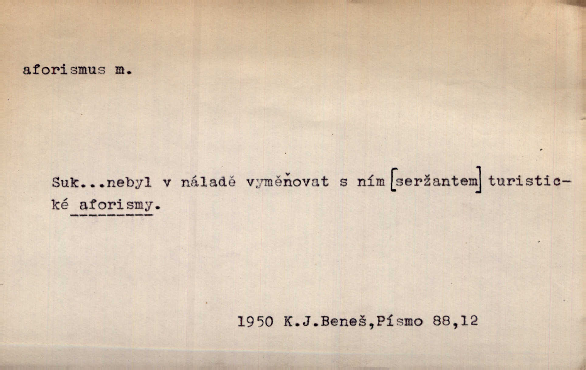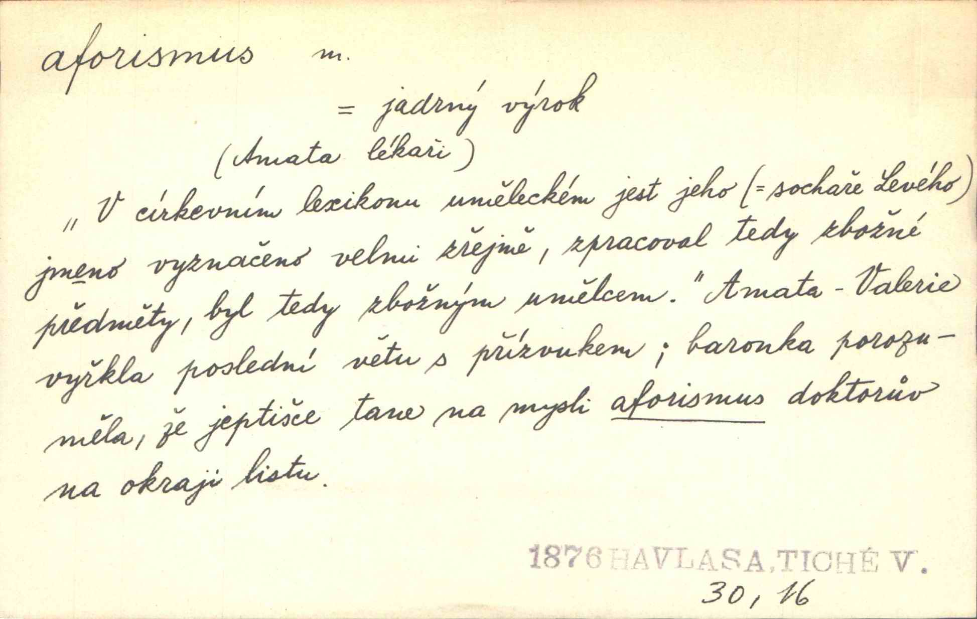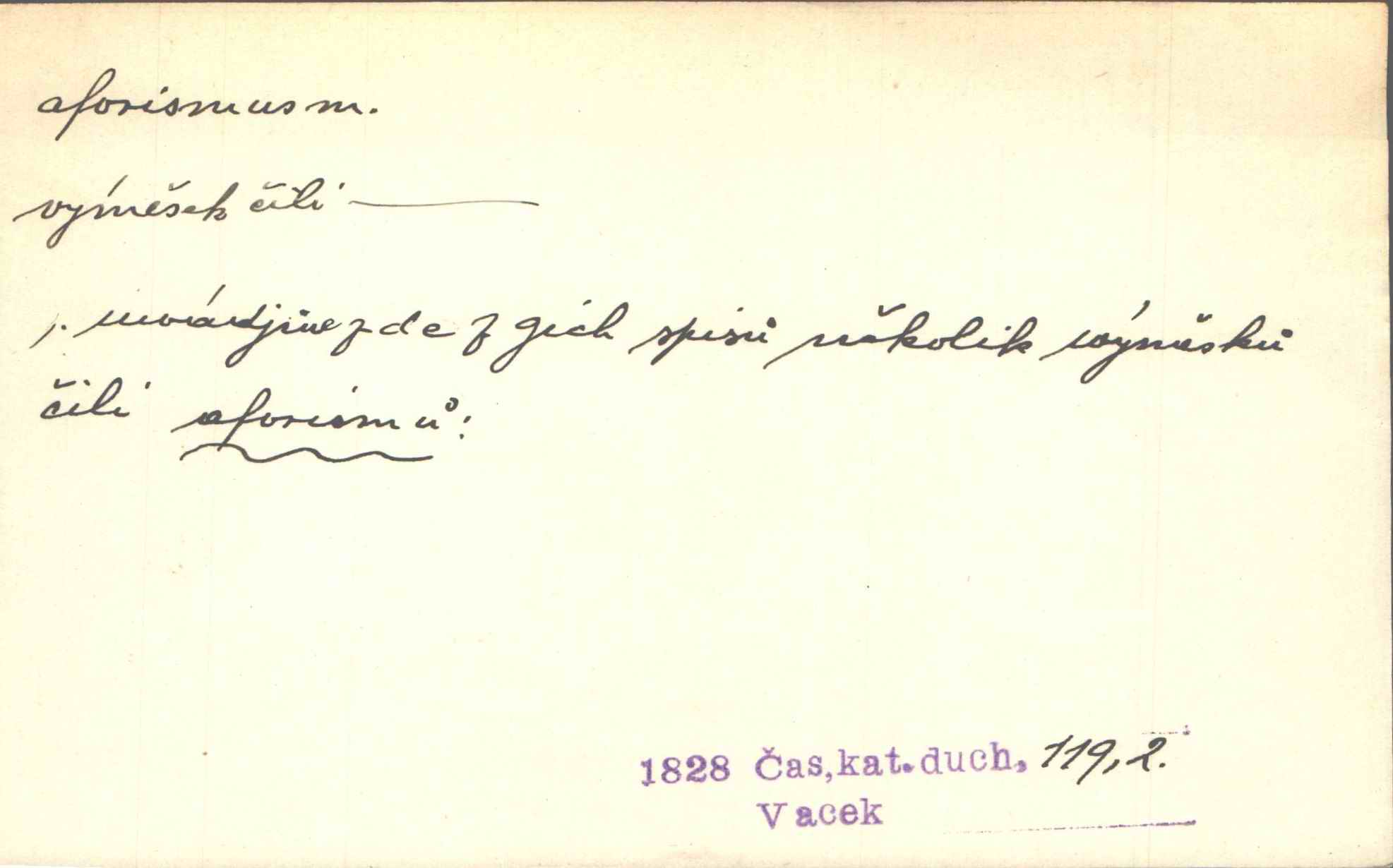 - aforismus, aforism, -ismu m. stručná, jadrná propověď obsahující vtipnou myšlenku. Vzpomněl jsem si v tu chvíli na aforismus, který jsem četl na první stránce nové knihy: „Jsou lži, jimiž možno prokázati ohromná dobrodiní.“ Kronb.„Také nejíš pomeranče se slupkou, docela jako já!“ A pan Frey se zasmál svému aforismu Čap. Ch. Aforismus filosofický, politický atd.