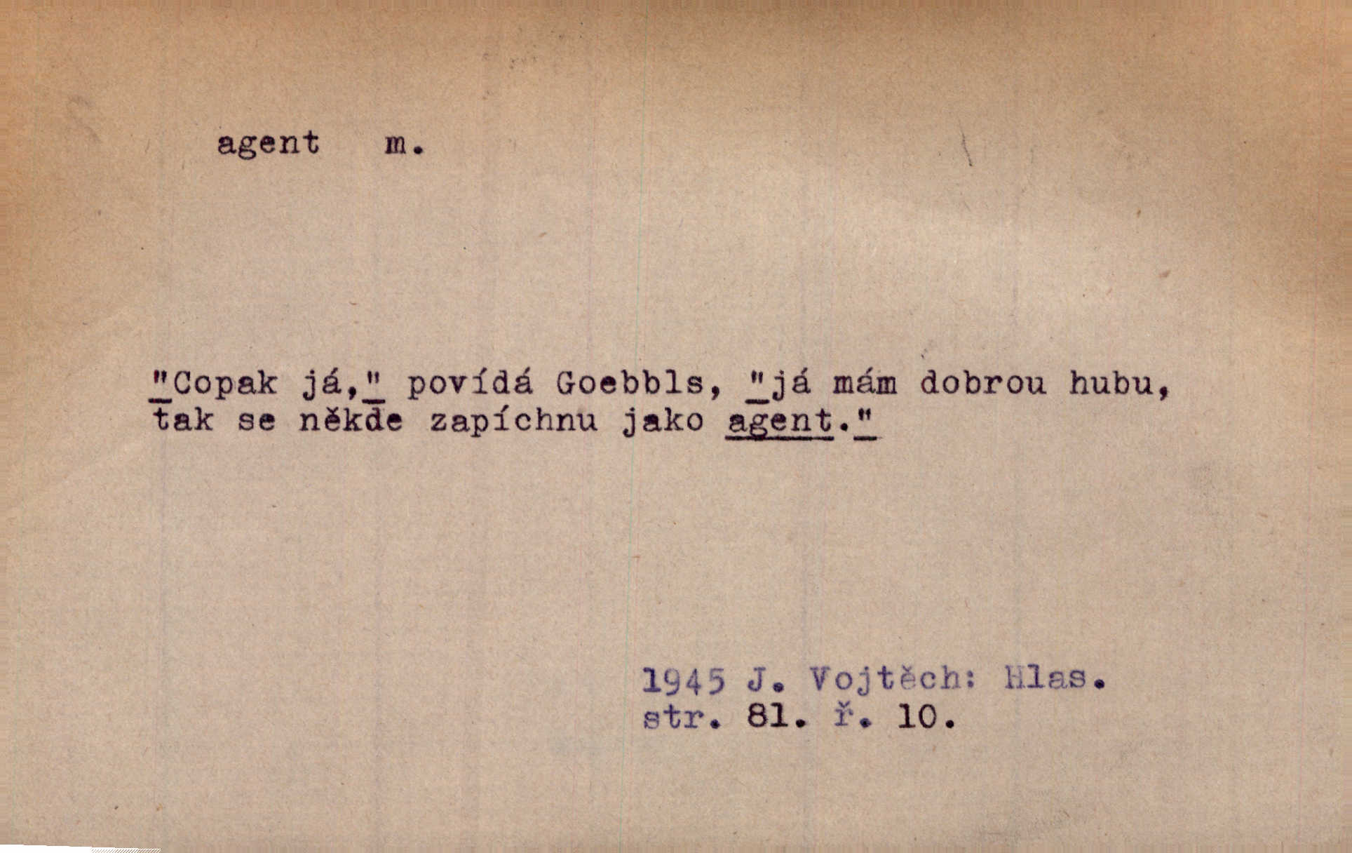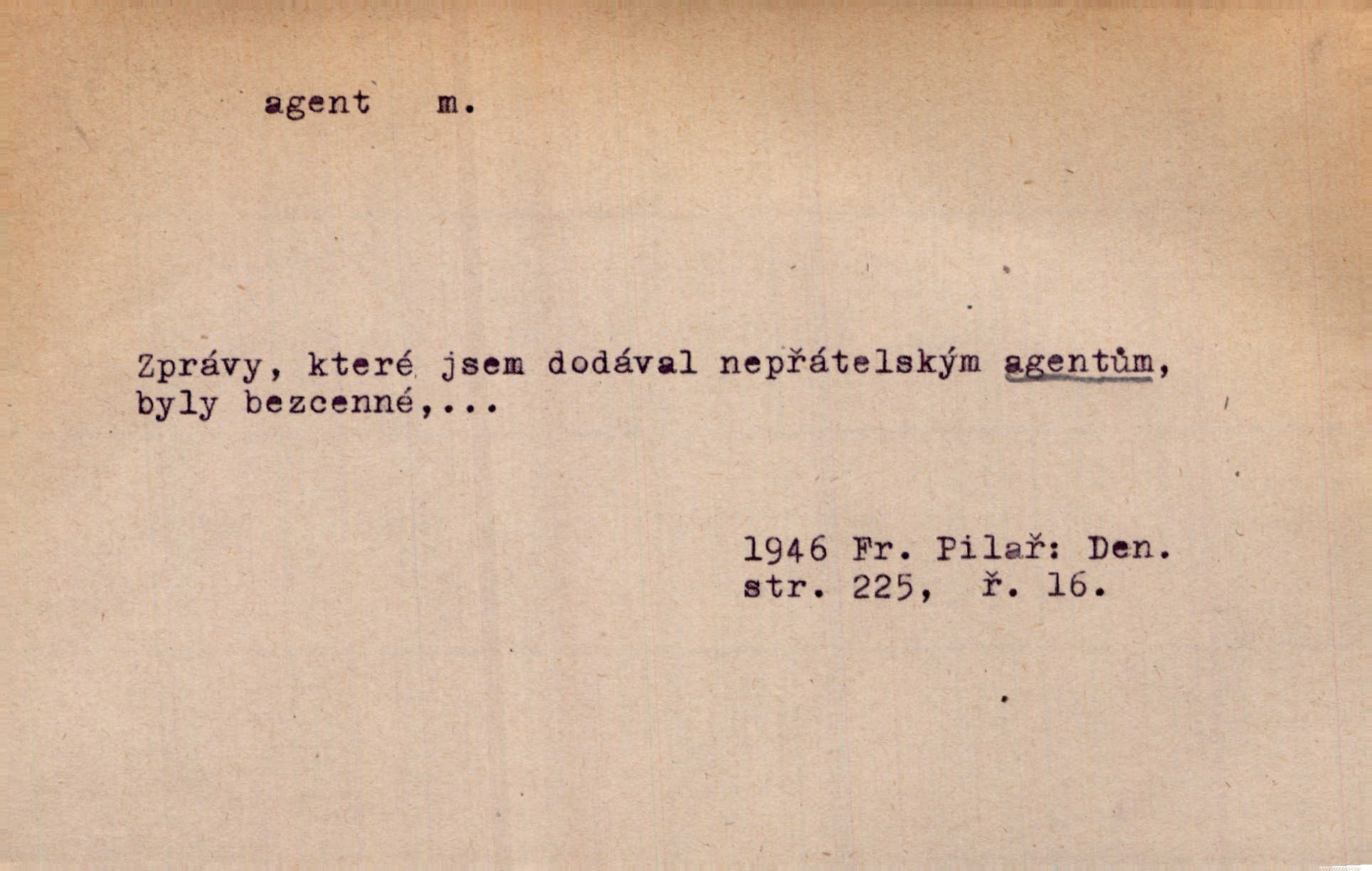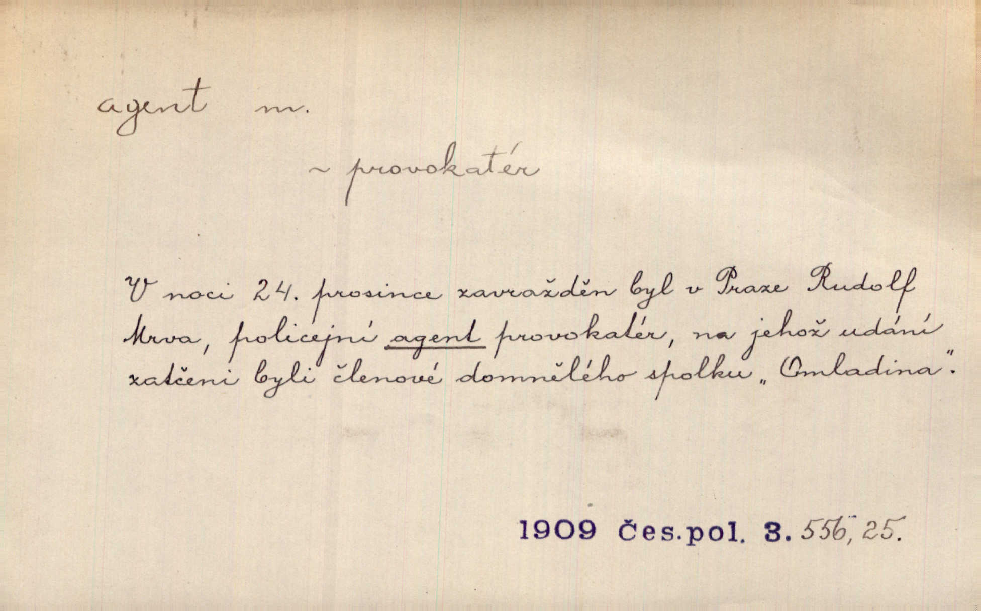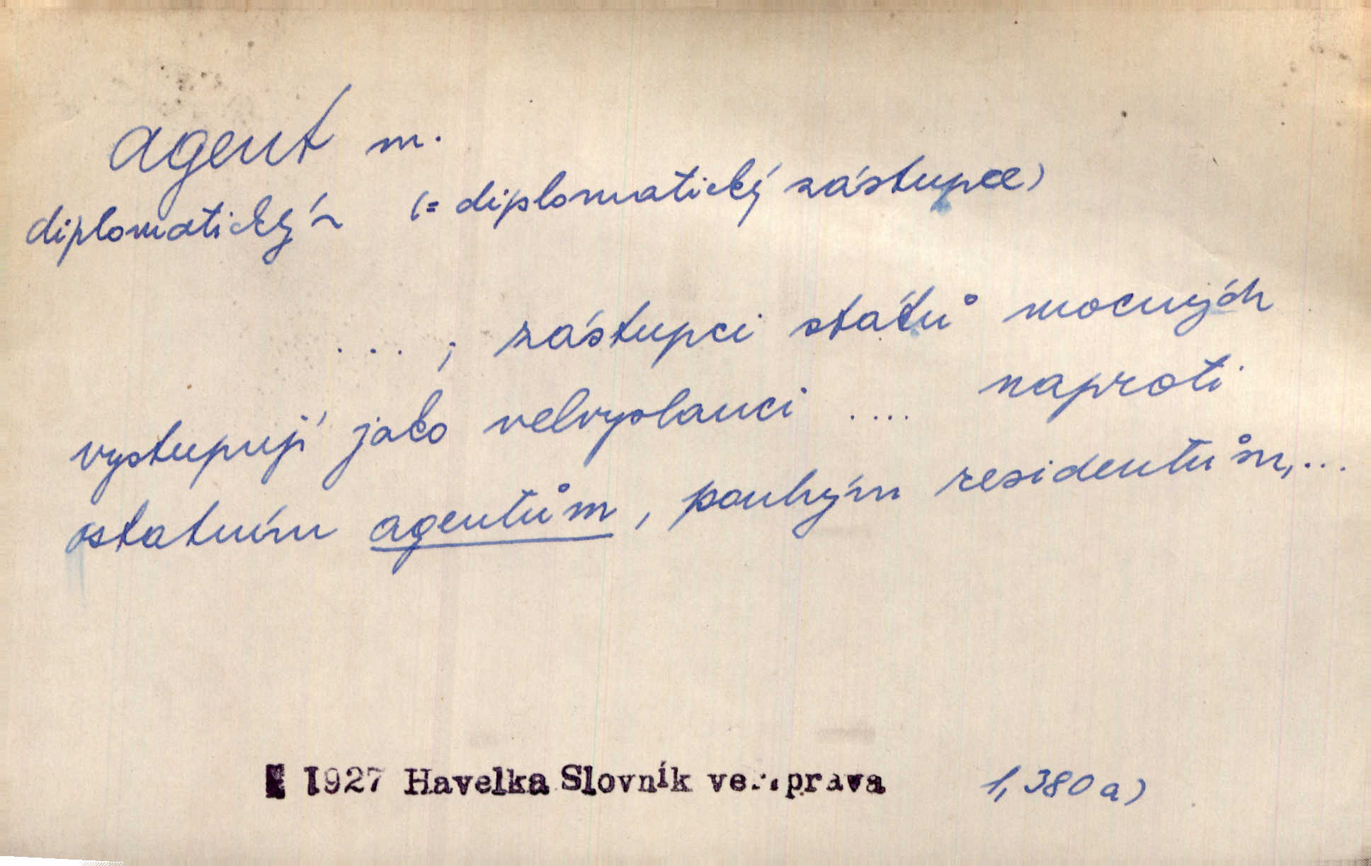 - agent, -a m. obch. jednatel, cestující, zástupce. Podle kufříku mohl to býti starší agent nějaké nebohaté firmy. Vlč. D Polit. náhončí, agitátor. Nejvíce popichují lid cizí agenti s francouzskými penězi. Jir. Agent provokatér udavač, vtírající se v důvěru osob veřejně činných nebo podněcující davy k trestným činům. D Spec. policejní agent člen sboru neuniformované stráže bezpečnosti, tajný policista. Zkušený policejní agent pozná mezi tisíci pořádných lidí jednoho darebáka. Thom.