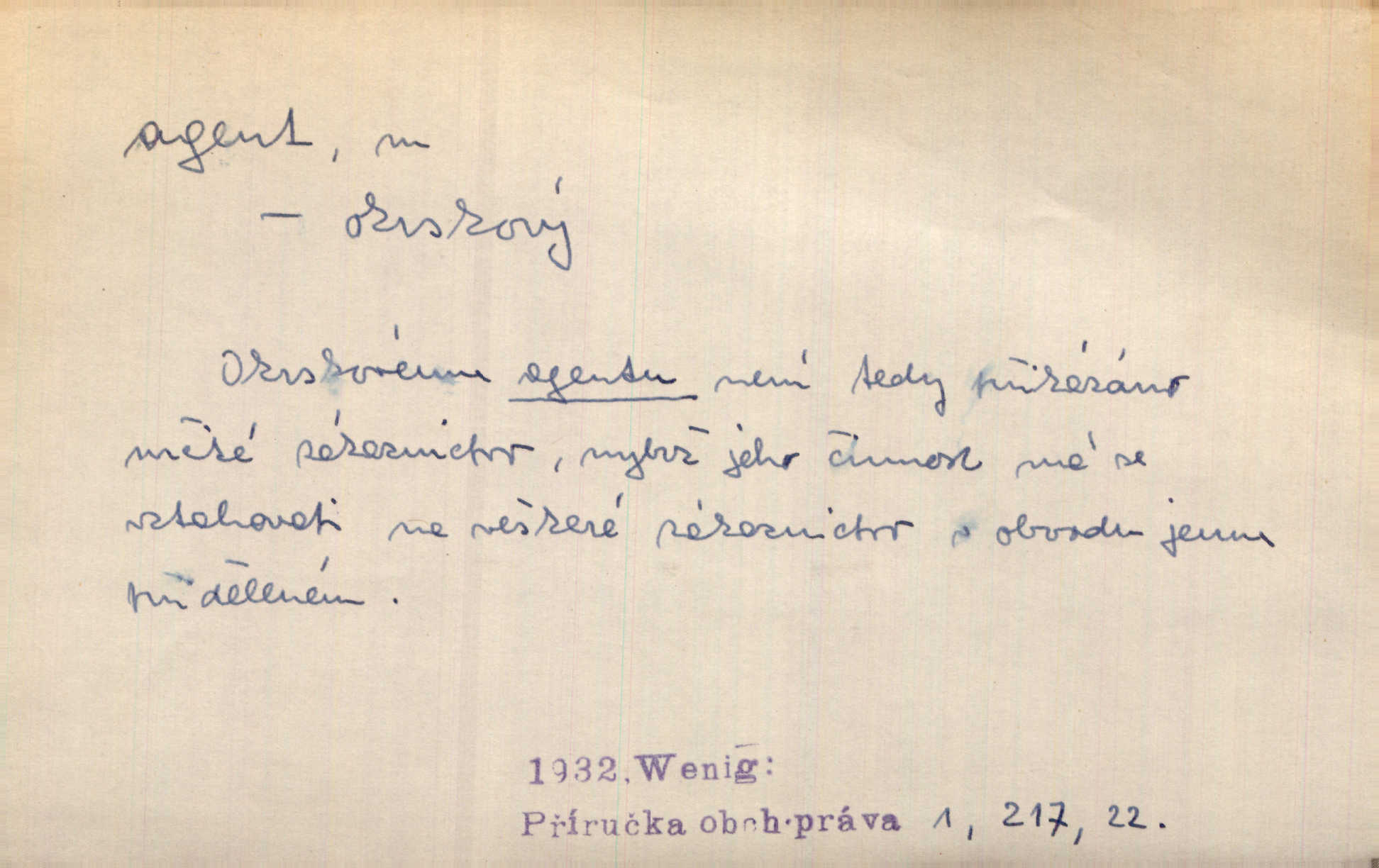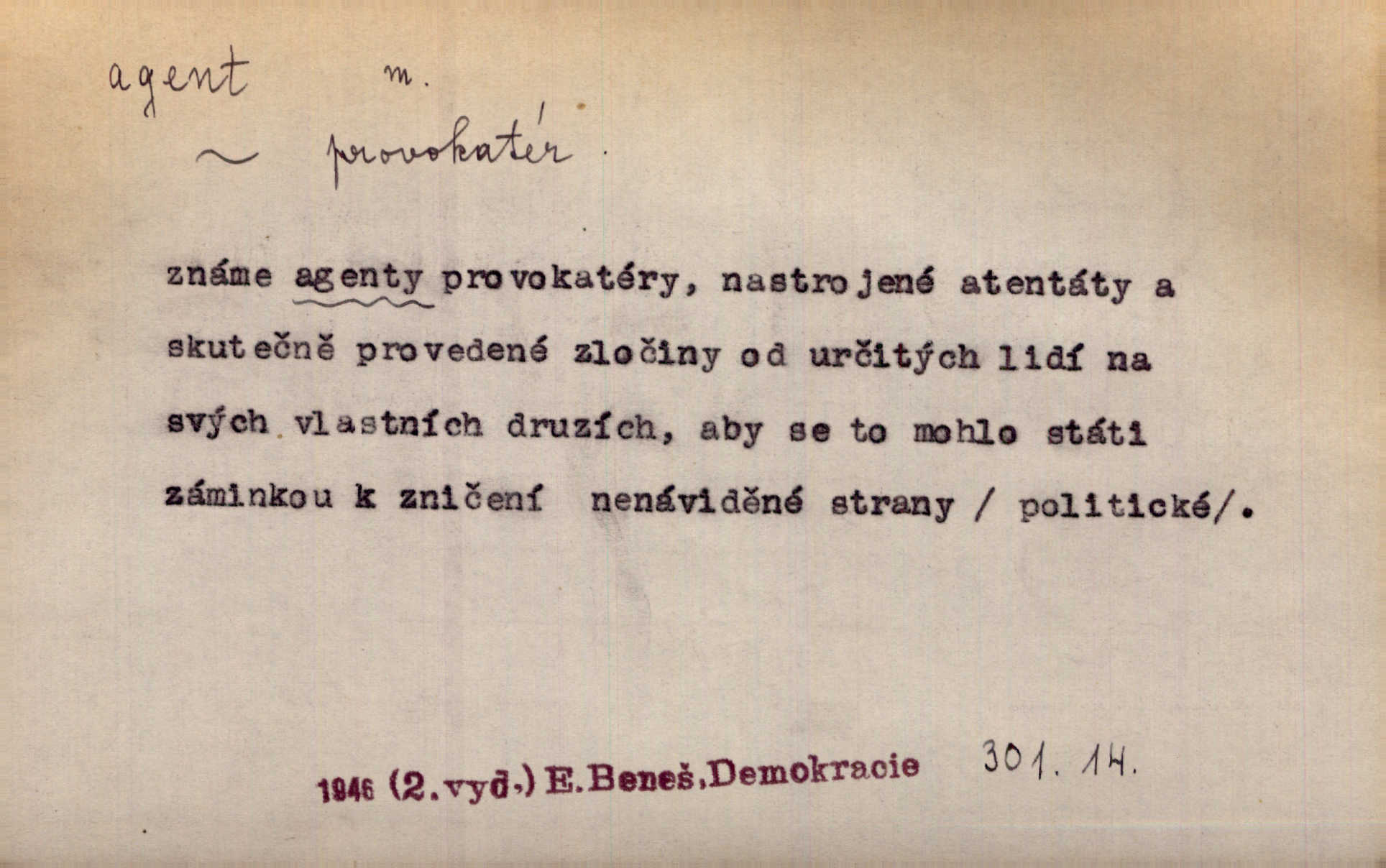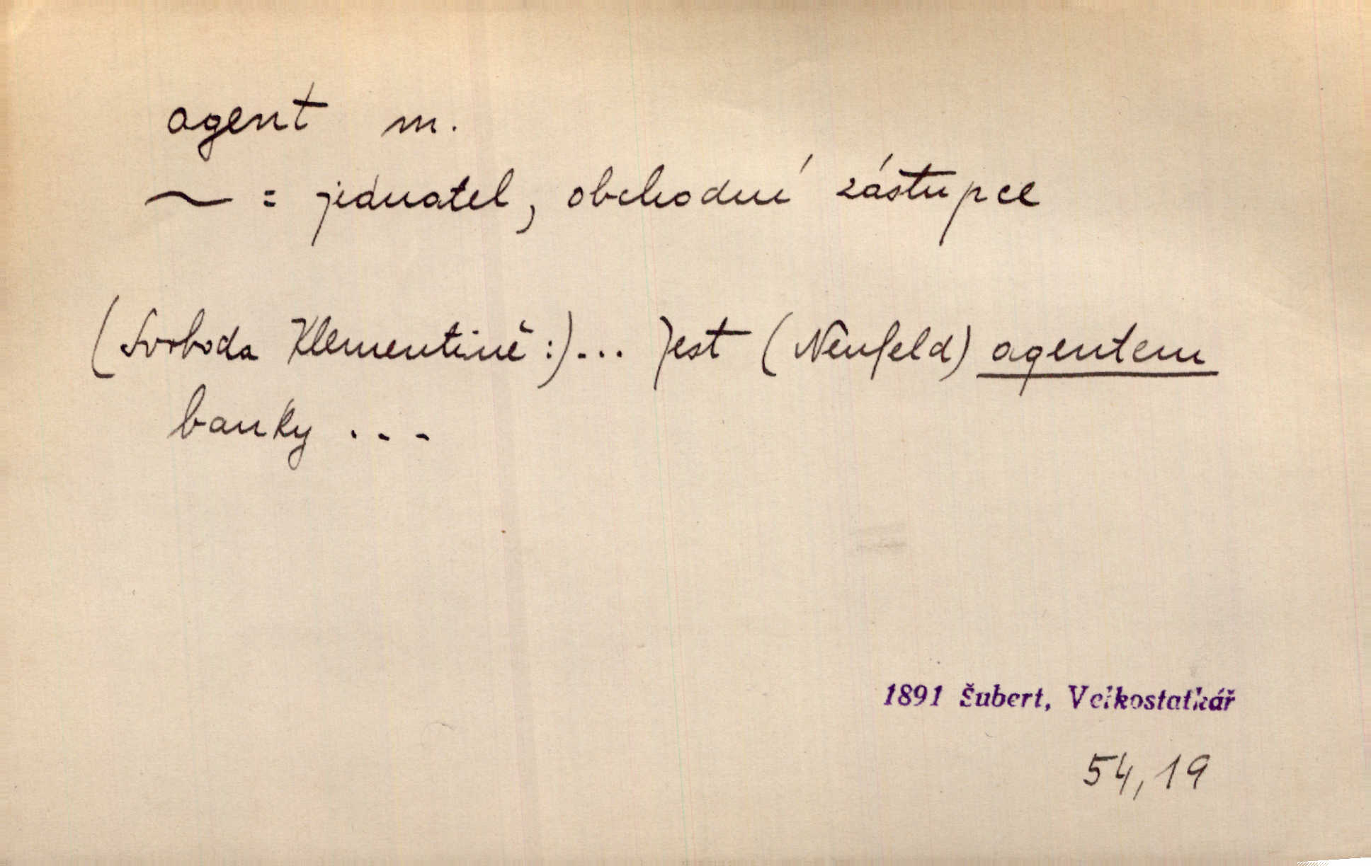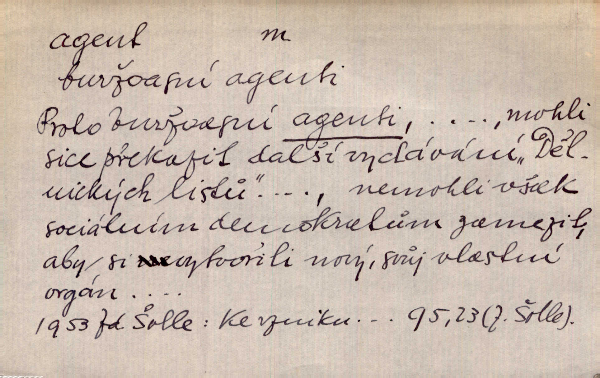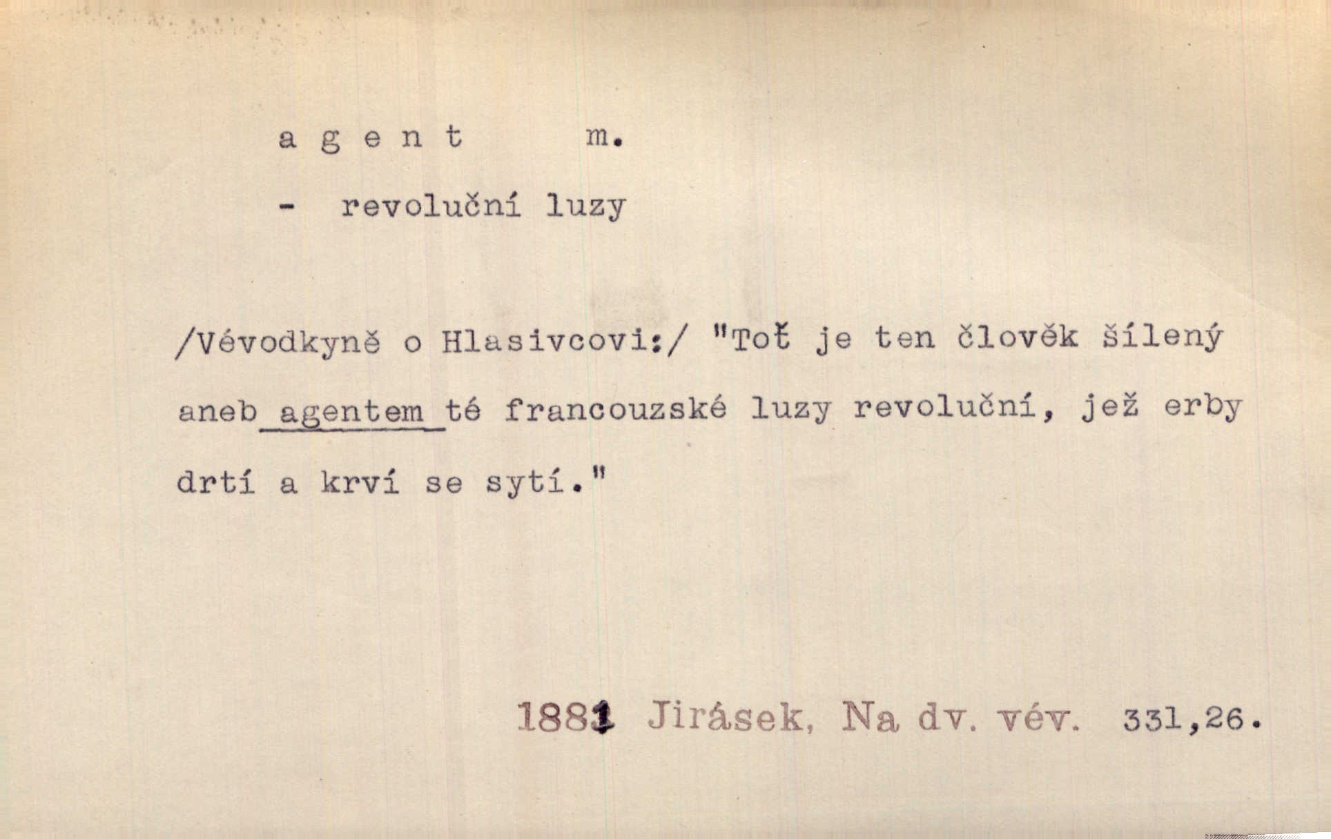- agent, -a m. obch. jednatel, cestující, zástupce. Podle kufříku mohl to býti starší agent nějaké nebohaté firmy. Vlč. D Polit. náhončí, agitátor. Nejvíce popichují lid cizí agenti s francouzskými penězi. Jir. Agent provokatér udavač, vtírající se v důvěru osob veřejně činných nebo podněcující davy k trestným činům. D Spec. policejní agent člen sboru neuniformované stráže bezpečnosti, tajný policista. Zkušený policejní agent pozná mezi tisíci pořádných lidí jednoho darebáka. Thom.