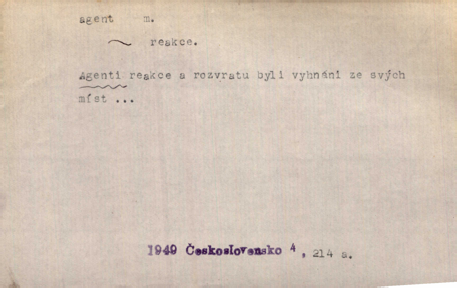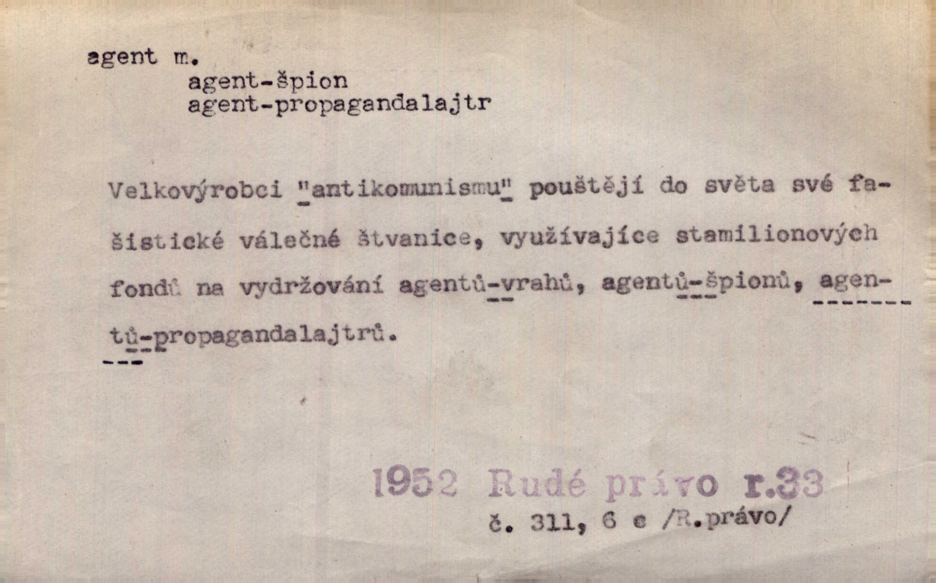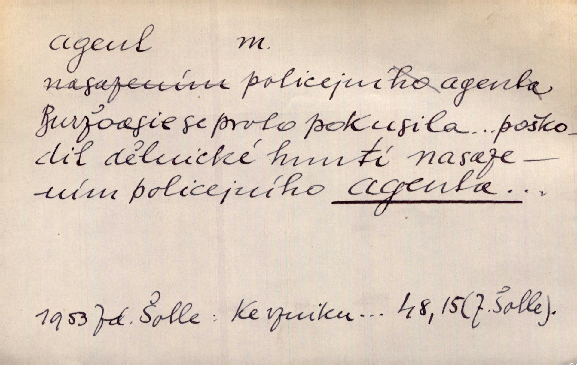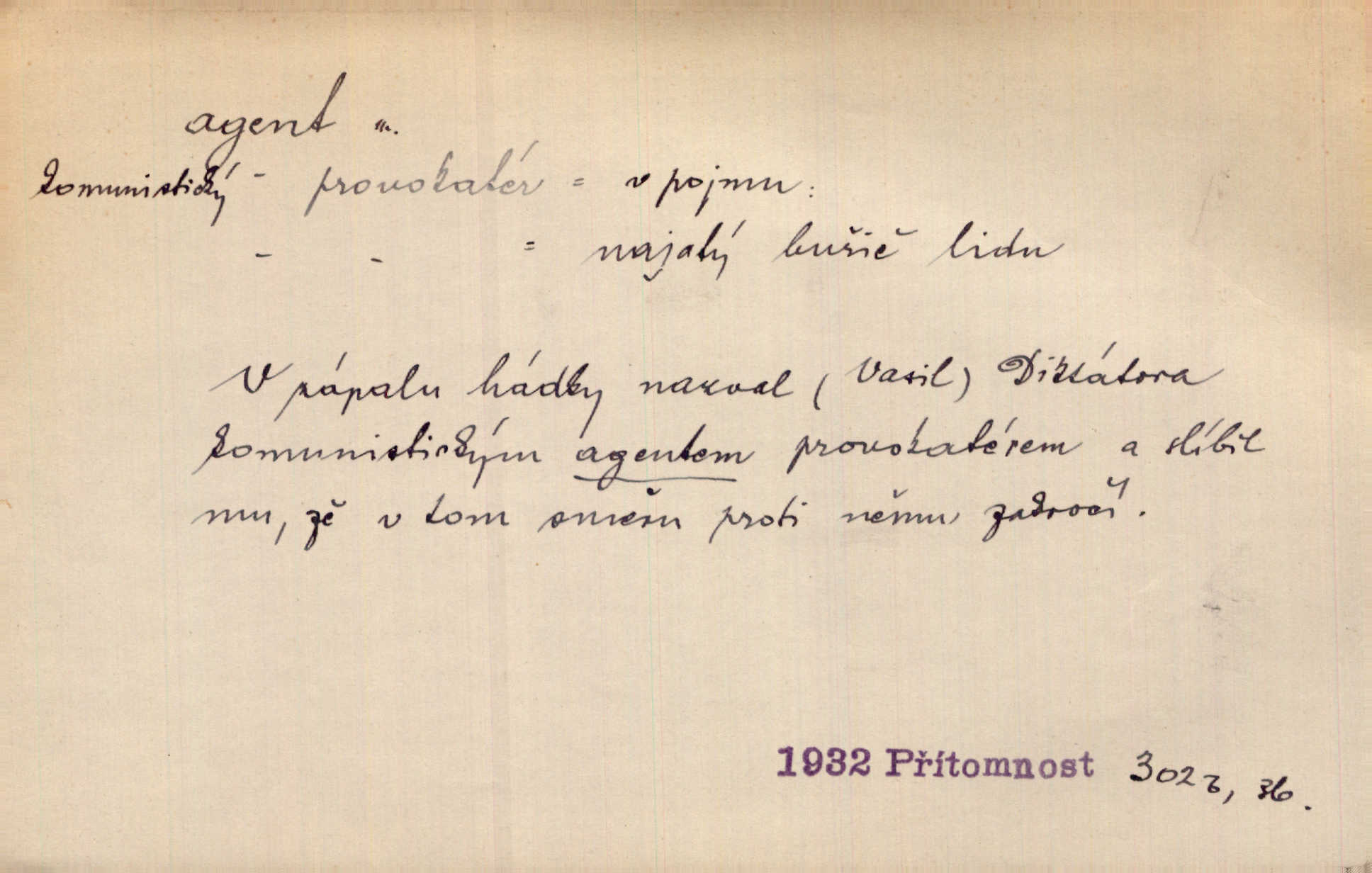 - agent, -a m. obch. jednatel, cestující, zástupce. Podle kufříku mohl to býti starší agent nějaké nebohaté firmy. Vlč. D Polit. náhončí, agitátor. Nejvíce popichují lid cizí agenti s francouzskými penězi. Jir. Agent provokatér udavač, vtírající se v důvěru osob veřejně činných nebo podněcující davy k trestným činům. D Spec. policejní agent člen sboru neuniformované stráže bezpečnosti, tajný policista. Zkušený policejní agent pozná mezi tisíci pořádných lidí jednoho darebáka. Thom.