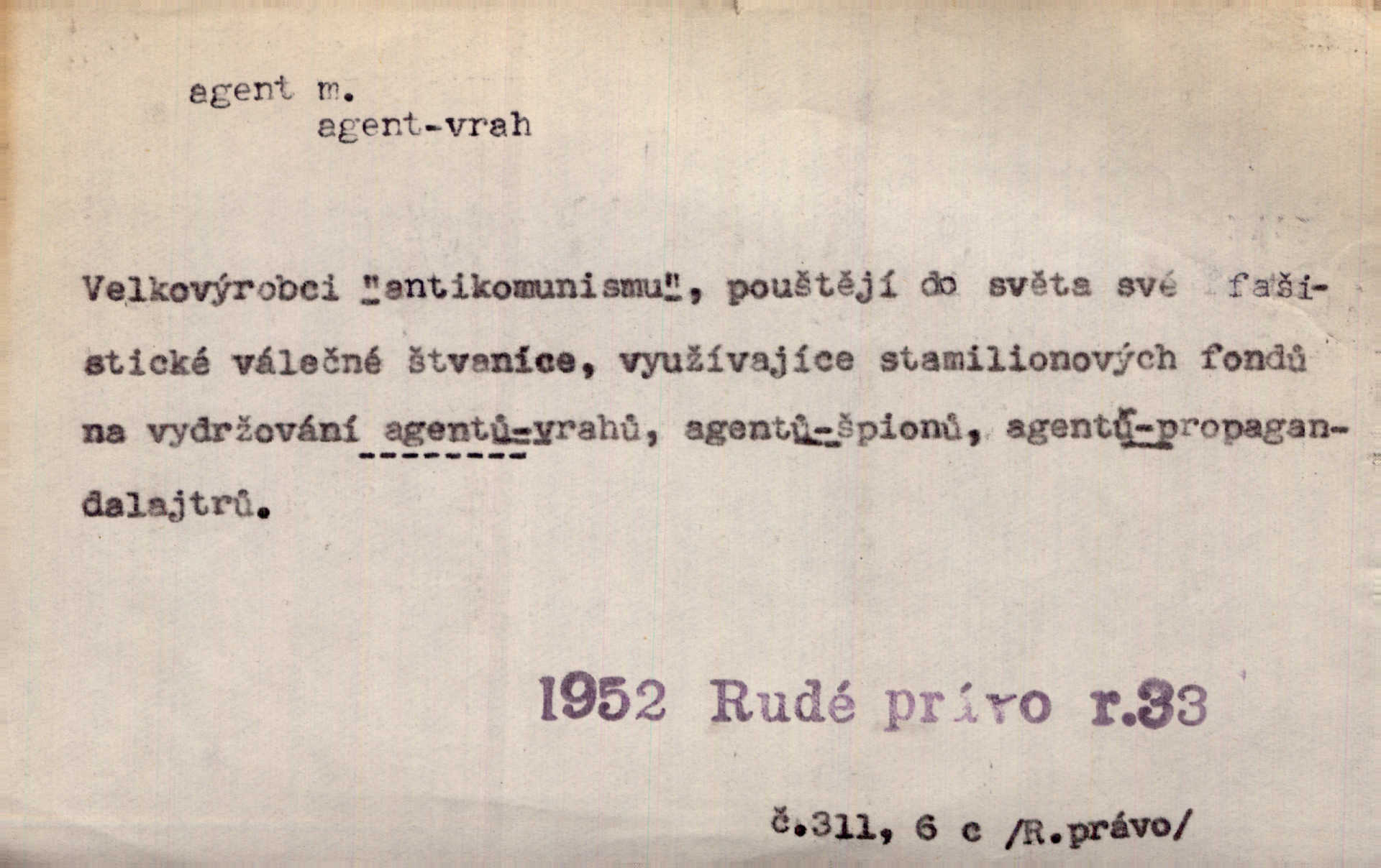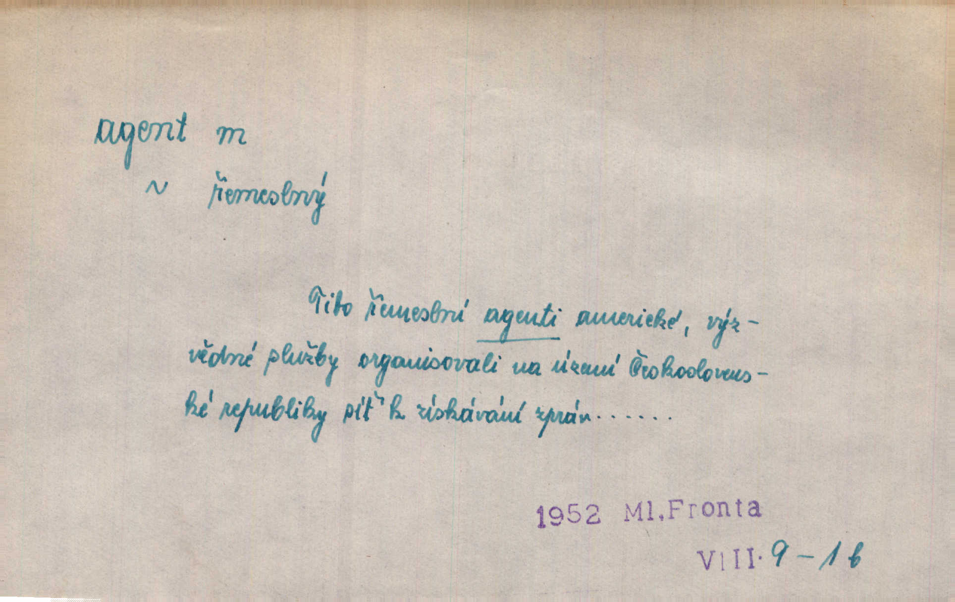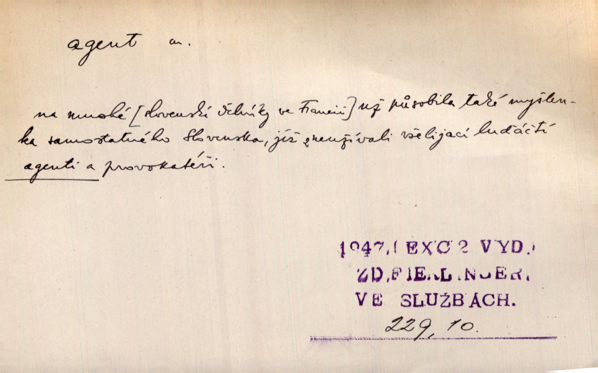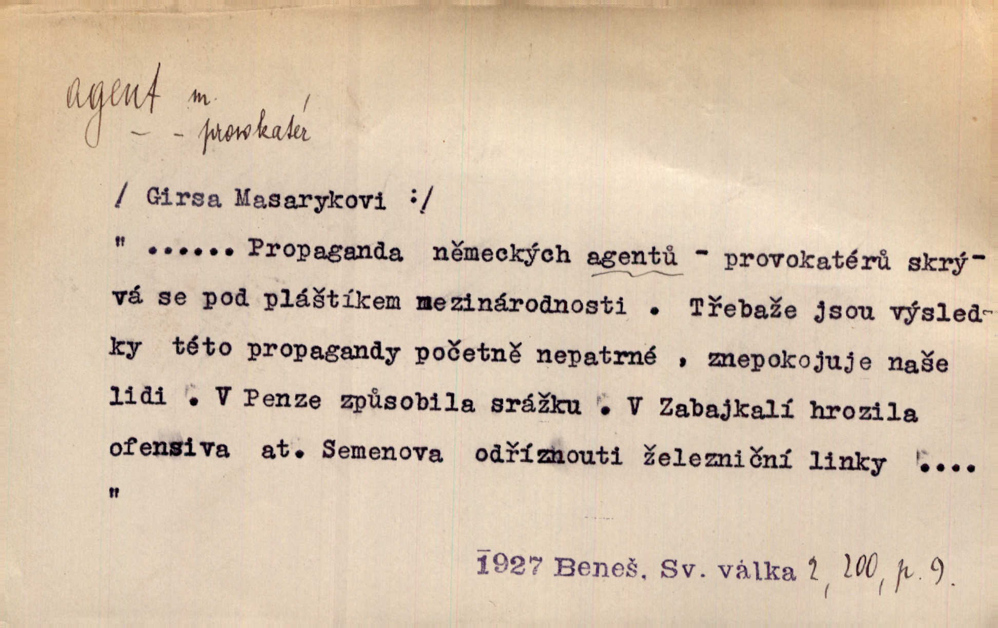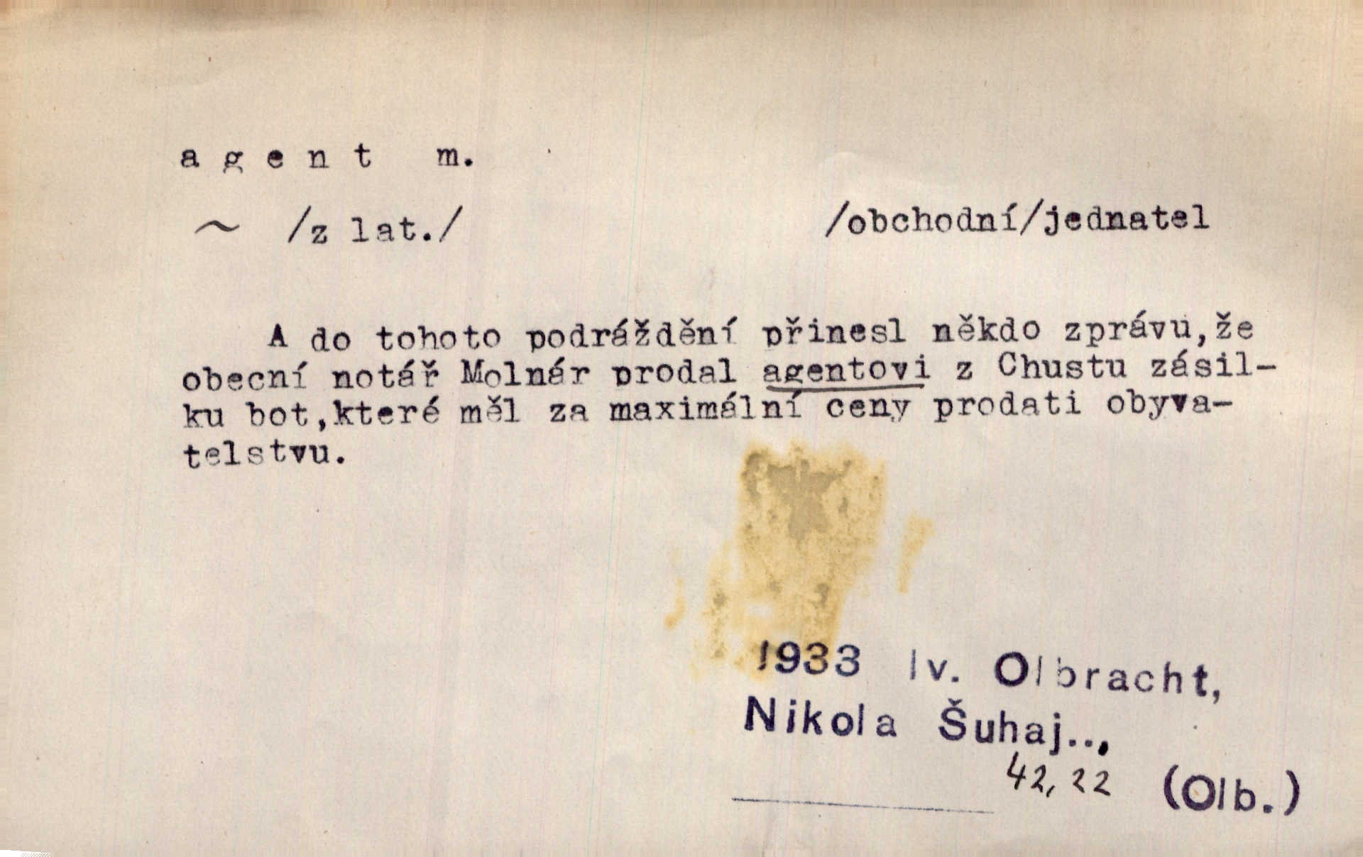 - agent, -a m. obch. jednatel, cestující, zástupce. Podle kufříku mohl to býti starší agent nějaké nebohaté firmy. Vlč. D Polit. náhončí, agitátor. Nejvíce popichují lid cizí agenti s francouzskými penězi. Jir. Agent provokatér udavač, vtírající se v důvěru osob veřejně činných nebo podněcující davy k trestným činům. D Spec. policejní agent člen sboru neuniformované stráže bezpečnosti, tajný policista. Zkušený policejní agent pozná mezi tisíci pořádných lidí jednoho darebáka. Thom.
