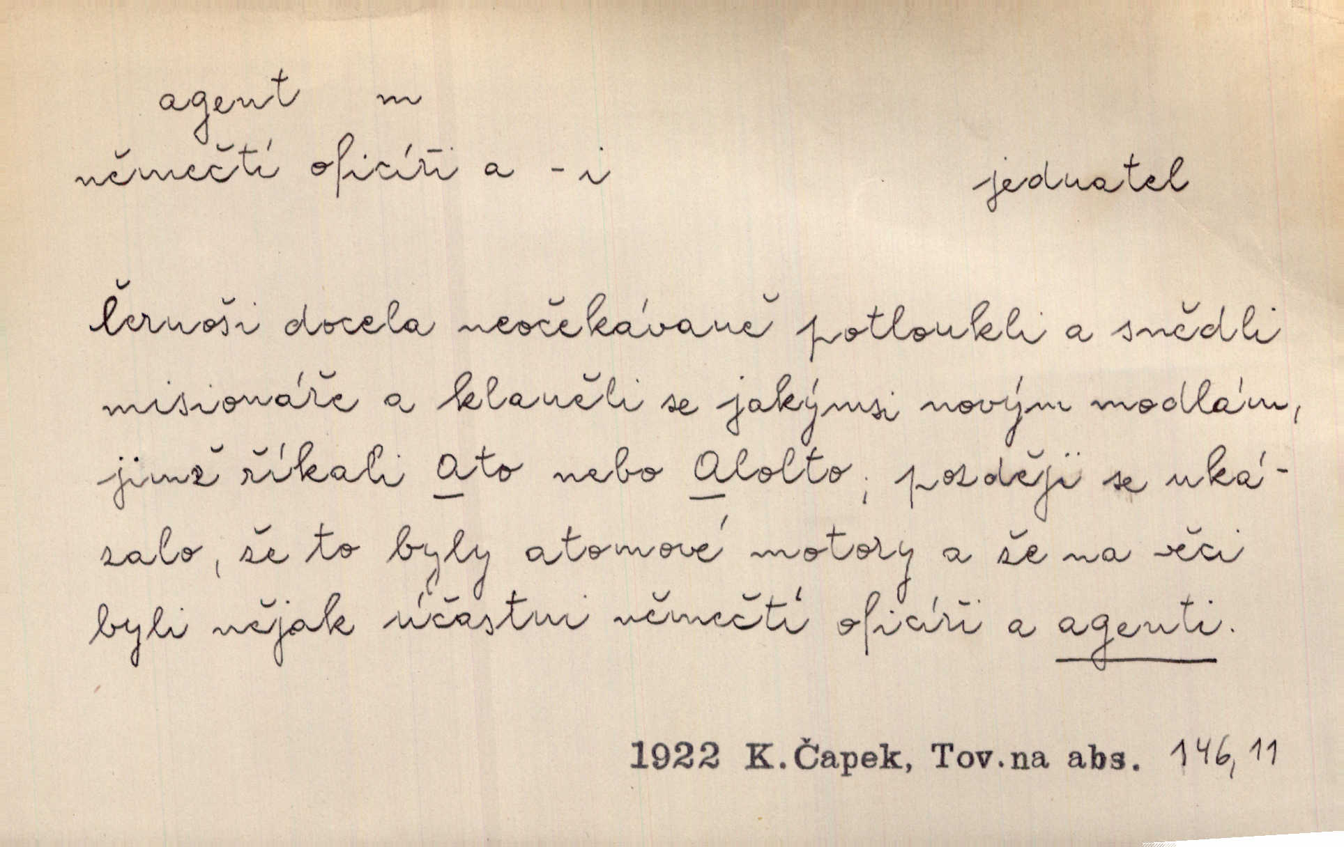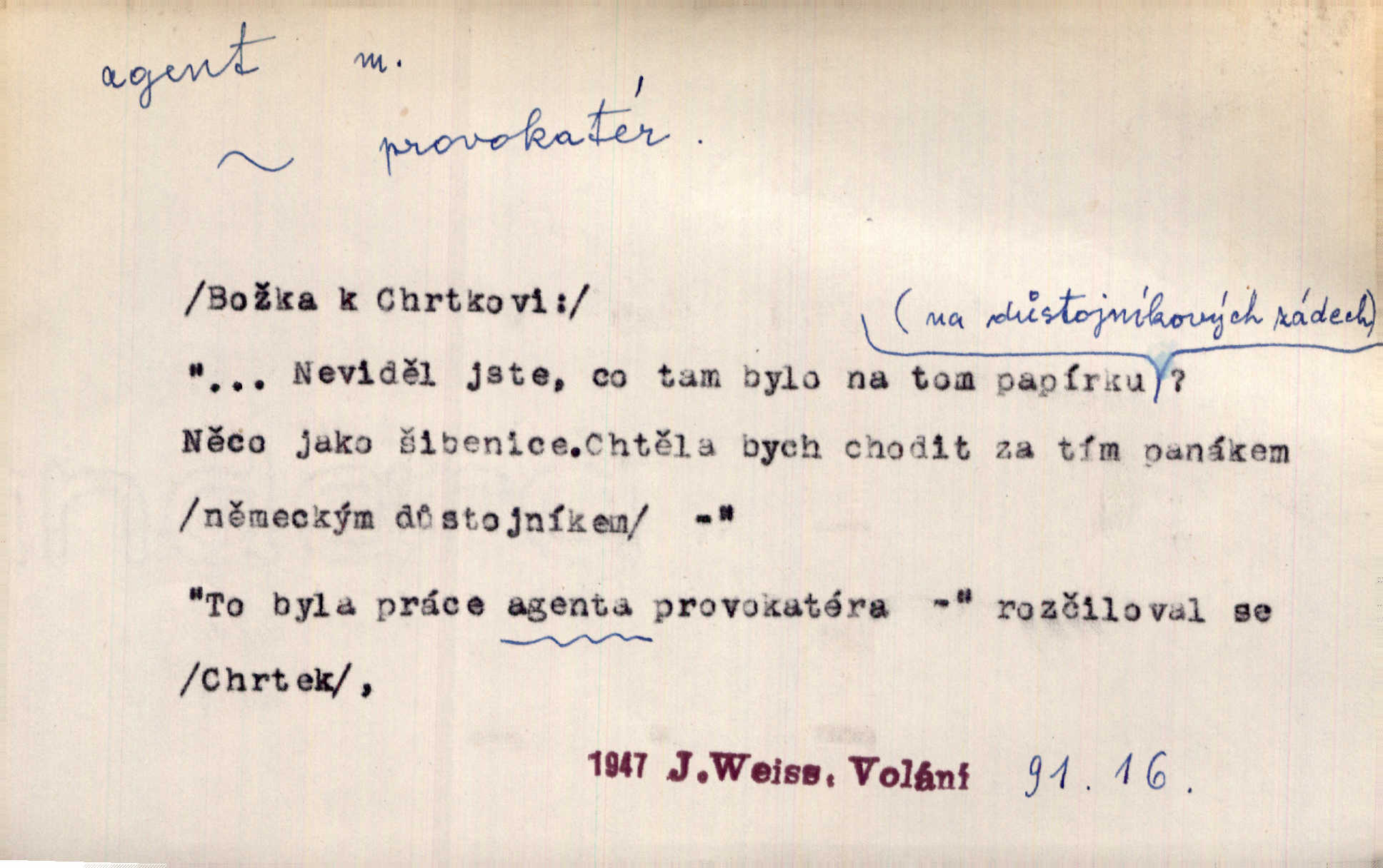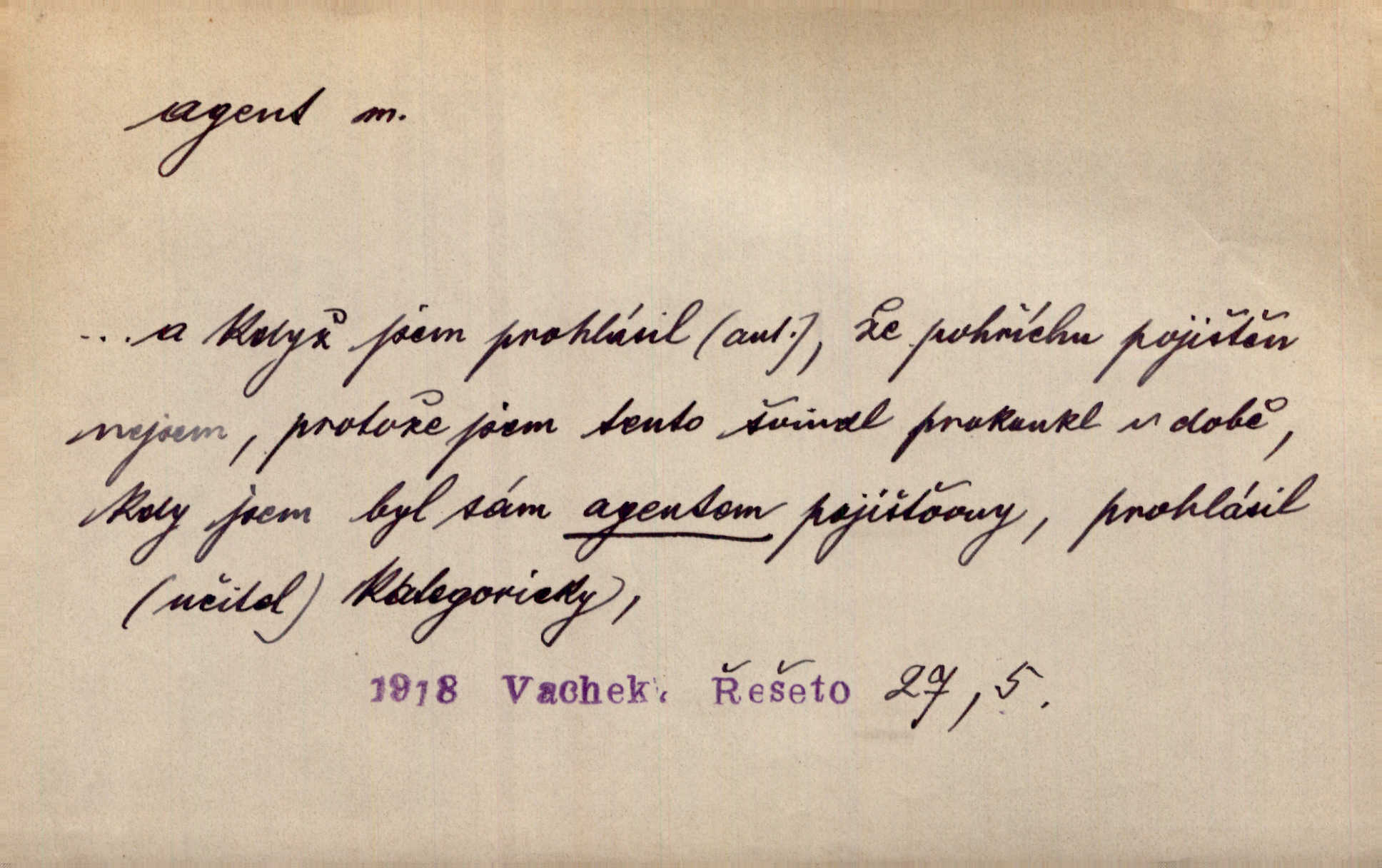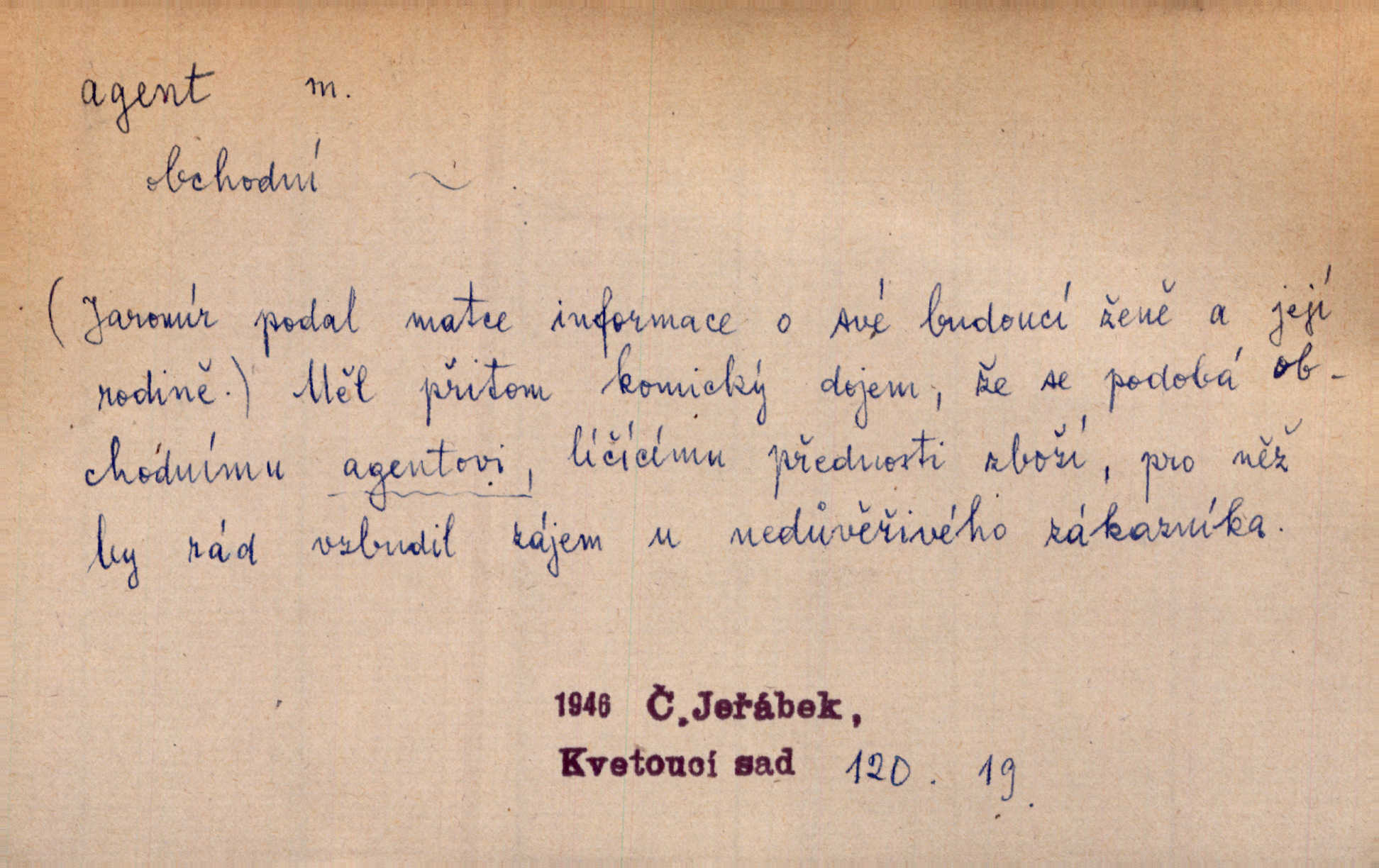 - agent, -a m. obch. jednatel, cestující, zástupce. Podle kufříku mohl to býti starší agent nějaké nebohaté firmy. Vlč. D Polit. náhončí, agitátor. Nejvíce popichují lid cizí agenti s francouzskými penězi. Jir. Agent provokatér udavač, vtírající se v důvěru osob veřejně činných nebo podněcující davy k trestným činům. D Spec. policejní agent člen sboru neuniformované stráže bezpečnosti, tajný policista. Zkušený policejní agent pozná mezi tisíci pořádných lidí jednoho darebáka. Thom.