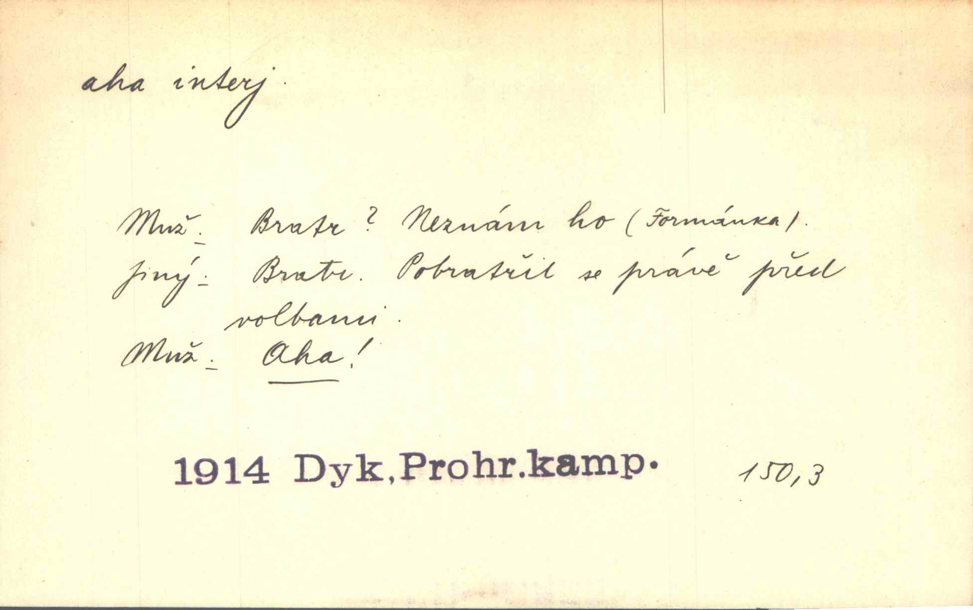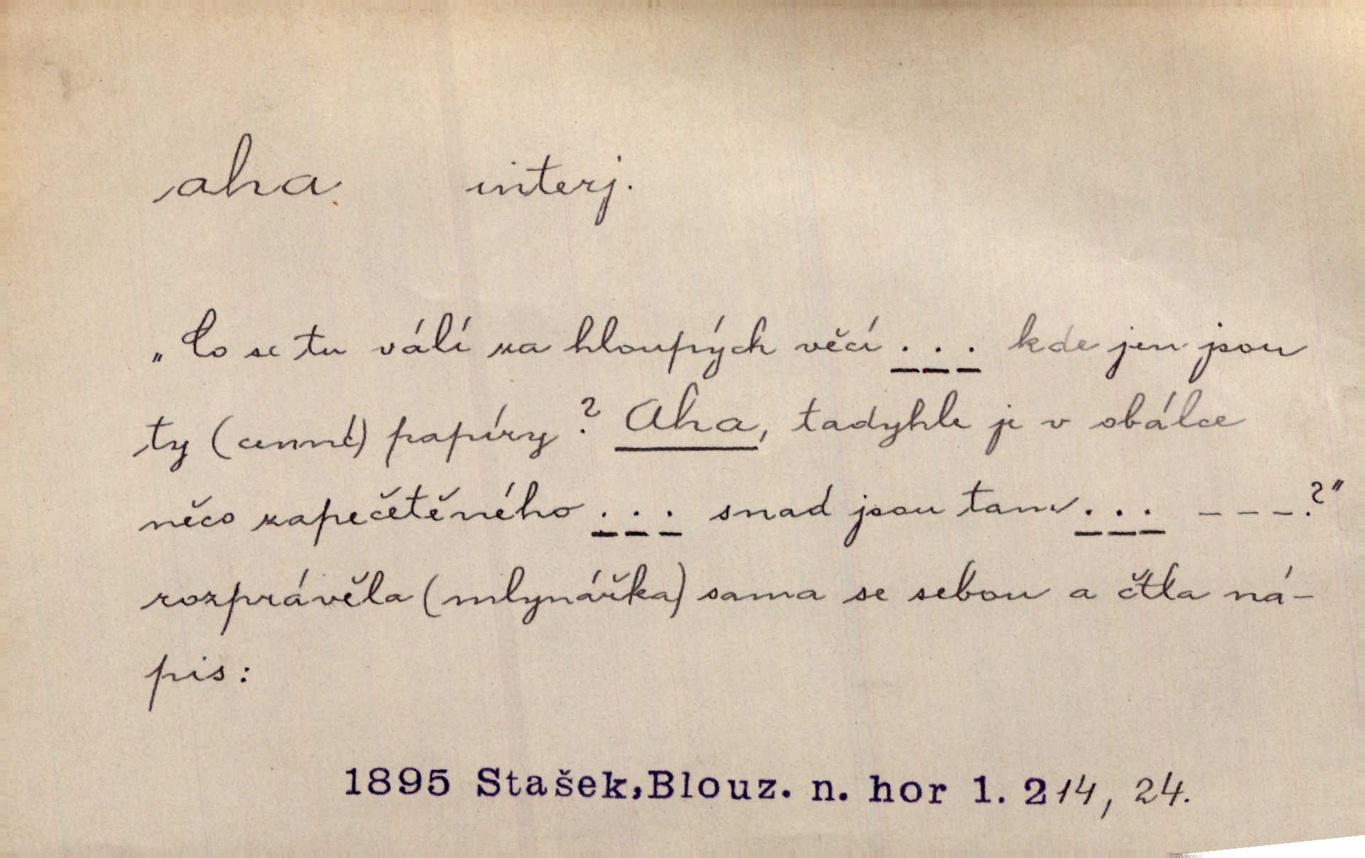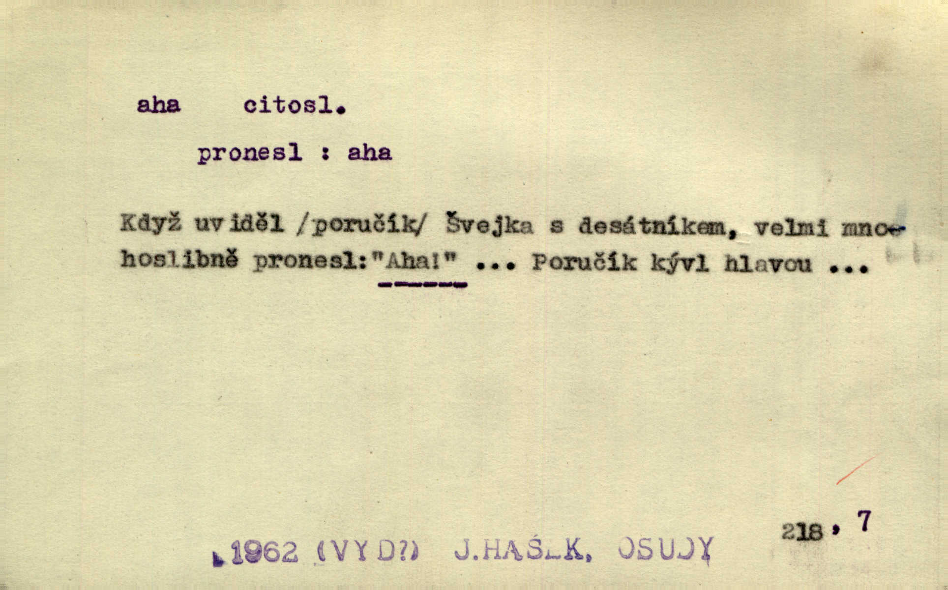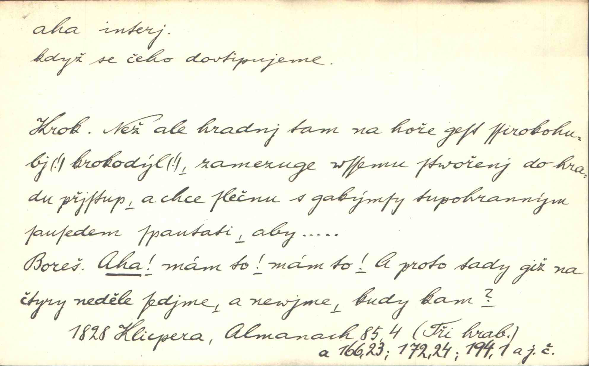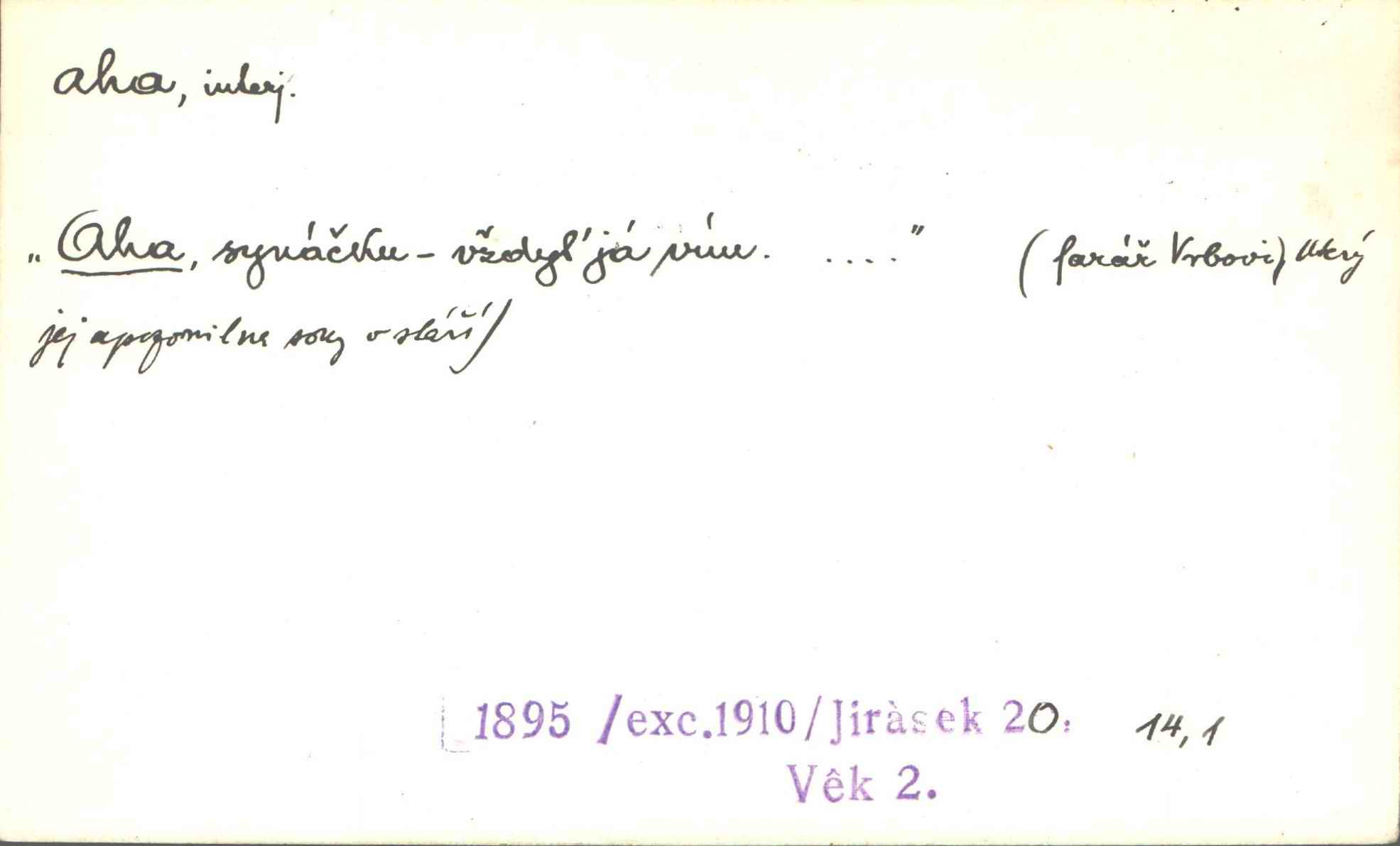 - aha citosl. překvapení, dovtípení, ironie a j. „Aha!“ povídá Bída, „mám tu hosti. Pěkně vítám.“ Erb. Pojednou vykulila Randová do tmy šedivé oči a otevřela ústa dokořán. „Ahááá—!“ vyklouzlo jí z hrdla. Již to měla! Herrm. Muž: Bratr? Neznám ho. Jiný: Bratr. Pobratřili se právě před volbami. Muž: Aha! Dyk.