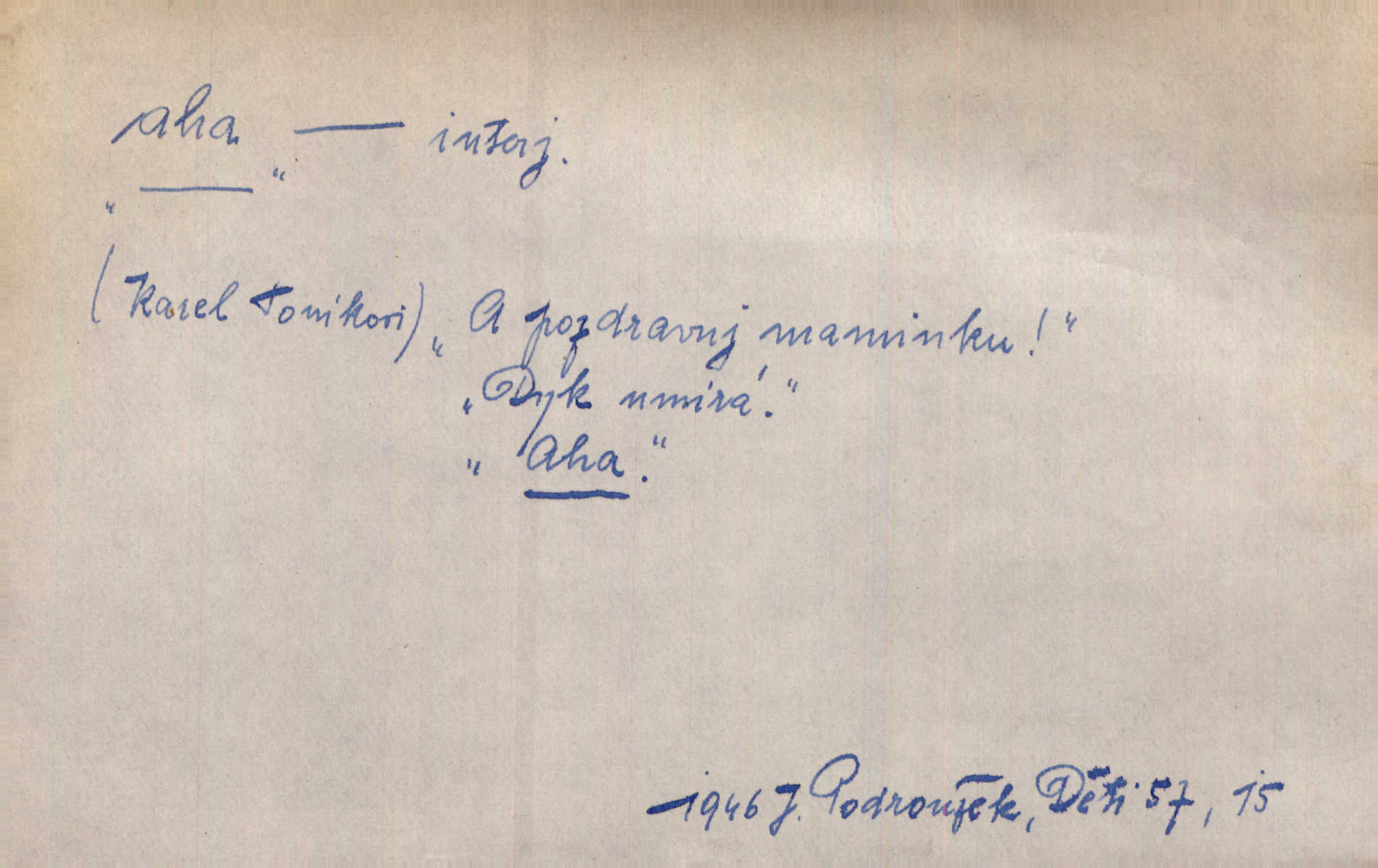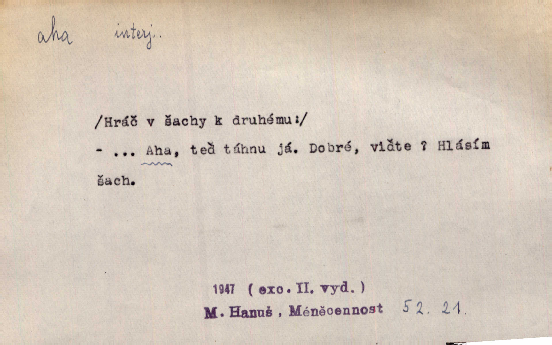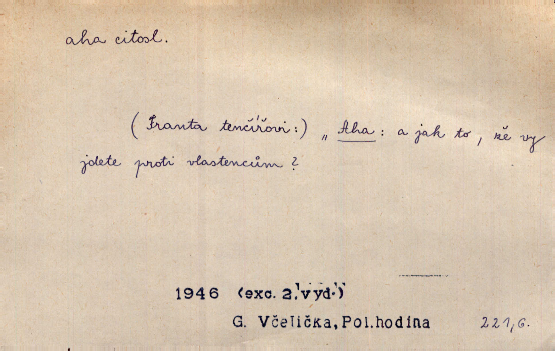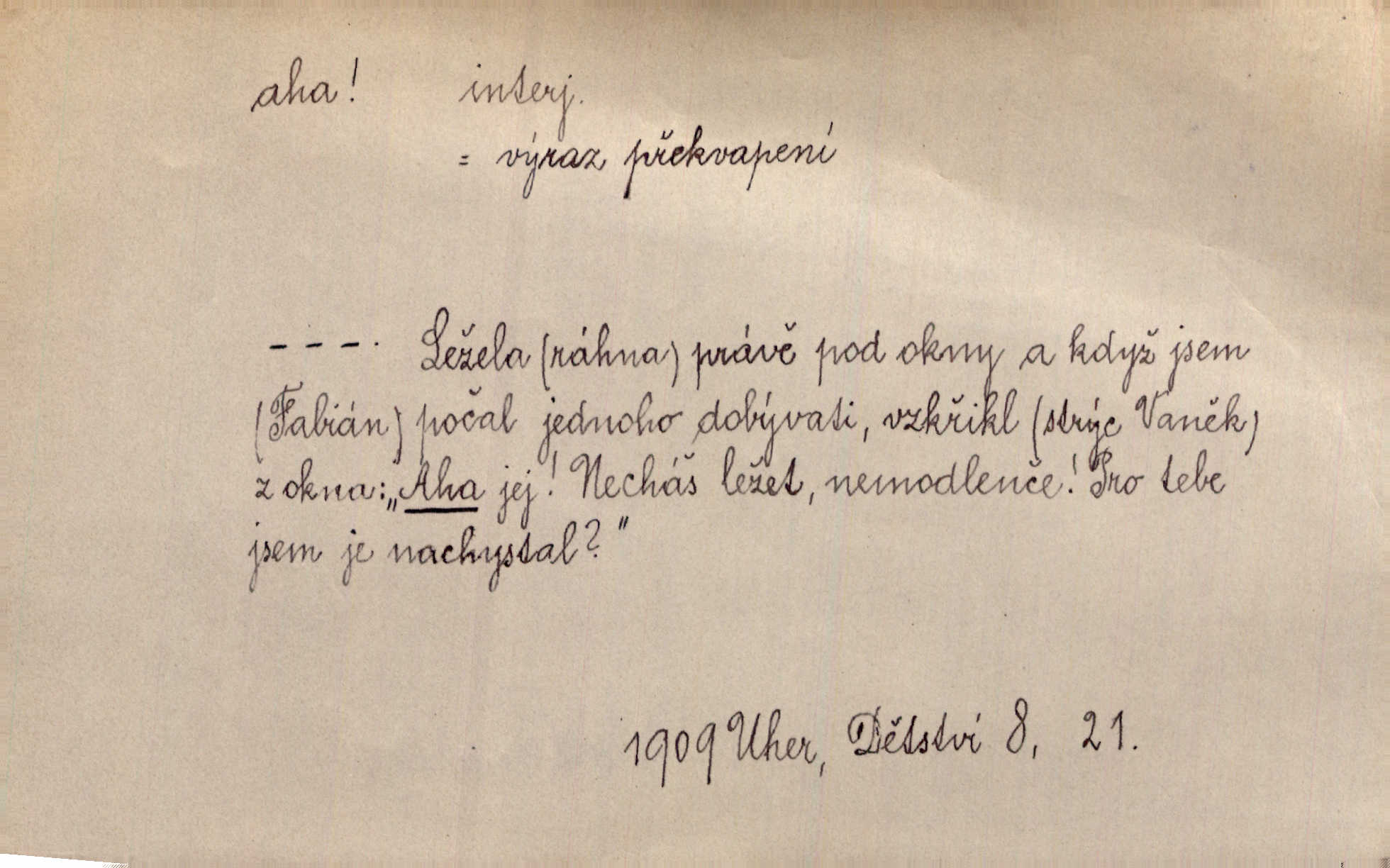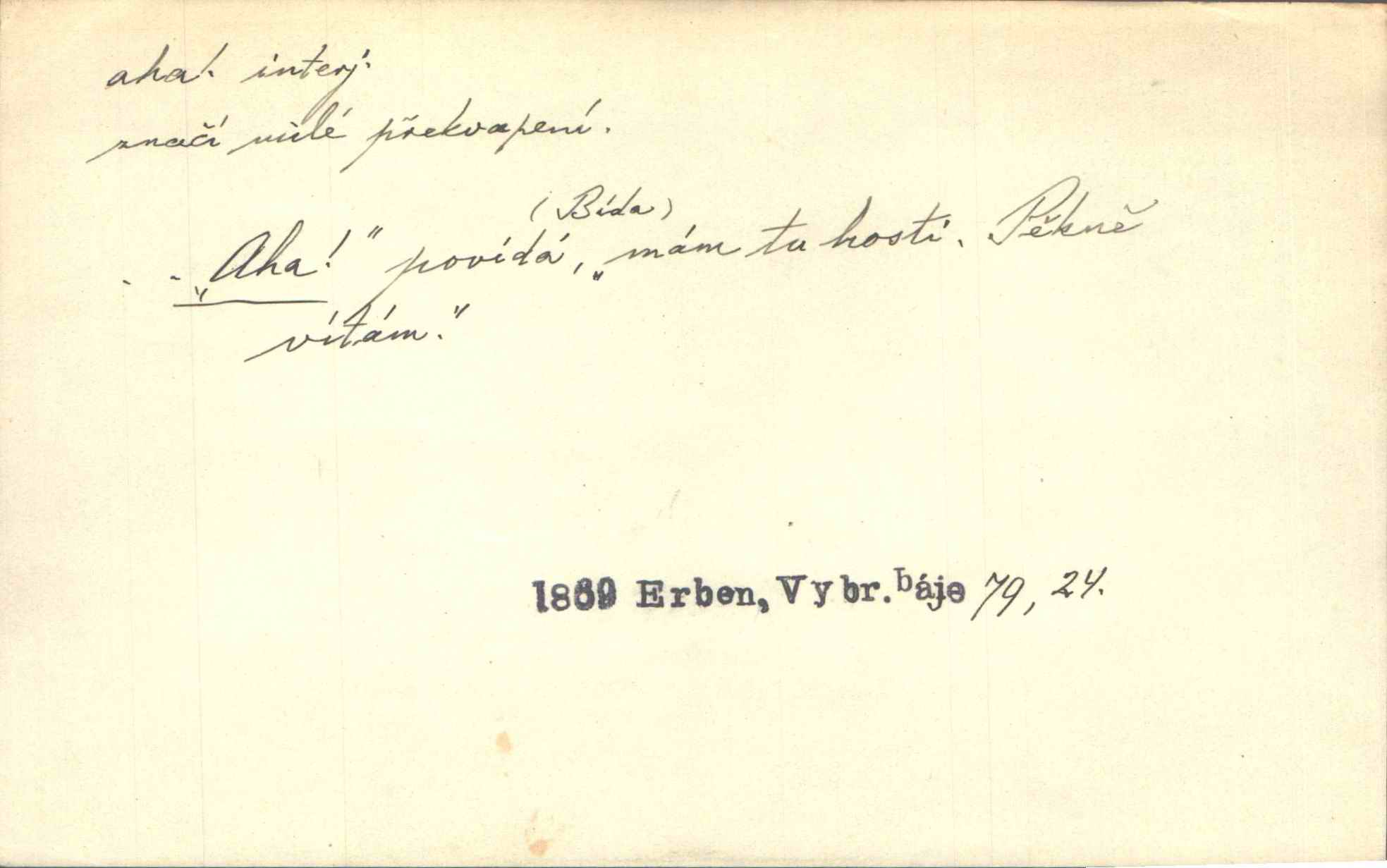 - aha citosl. překvapení, dovtípení, ironie a j. „Aha!“ povídá Bída, „mám tu hosti. Pěkně vítám.“ Erb. Pojednou vykulila Randová do tmy šedivé oči a otevřela ústa dokořán. „Ahááá—!“ vyklouzlo jí z hrdla. Již to měla! Herrm. Muž: Bratr? Neznám ho. Jiný: Bratr. Pobratřili se právě před volbami. Muž: Aha! Dyk.