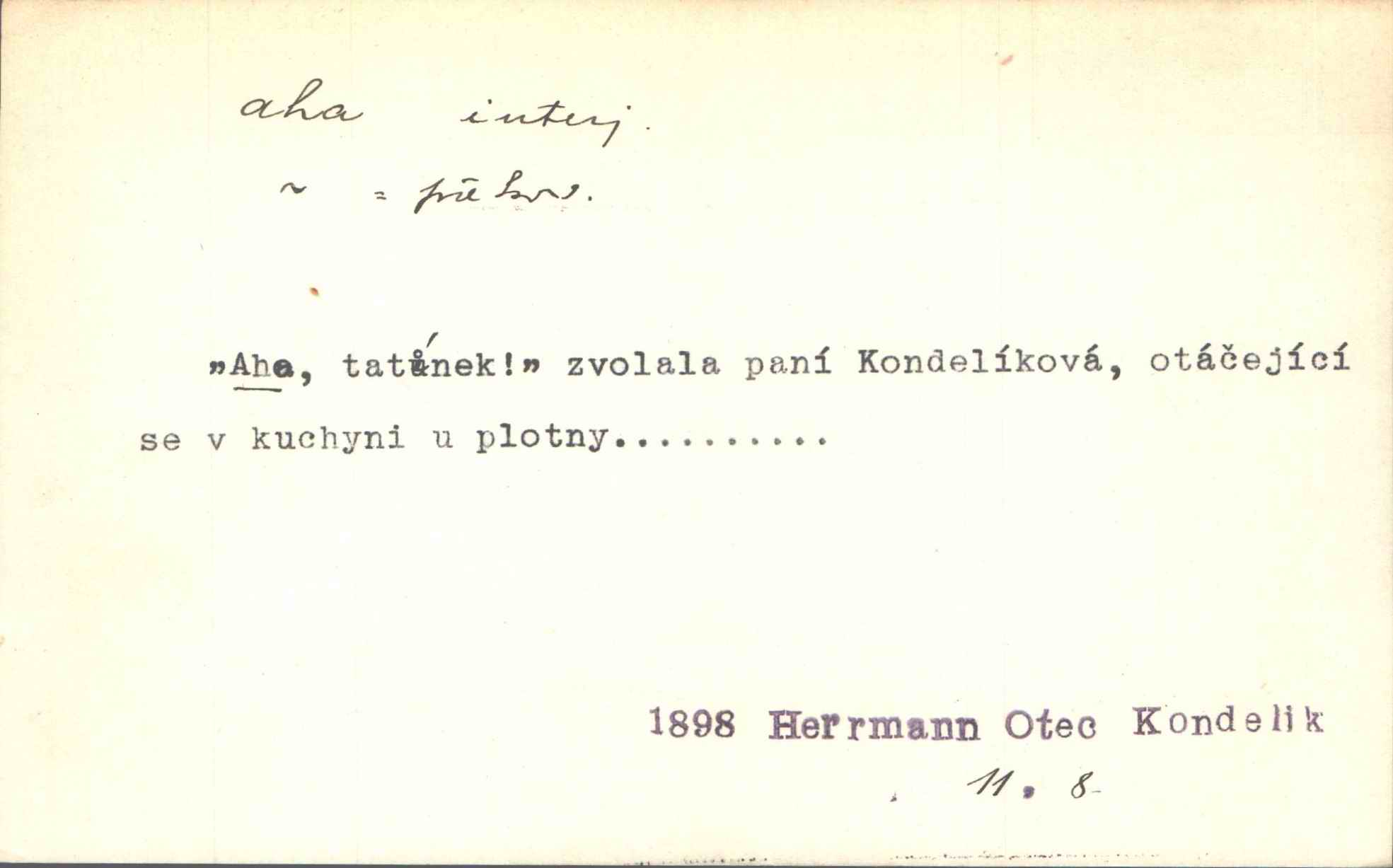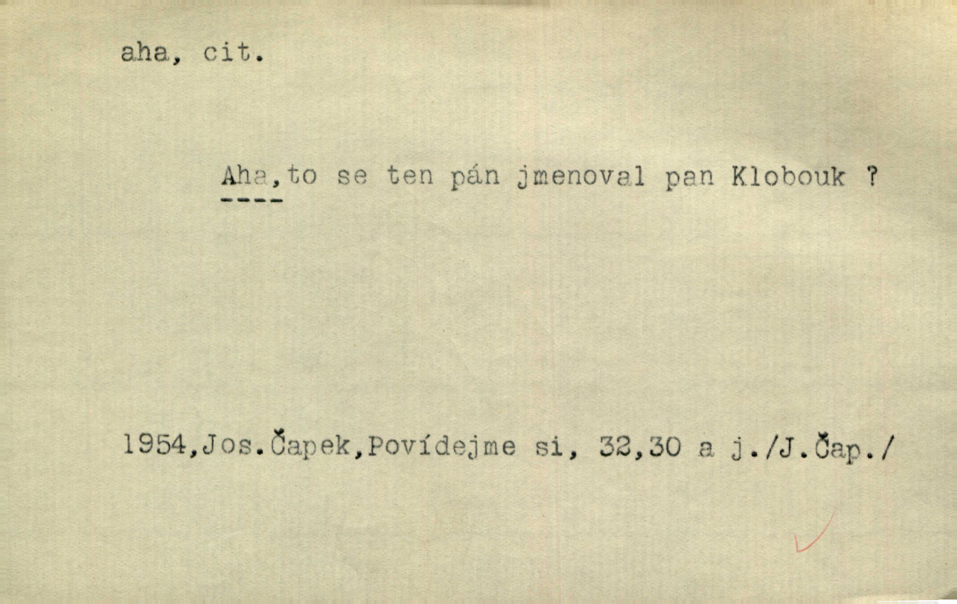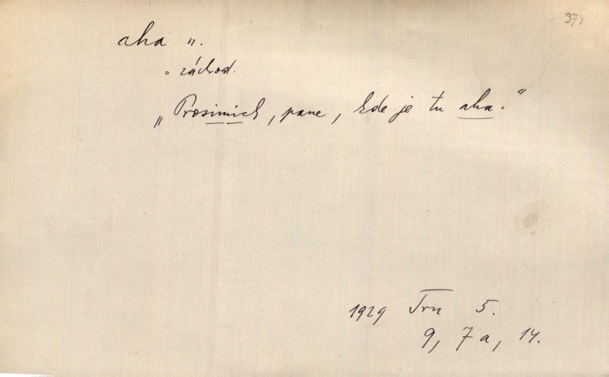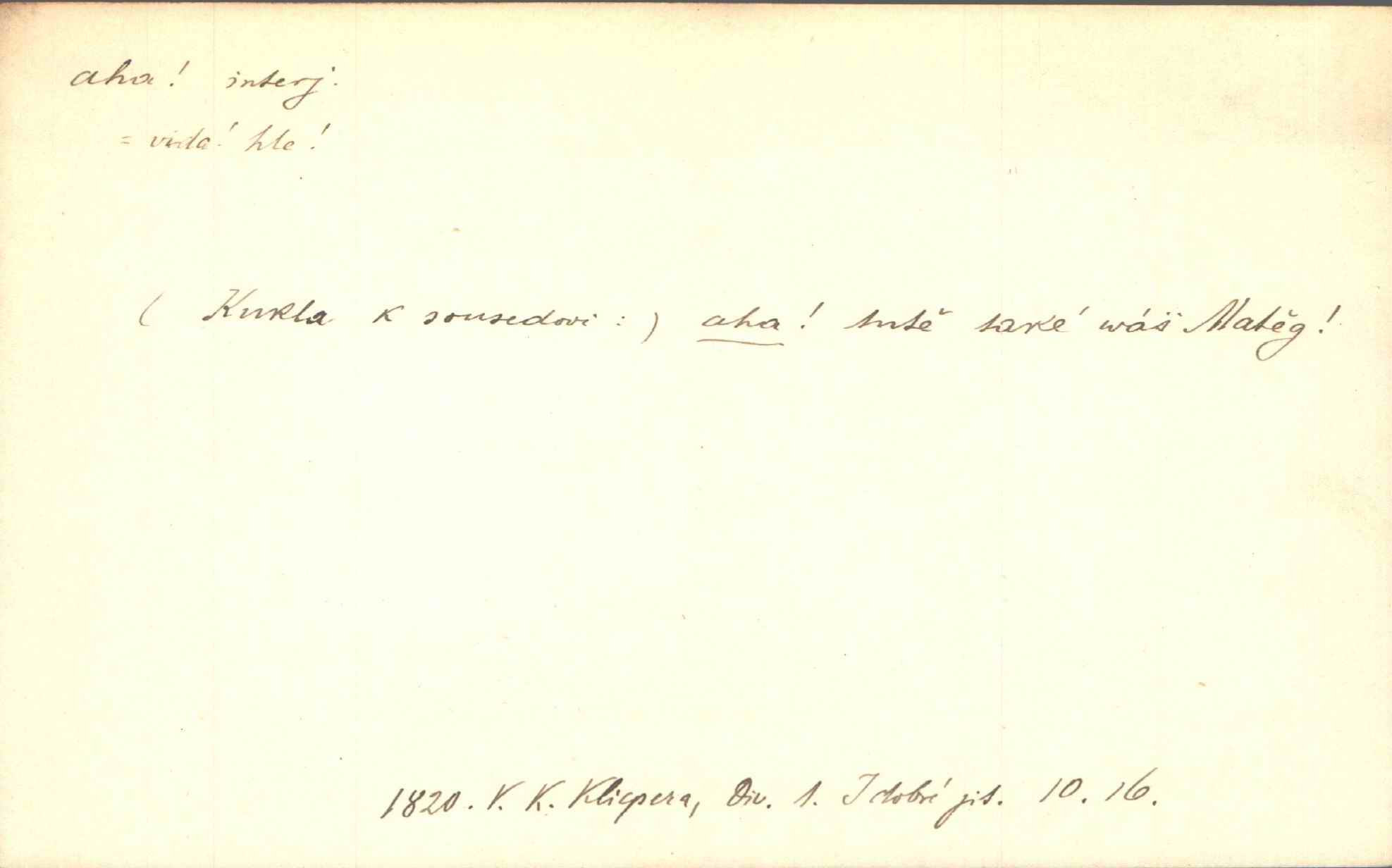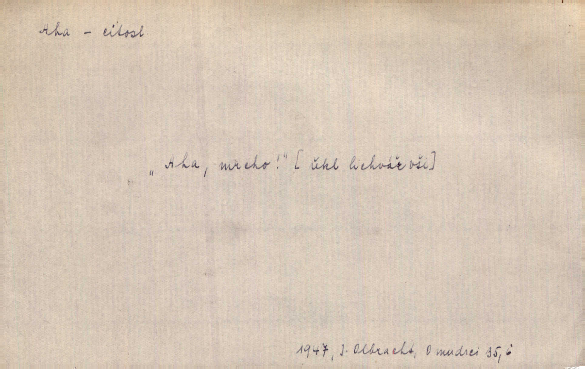 - aha citosl. překvapení, dovtípení, ironie a j. „Aha!“ povídá Bída, „mám tu hosti. Pěkně vítám.“ Erb. Pojednou vykulila Randová do tmy šedivé oči a otevřela ústa dokořán. „Ahááá—!“ vyklouzlo jí z hrdla. Již to měla! Herrm. Muž: Bratr? Neznám ho. Jiný: Bratr. Pobratřili se právě před volbami. Muž: Aha! Dyk.