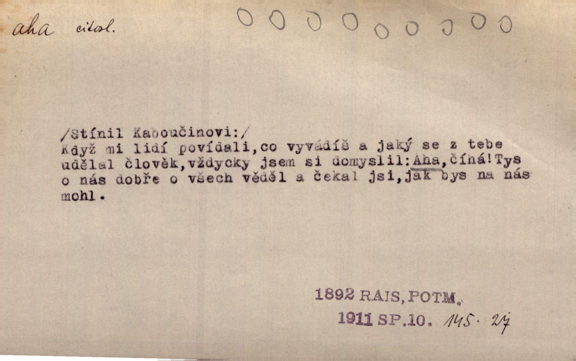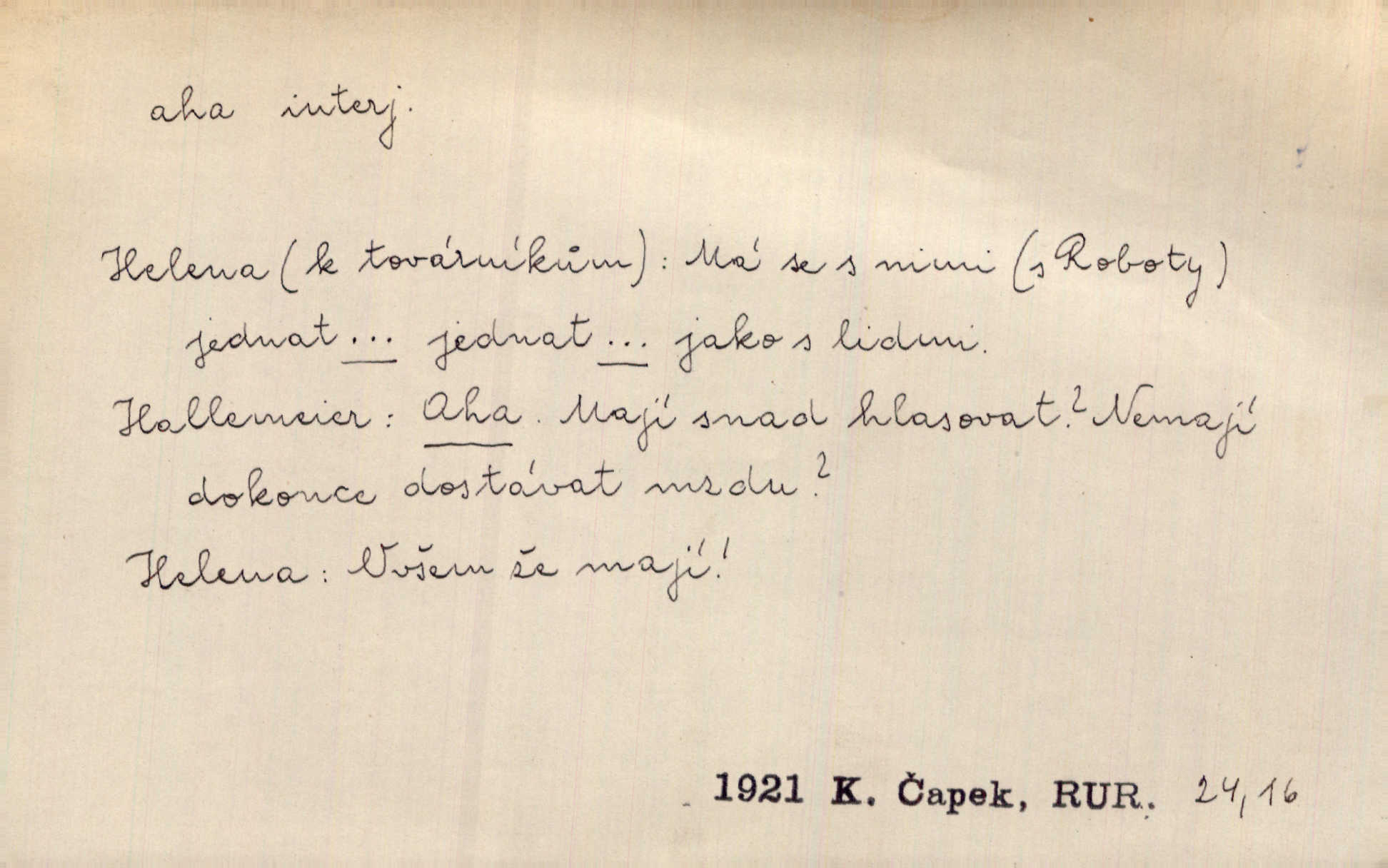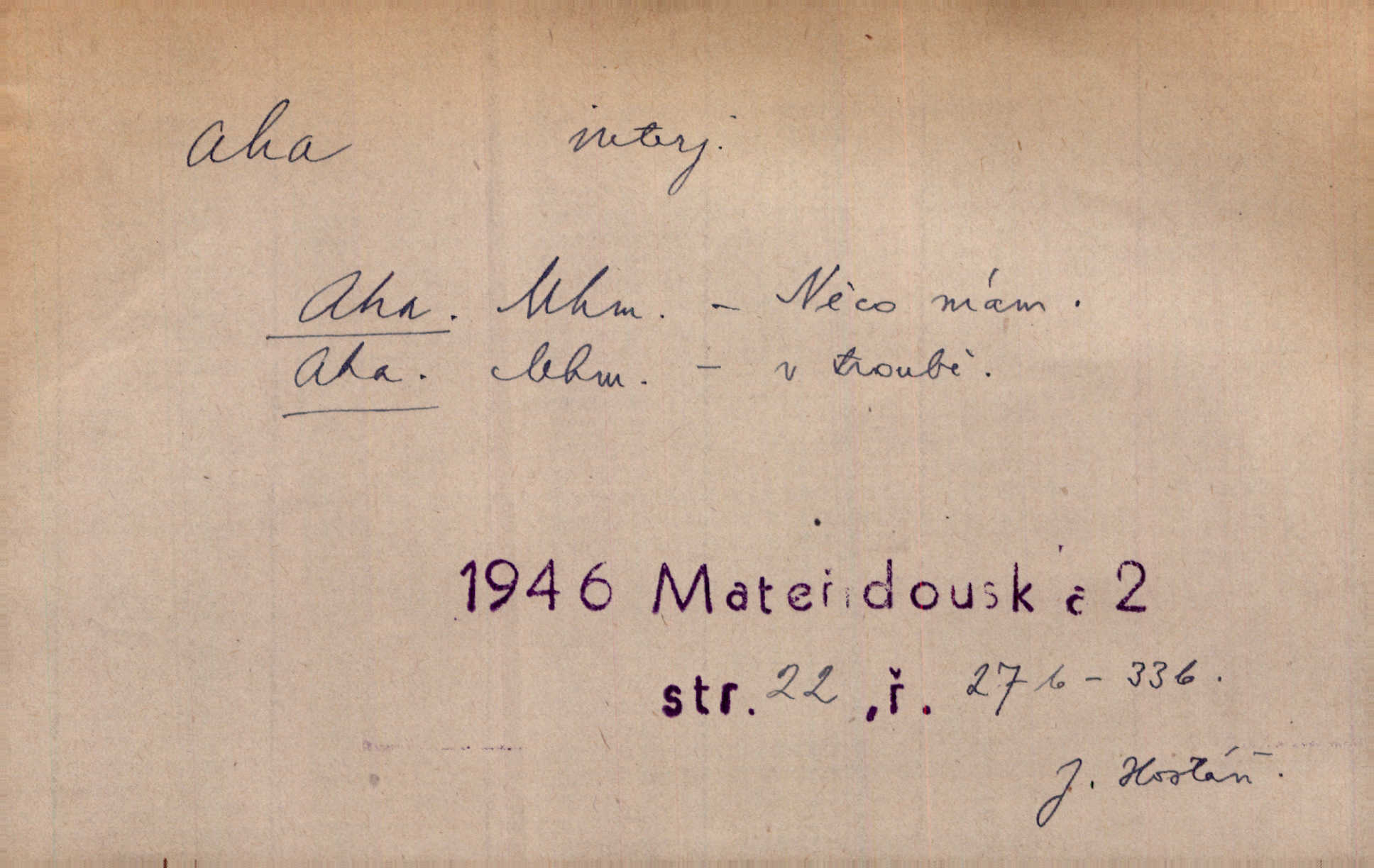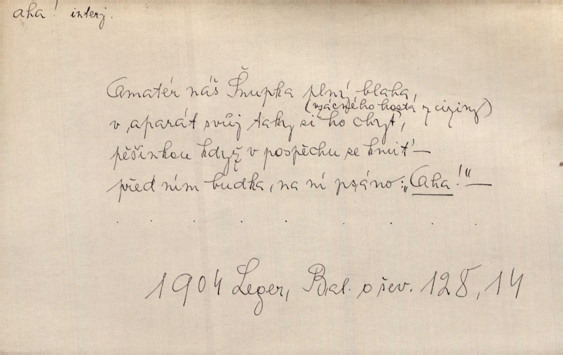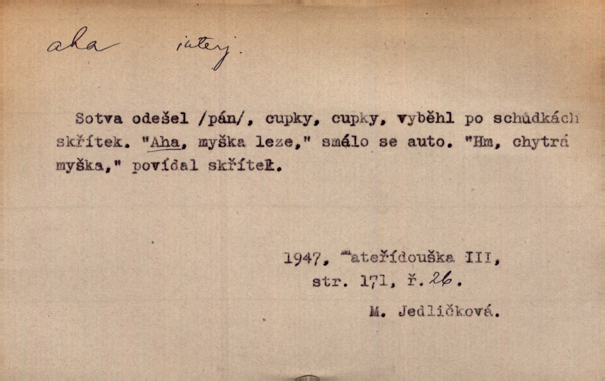 - aha citosl. překvapení, dovtípení, ironie a j. „Aha!“ povídá Bída, „mám tu hosti. Pěkně vítám.“ Erb. Pojednou vykulila Randová do tmy šedivé oči a otevřela ústa dokořán. „Ahááá—!“ vyklouzlo jí z hrdla. Již to měla! Herrm. Muž: Bratr? Neznám ho. Jiný: Bratr. Pobratřili se právě před volbami. Muž: Aha! Dyk.