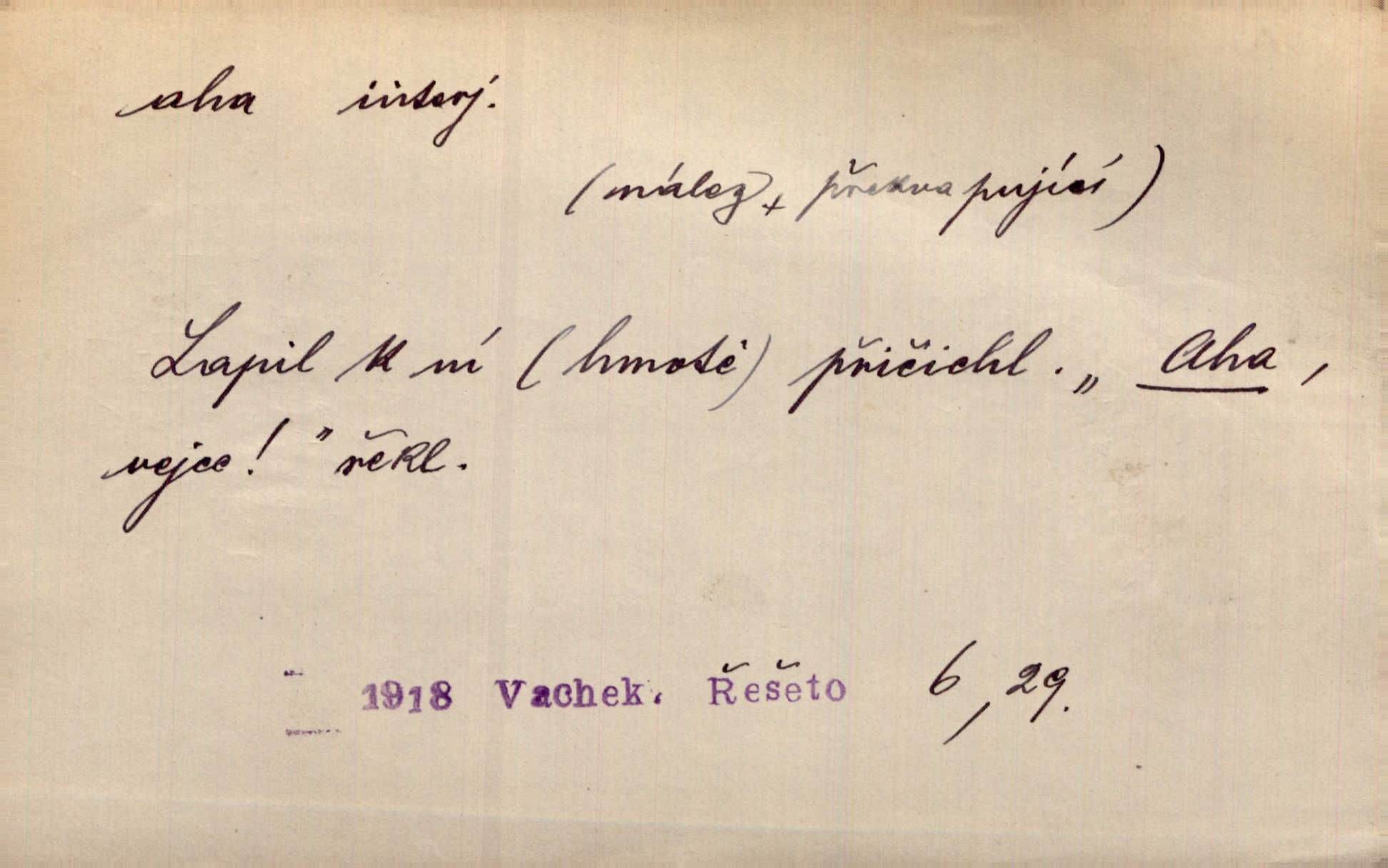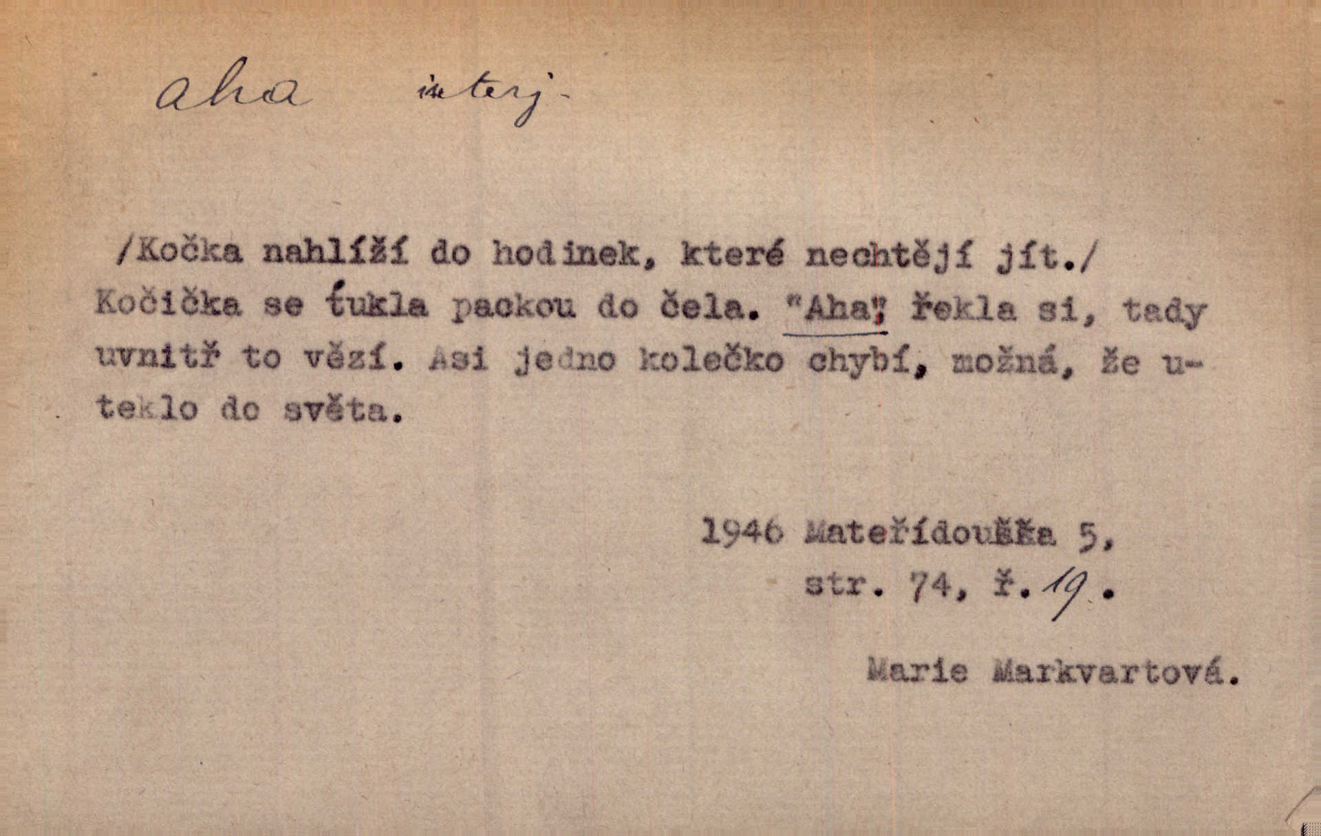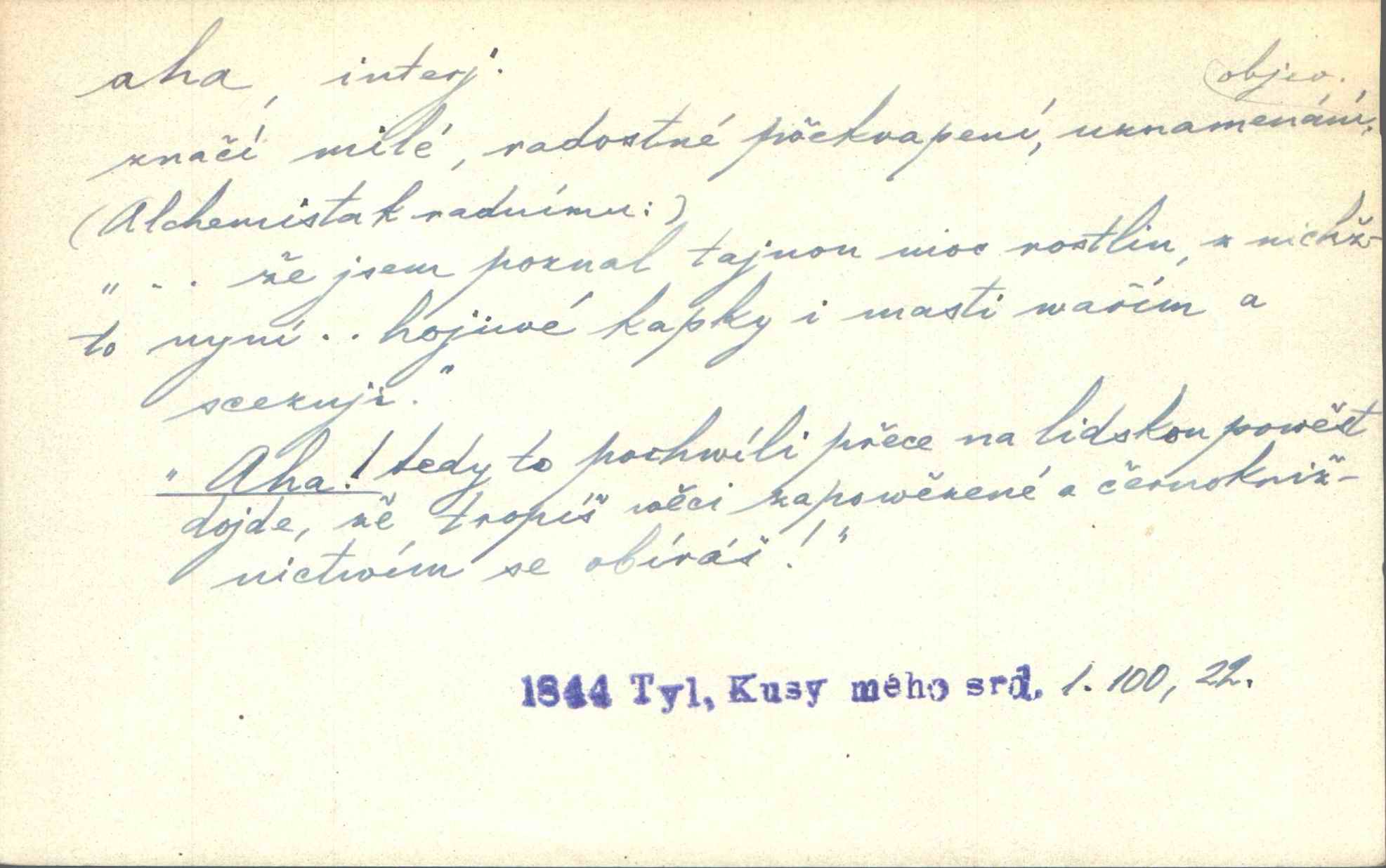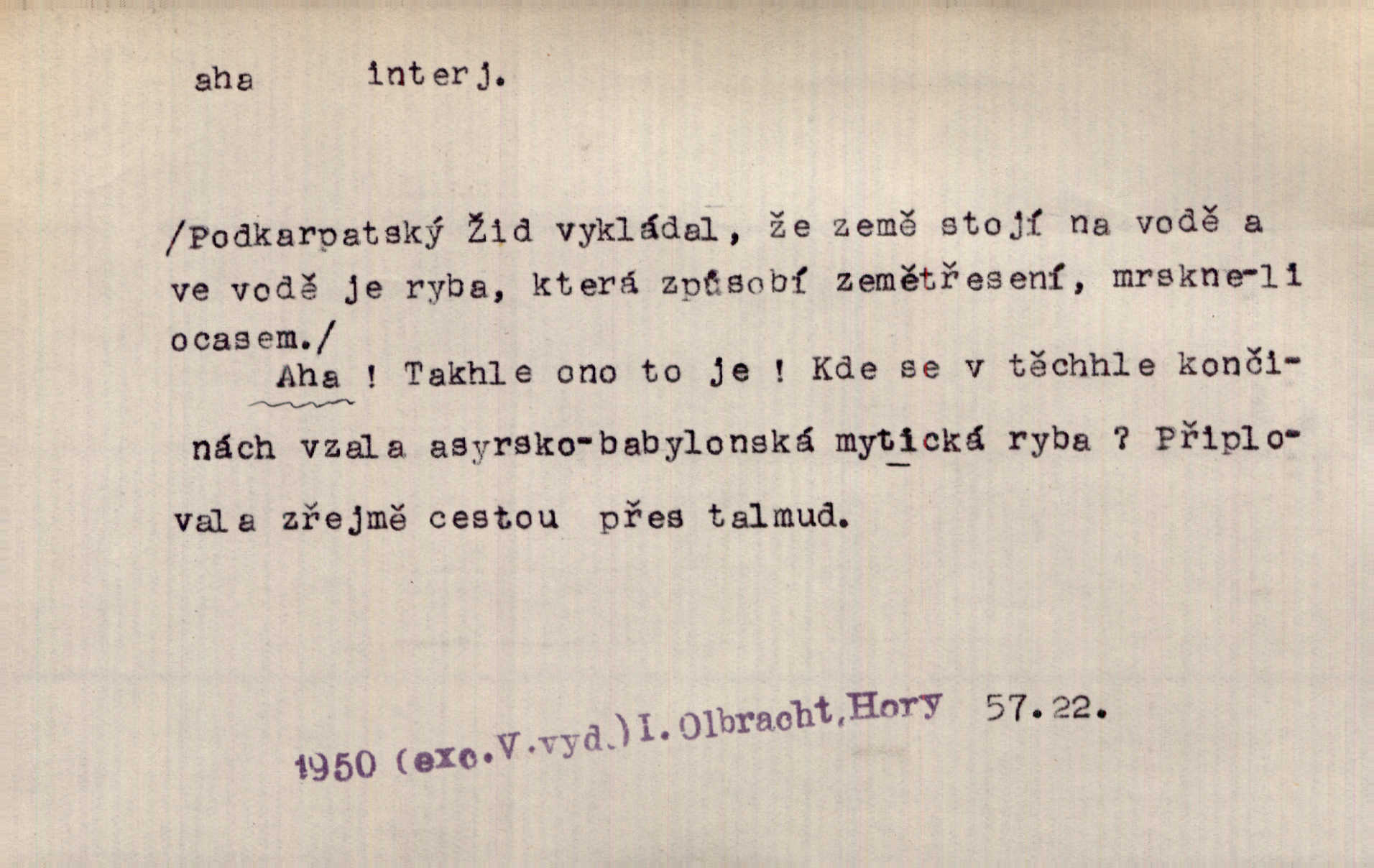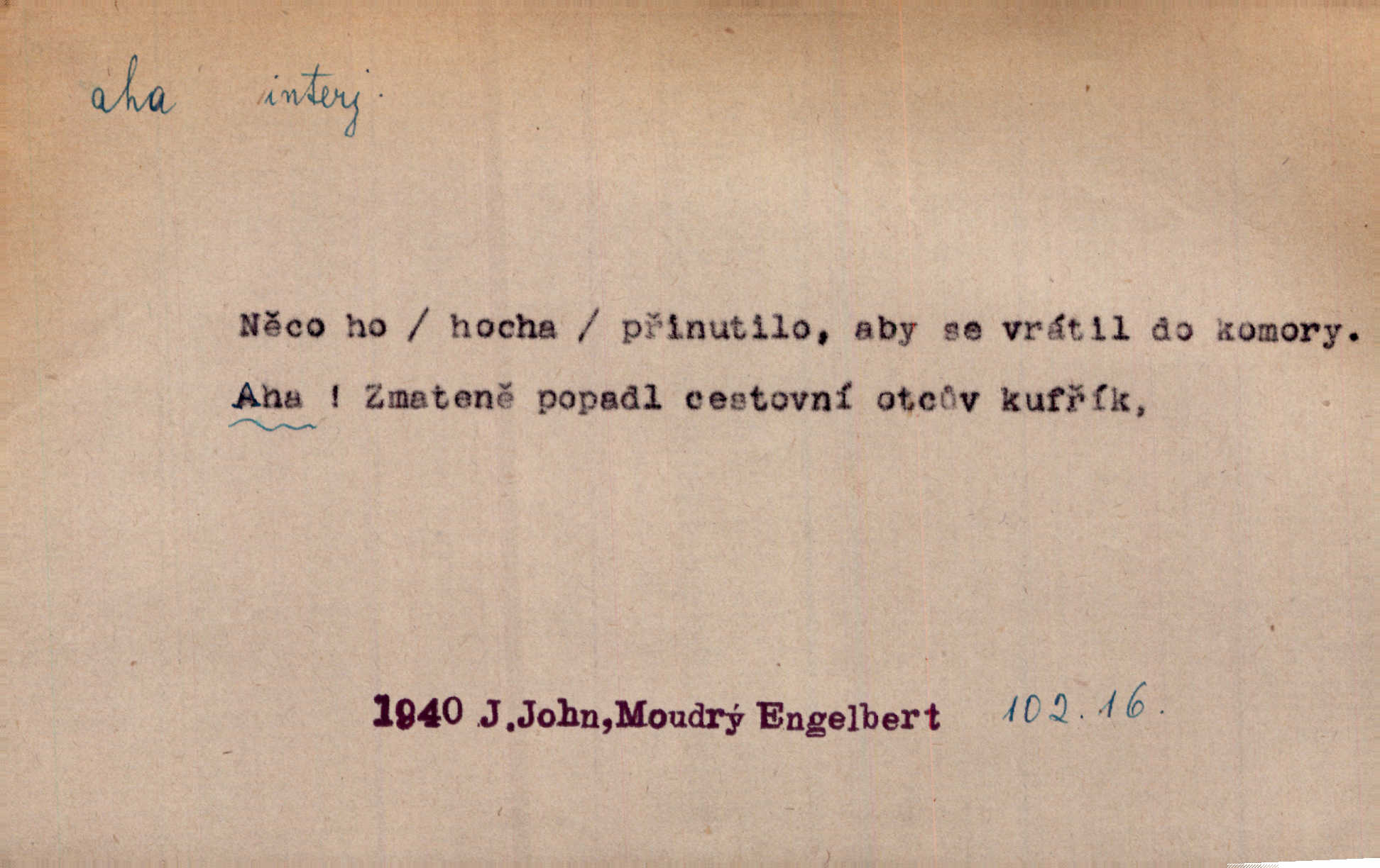 - aha citosl. překvapení, dovtípení, ironie a j. „Aha!“ povídá Bída, „mám tu hosti. Pěkně vítám.“ Erb. Pojednou vykulila Randová do tmy šedivé oči a otevřela ústa dokořán. „Ahááá—!“ vyklouzlo jí z hrdla. Již to měla! Herrm. Muž: Bratr? Neznám ho. Jiný: Bratr. Pobratřili se právě před volbami. Muž: Aha! Dyk.