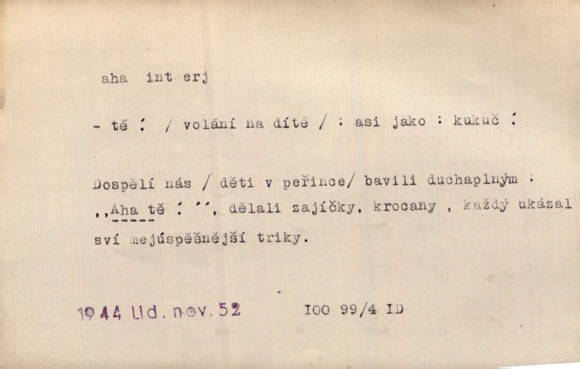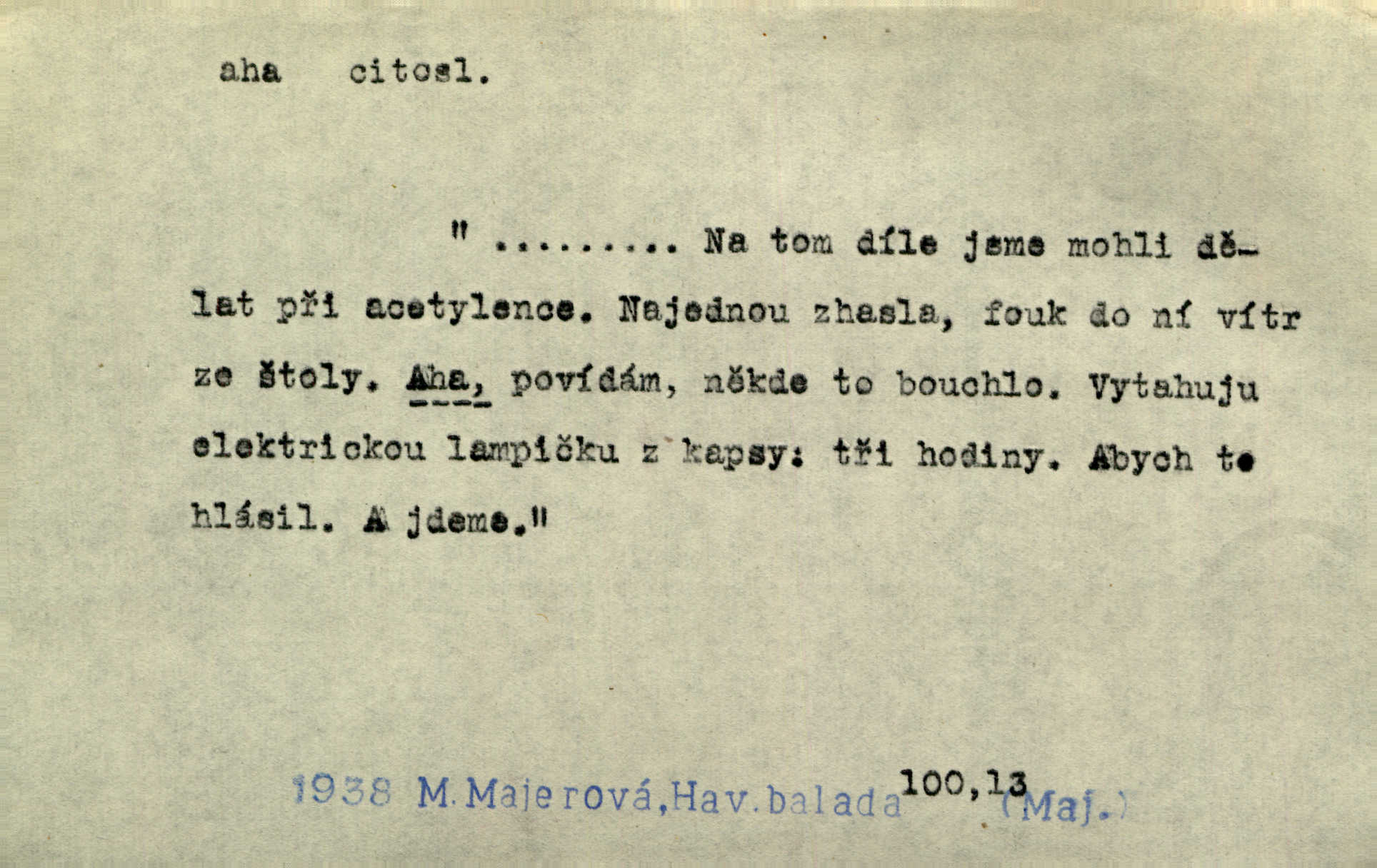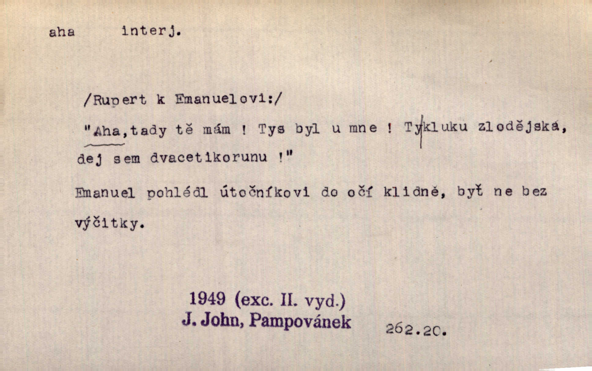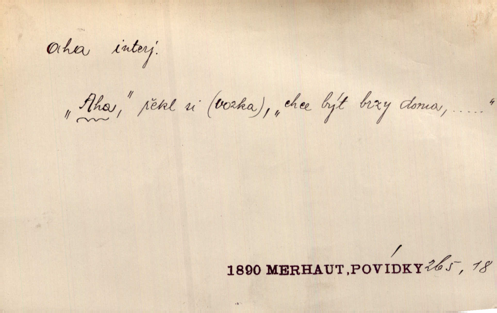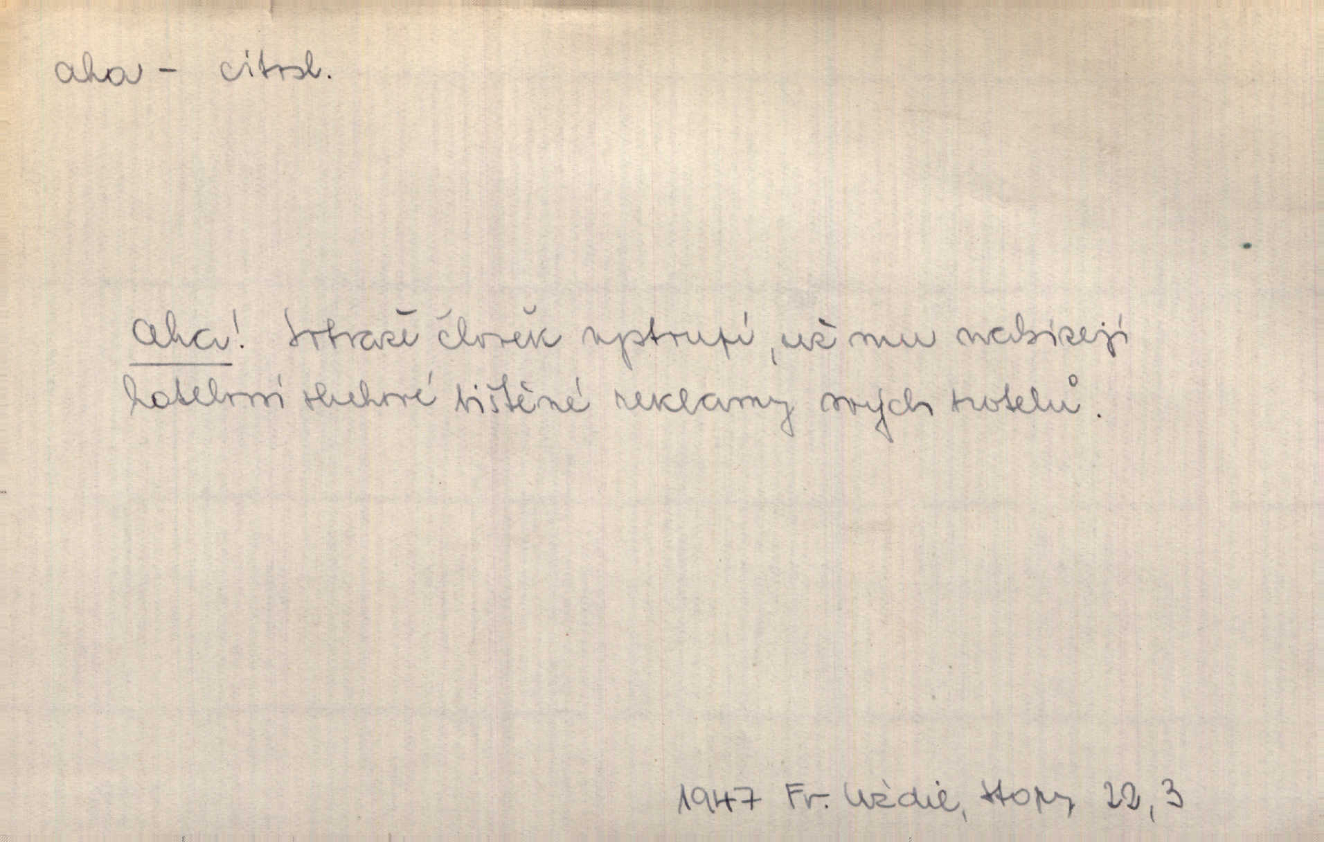 - aha citosl. překvapení, dovtípení, ironie a j. „Aha!“ povídá Bída, „mám tu hosti. Pěkně vítám.“ Erb. Pojednou vykulila Randová do tmy šedivé oči a otevřela ústa dokořán. „Ahááá—!“ vyklouzlo jí z hrdla. Již to měla! Herrm. Muž: Bratr? Neznám ho. Jiný: Bratr. Pobratřili se právě před volbami. Muž: Aha! Dyk.