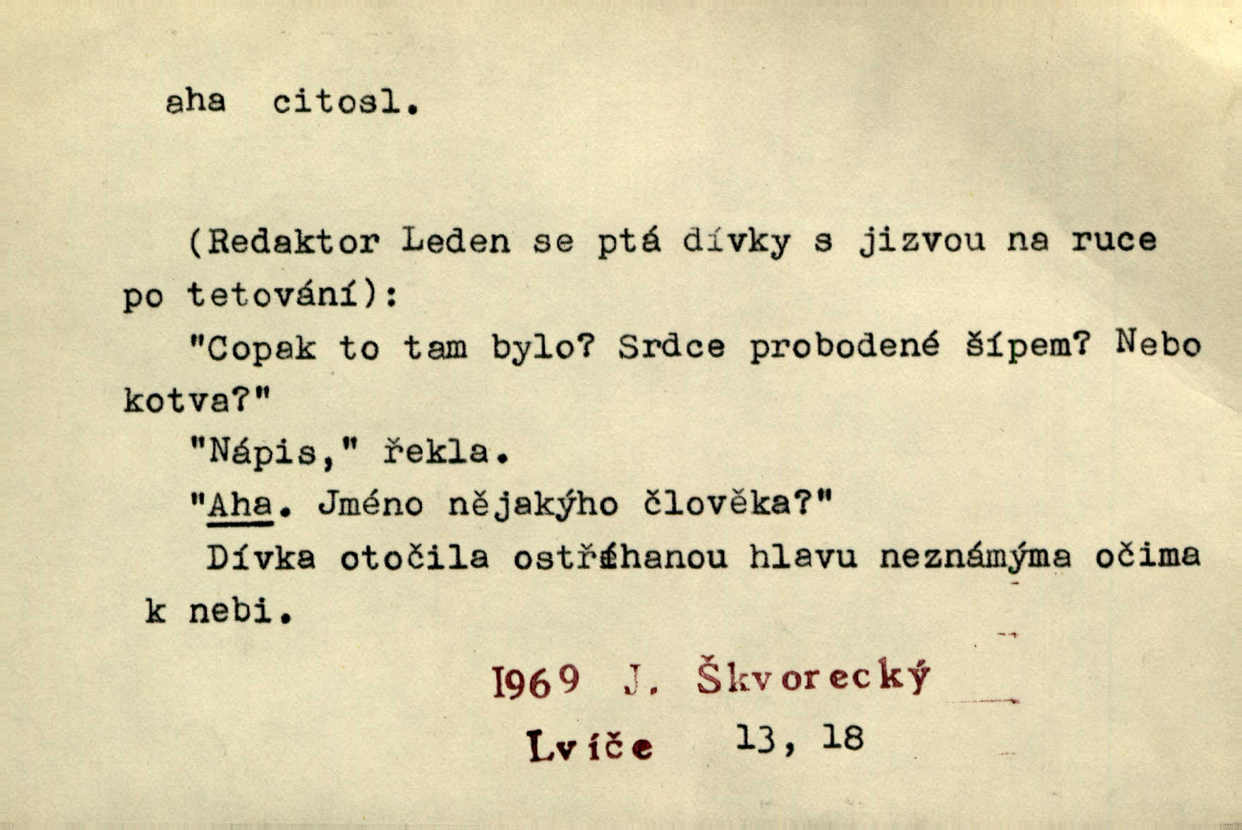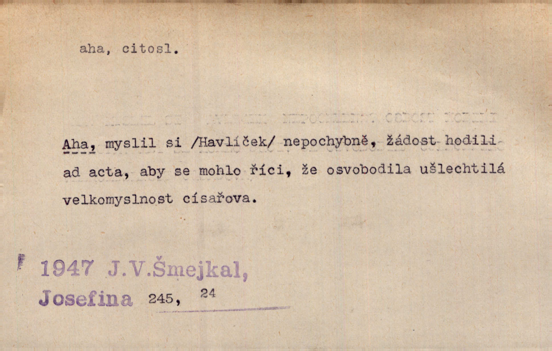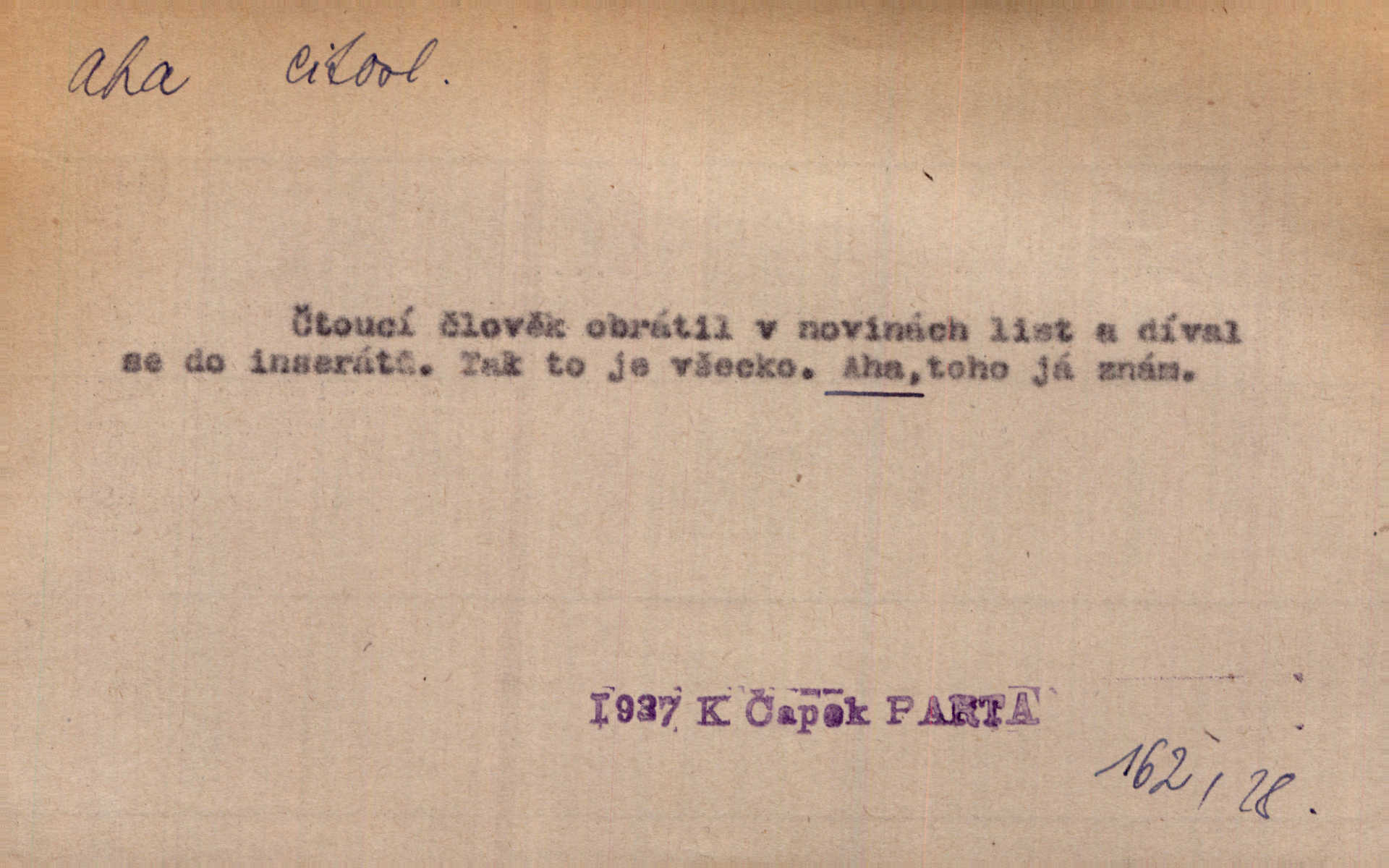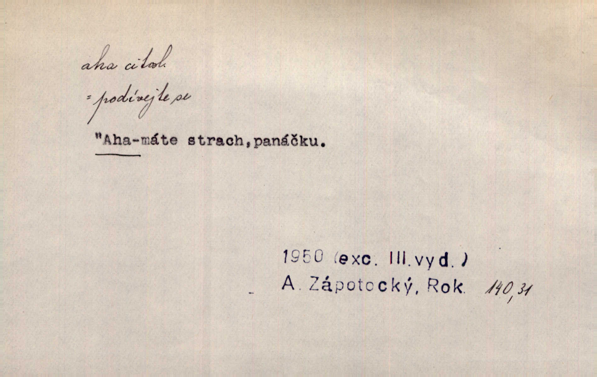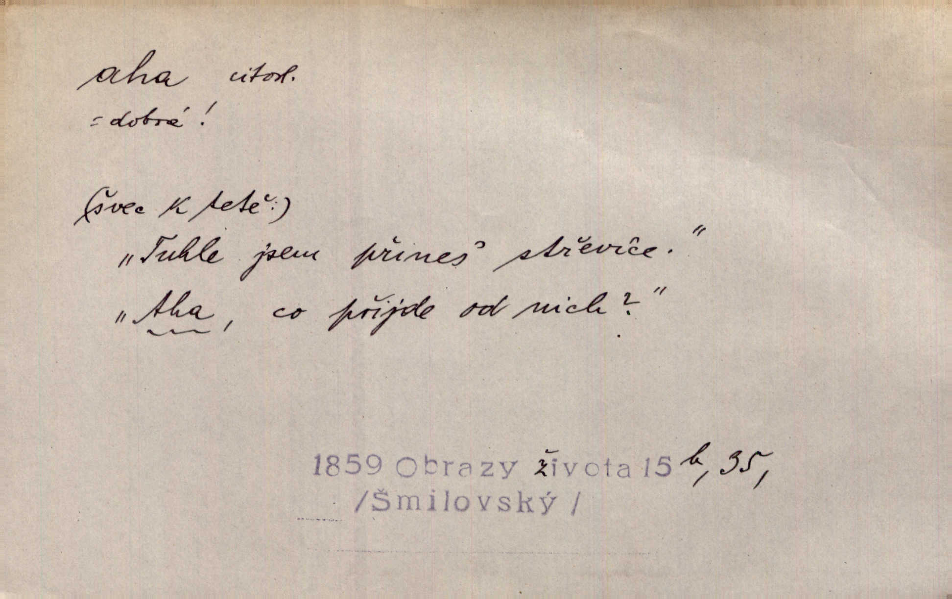 - aha citosl. překvapení, dovtípení, ironie a j. „Aha!“ povídá Bída, „mám tu hosti. Pěkně vítám.“ Erb. Pojednou vykulila Randová do tmy šedivé oči a otevřela ústa dokořán. „Ahááá—!“ vyklouzlo jí z hrdla. Již to měla! Herrm. Muž: Bratr? Neznám ho. Jiný: Bratr. Pobratřili se právě před volbami. Muž: Aha! Dyk.