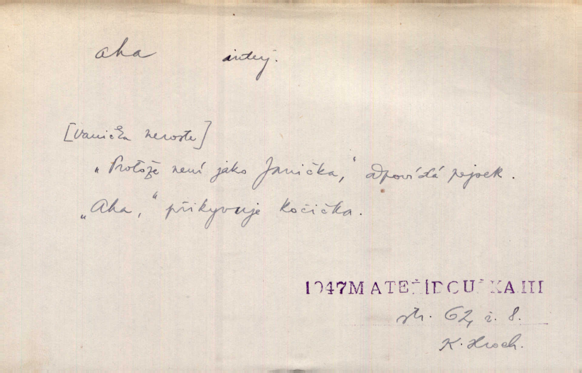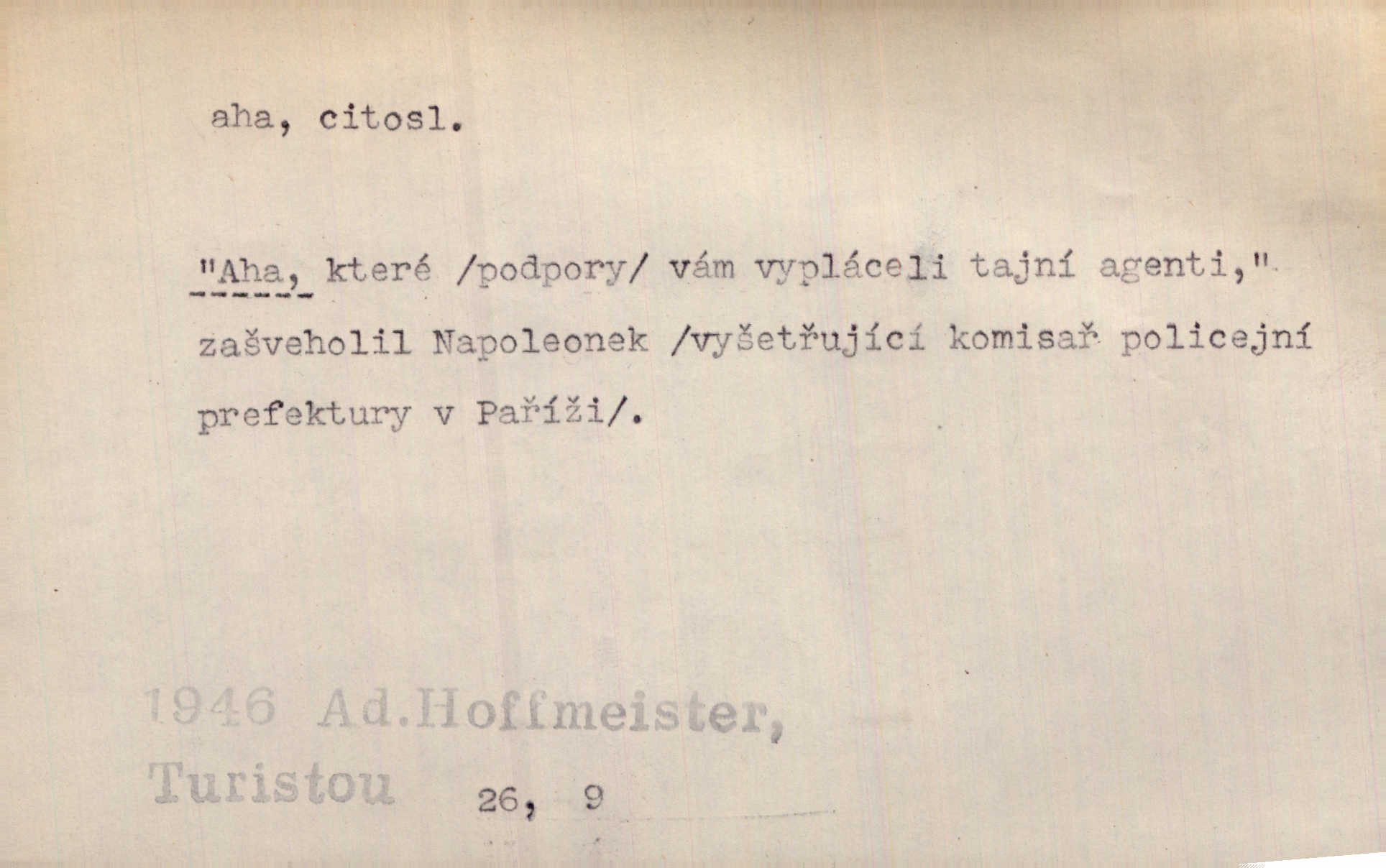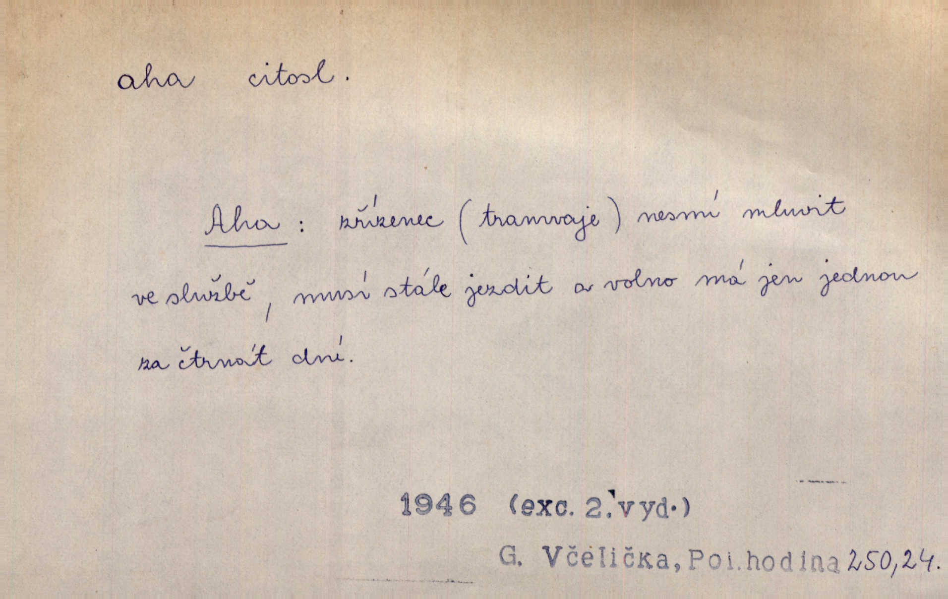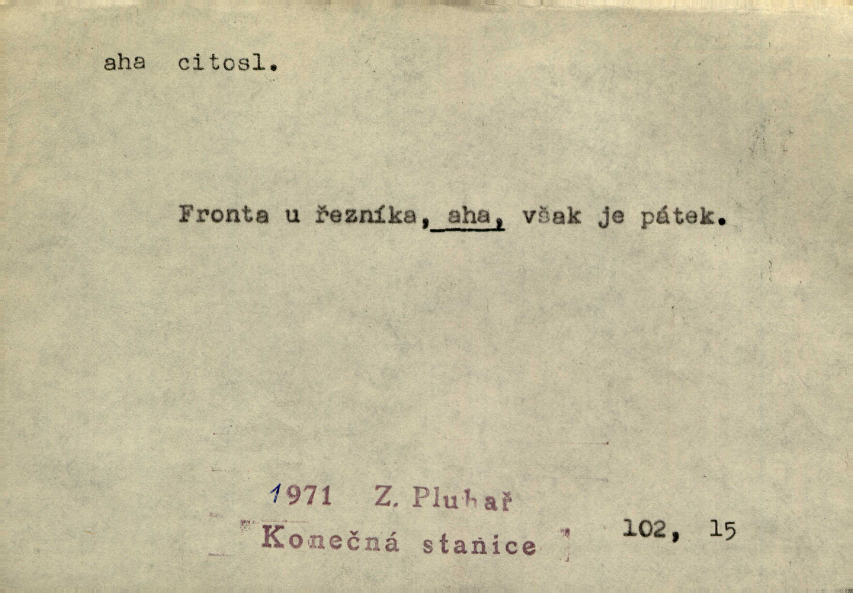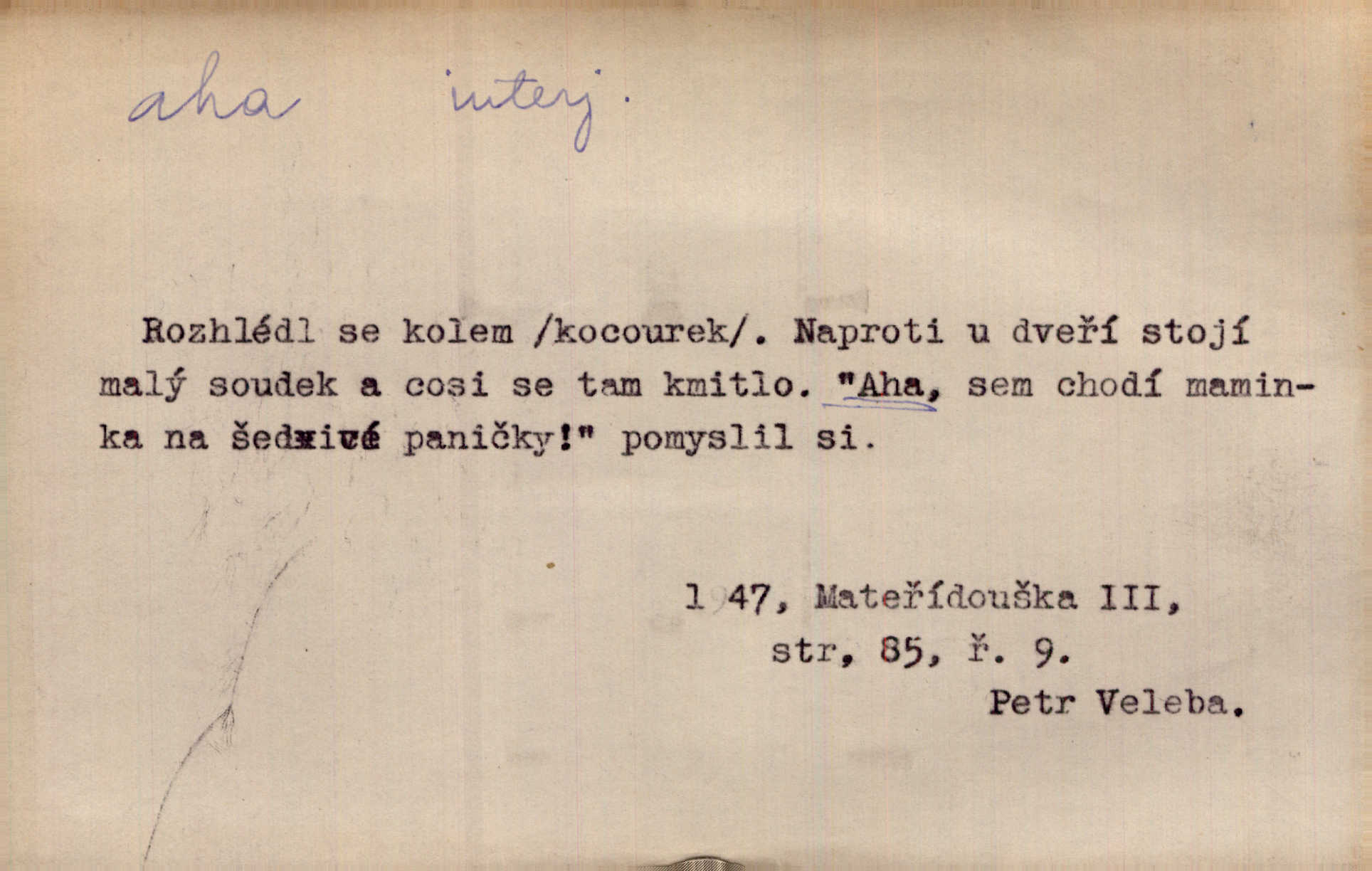 - aha citosl. překvapení, dovtípení, ironie a j. „Aha!“ povídá Bída, „mám tu hosti. Pěkně vítám.“ Erb. Pojednou vykulila Randová do tmy šedivé oči a otevřela ústa dokořán. „Ahááá—!“ vyklouzlo jí z hrdla. Již to měla! Herrm. Muž: Bratr? Neznám ho. Jiný: Bratr. Pobratřili se právě před volbami. Muž: Aha! Dyk.
