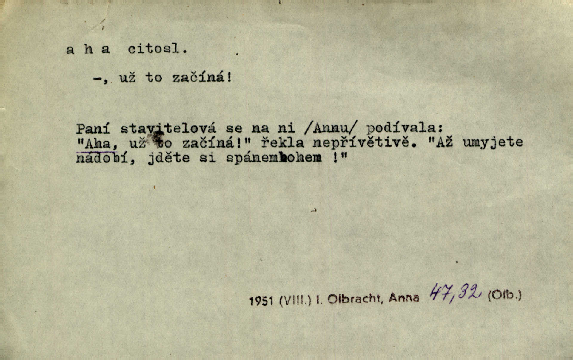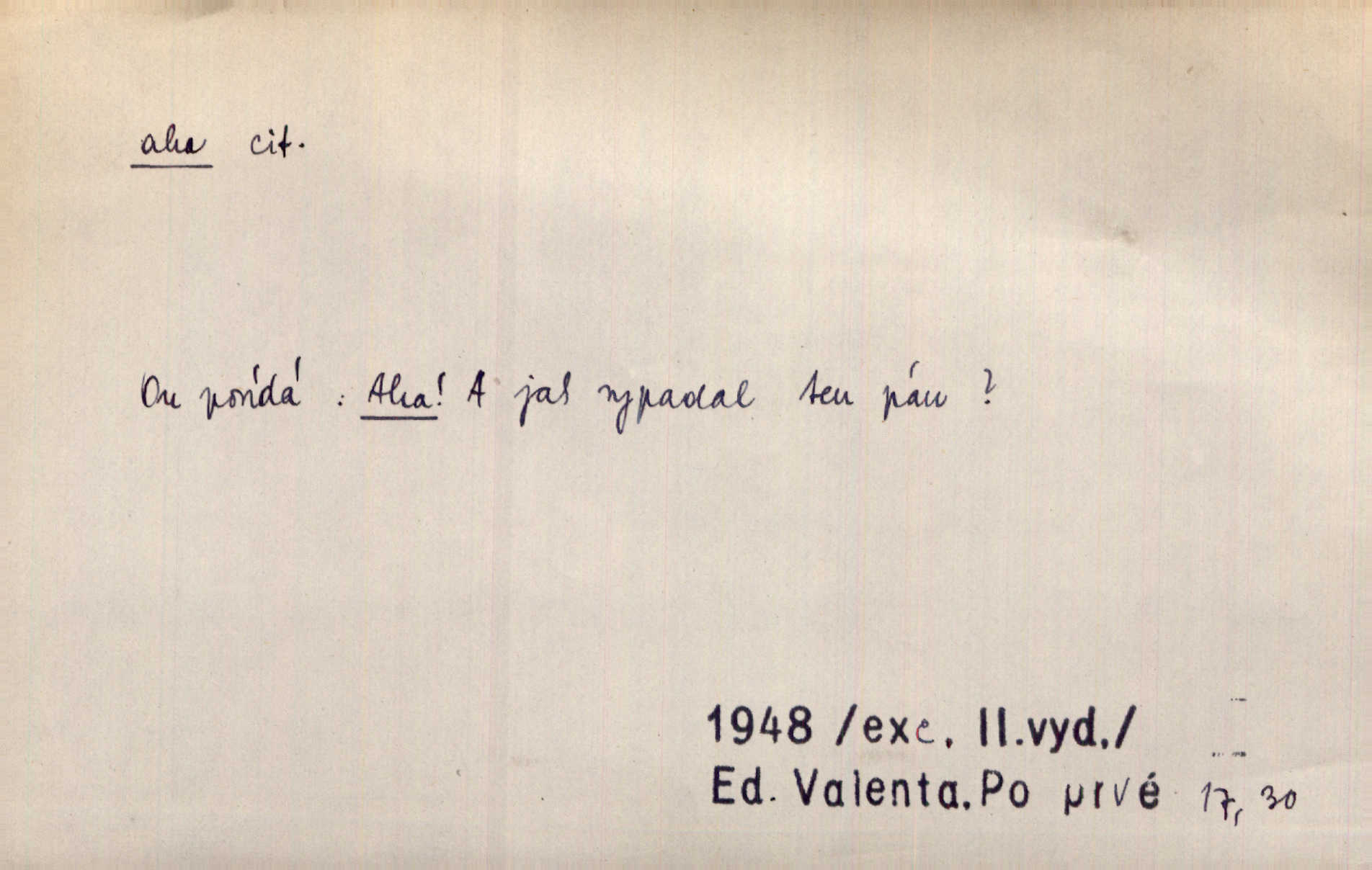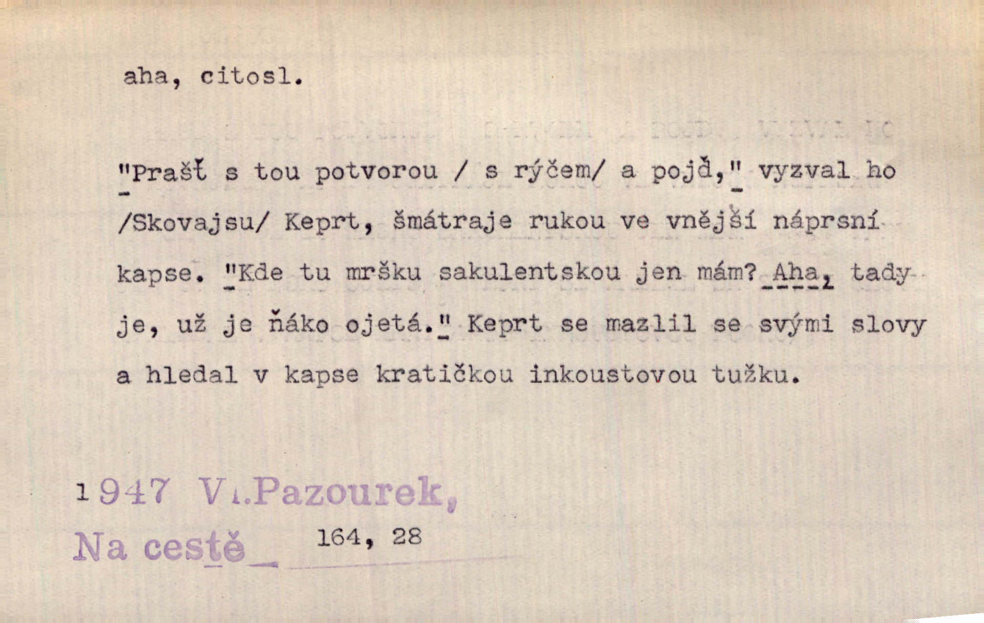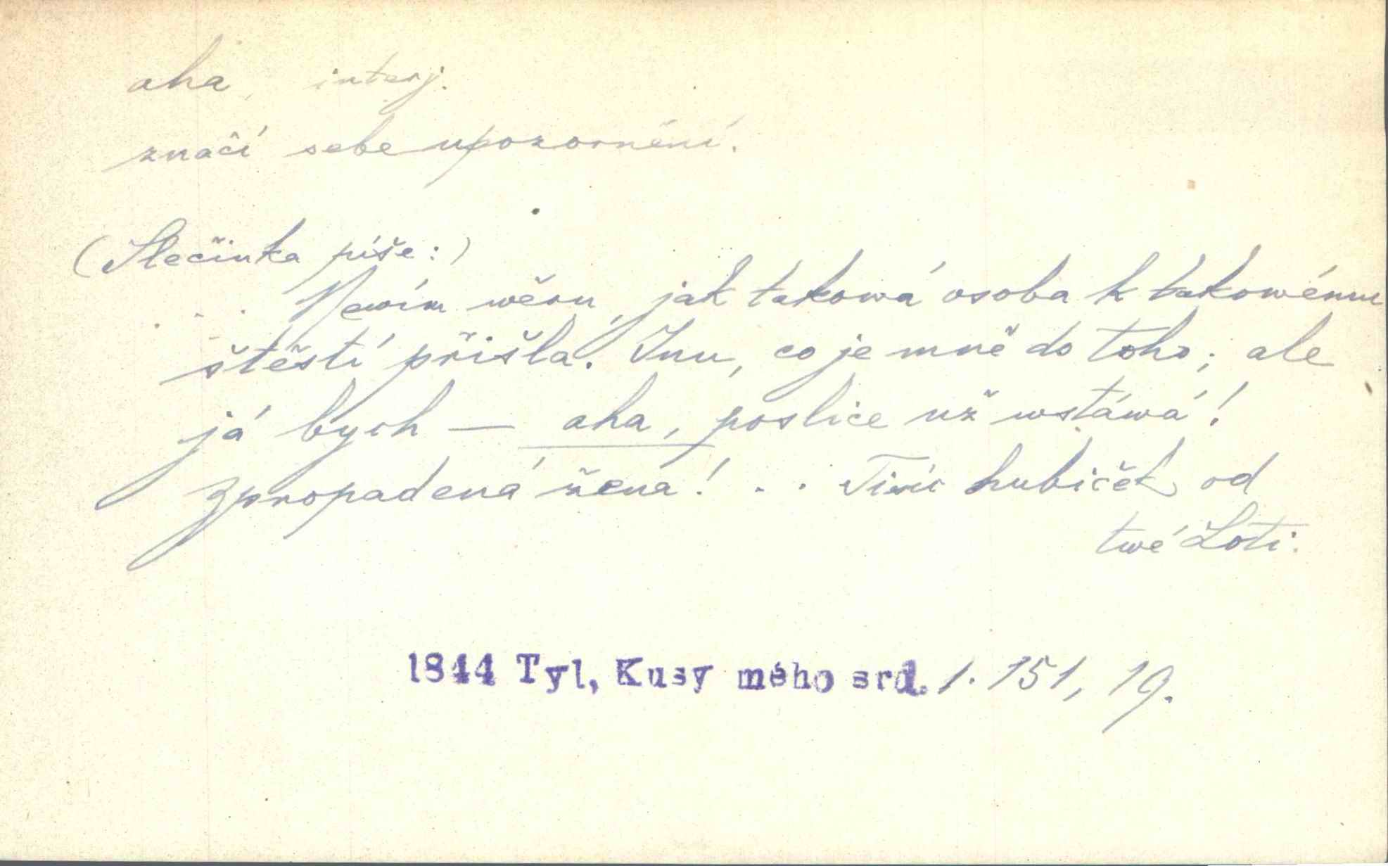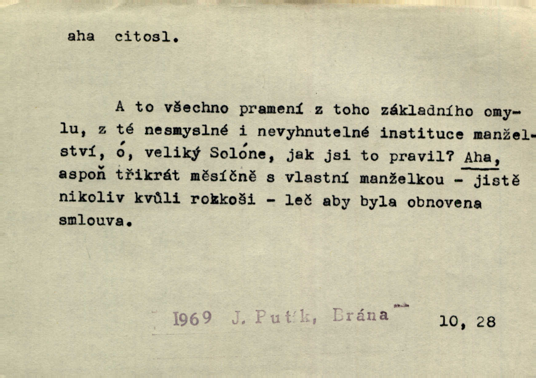 - aha citosl. překvapení, dovtípení, ironie a j. „Aha!“ povídá Bída, „mám tu hosti. Pěkně vítám.“ Erb. Pojednou vykulila Randová do tmy šedivé oči a otevřela ústa dokořán. „Ahááá—!“ vyklouzlo jí z hrdla. Již to měla! Herrm. Muž: Bratr? Neznám ho. Jiný: Bratr. Pobratřili se právě před volbami. Muž: Aha! Dyk.